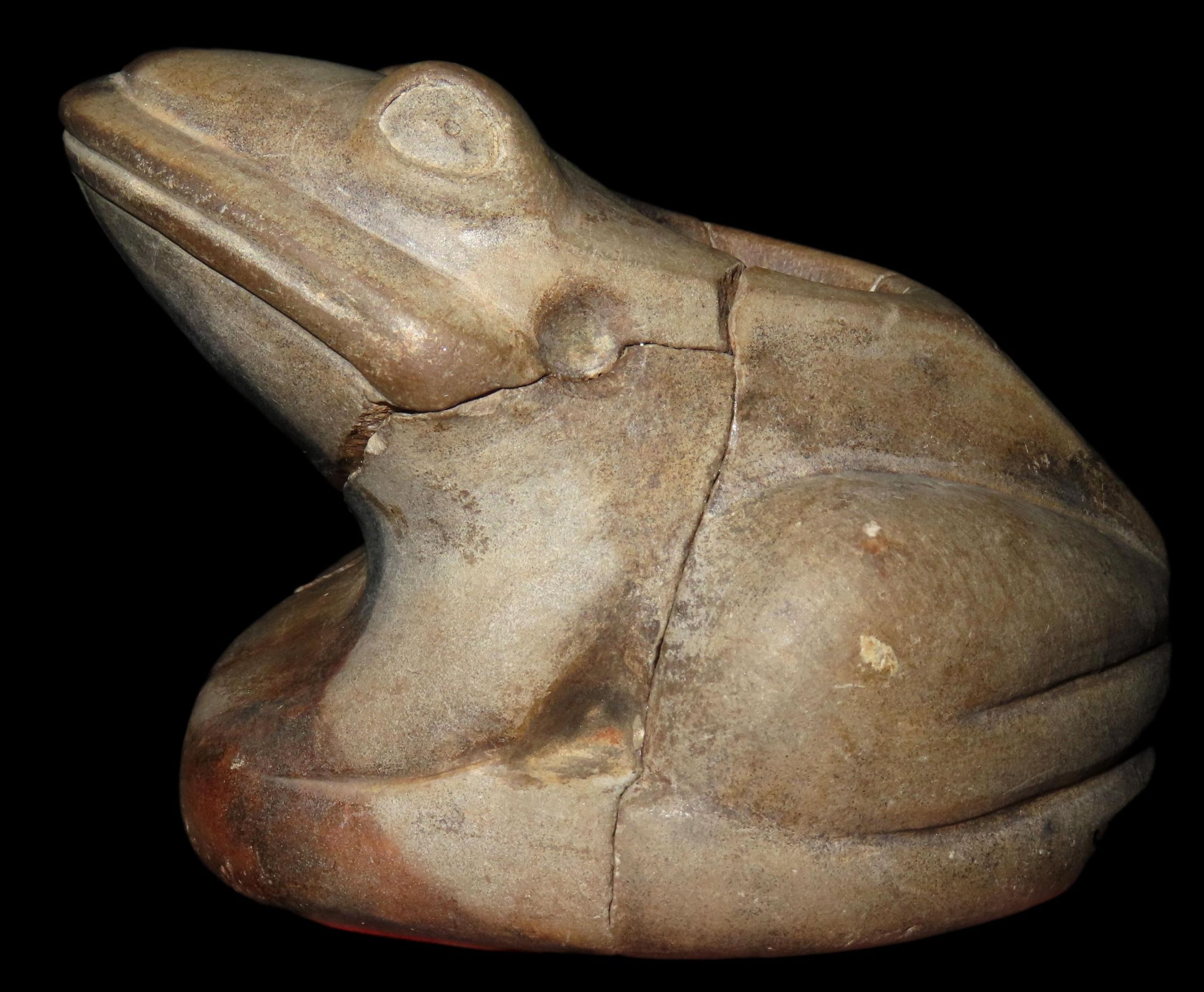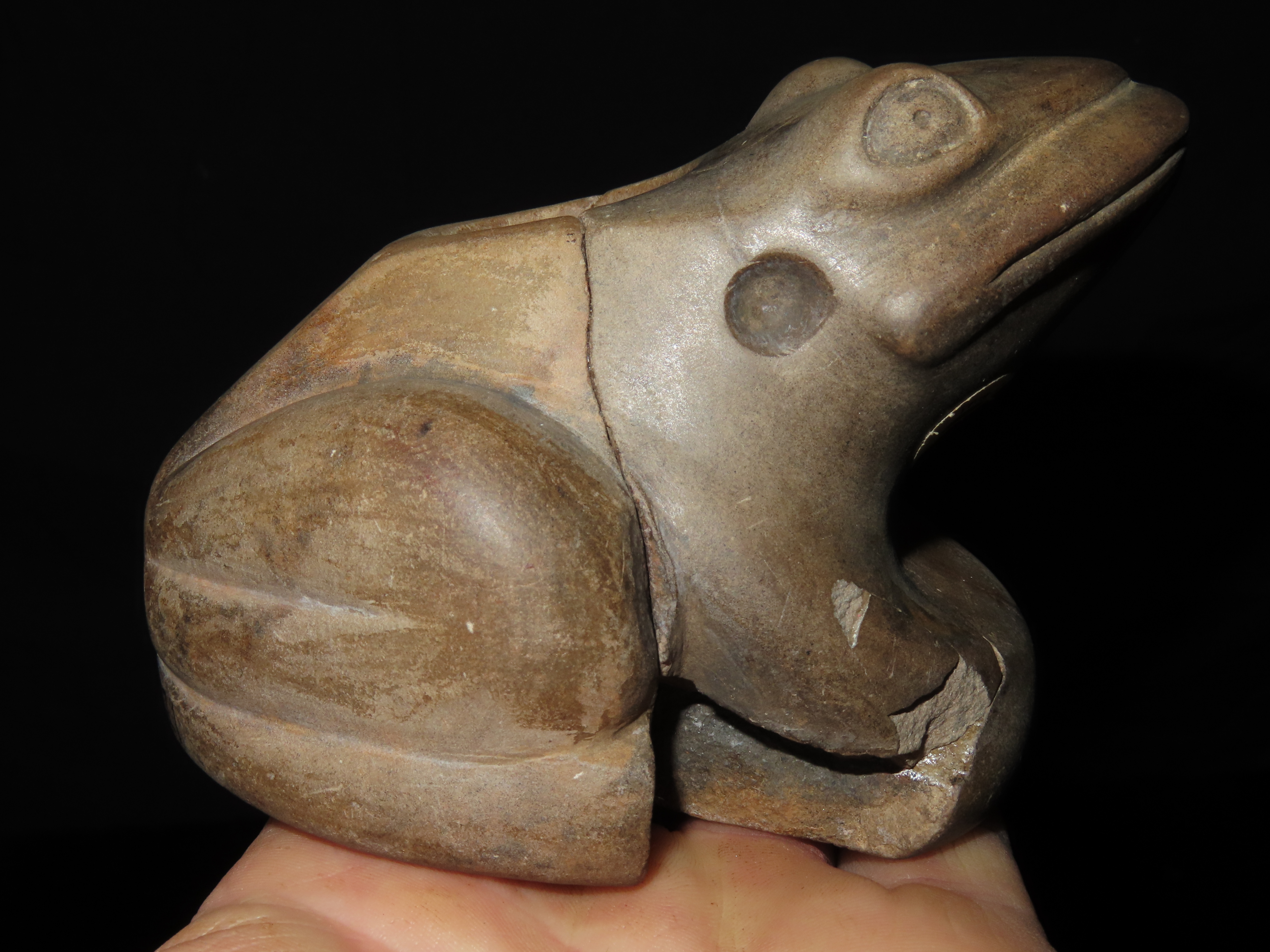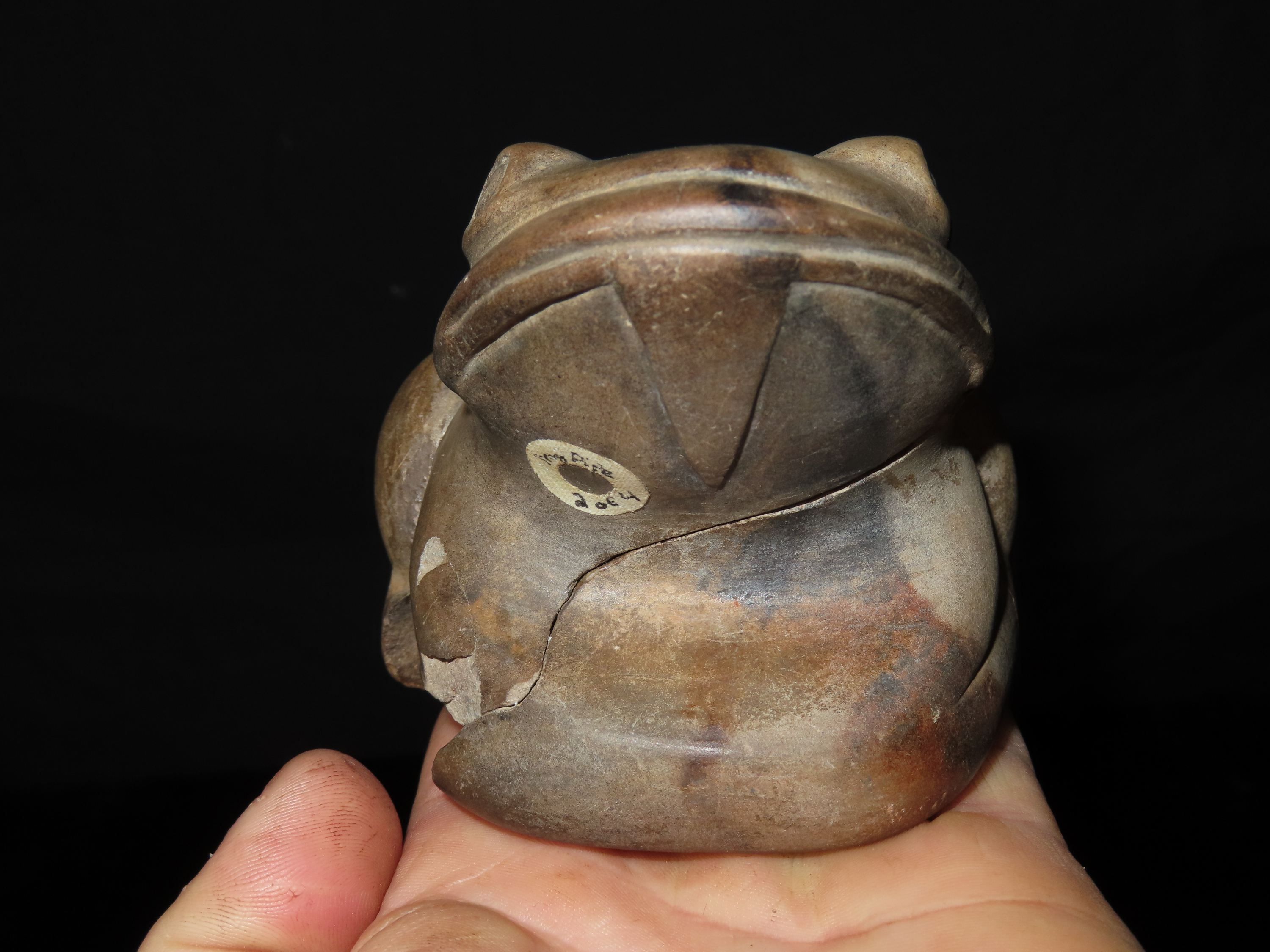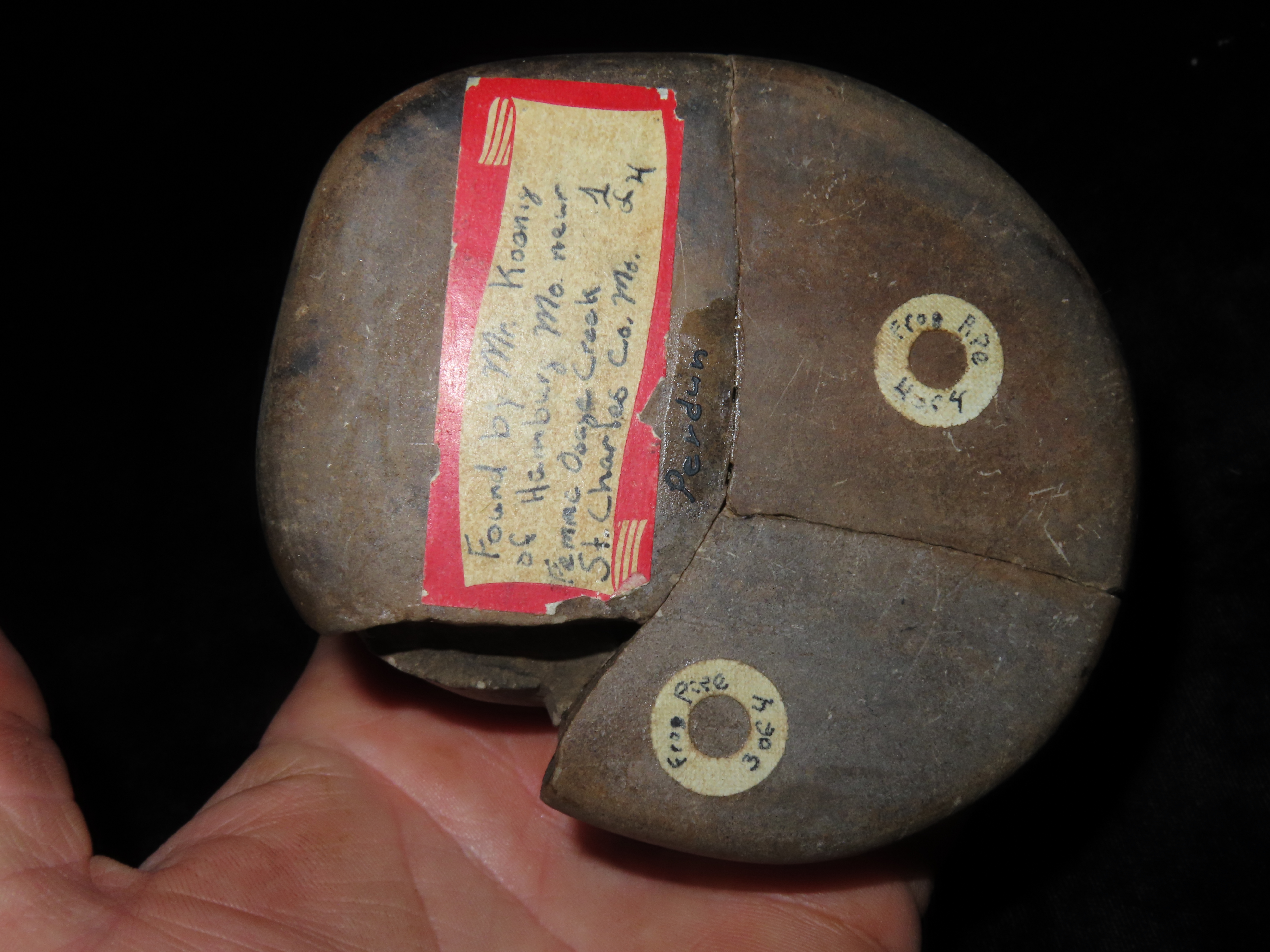 RARE FROG EFFIGY PIPE, MOTLEY COA, ST CHARLES COUNTY MISSOURI, FOUND BY MR KOENIG, EX GREG PERDUN COLLECTION, FOUND IN PIECES & GLUED TOGETHER, AMAZING DETAIL, IN PERDUN’S COLLECTION FOR MANY YEARS UNTIL HE PASSED IN 2021.