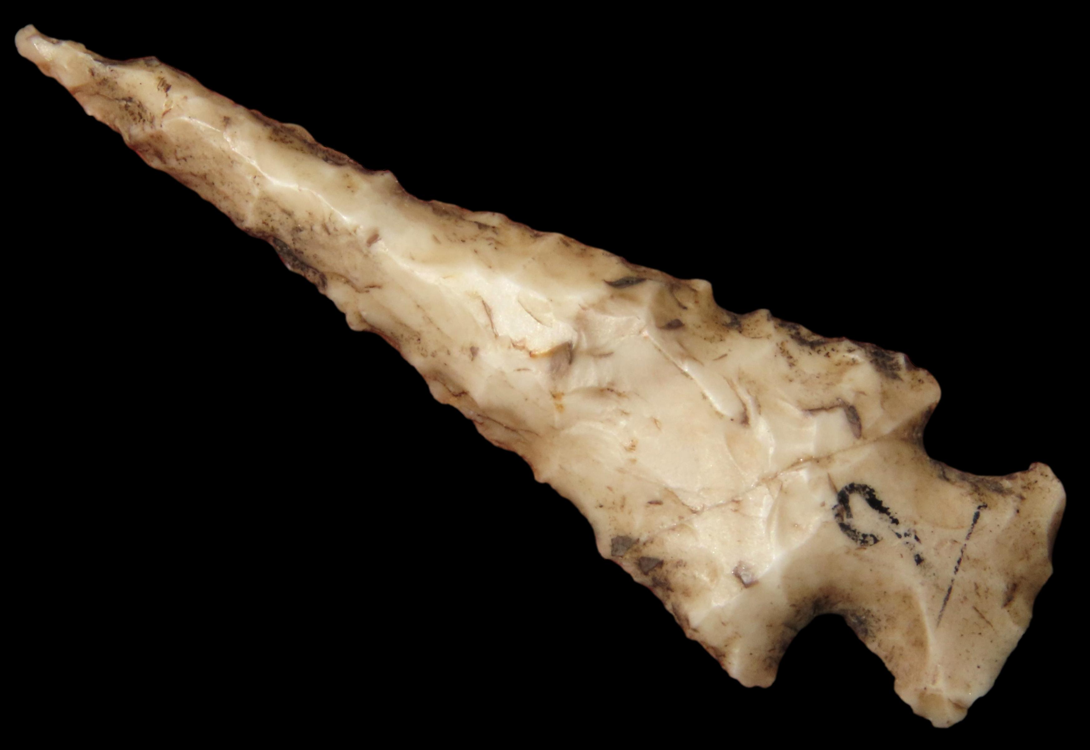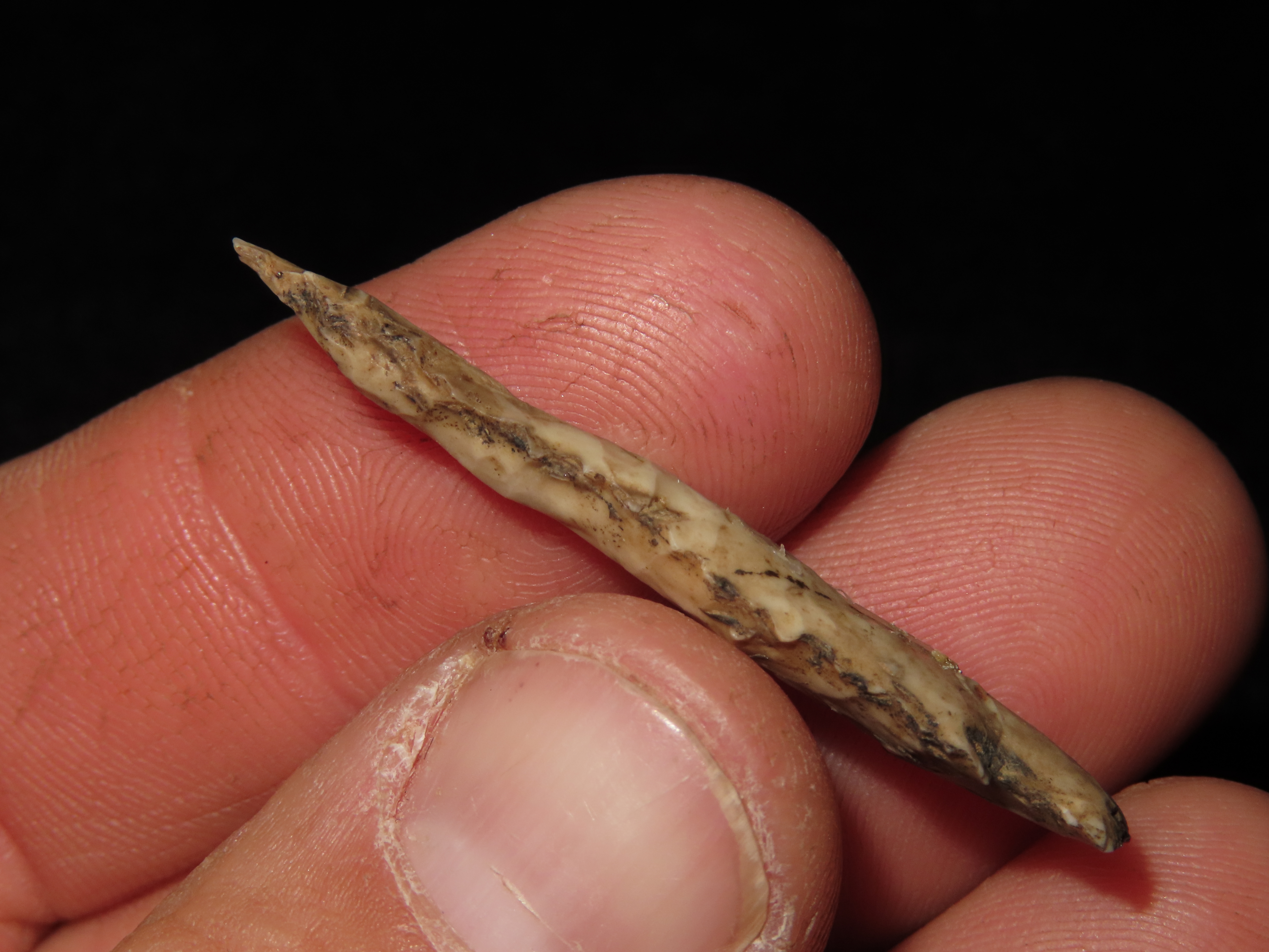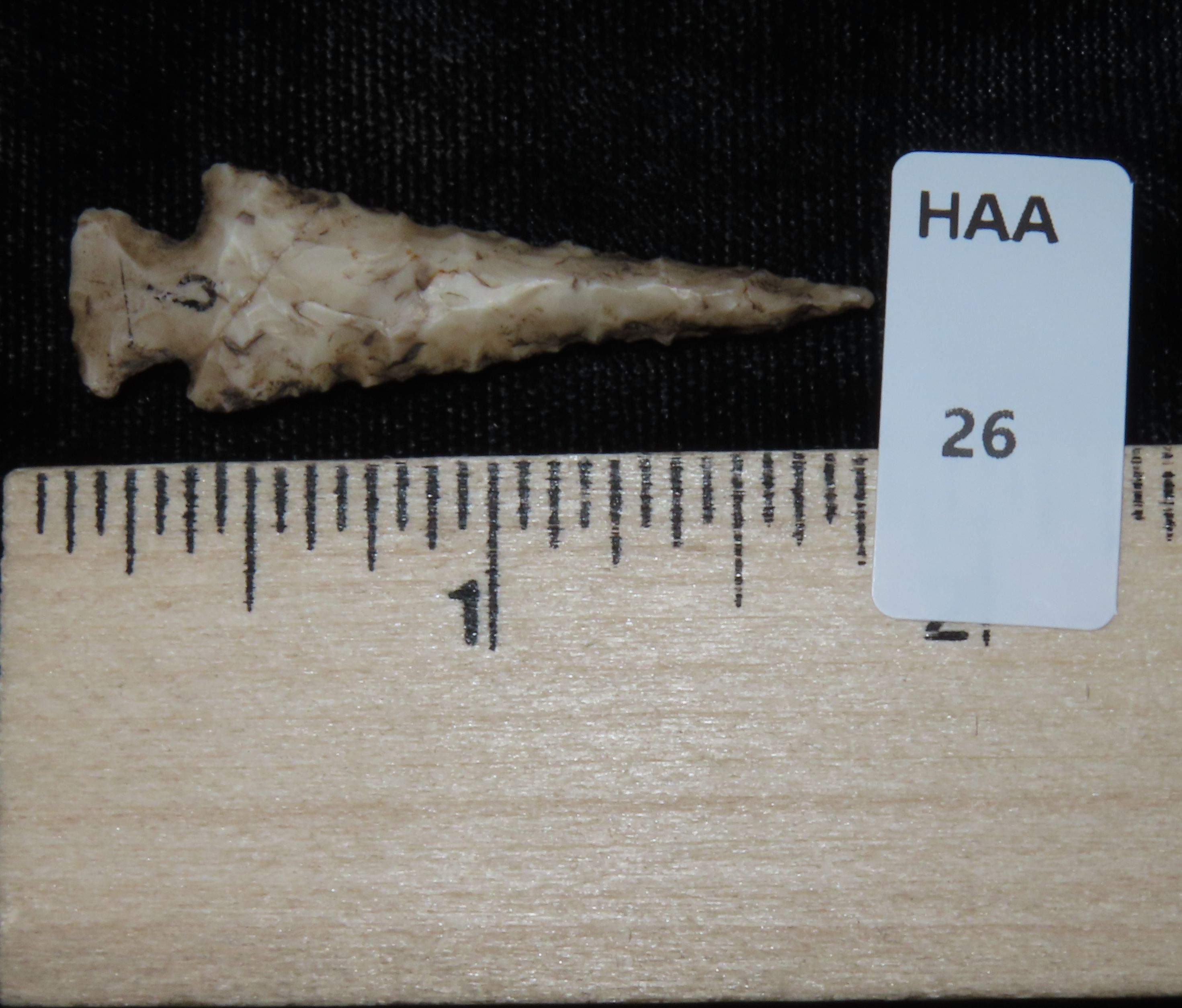 1 3/4″ INCREDIBLE SCALLORN BIRD POINT FOUND IN GREENE COUNTY ILLINOIS, VERY LONG & SLENDER EXAMPLE WITH GREAT PATINA