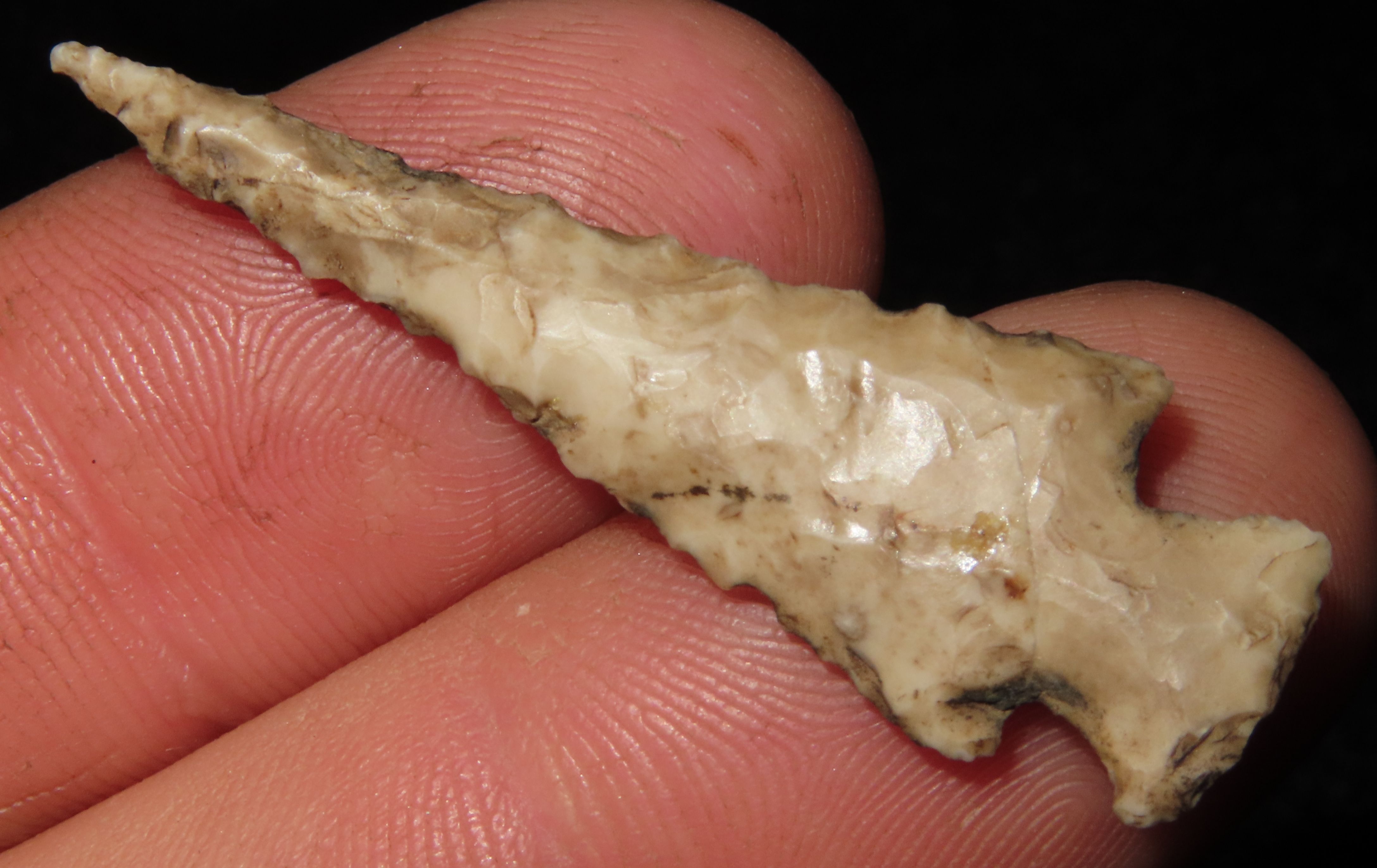 1 3/4" INCREDIBLE SCALLORN BIRD POINT FOUND IN GREENE COUNTY ILLINOIS, VERY LONG & SLENDER EXAMPLE WITH GREAT PATINA