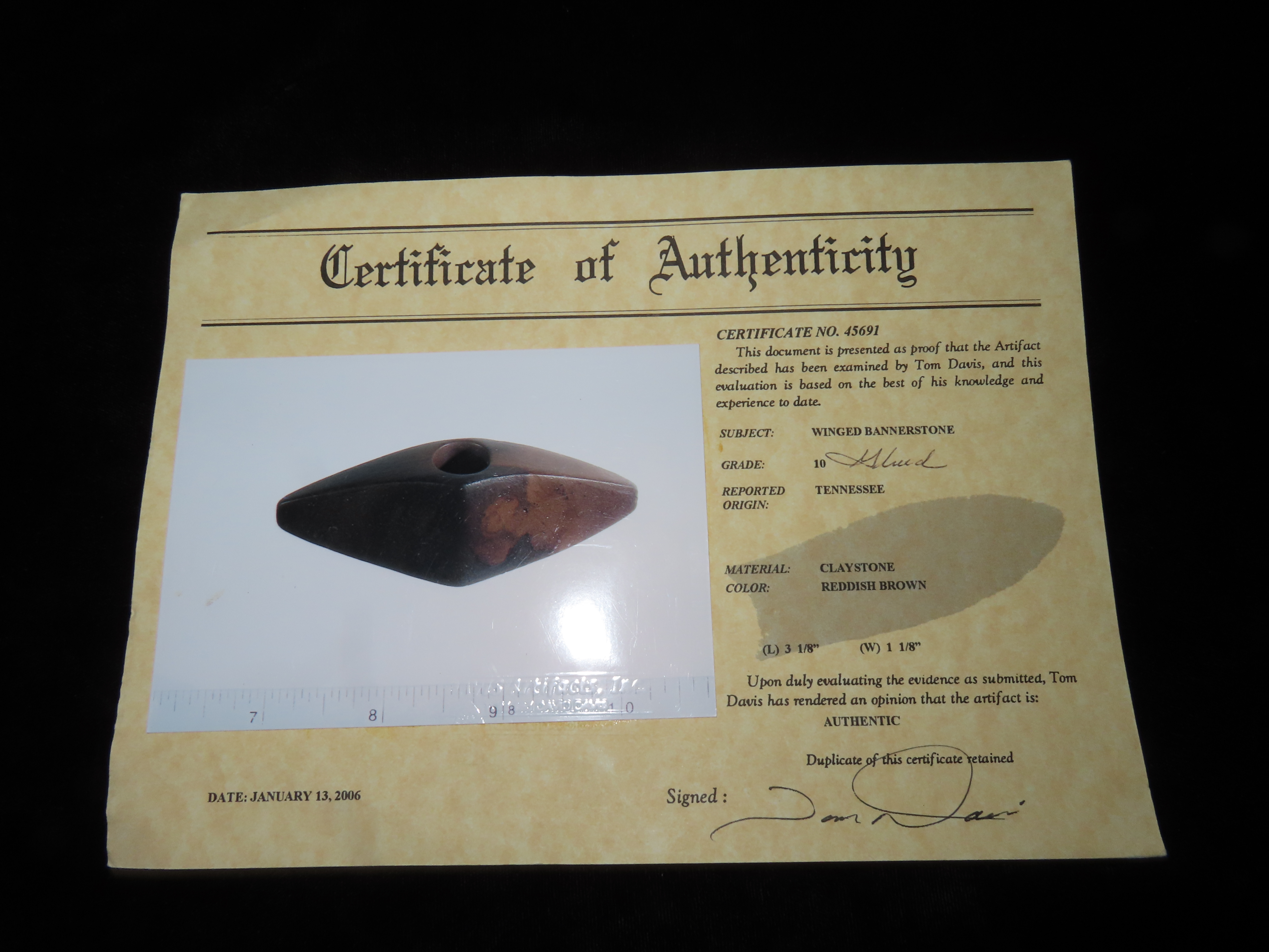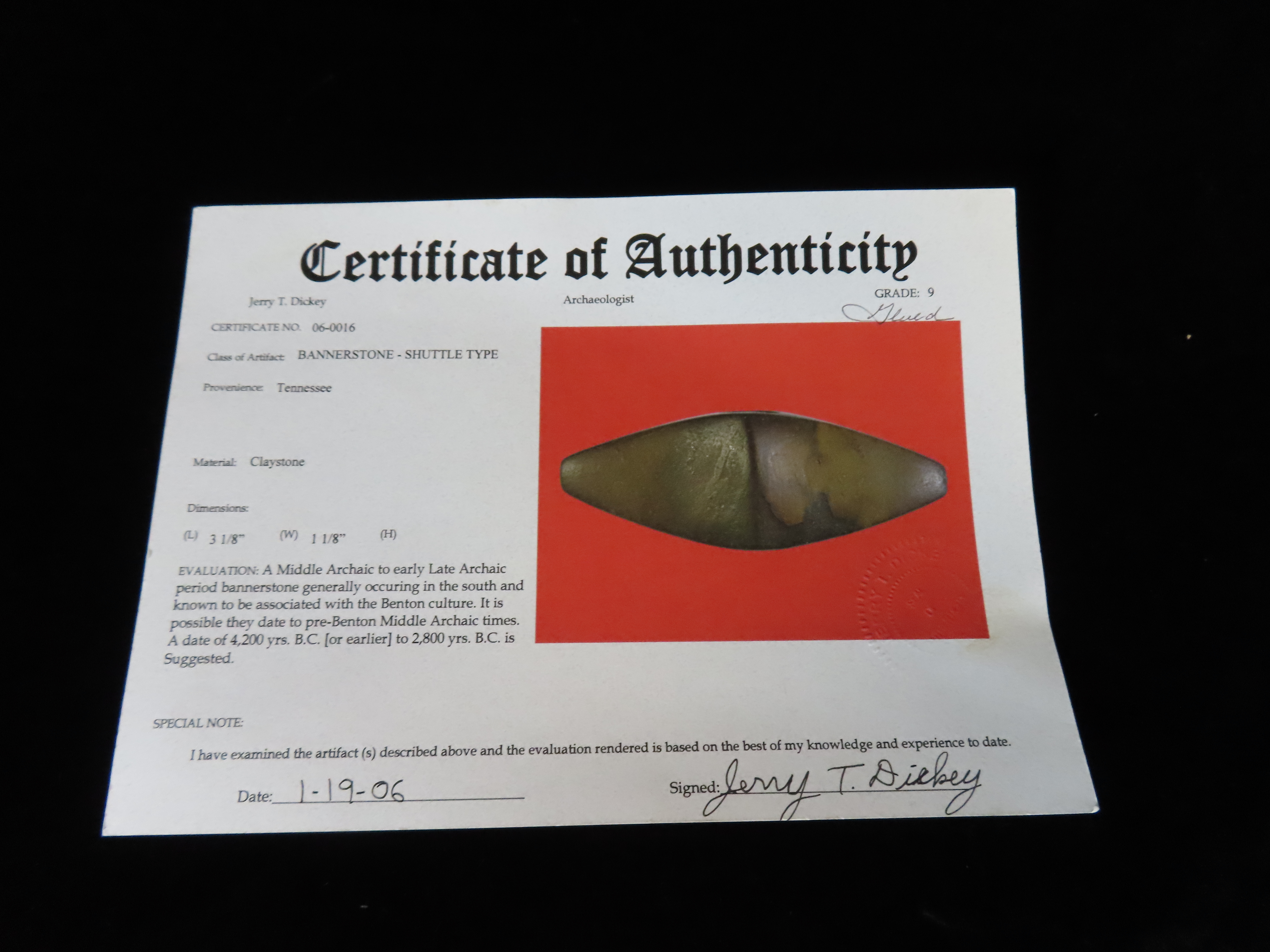 3 1/8" SHUTTLE BANNERSTONE, DICKEY & DAVIS G10 COA, TENNESSEE, CLAYSTONE, BROKEN & GLUED TIGHT, NICELY SHAPED AND WELL POLISHED EXAMPLE
