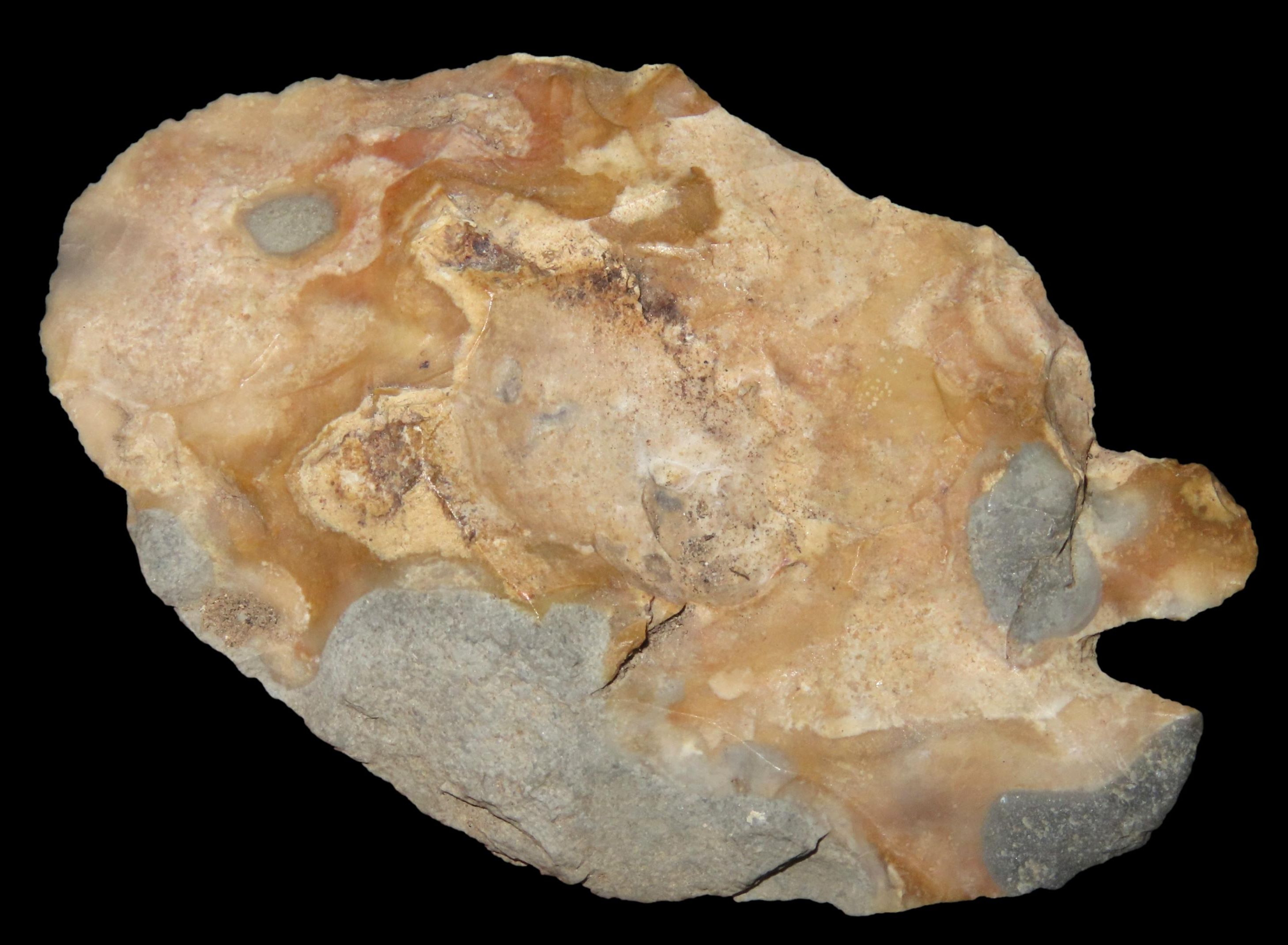 2 3/4″ MOZARKITE CORNER TANG KNIFE, SALINE COUNTY MISSOURI, NICE COLORFUL RARE EXAMPLE FOR THE AREA, NO BRAINER PATINA