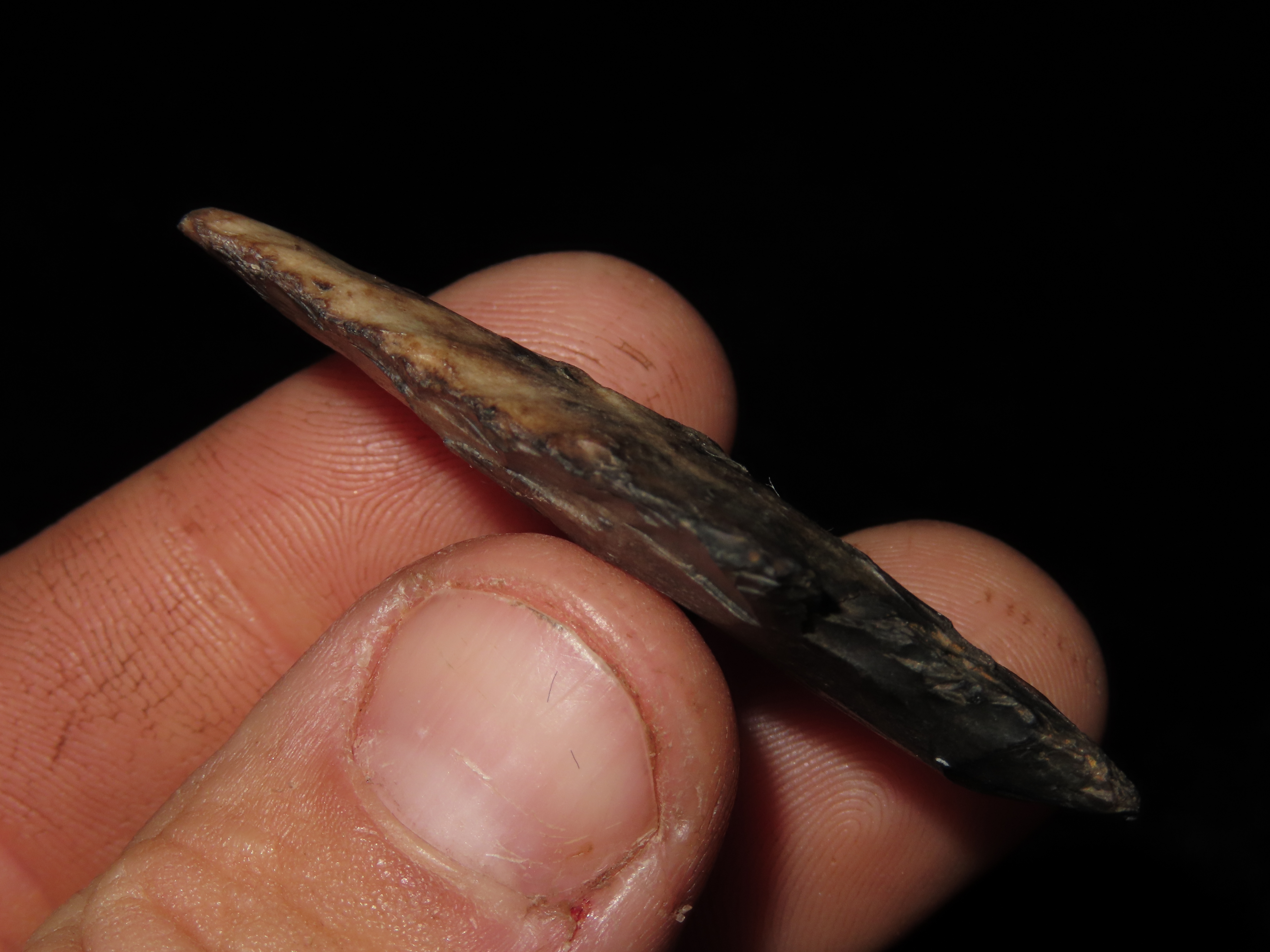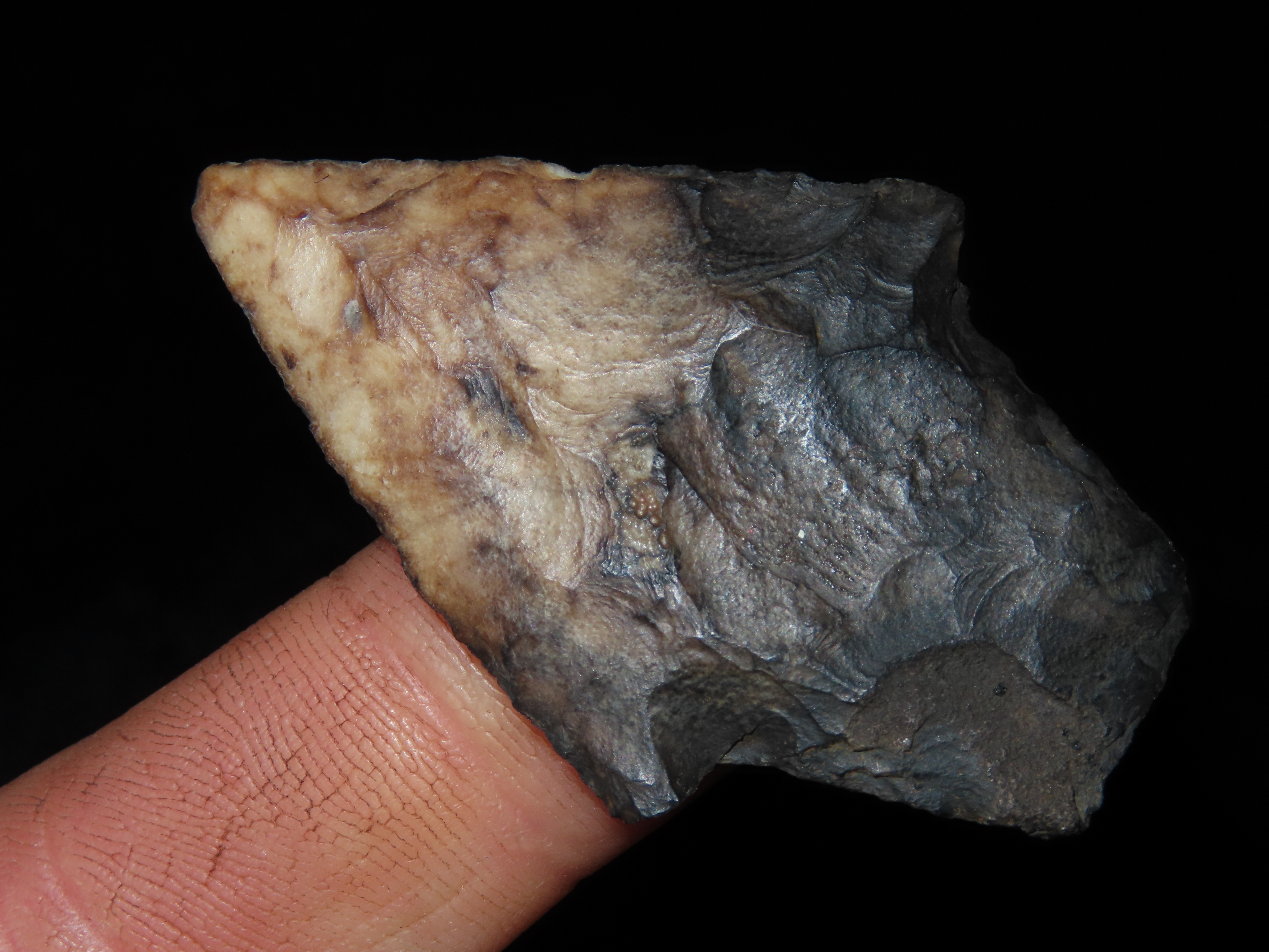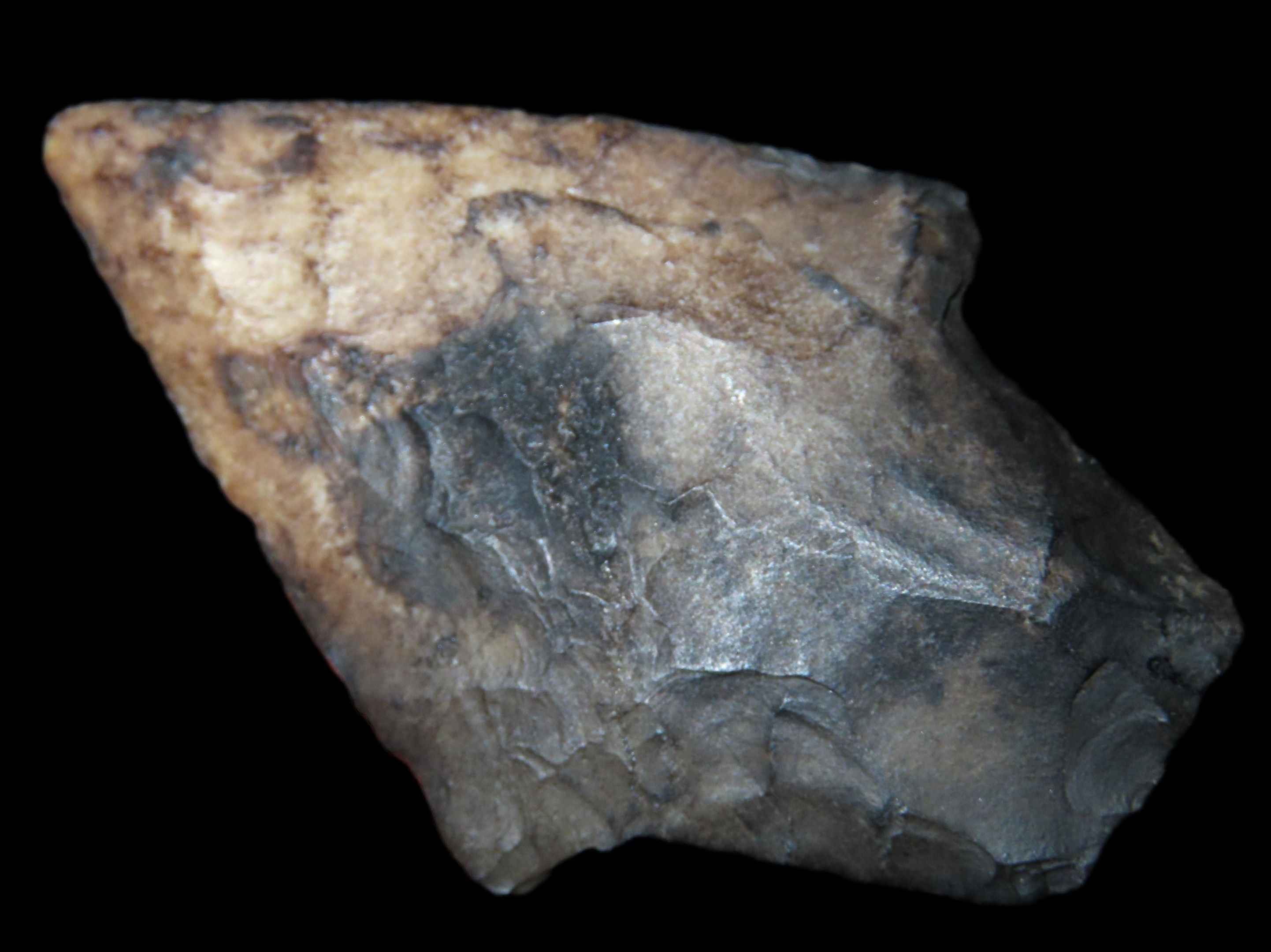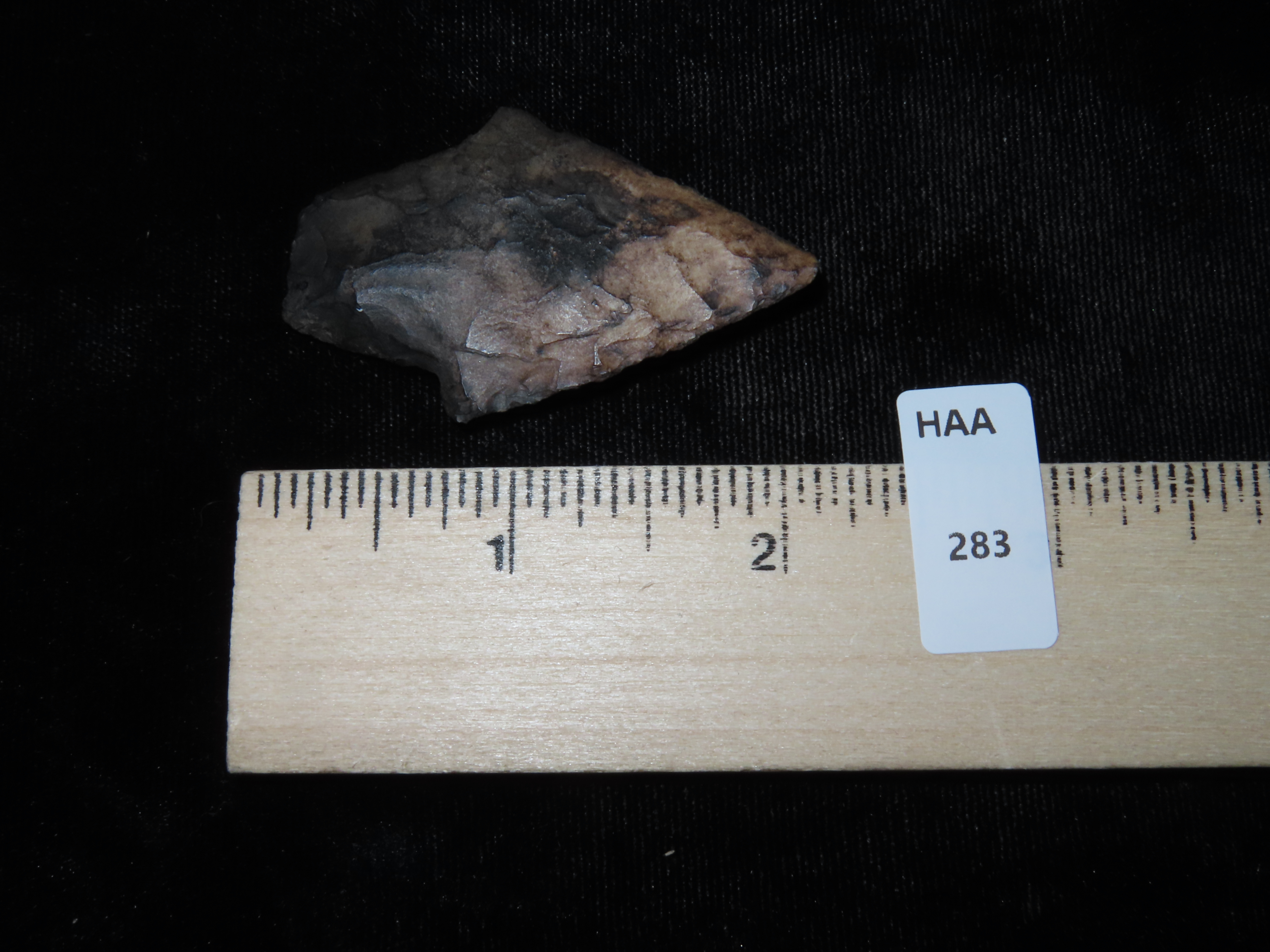 2 1/8″ DICKSON FOUND IN ADAMS COUNTY ILLINOIS, NICE WATER STAINED EXAMPLE WITH GREAT COLOR, NO BRAINER PATINA, INDIAN ARROWHEAD