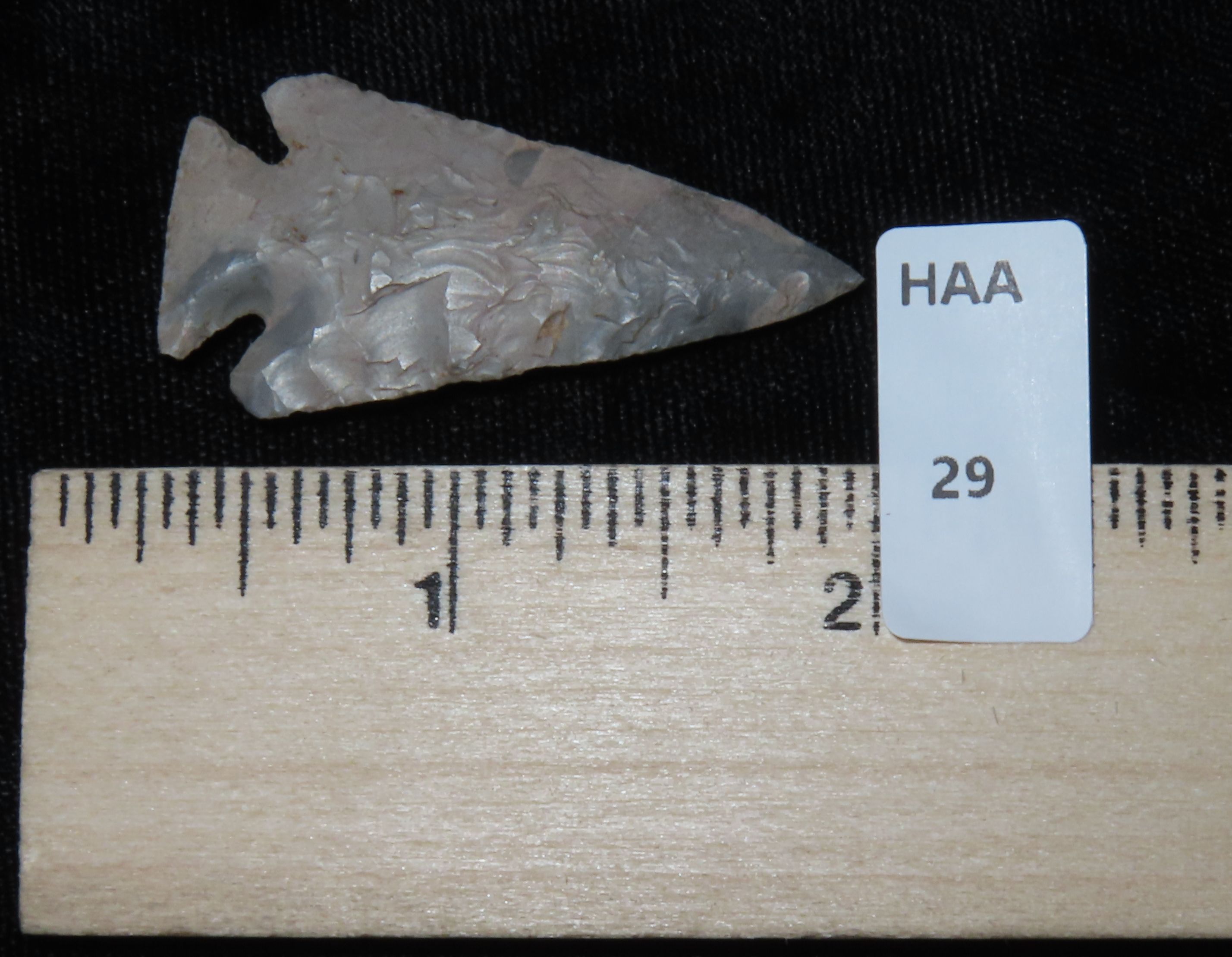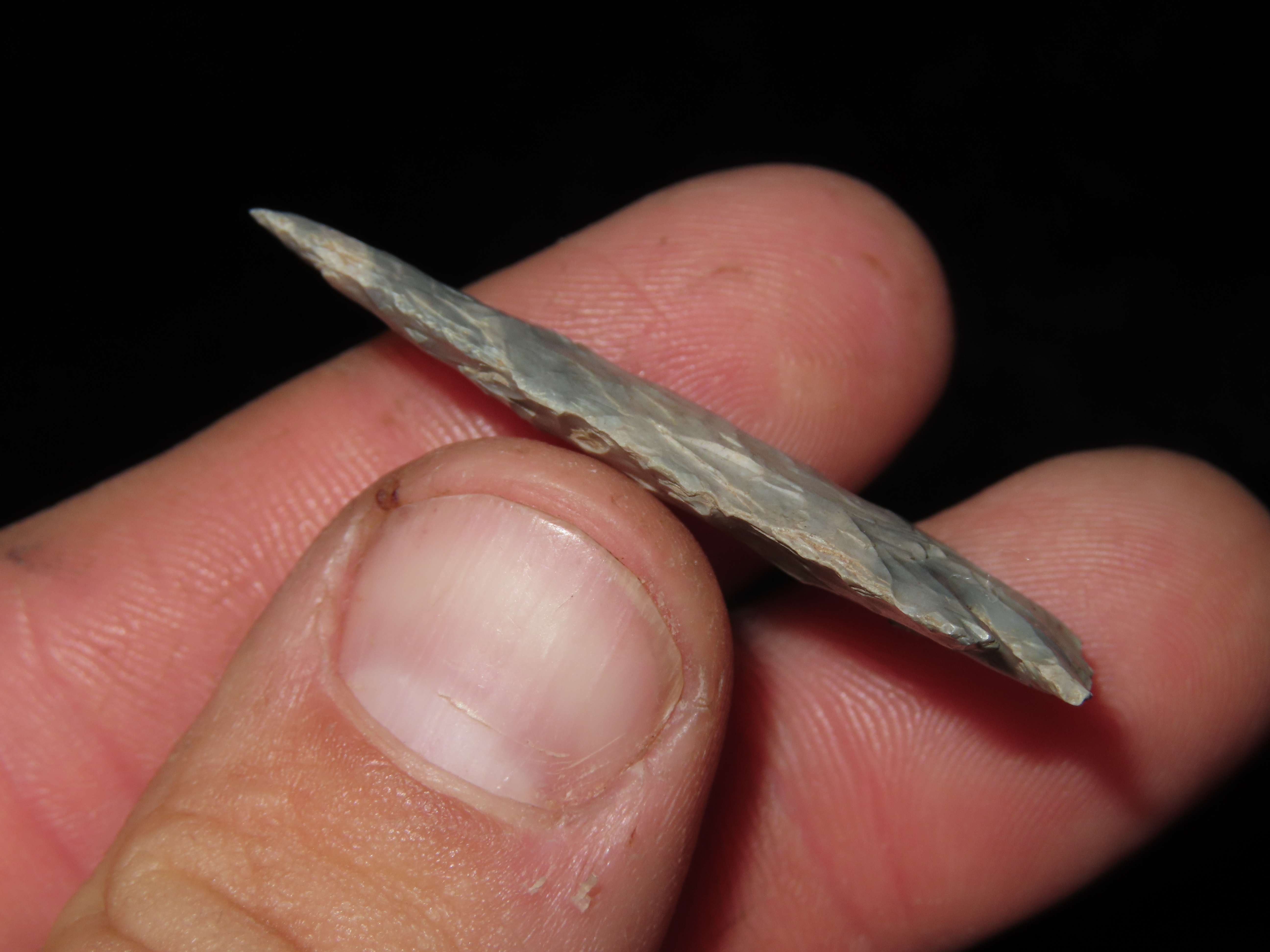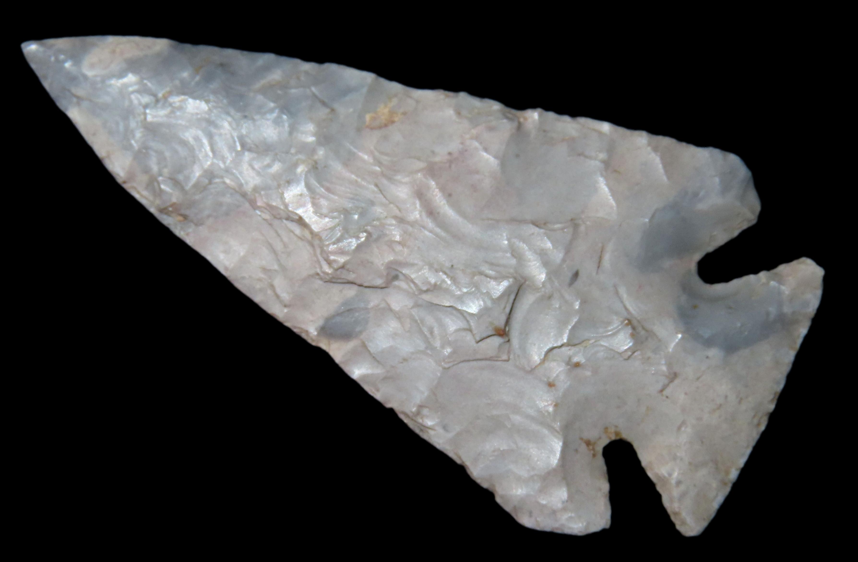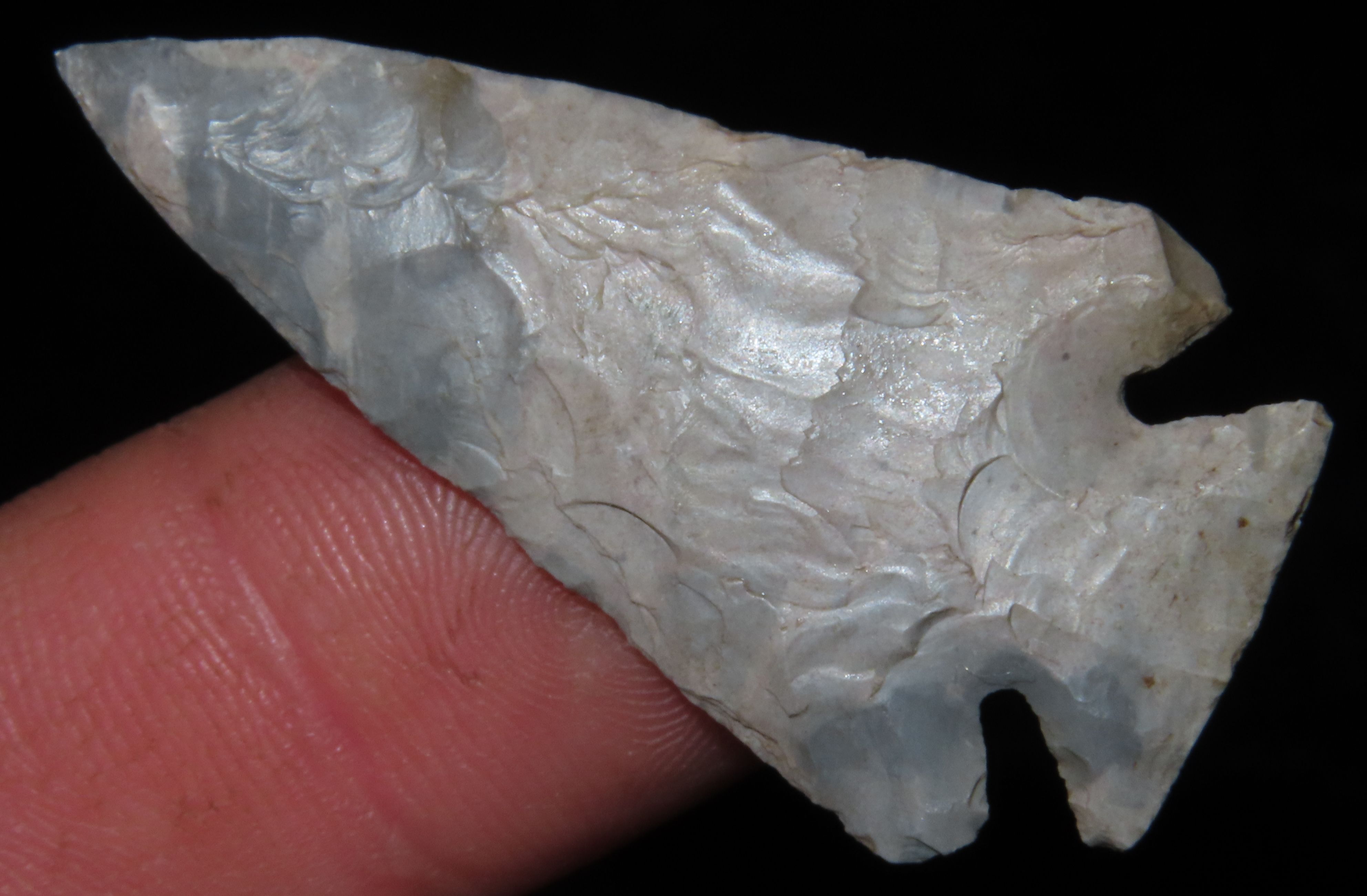 1 3/4″ PHENOMENAL KIRK CORNER NOTCH BIRD POINT FOUND IN OSAGE COUNTY OKLAHOMA, IMPECCABLE FLAKING, WAFER THIN, & GREAT COLOR