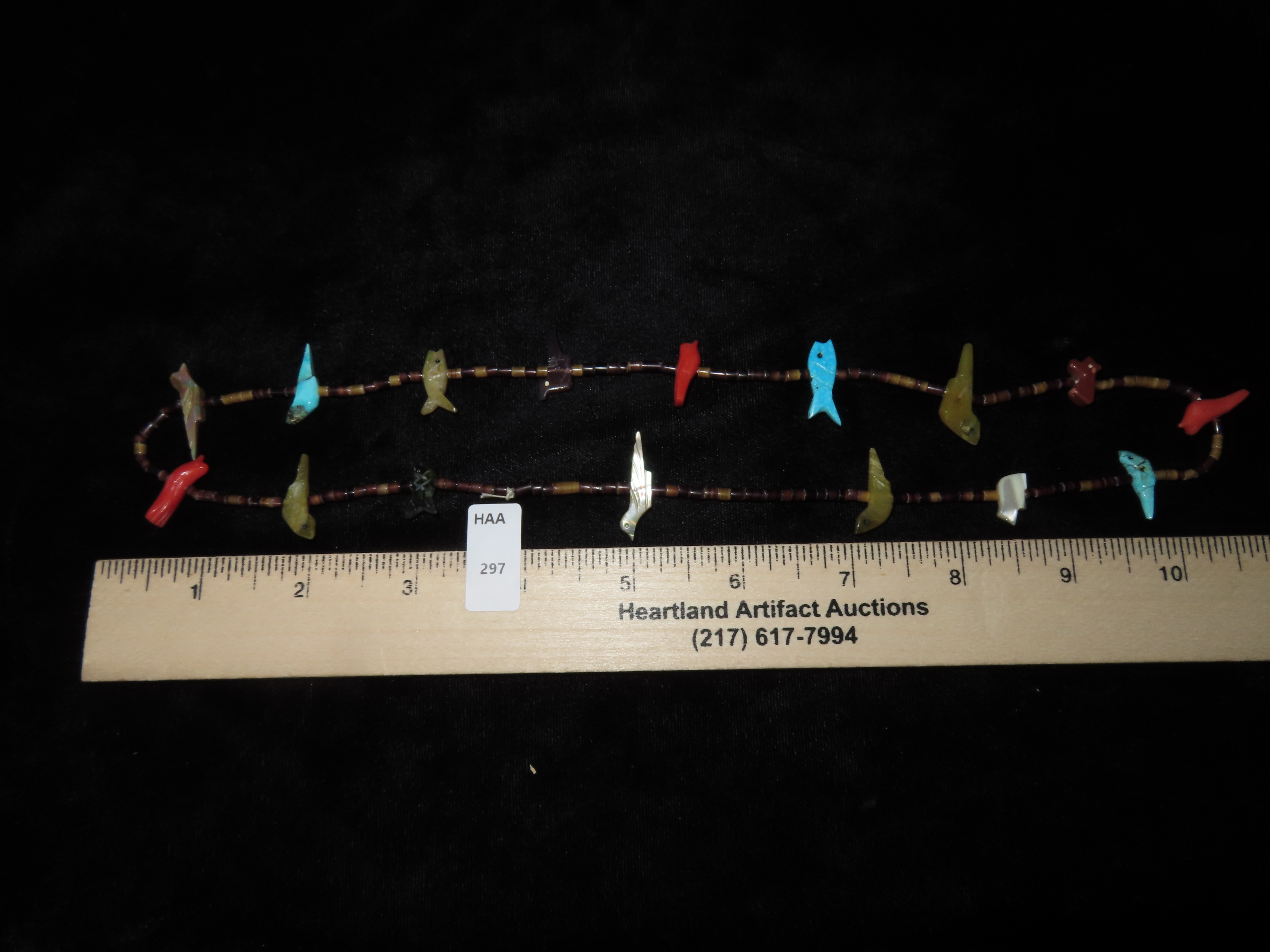 21″ ZUNI ANIMAL FETISH BEADED NECKLACE, INTRICATELY CARVED BIRDS, FISH, BEAR, ETC, NICE COLORFUL NECKLACE
