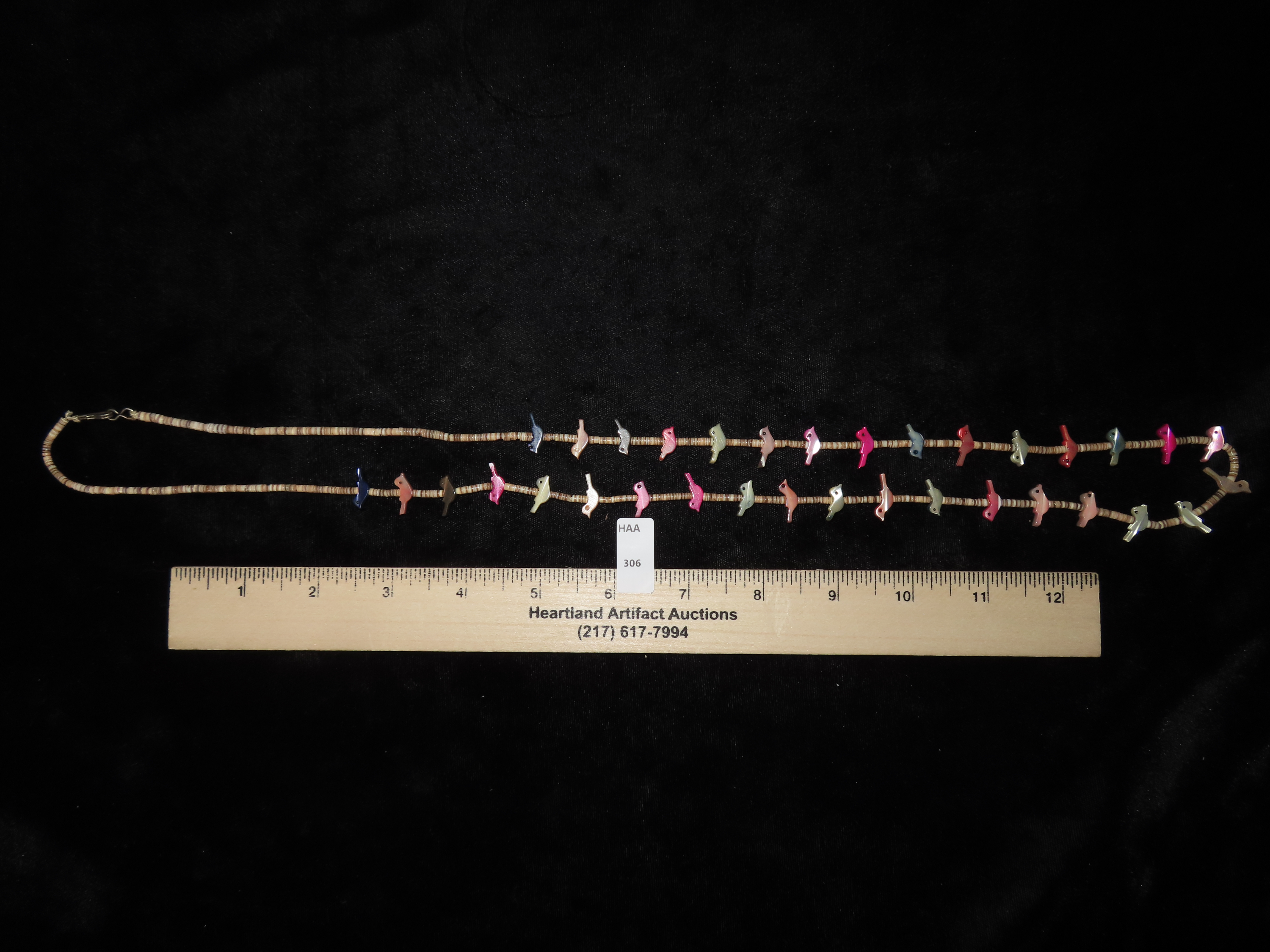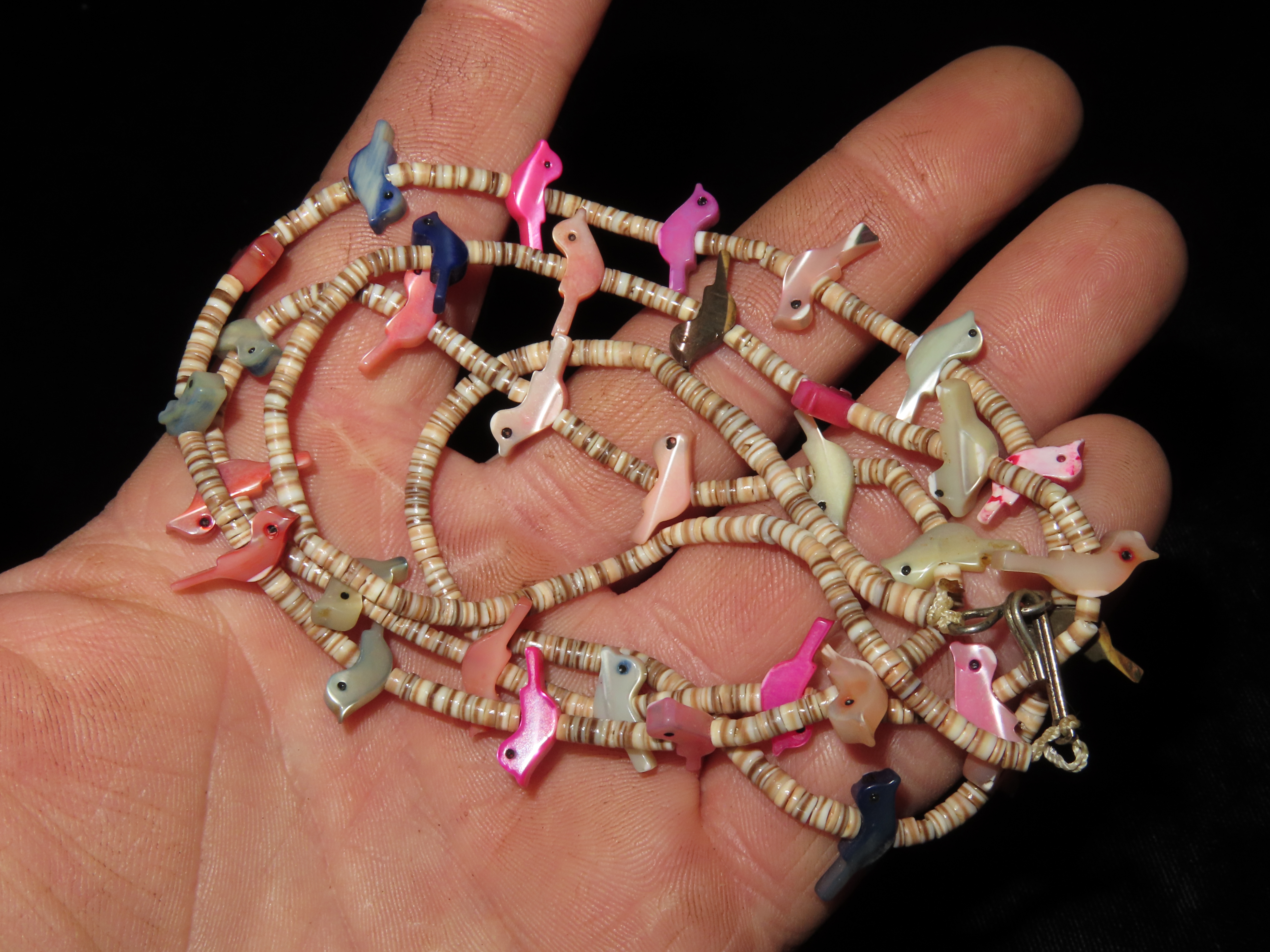 33″ LONG ZUNI ANIMAL FETISH NECKLACE, COLORFUL CARVED BIRDS NICELY STRUNG WITH HEISHI BEADS, NICE LARGE COLORFUL EXAMPLE
