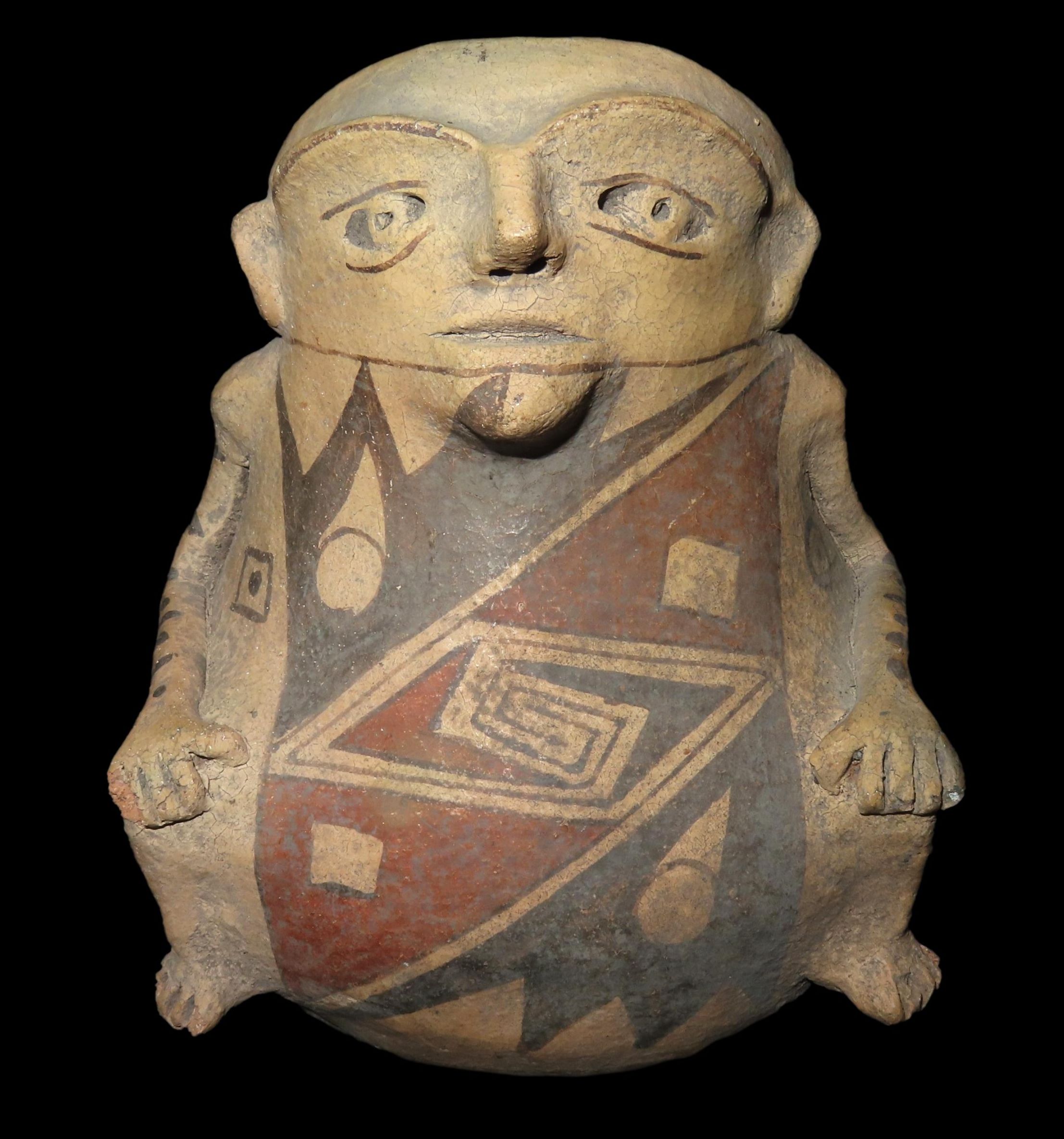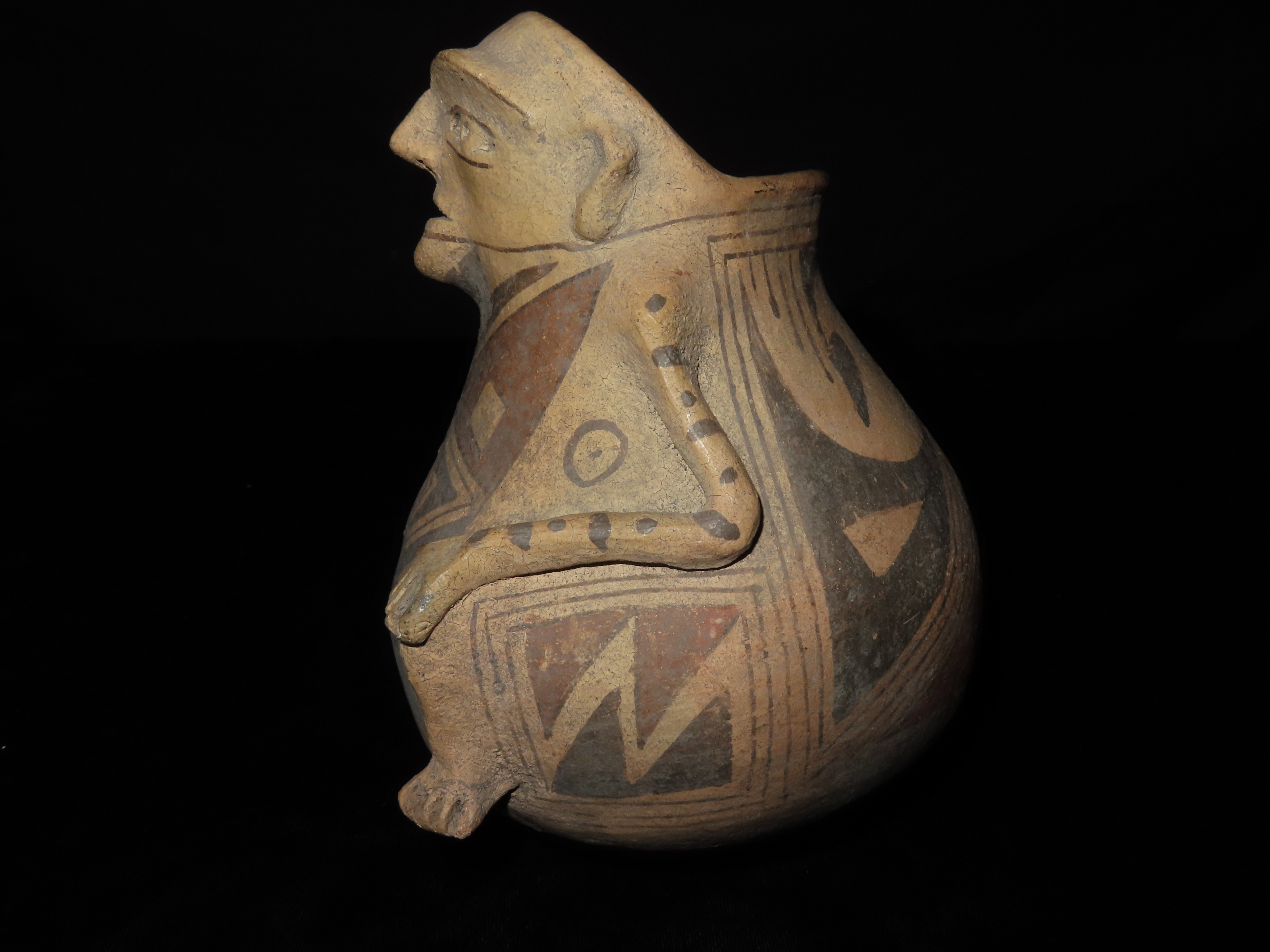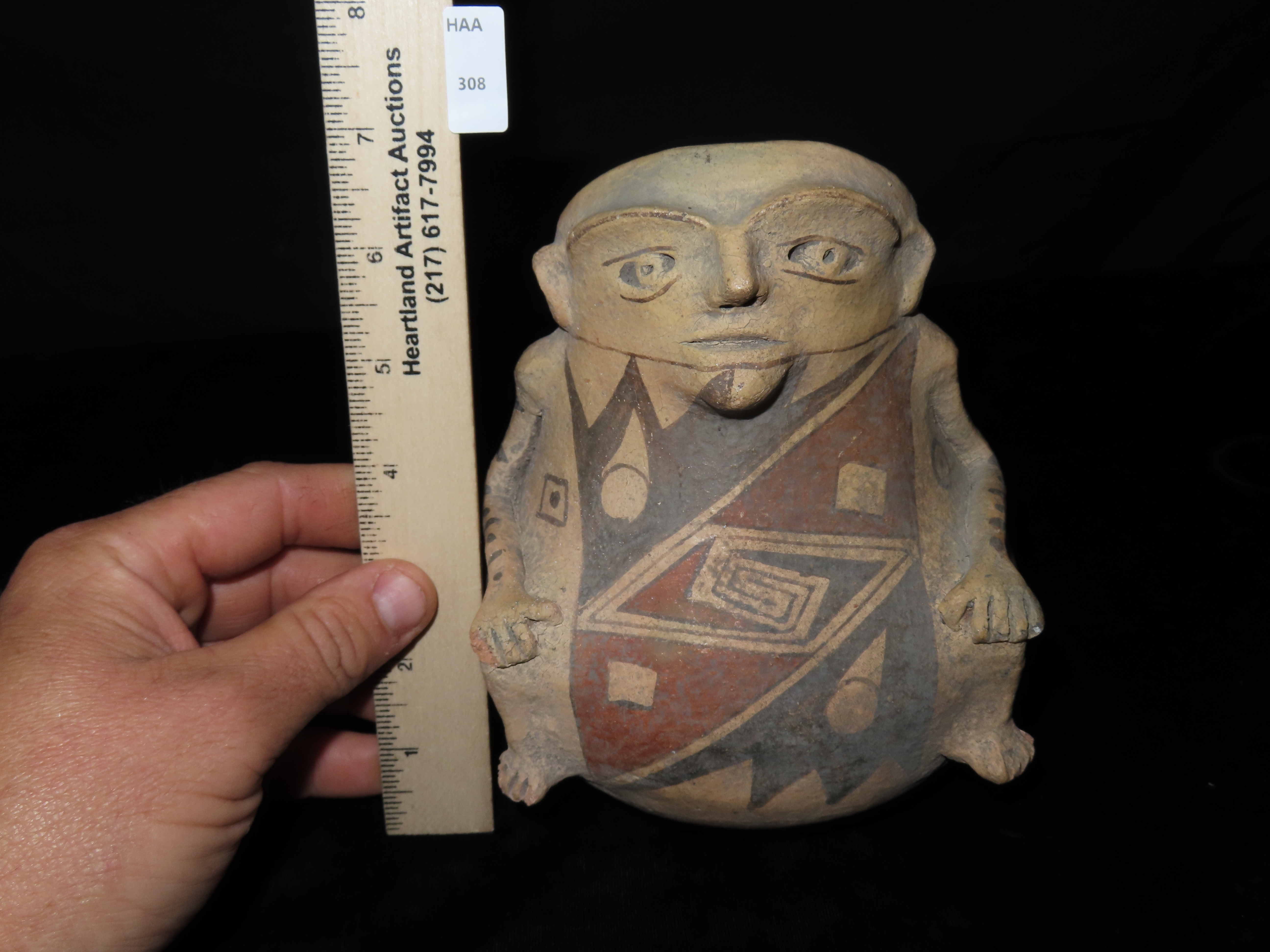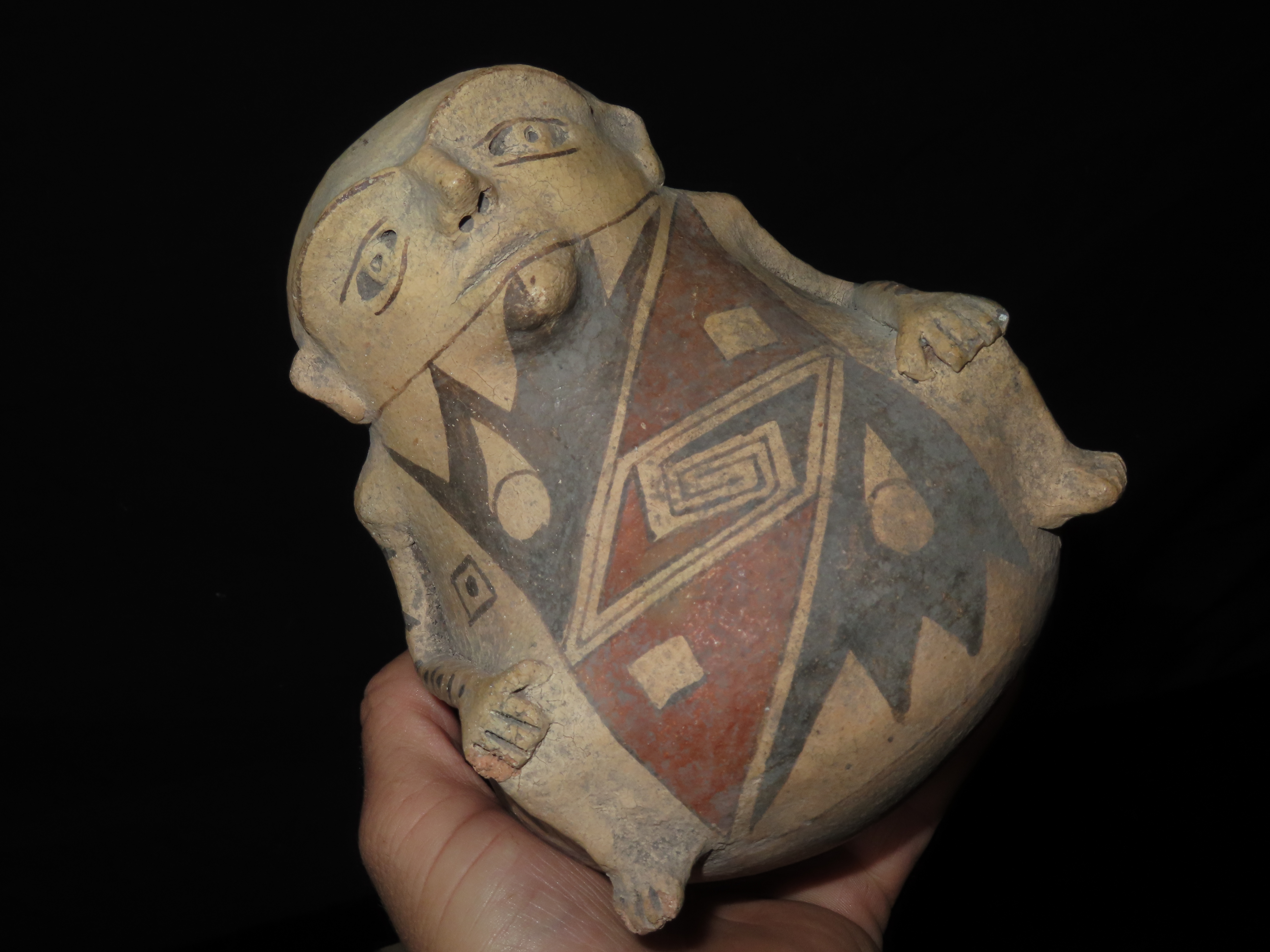 INCREDIBLE 7″ TALL CASAS GRANDES HUMAN EFFIGY POTTERY VESSEL, EXQUISITE DETAIL TO FACE & ARMS, BEAUTIFUL ORIGINAL HAND PAINTED POLYCHROME GEOMETRIC DESIGNS, 100% SOLID WITH NO REPAIRS OR RESTORATION, CIRCA 1280 TO 1440 CE.