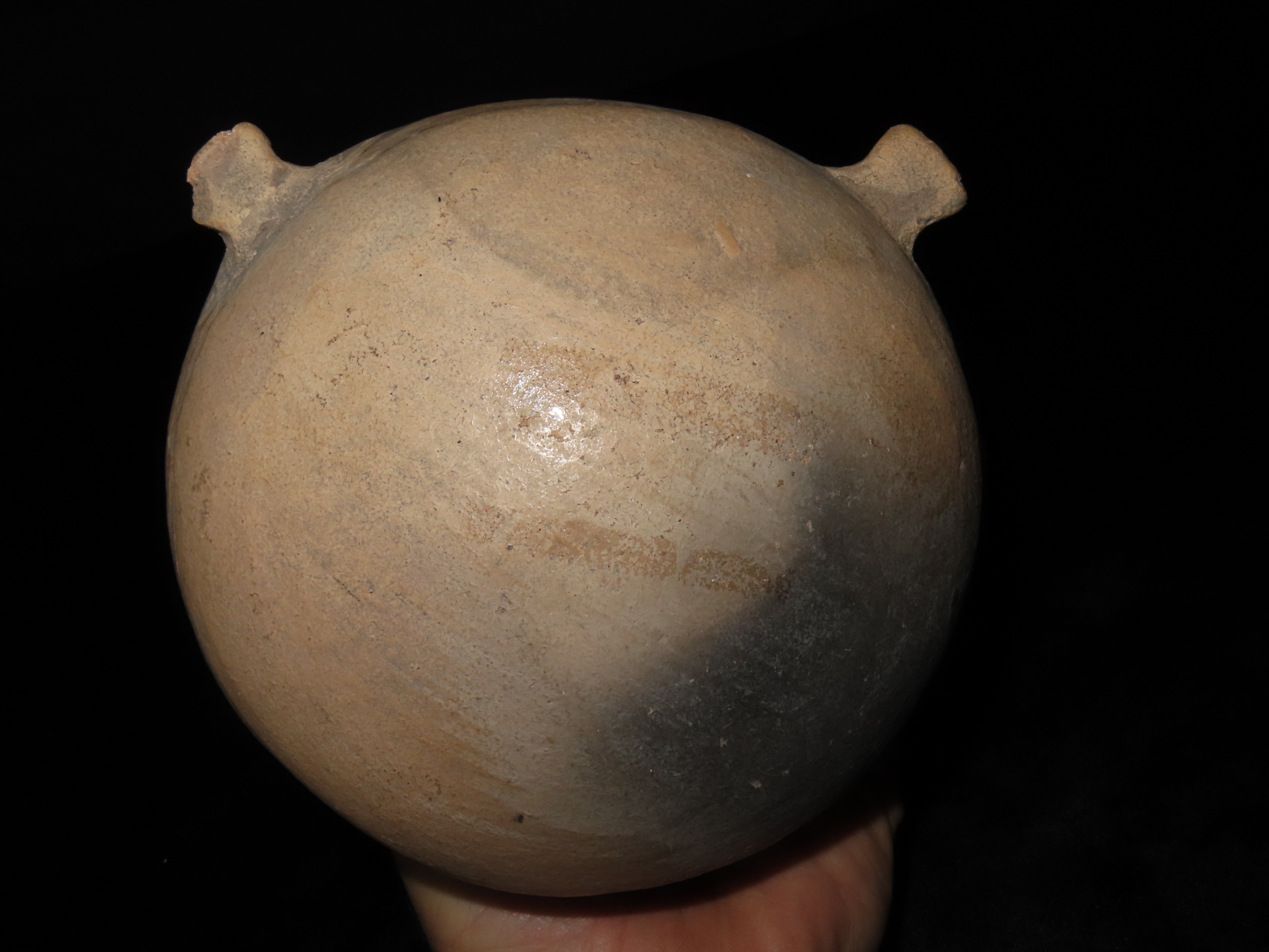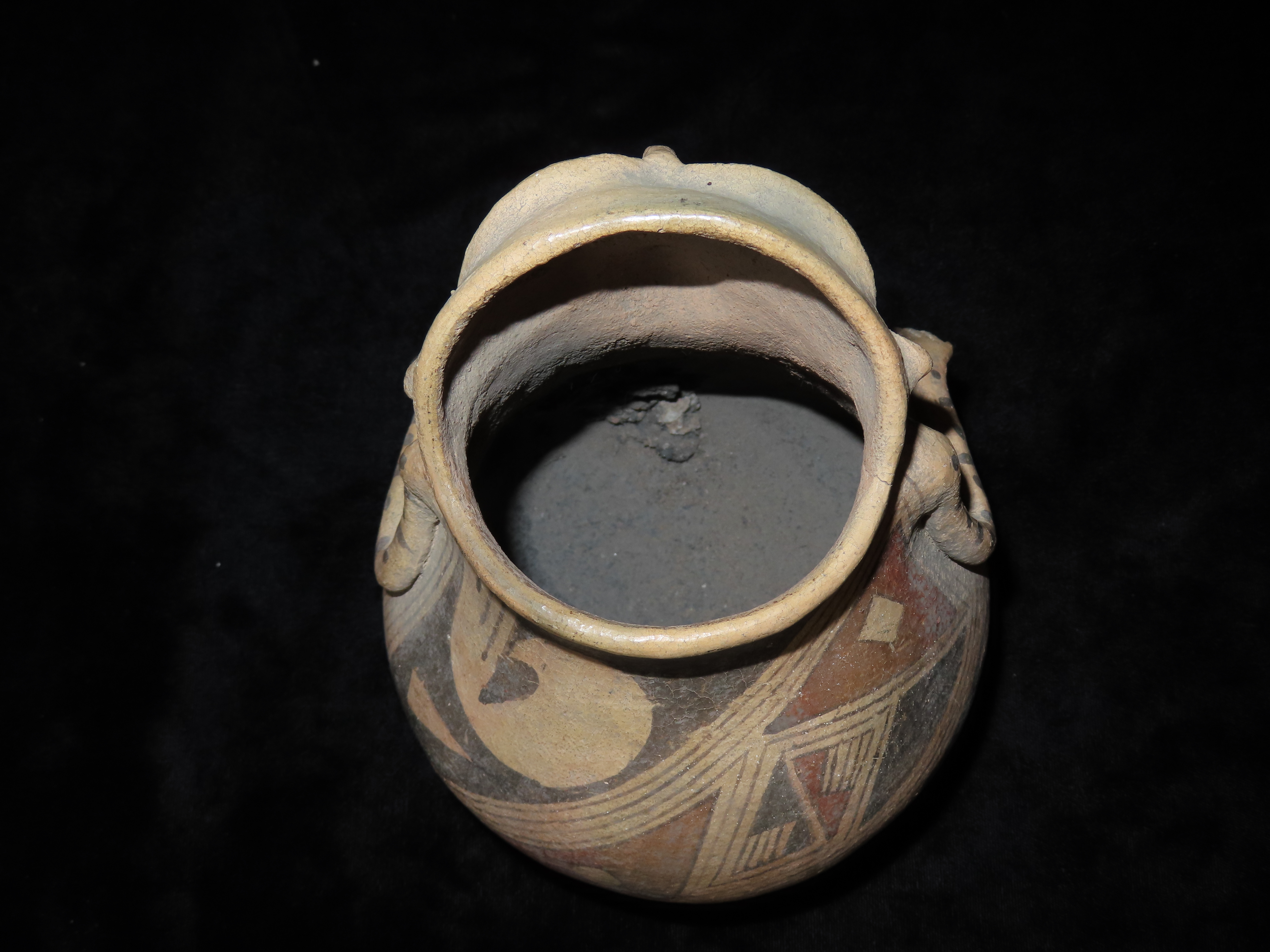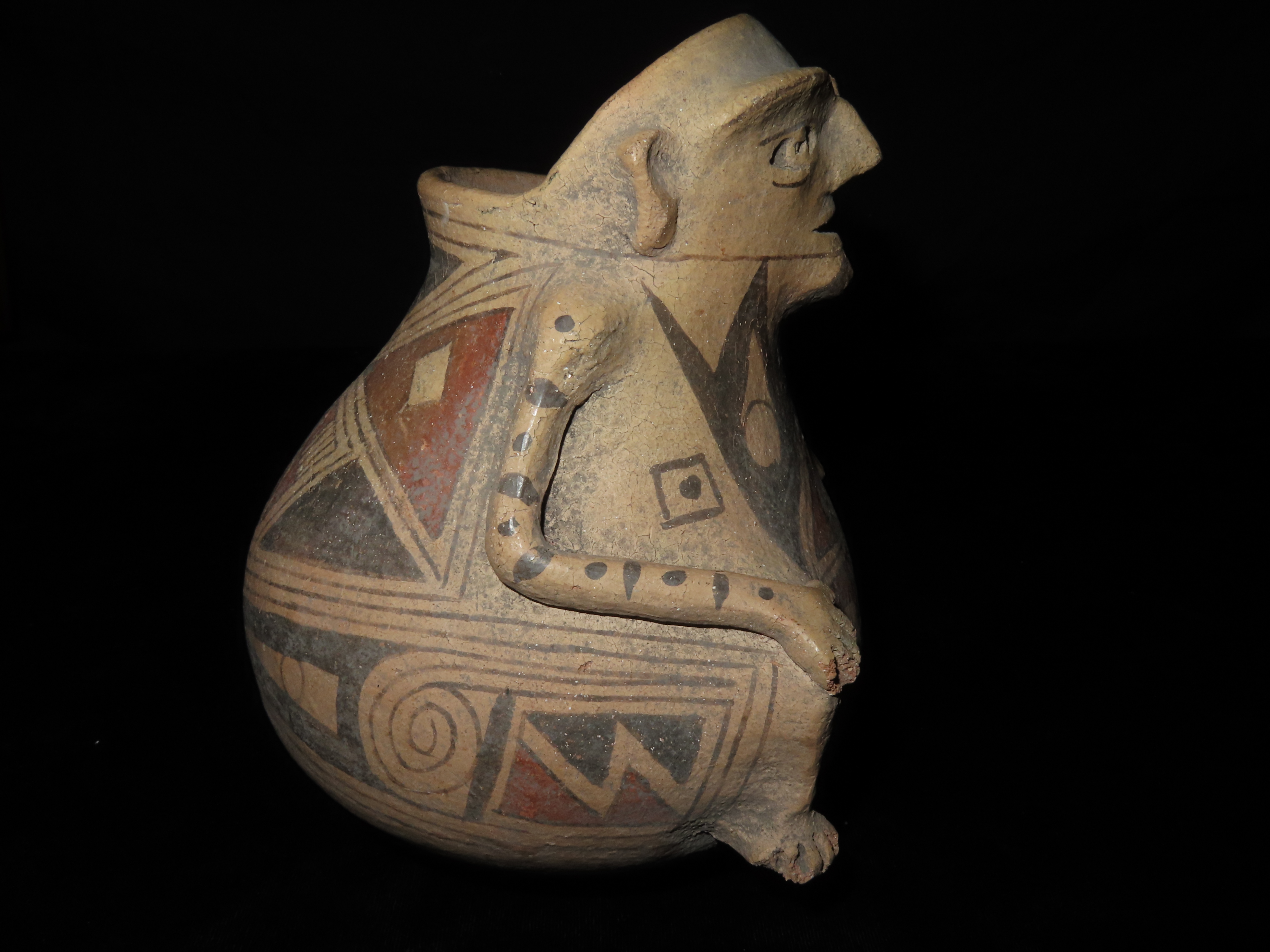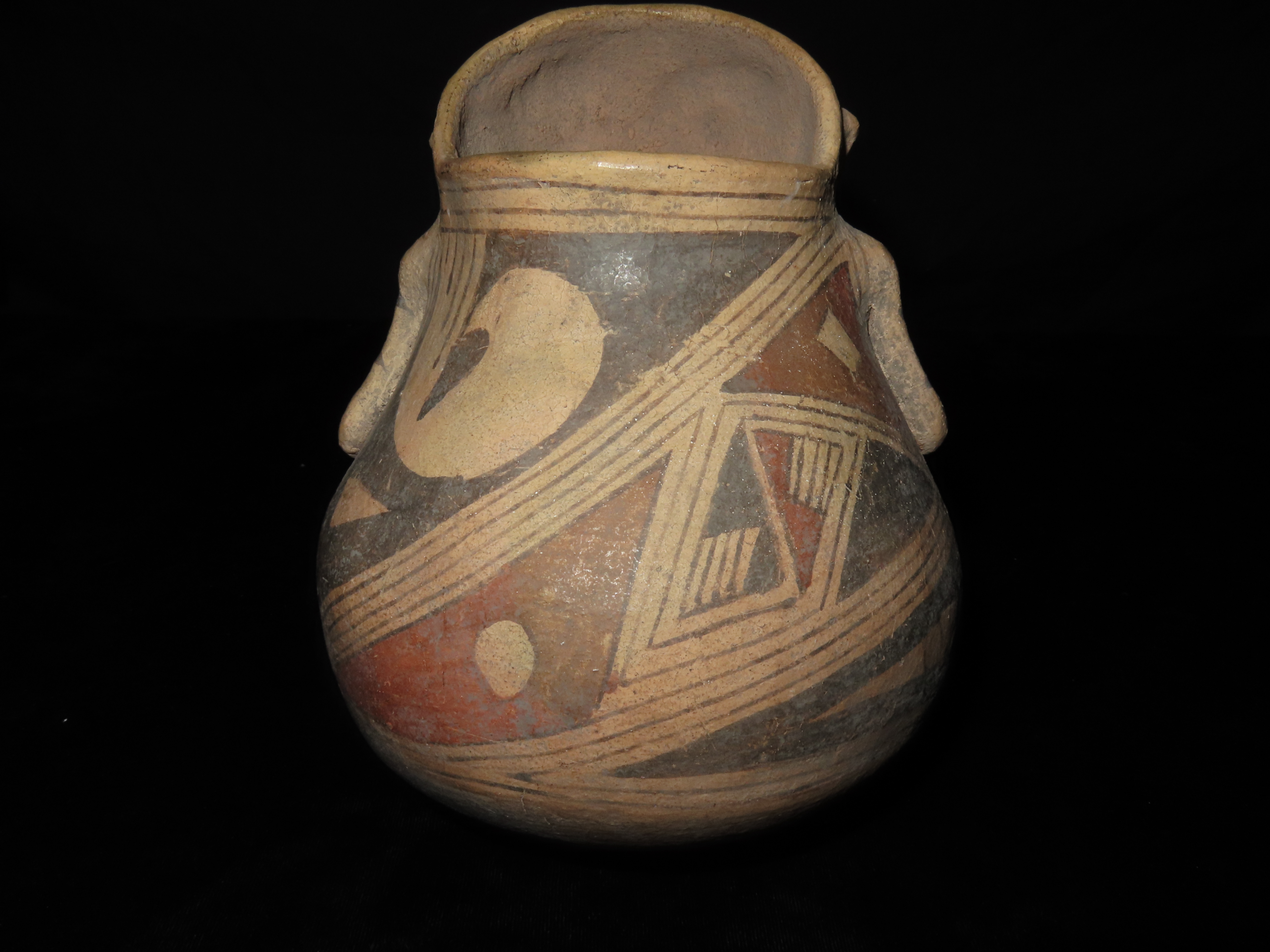 INCREDIBLE 7″ TALL CASAS GRANDES HUMAN EFFIGY POTTERY VESSEL, EXQUISITE DETAIL TO FACE & ARMS, BEAUTIFUL ORIGINAL HAND PAINTED POLYCHROME GEOMETRIC DESIGNS, 100% SOLID WITH NO REPAIRS OR RESTORATION, CIRCA 1280 TO 1440 CE.