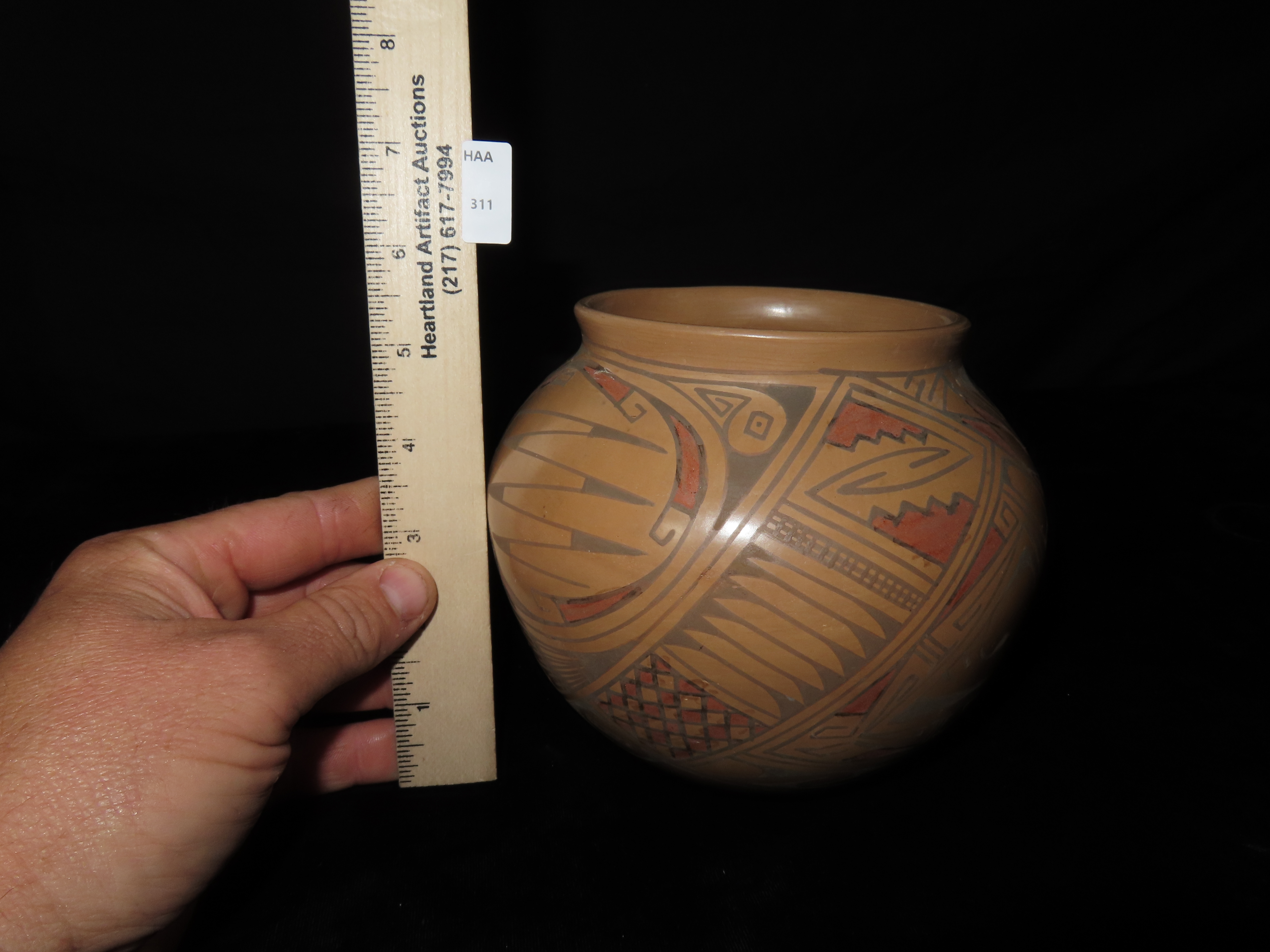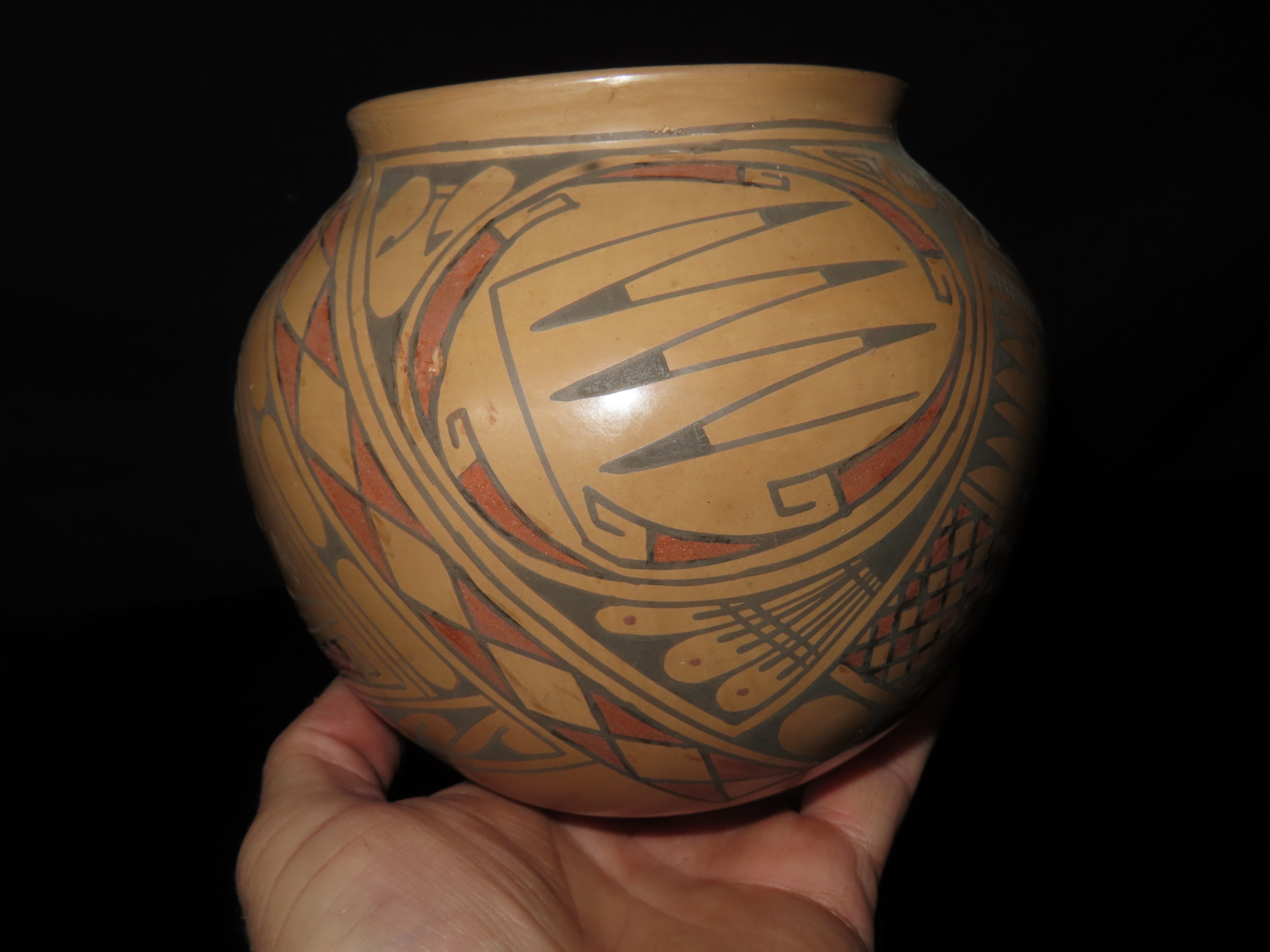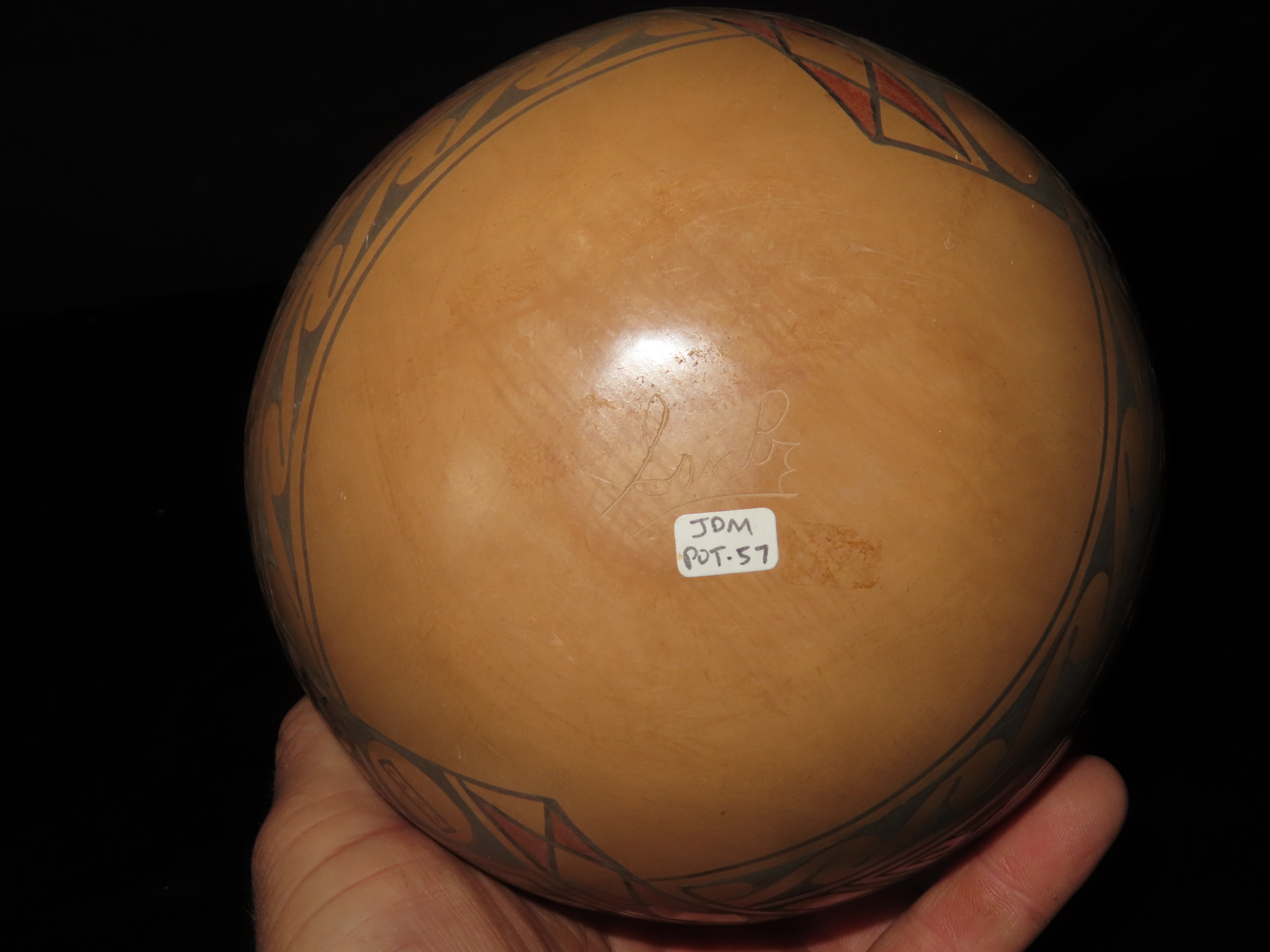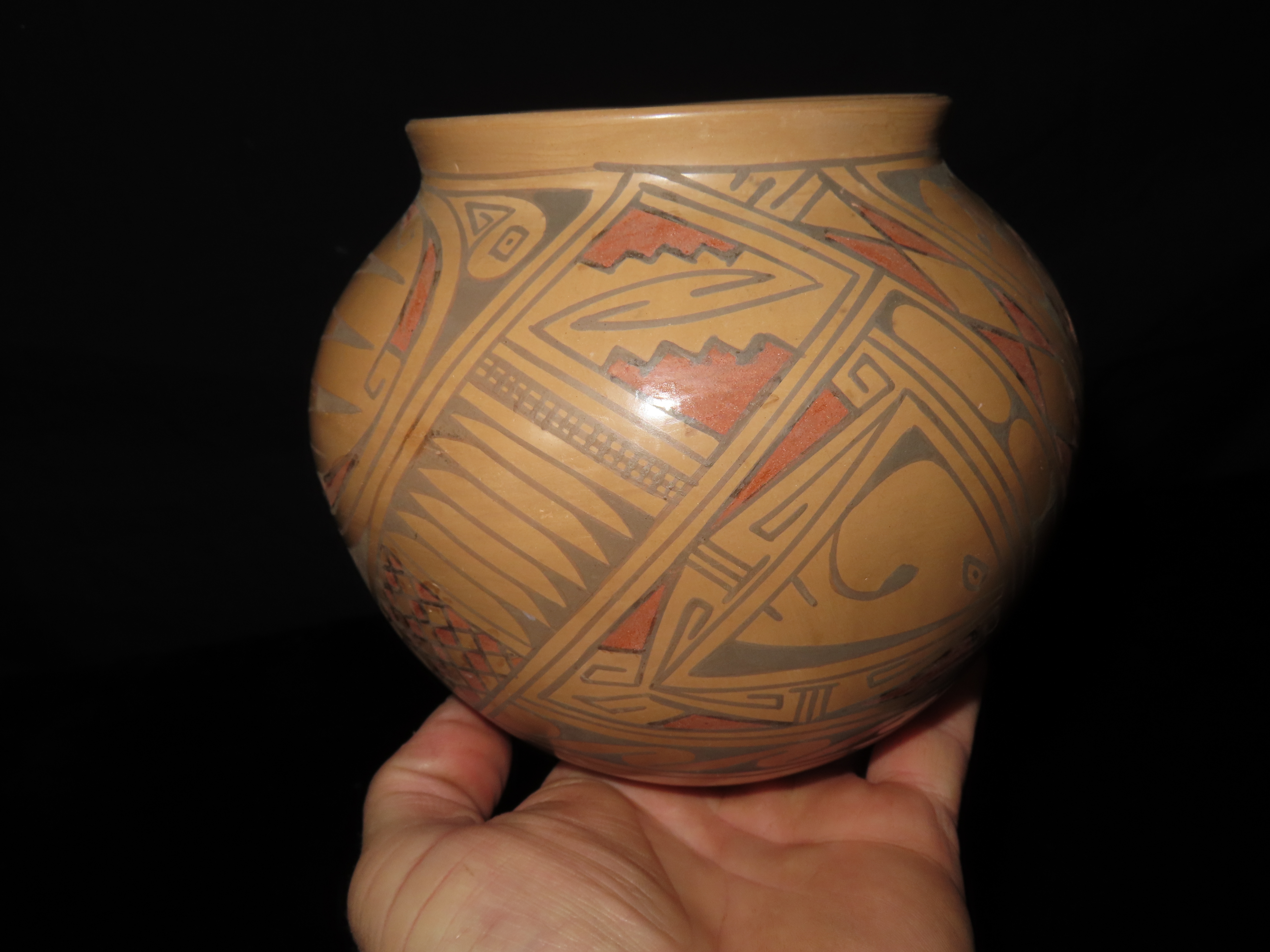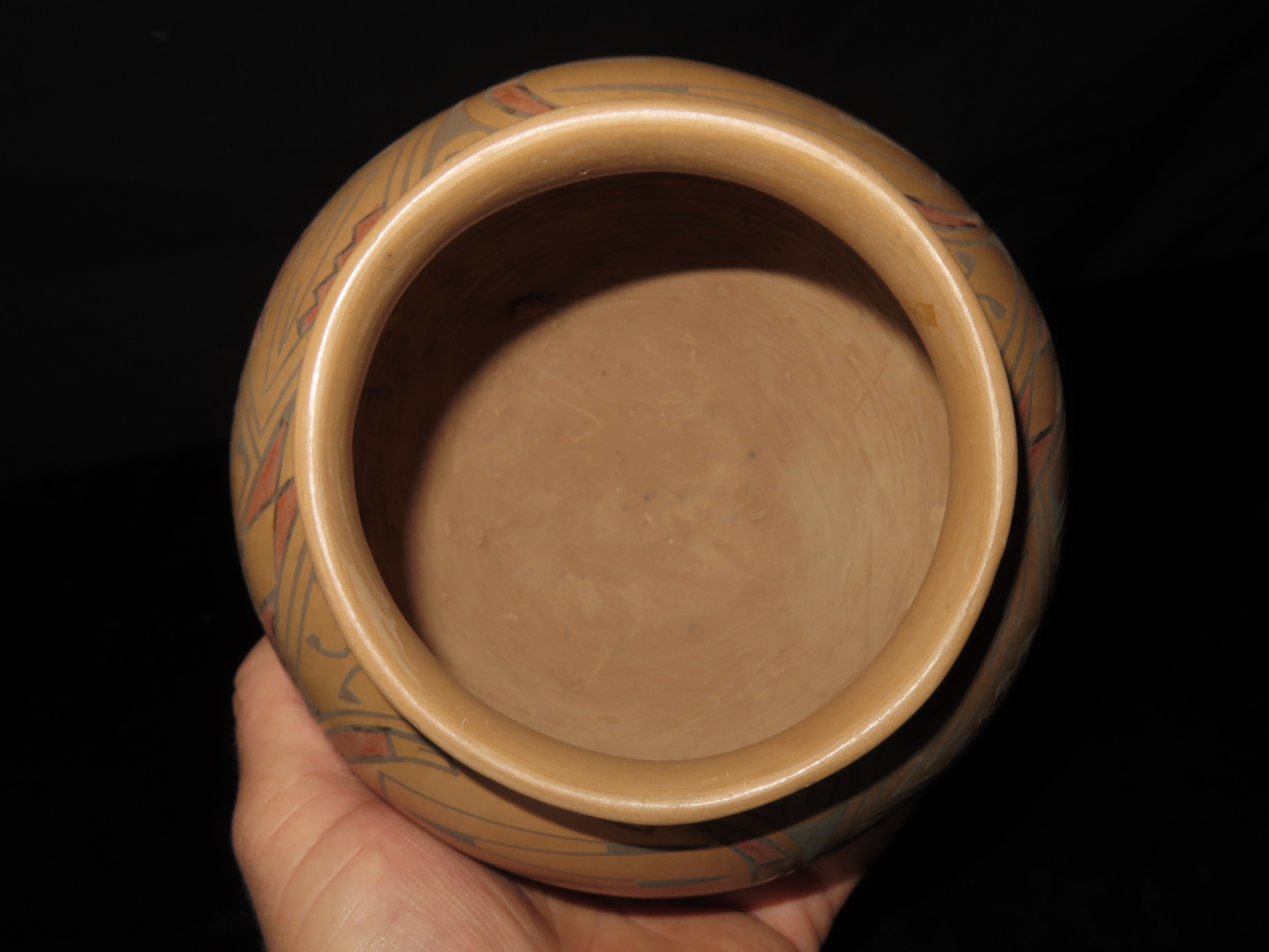 6 X 6 1/4" BEAUTIFUL MATA ORTIZ POLYCHROME POTTERY JAR / BOWL, SIGNED "SanBe" NICE HAND PAINTED DESIGN, MEXICO CIRCA 1930'S EXAMPLE