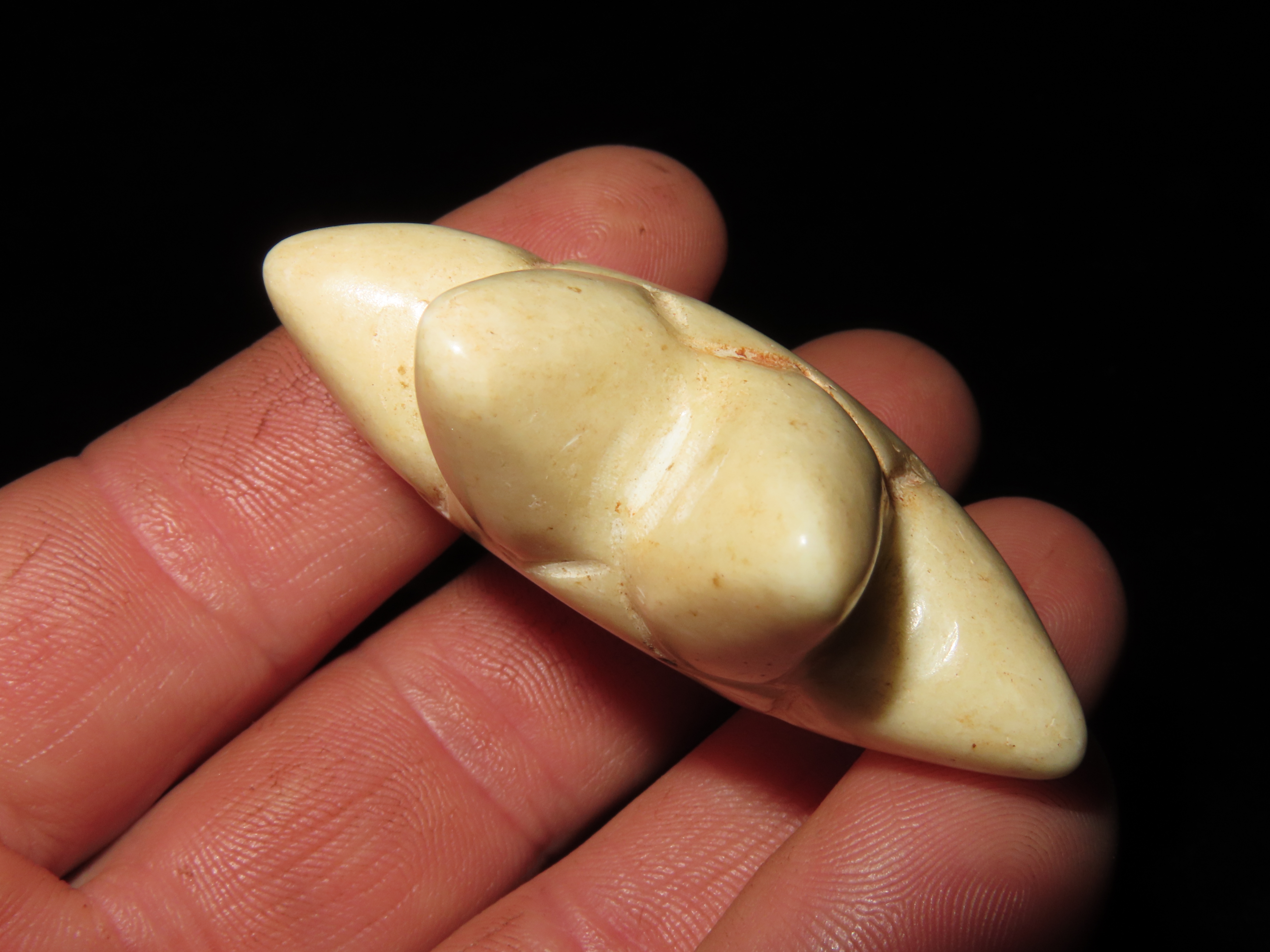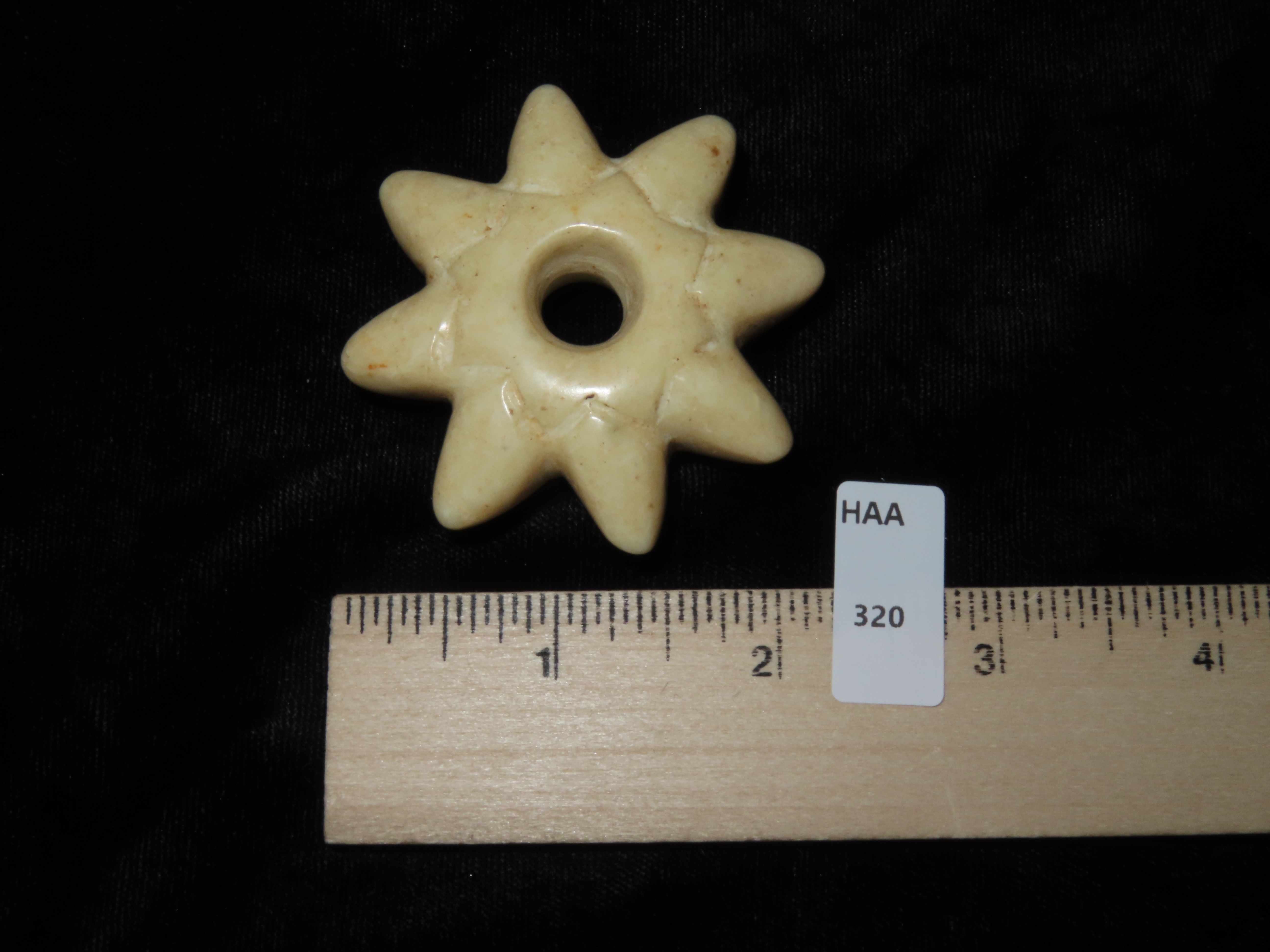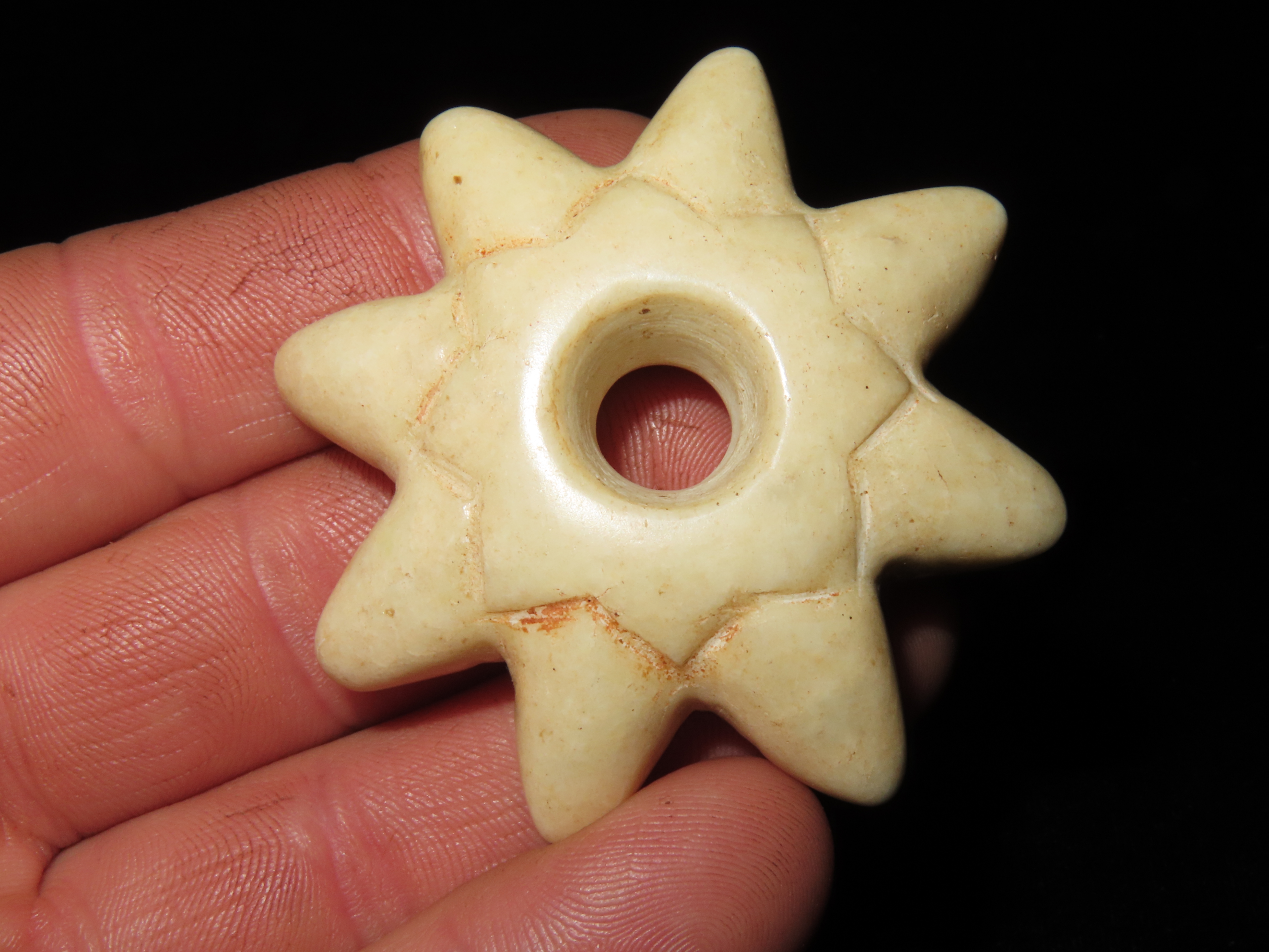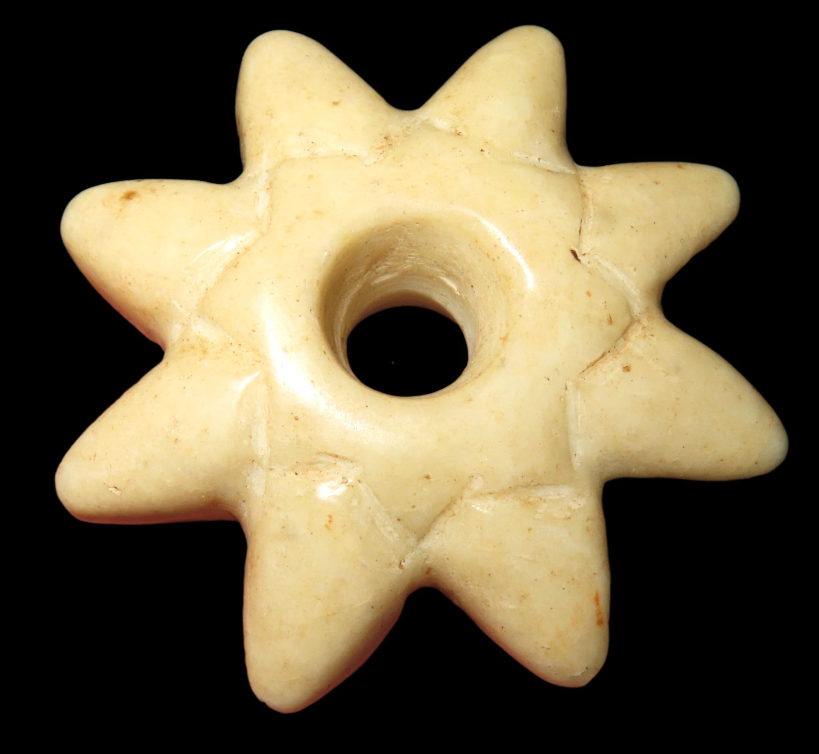 PRECOLUMBIAN STONE MACE HEAD, GREAT DESING & NICE POLISH, 2 1/4" WIDE X 3/4" THICK