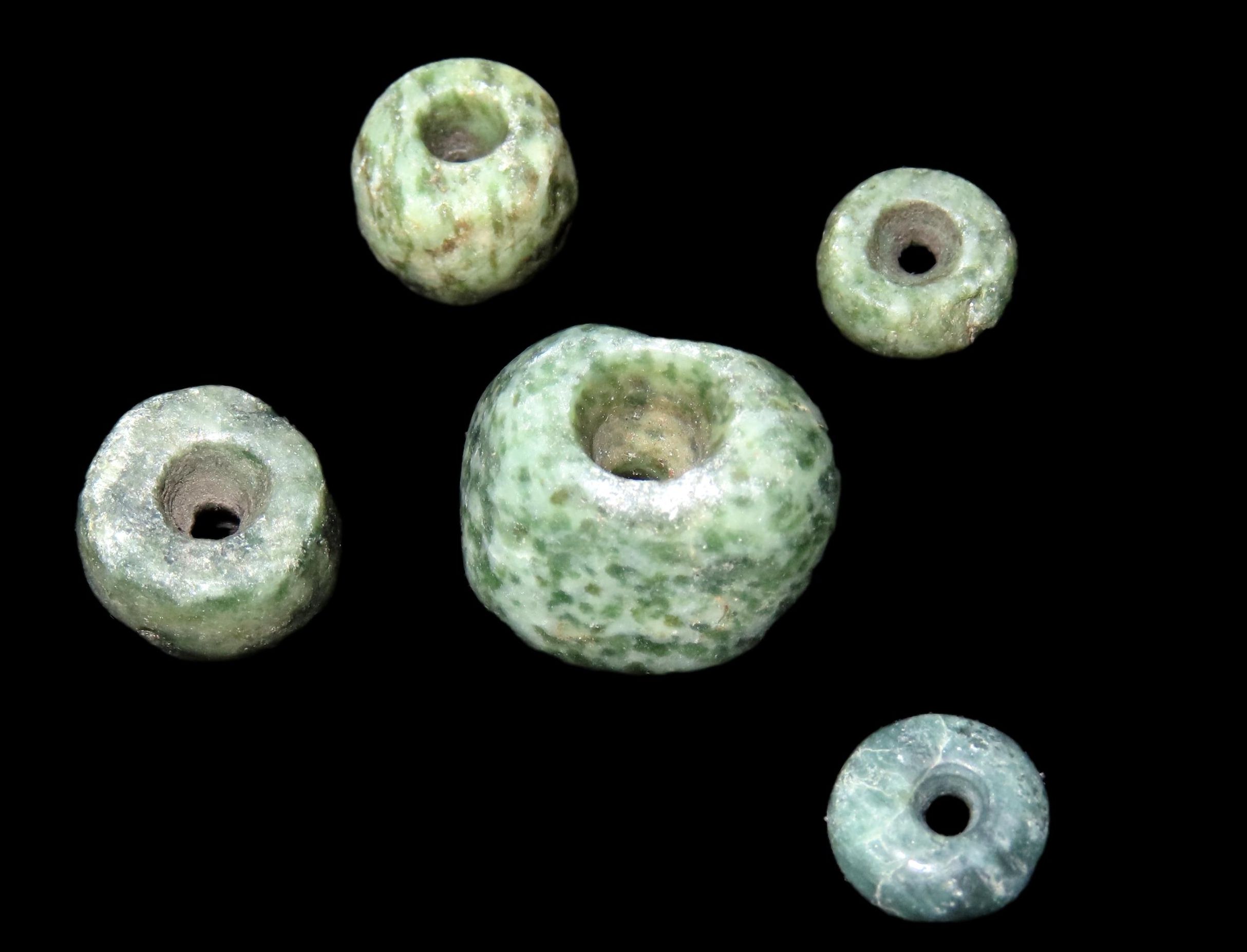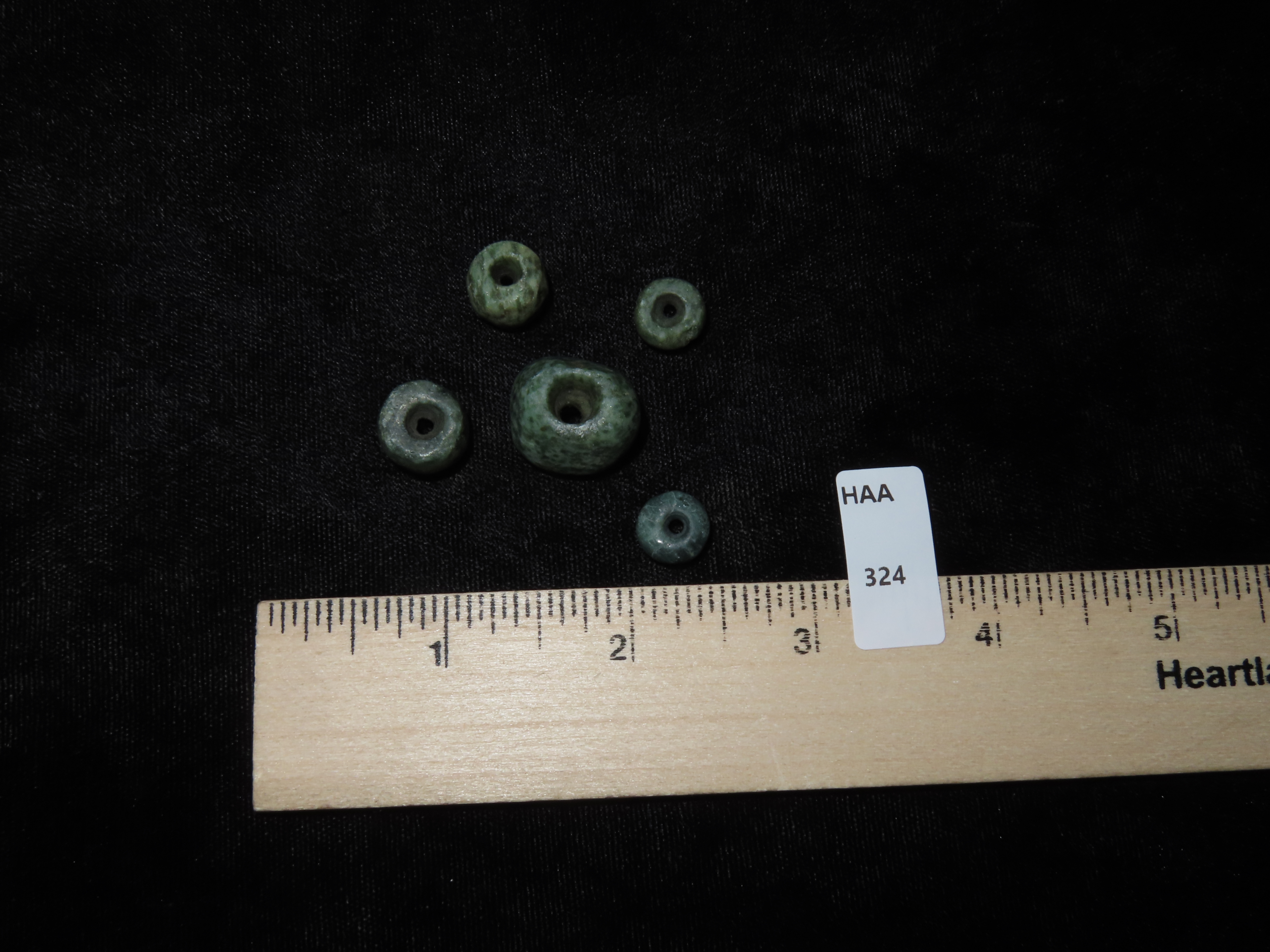 LOT OF 5 MEZCALA JADE / JADEITE BEADS FROM MEXICO, PRE-COLUMBIAN DRILLED STONE PENDANT, EX DR HARNER COLLECTION