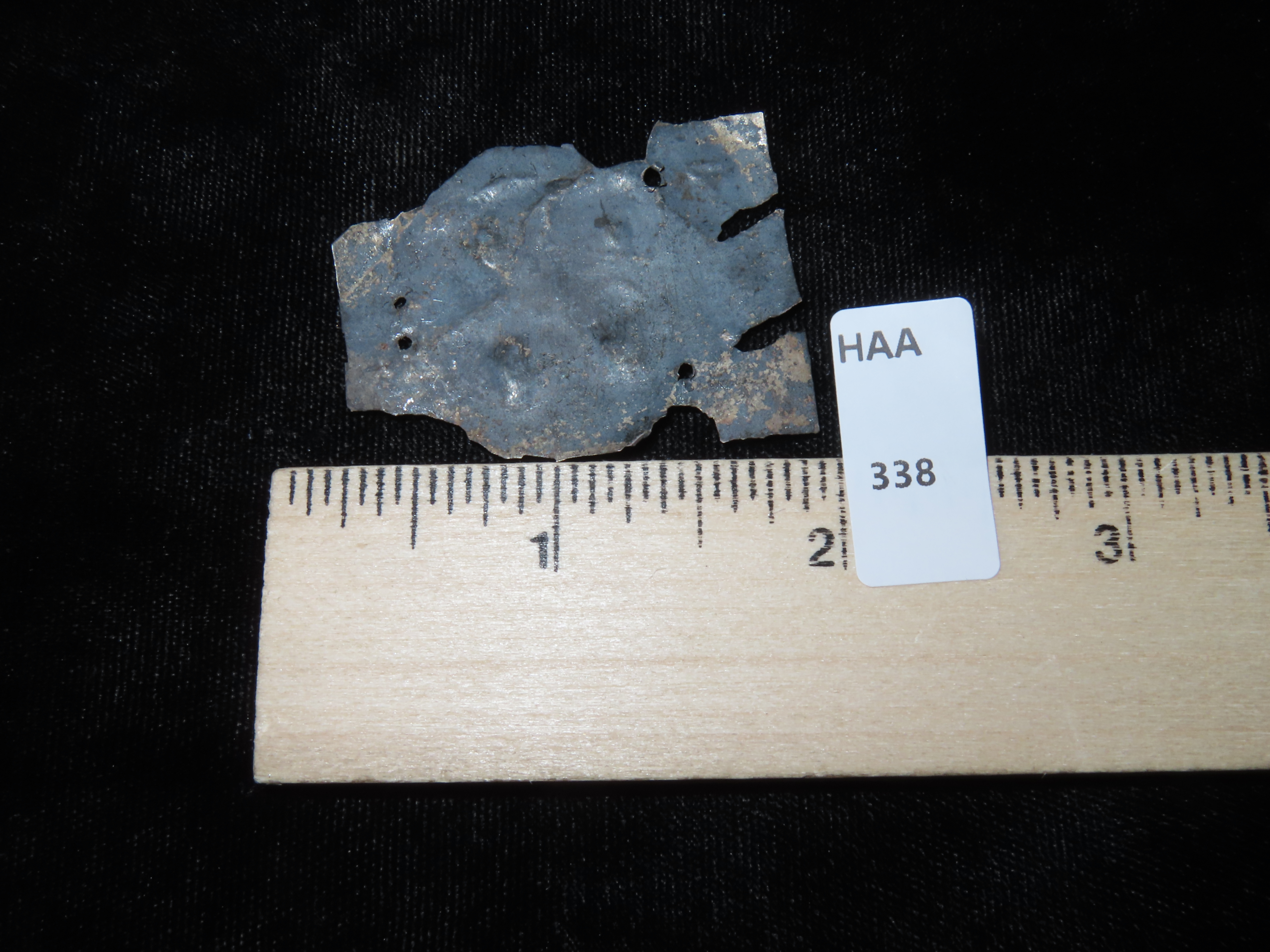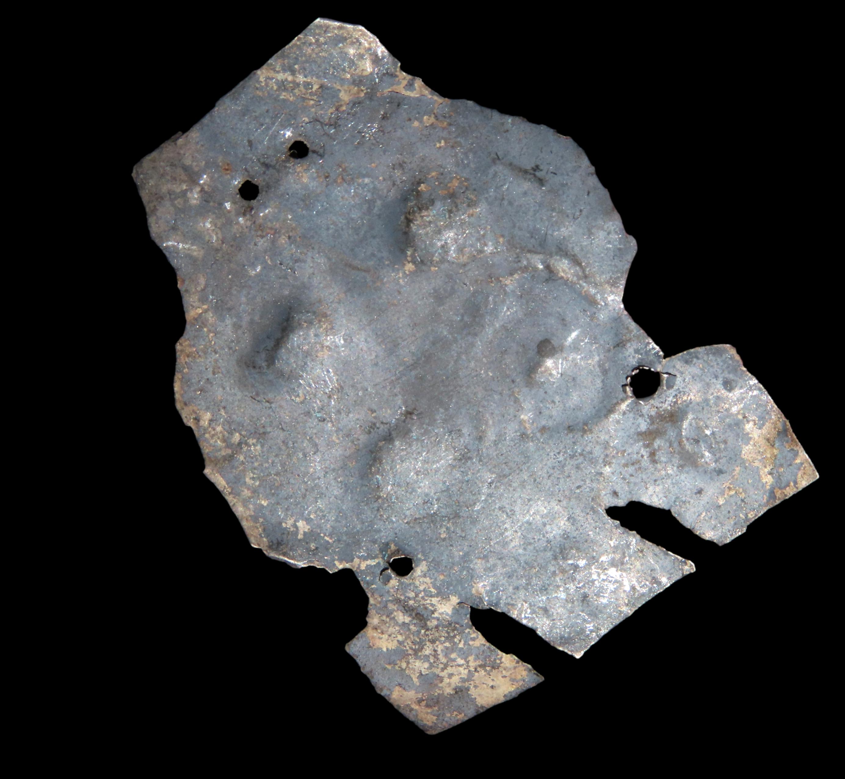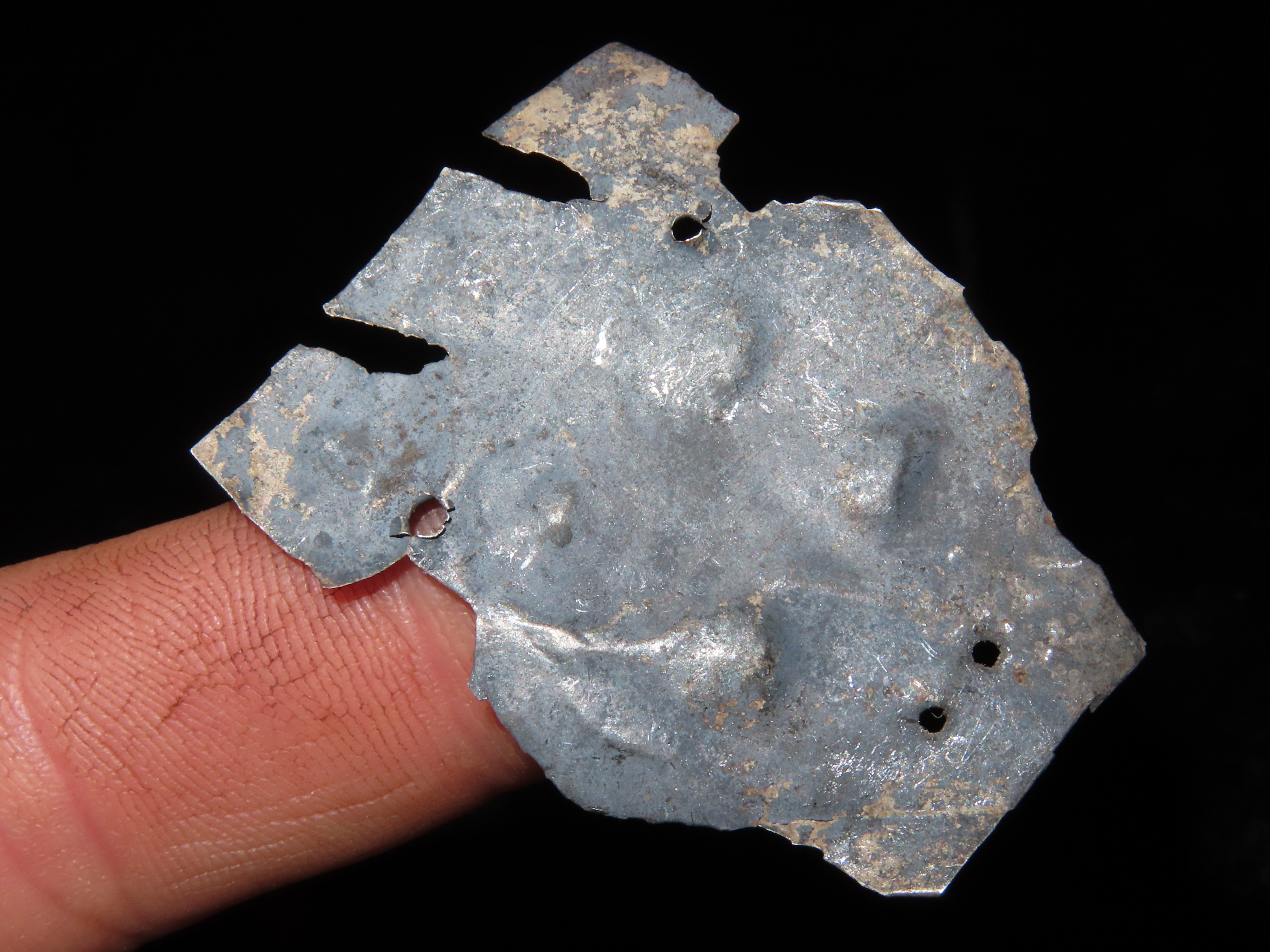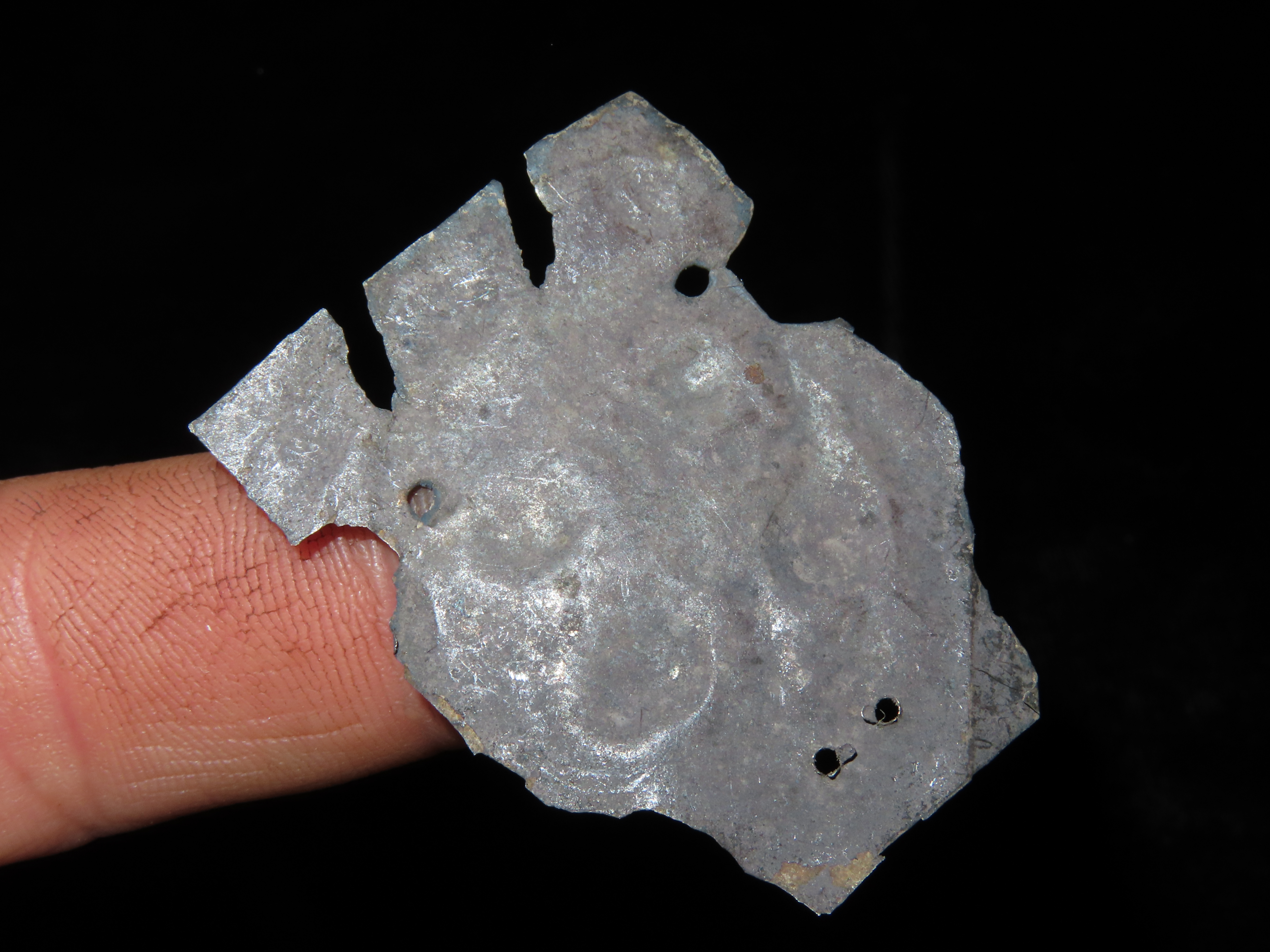 NICE PRECOLUMBIAN SILVER EFFIGY PENDANT FROM PERU, HAS RAISED DESIGN WITH SEVERAL PERFORATIONS FOR SUSPENSION