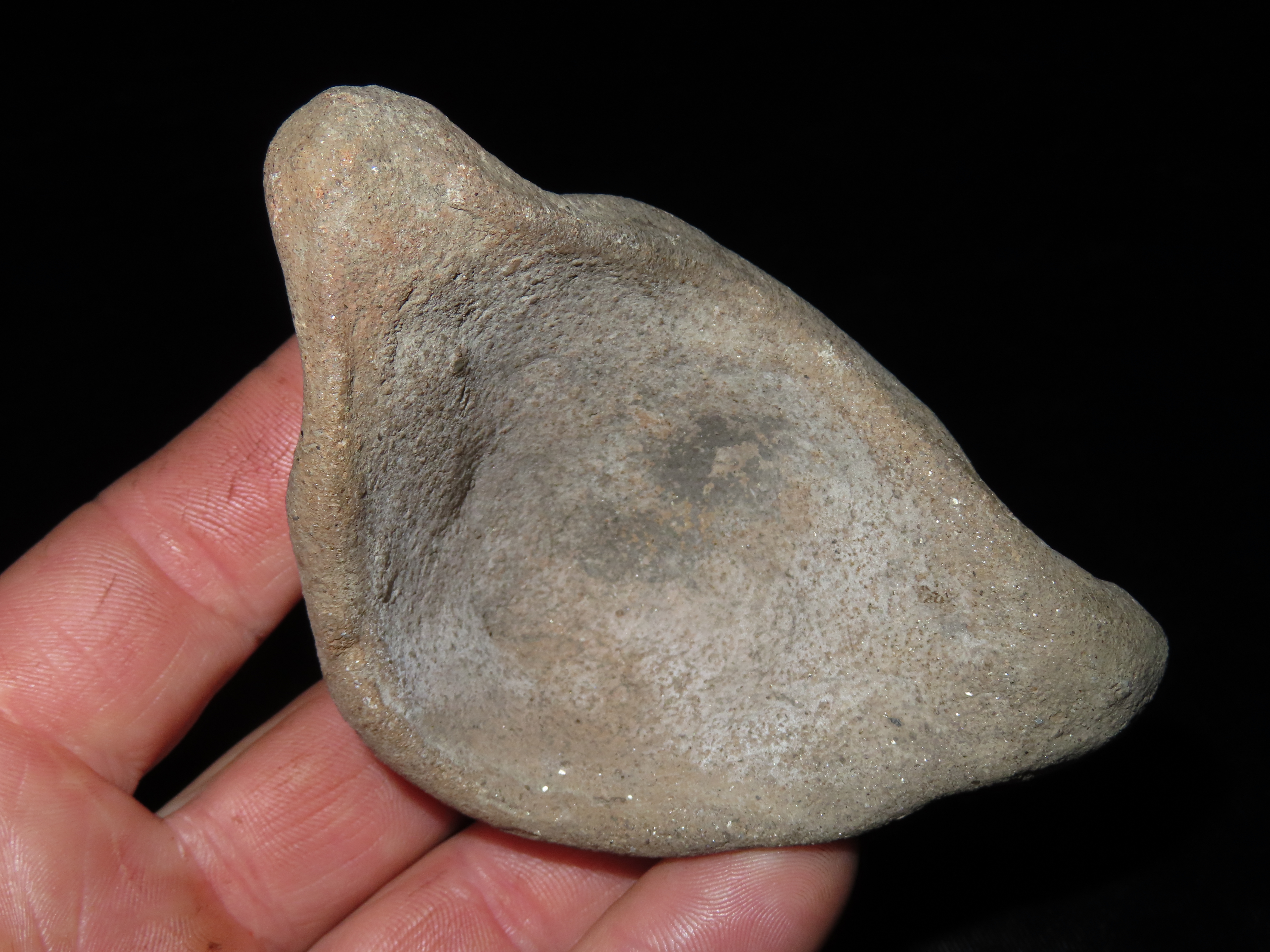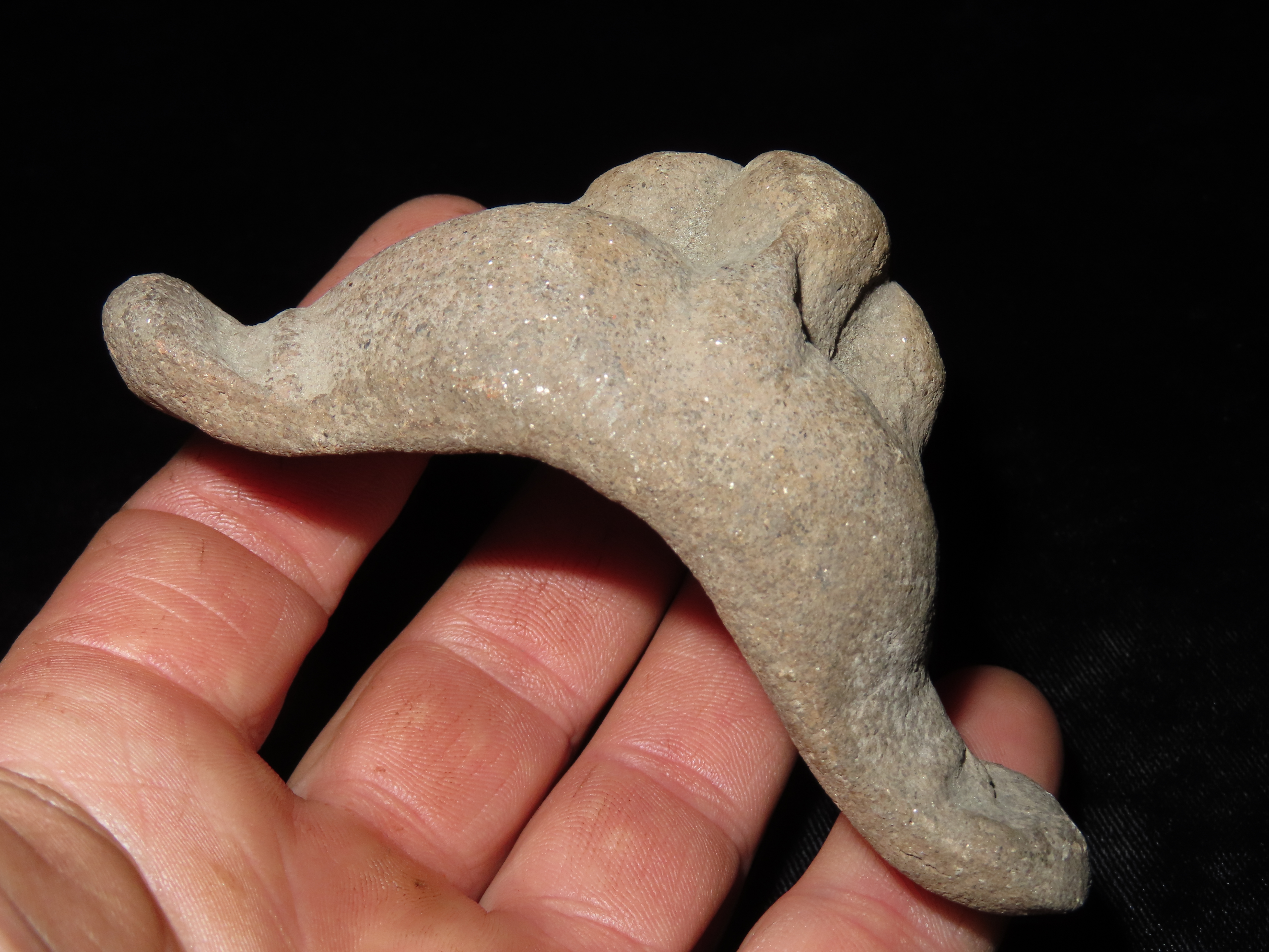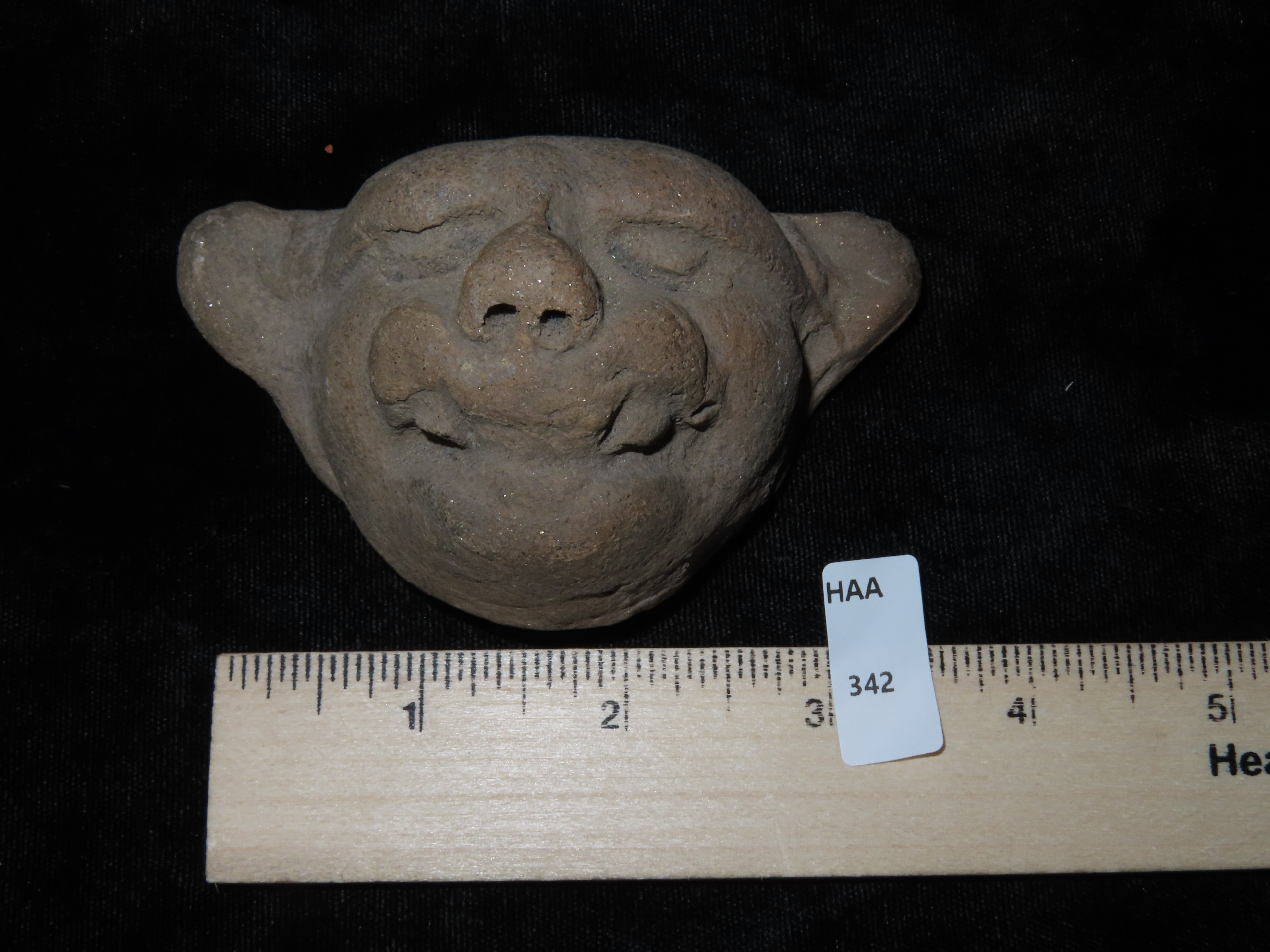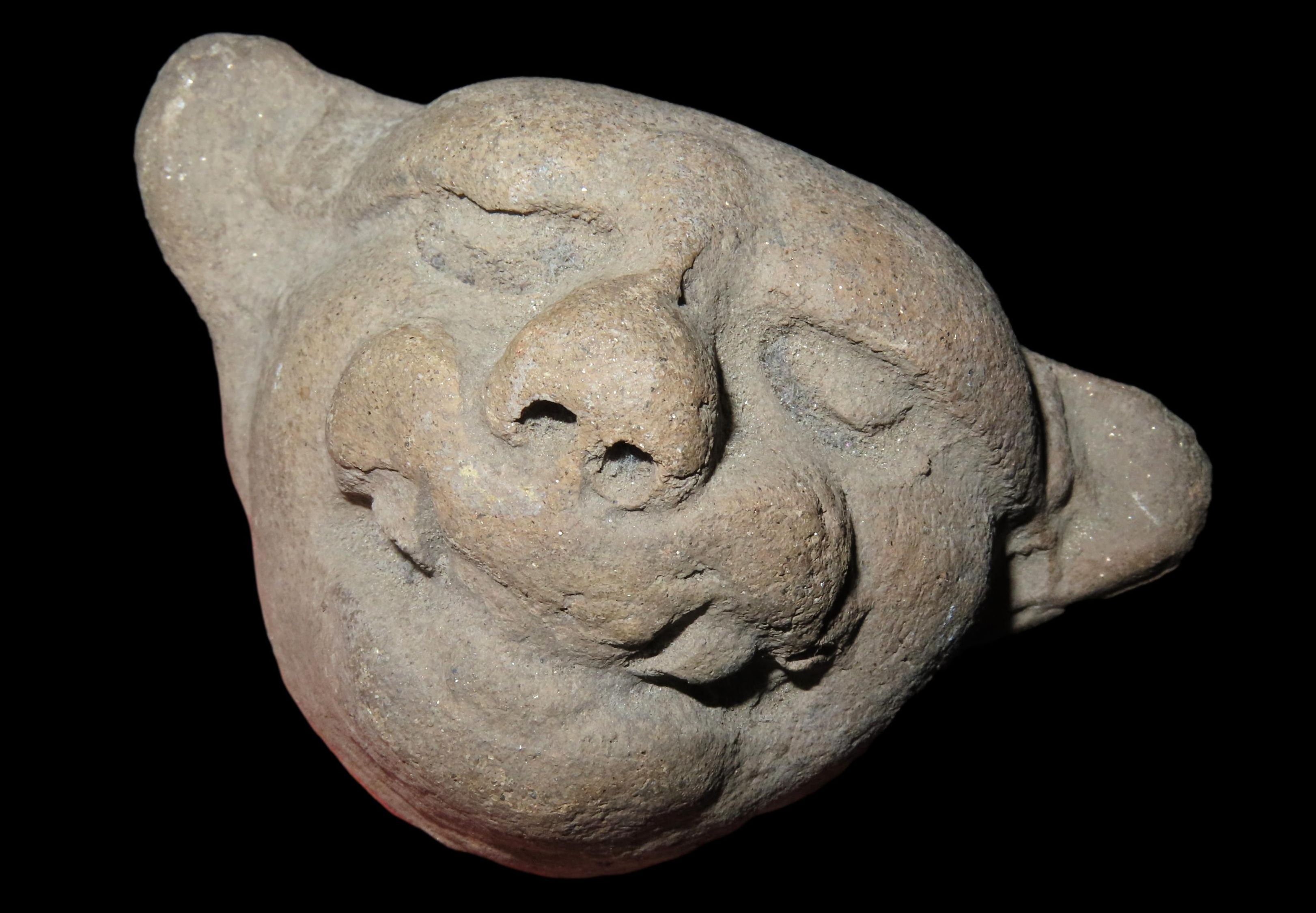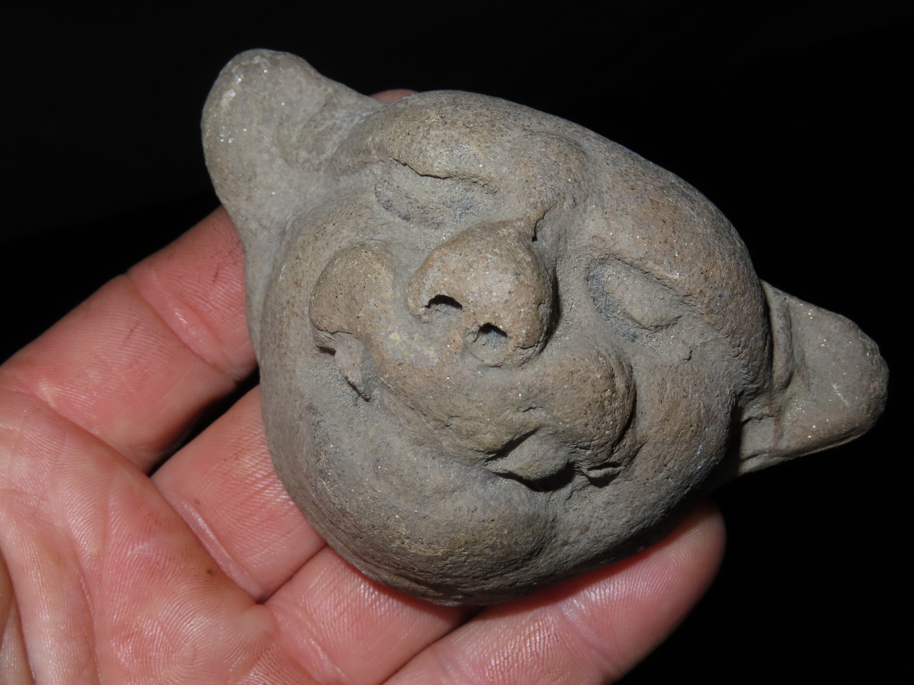 RARE PRECOLUMBIAN JAGUAR / HUMAN EFFIGY MASK / MASQUETTE FROM HONDURAS, GREAT REALISTIC DETAILS, 3 1/2″ WIDE, MADE FROM CLAY