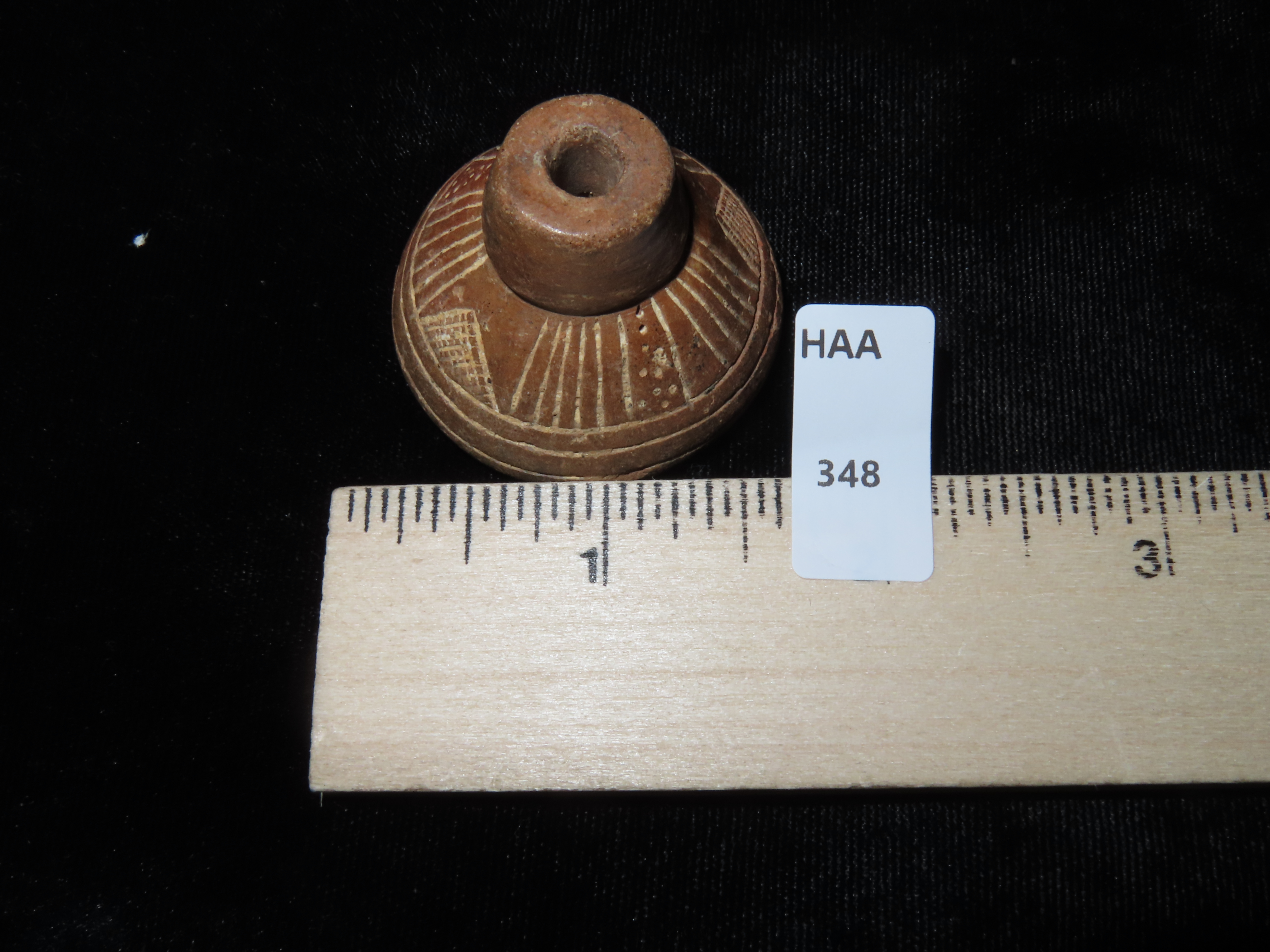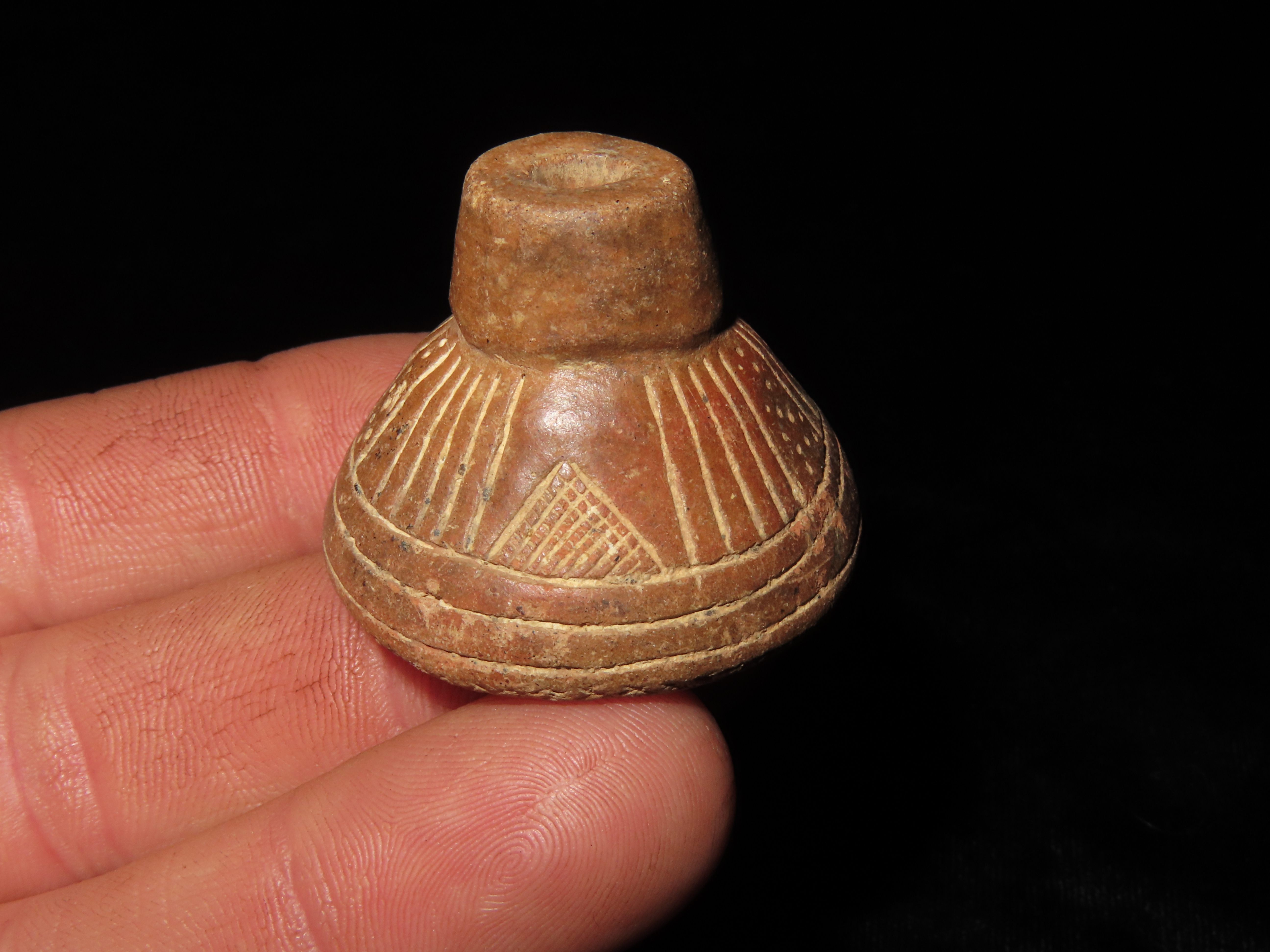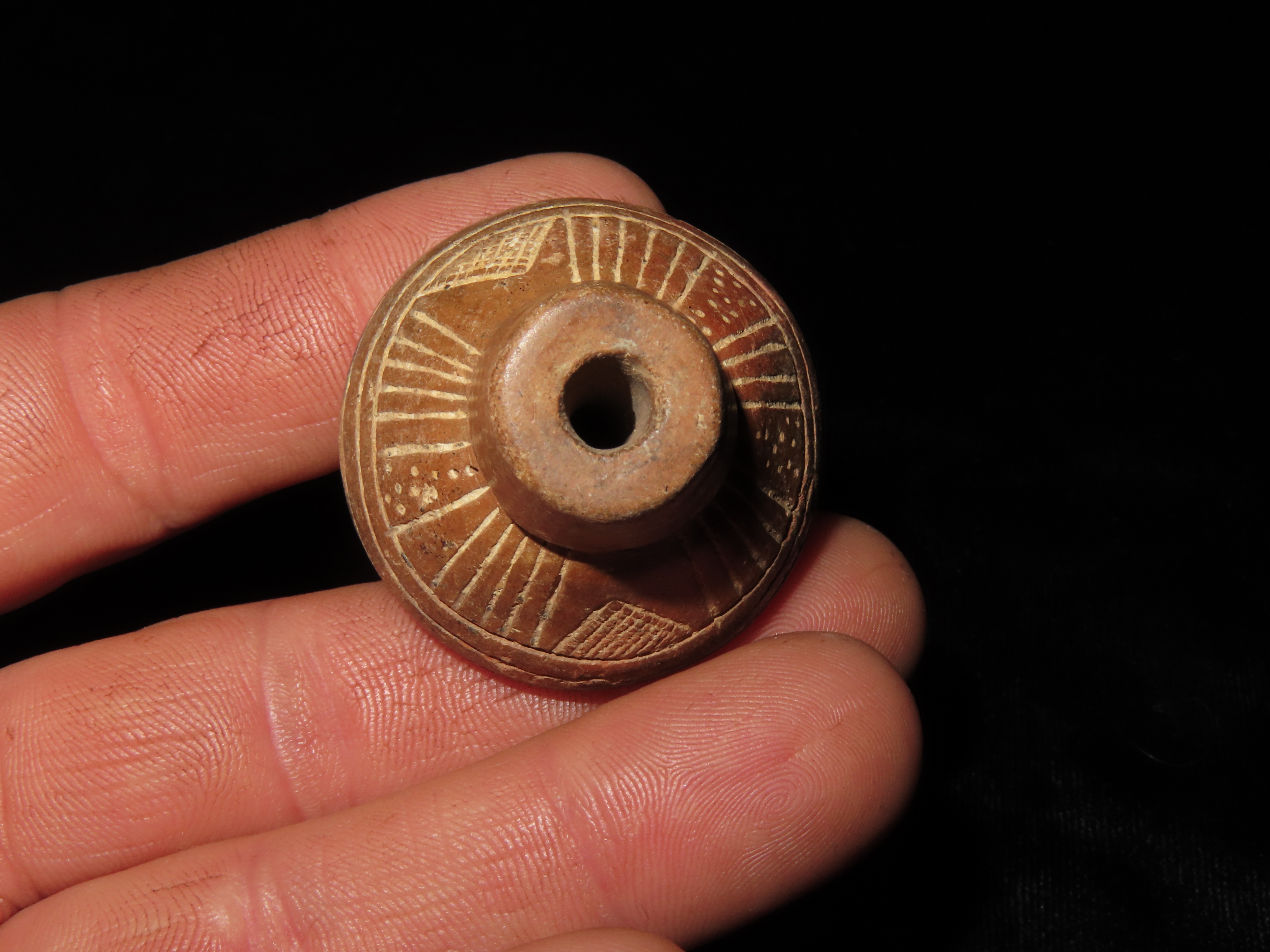 LARGE HEAVILY ENGRAVED SPINDLE WHORL BEAD, PRECOLUMBIAN POTTERY/CLAY FROM SOUTH AMERICA, CIRCA 800-1200 AD