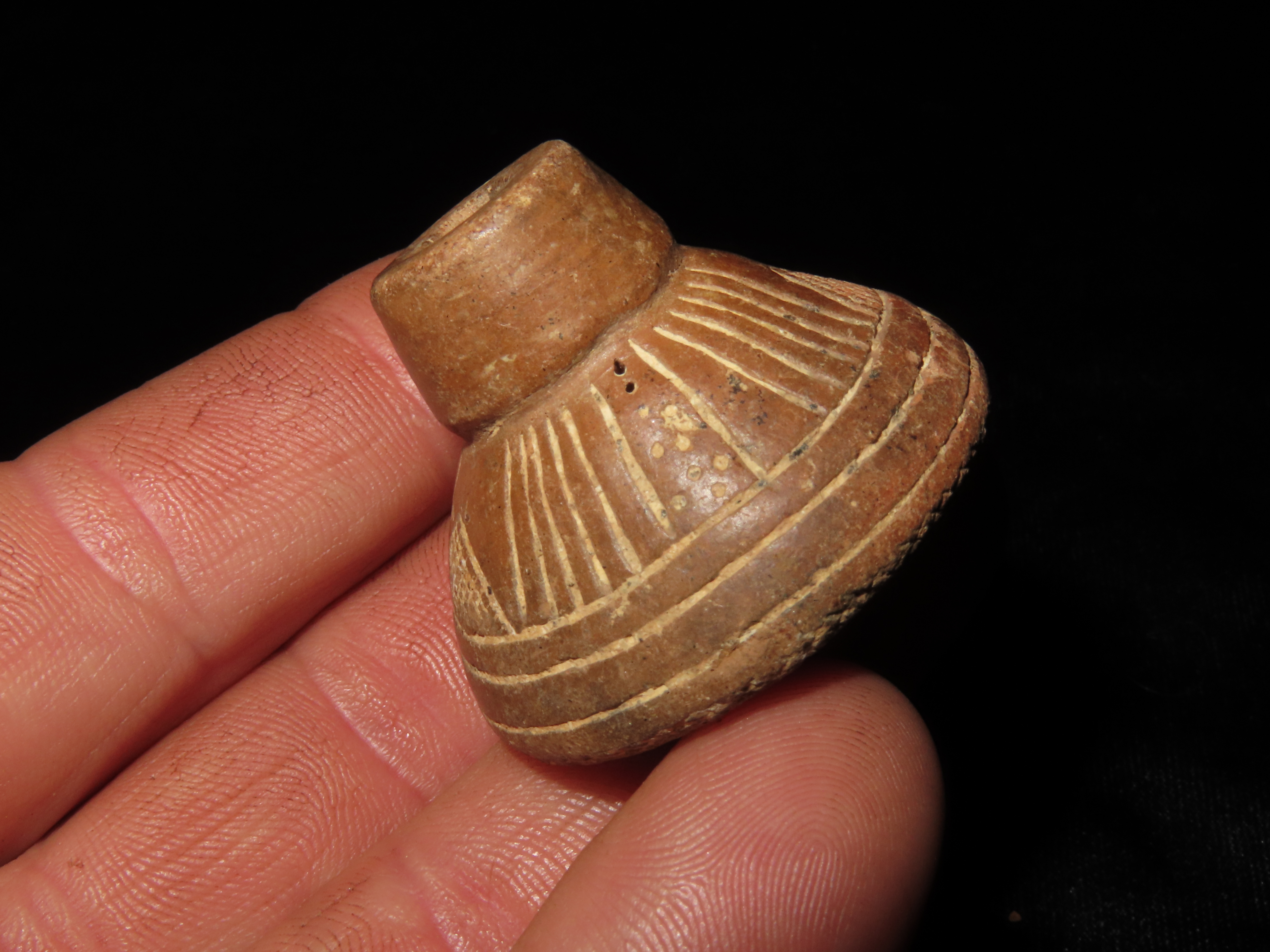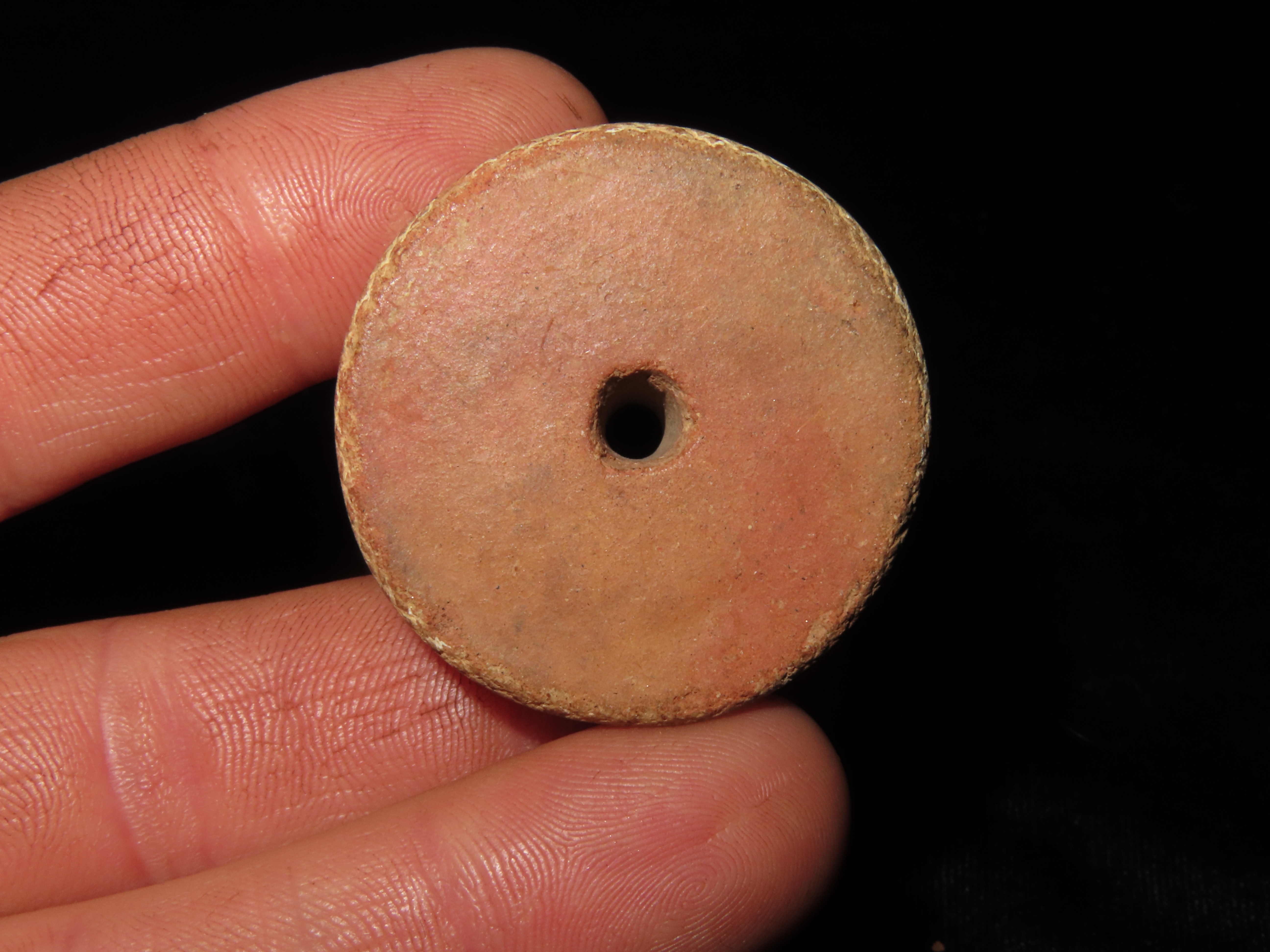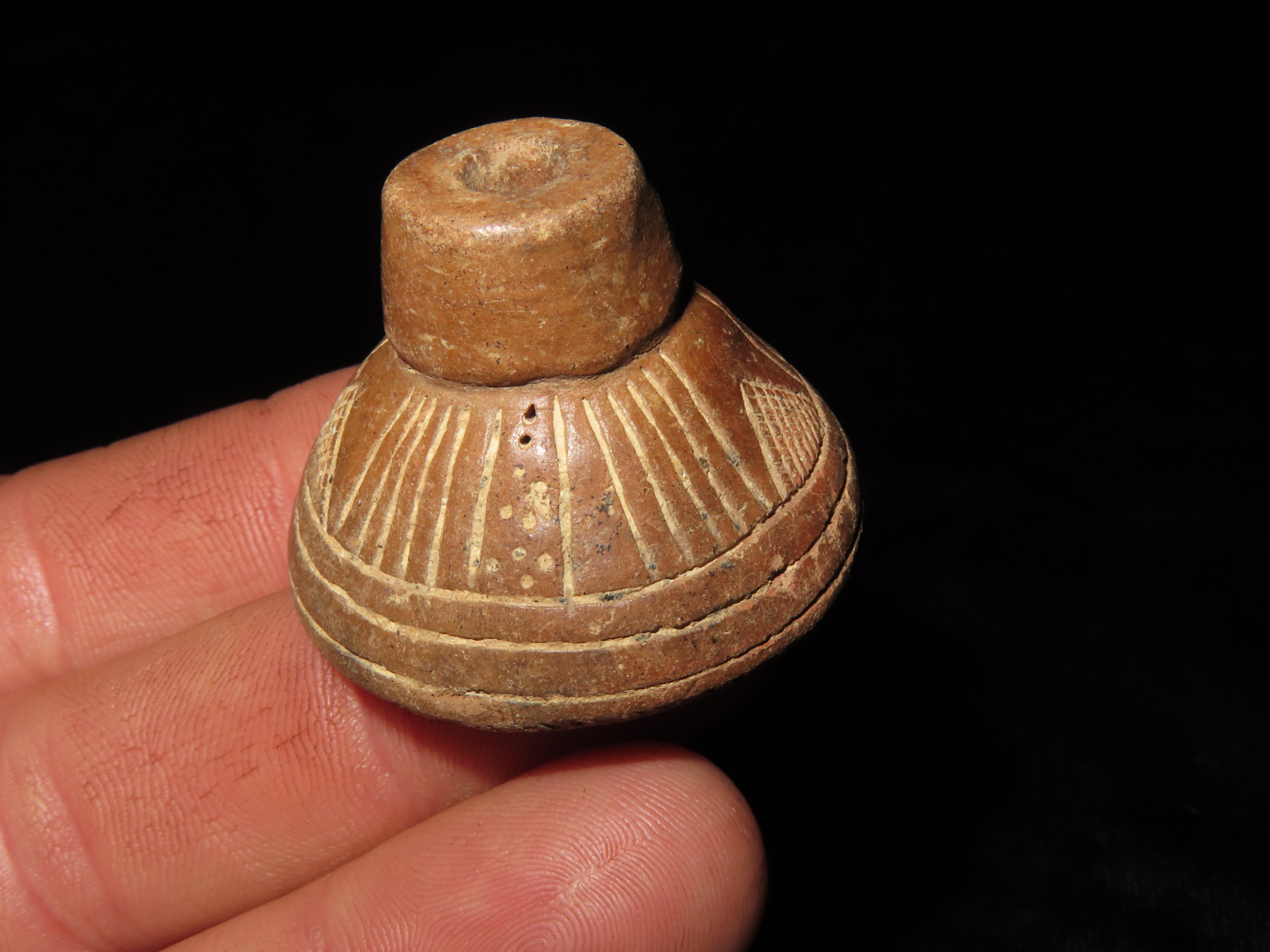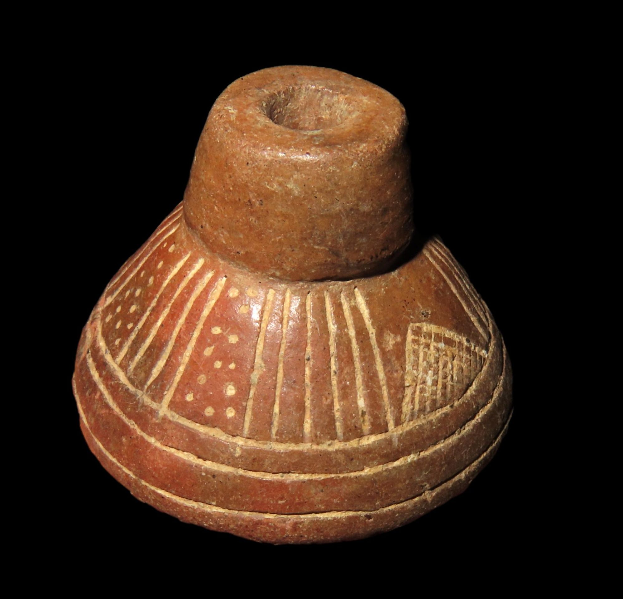 LARGE HEAVILY ENGRAVED SPINDLE WHORL BEAD, PRECOLUMBIAN POTTERY/CLAY FROM SOUTH AMERICA, CIRCA 800-1200 AD