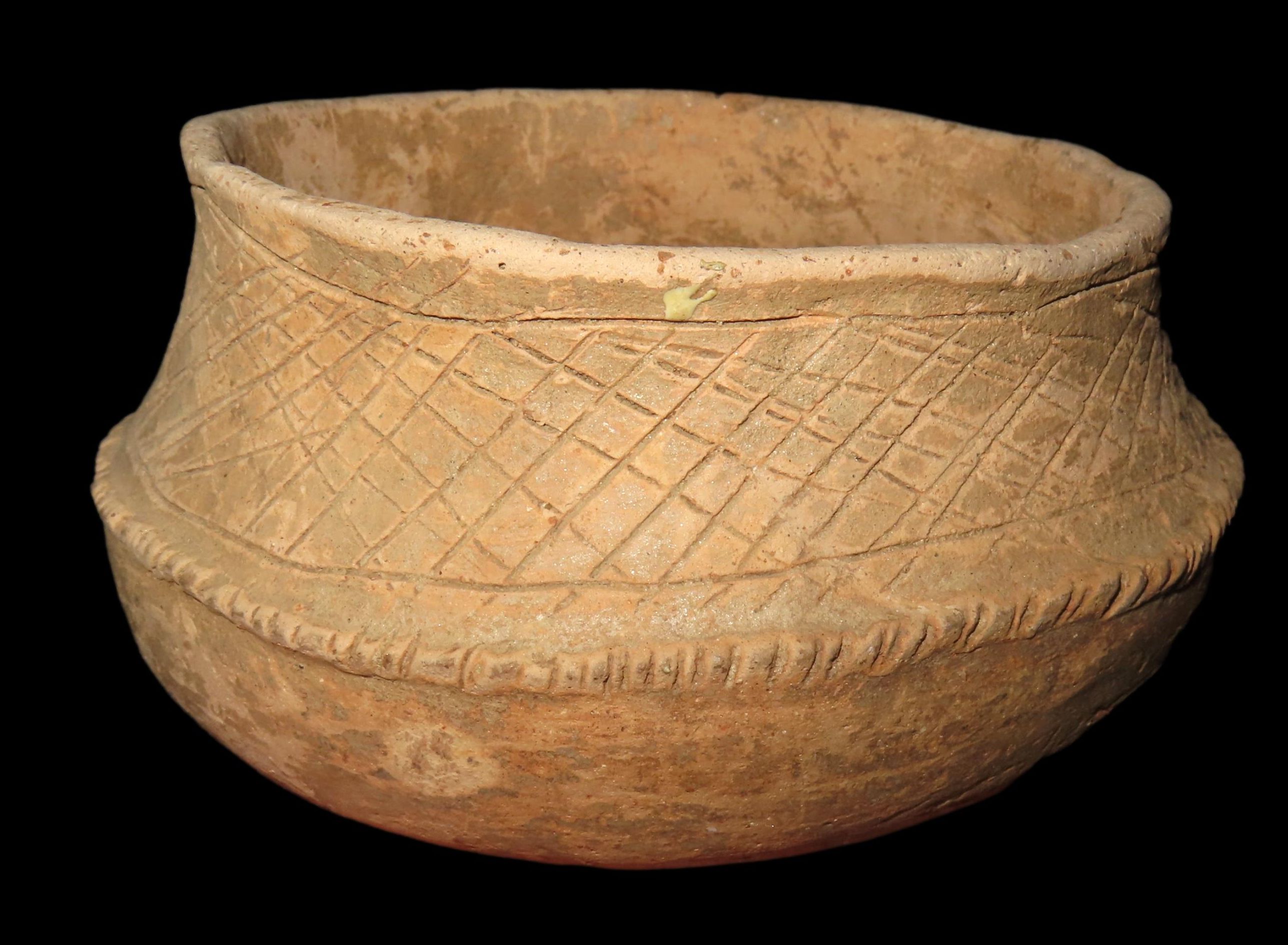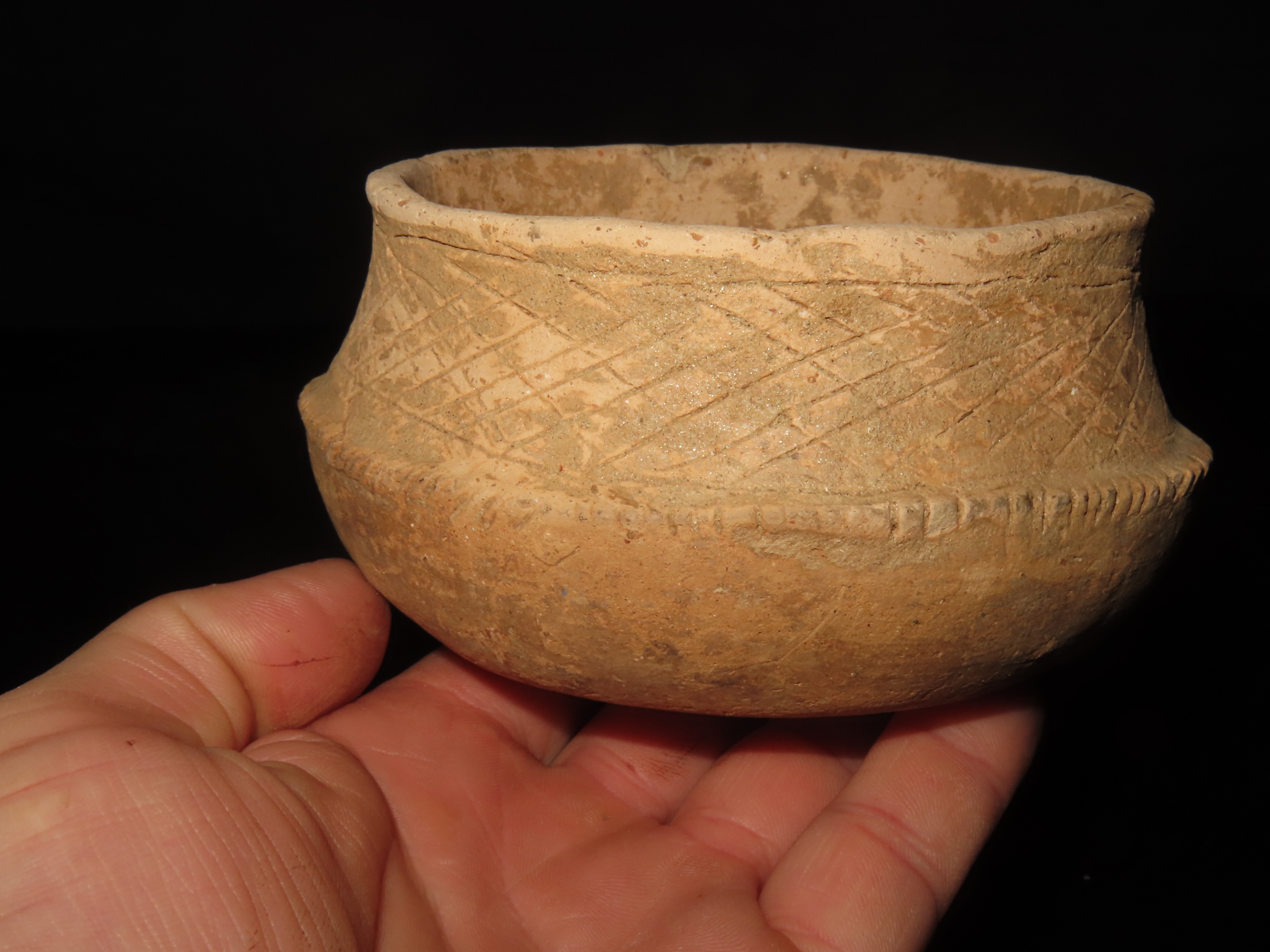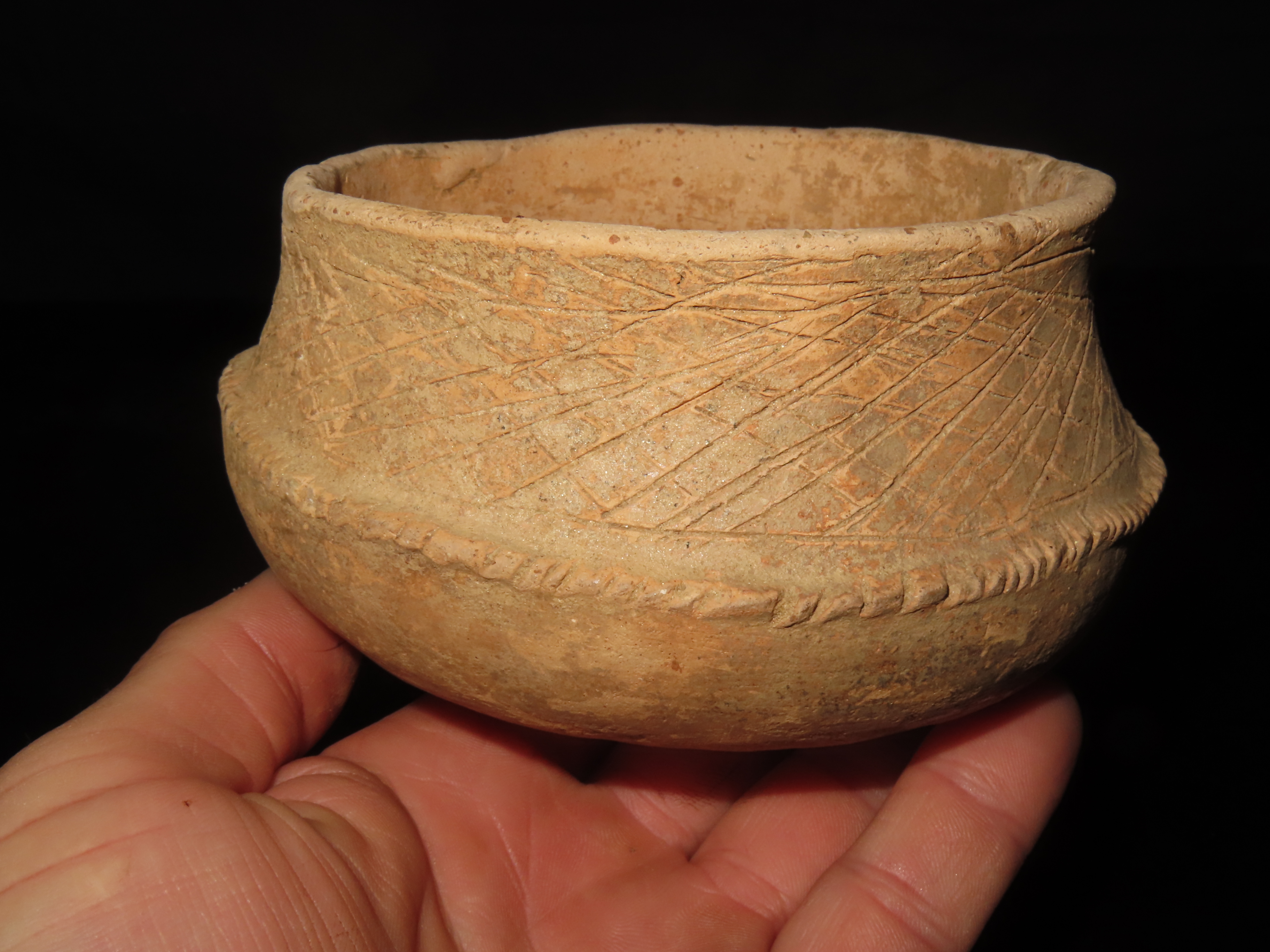 5 1/8″ MAYAN ENGRAVED POTTERY BOWL, SOUTH AMERICA, NICE SOLID EXAMPLE WITH NO DAMAGE OR REPAIRS
