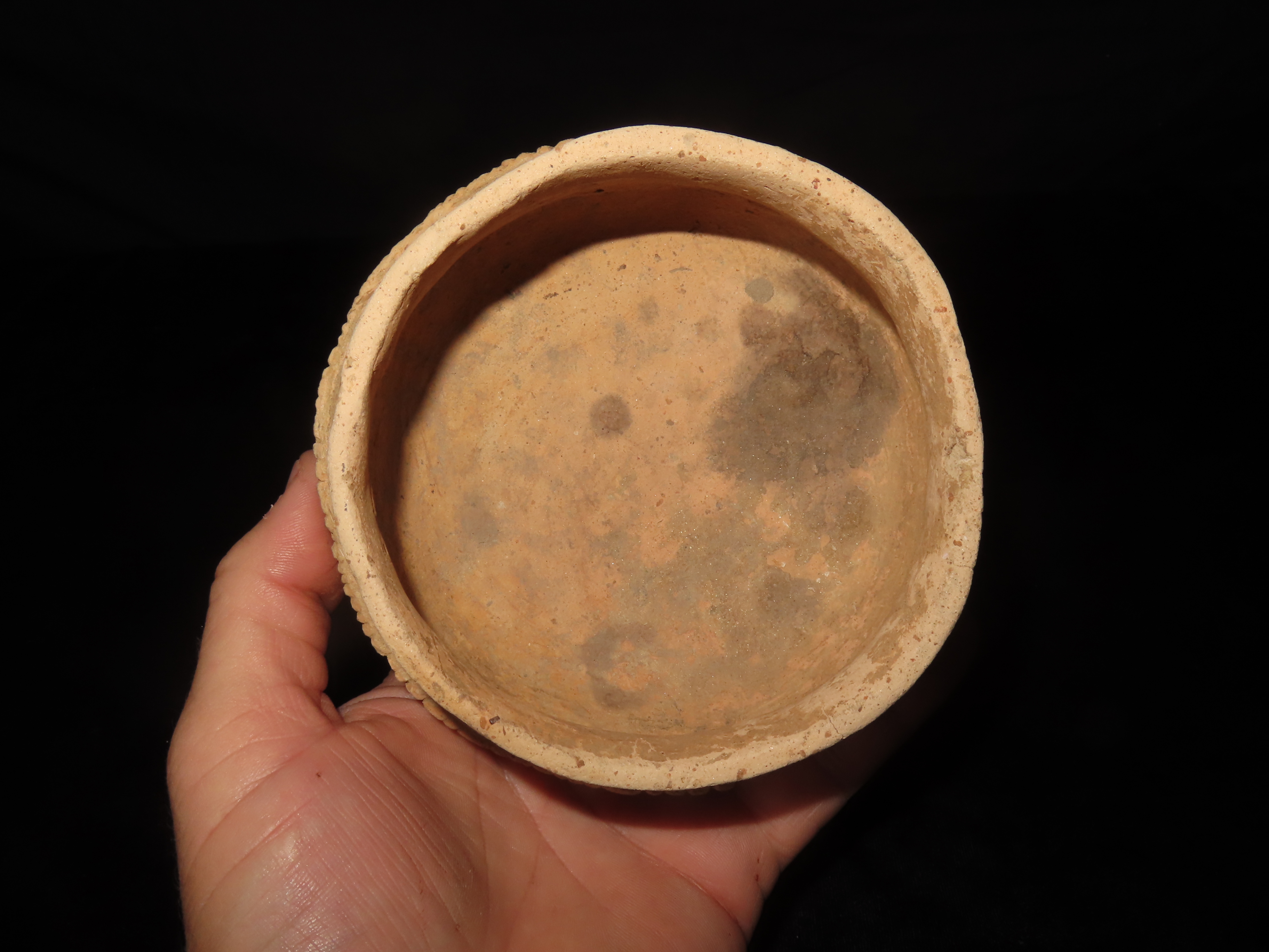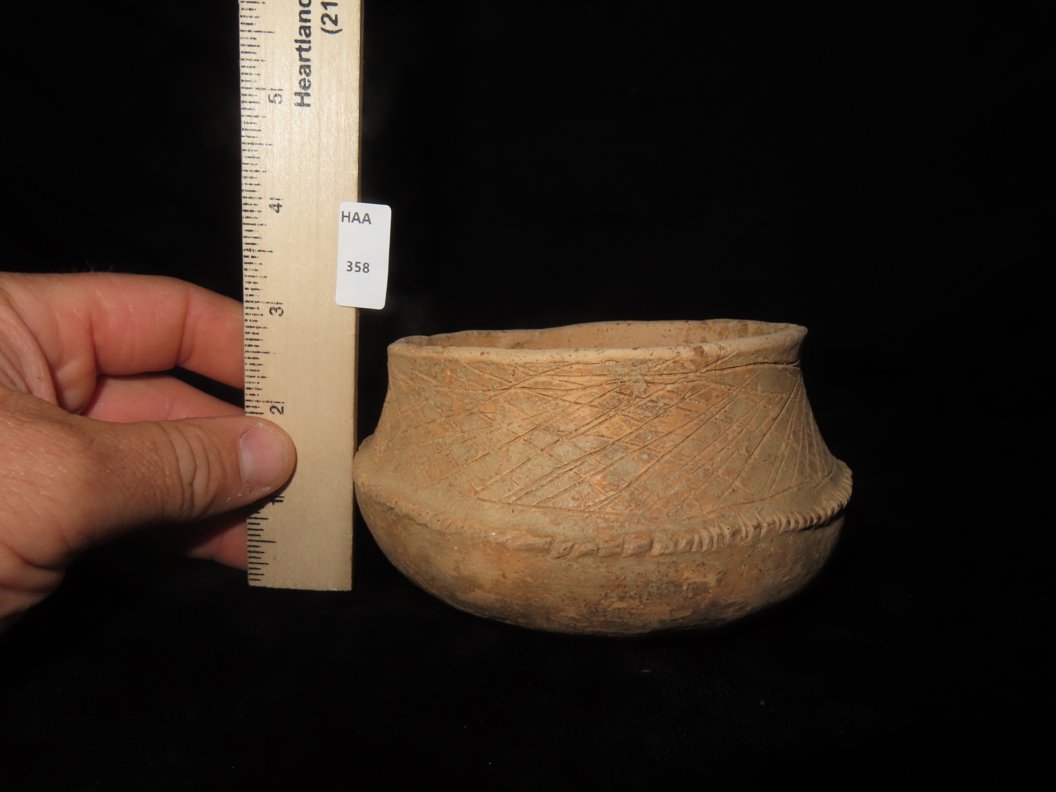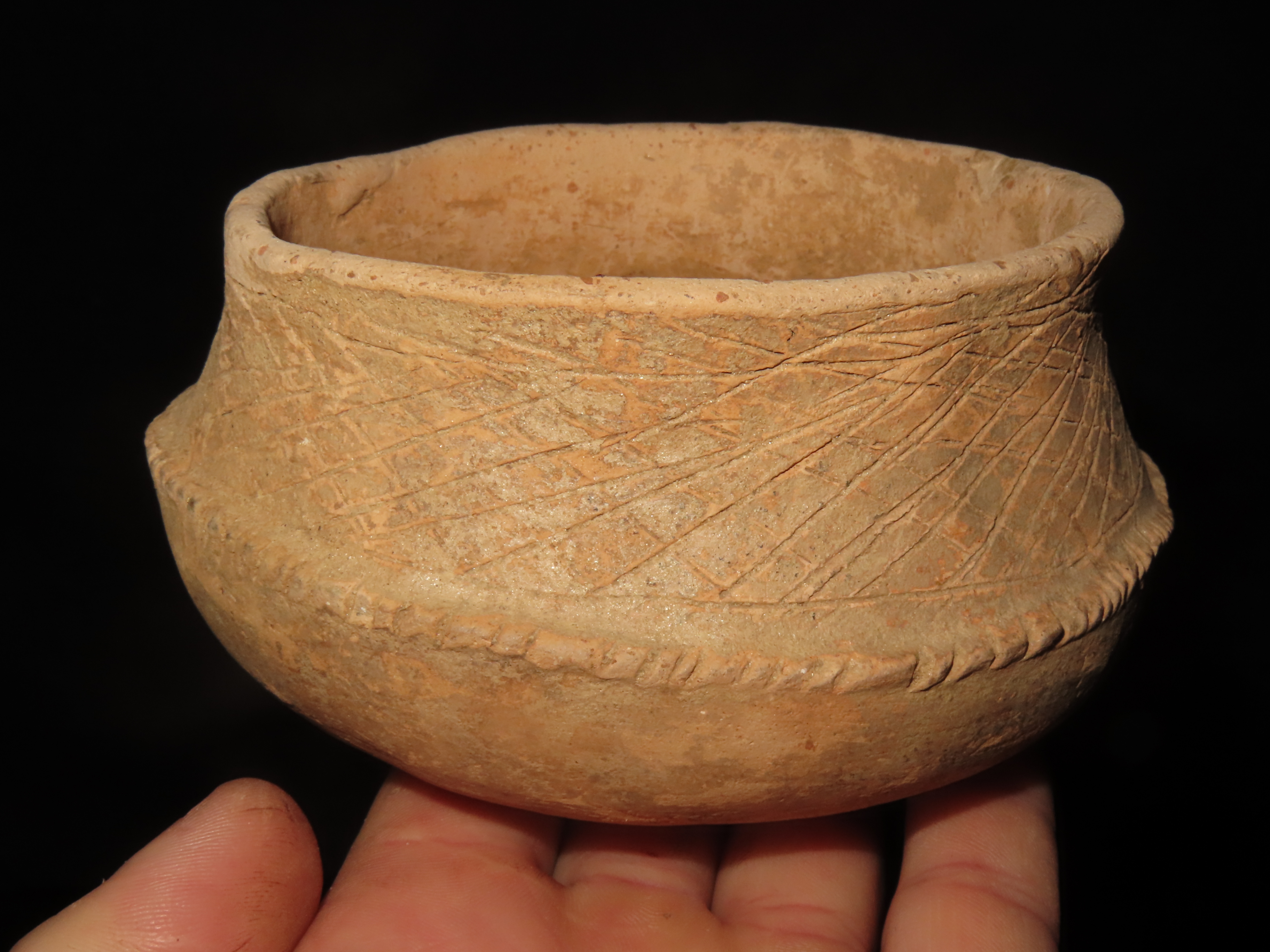 5 1/8″ MAYAN ENGRAVED POTTERY BOWL, SOUTH AMERICA, NICE SOLID EXAMPLE WITH NO DAMAGE OR REPAIRS