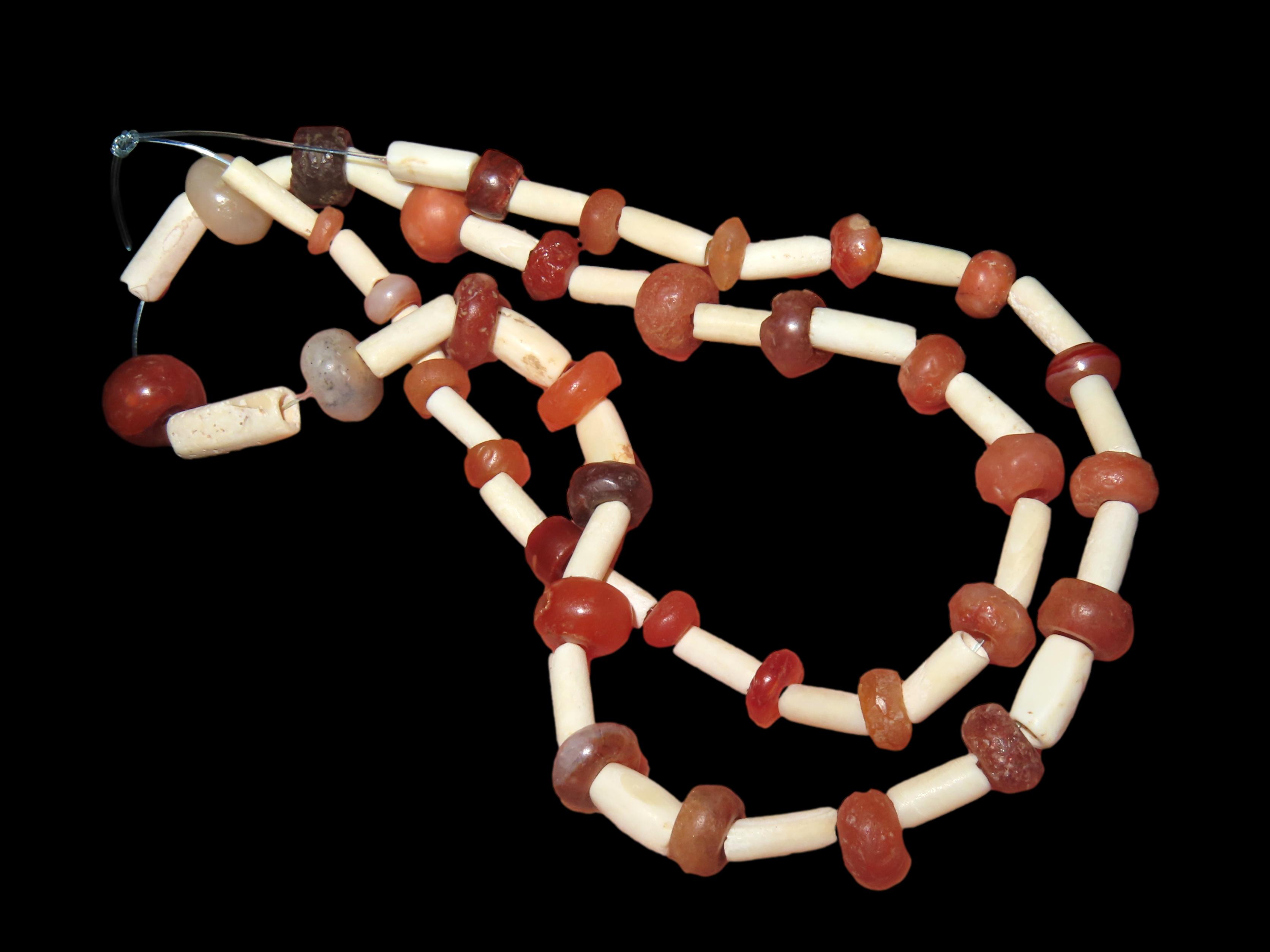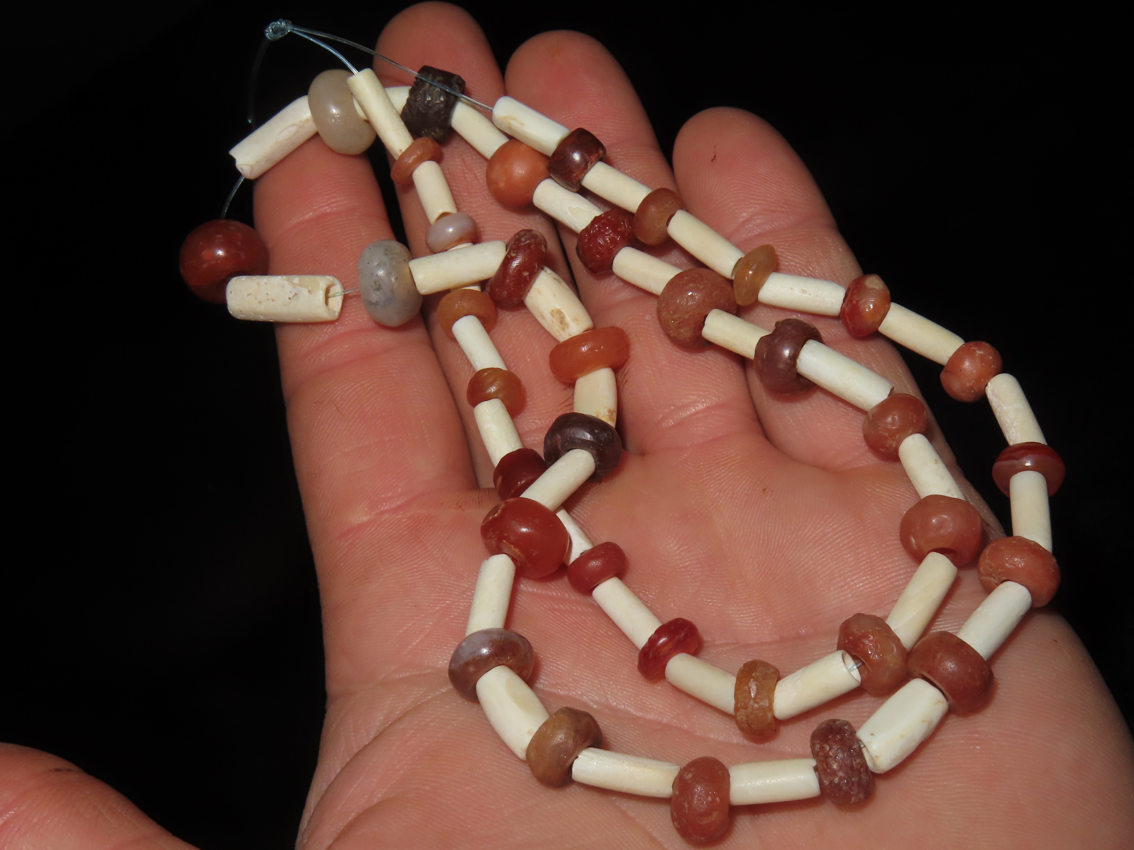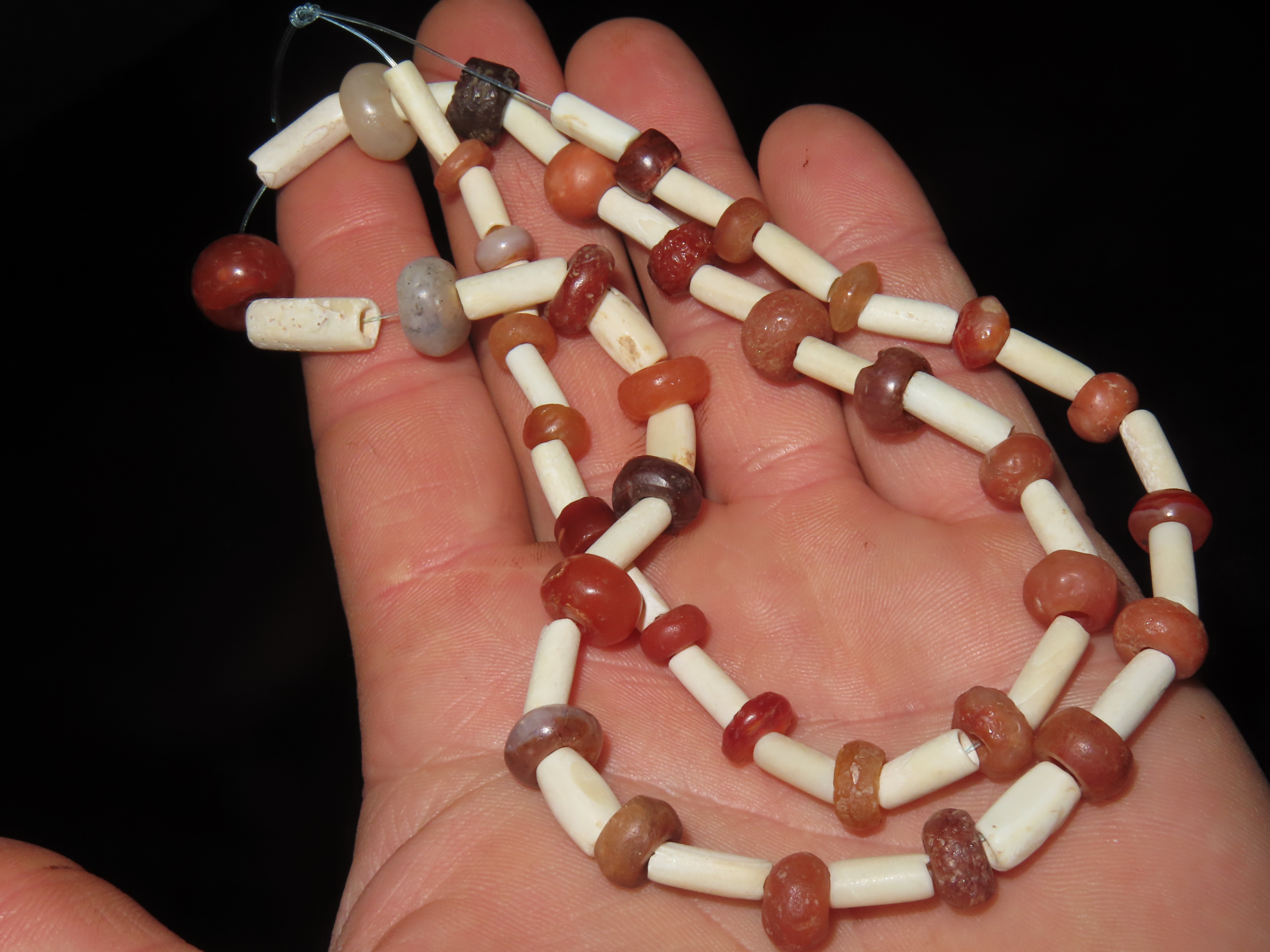 AMAZING 24" QUARTZ & SHELL BEAD NECKLACE FROM MEXICO, PRE-COLUMBIAN, INCREDIBLE HIGHLY POLISHED RED & WHITE QUARTZ BEADS WITH NICE LONG SHELL TUBE BEAD SPACERS