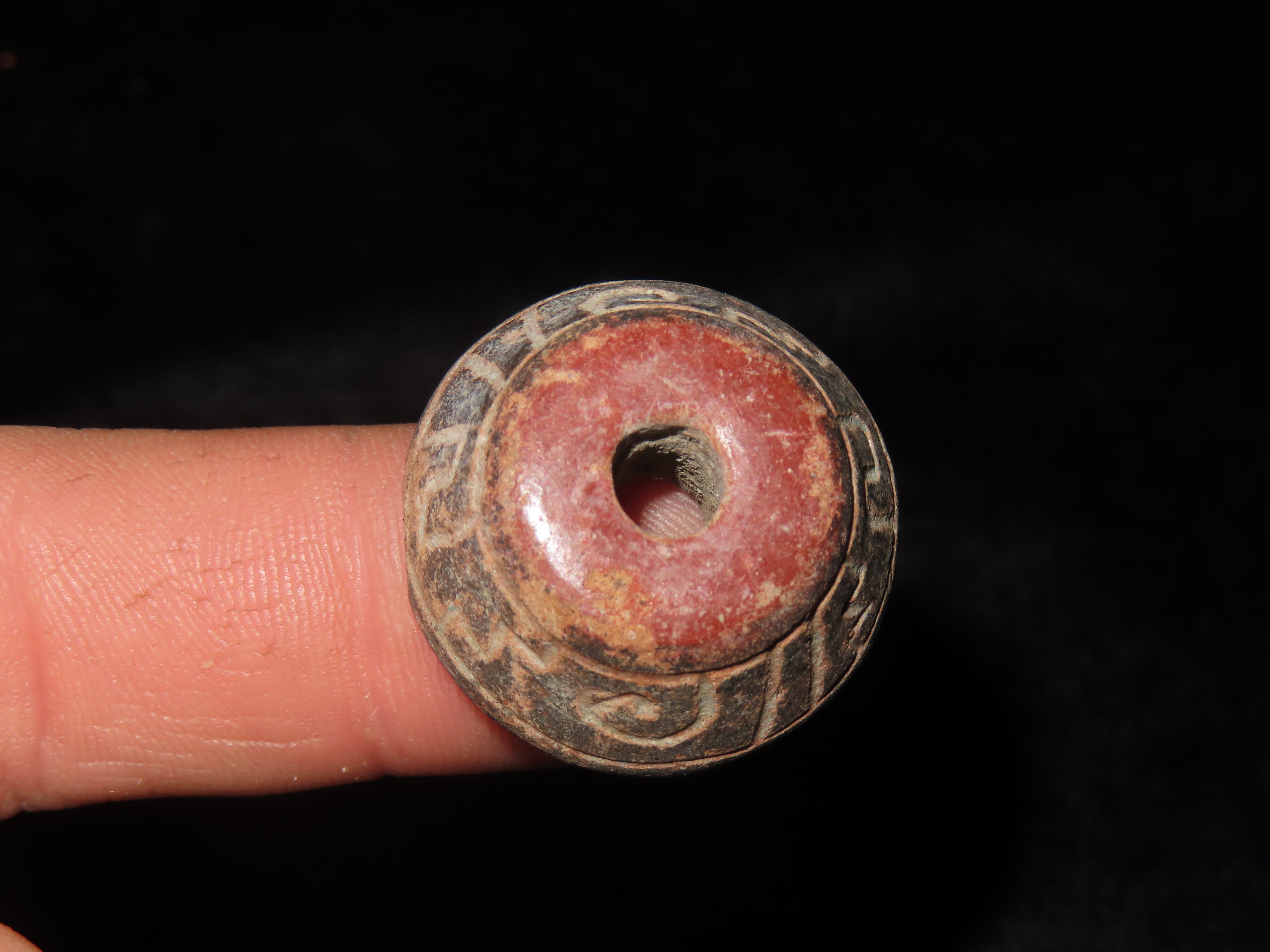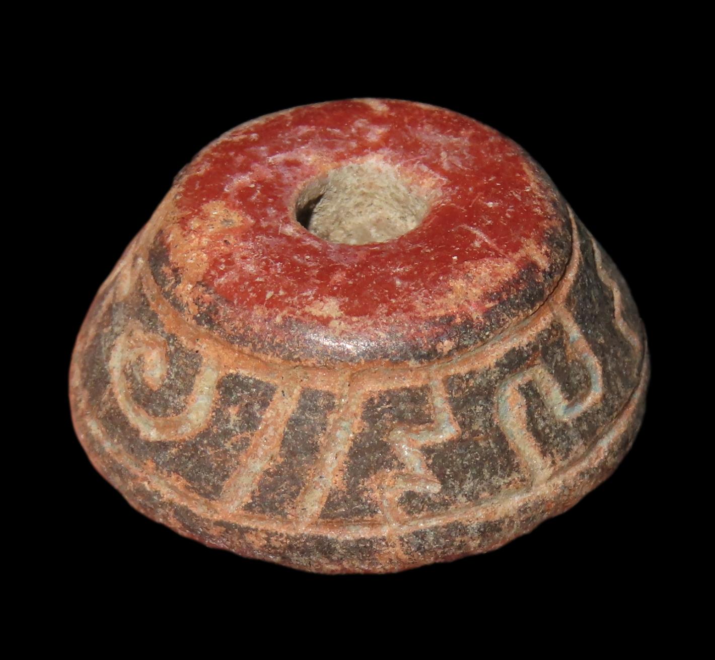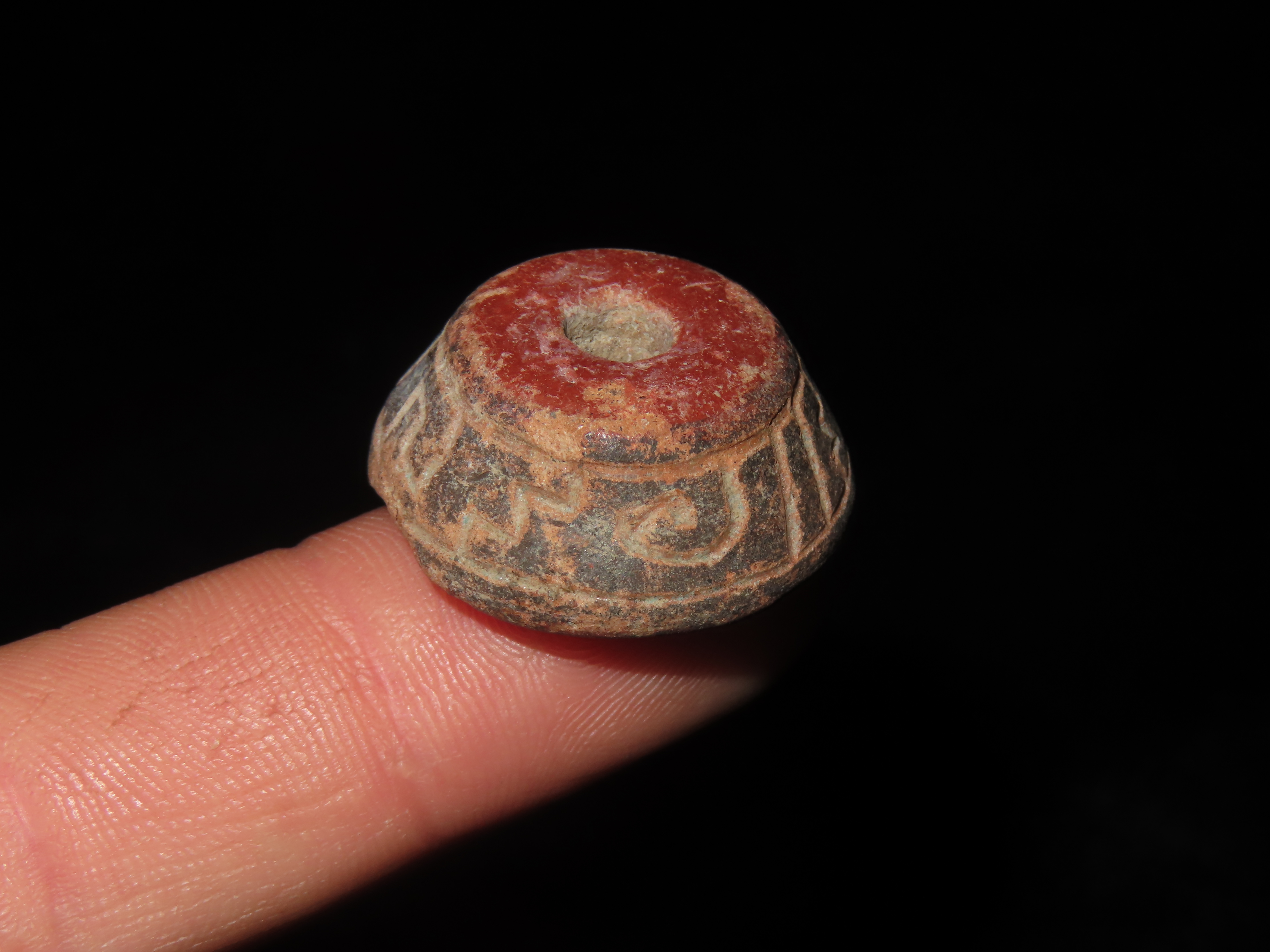 NICE ENGRAVED & PAINTED SPINDLE WHORL POTTERY BEAD FROM MEXICO, NICE GEOMETRIC ENCISED DESIGN, TOP & BOTTOM ARE PAINTED RED, ALL ANCIENT & ORIGINAL