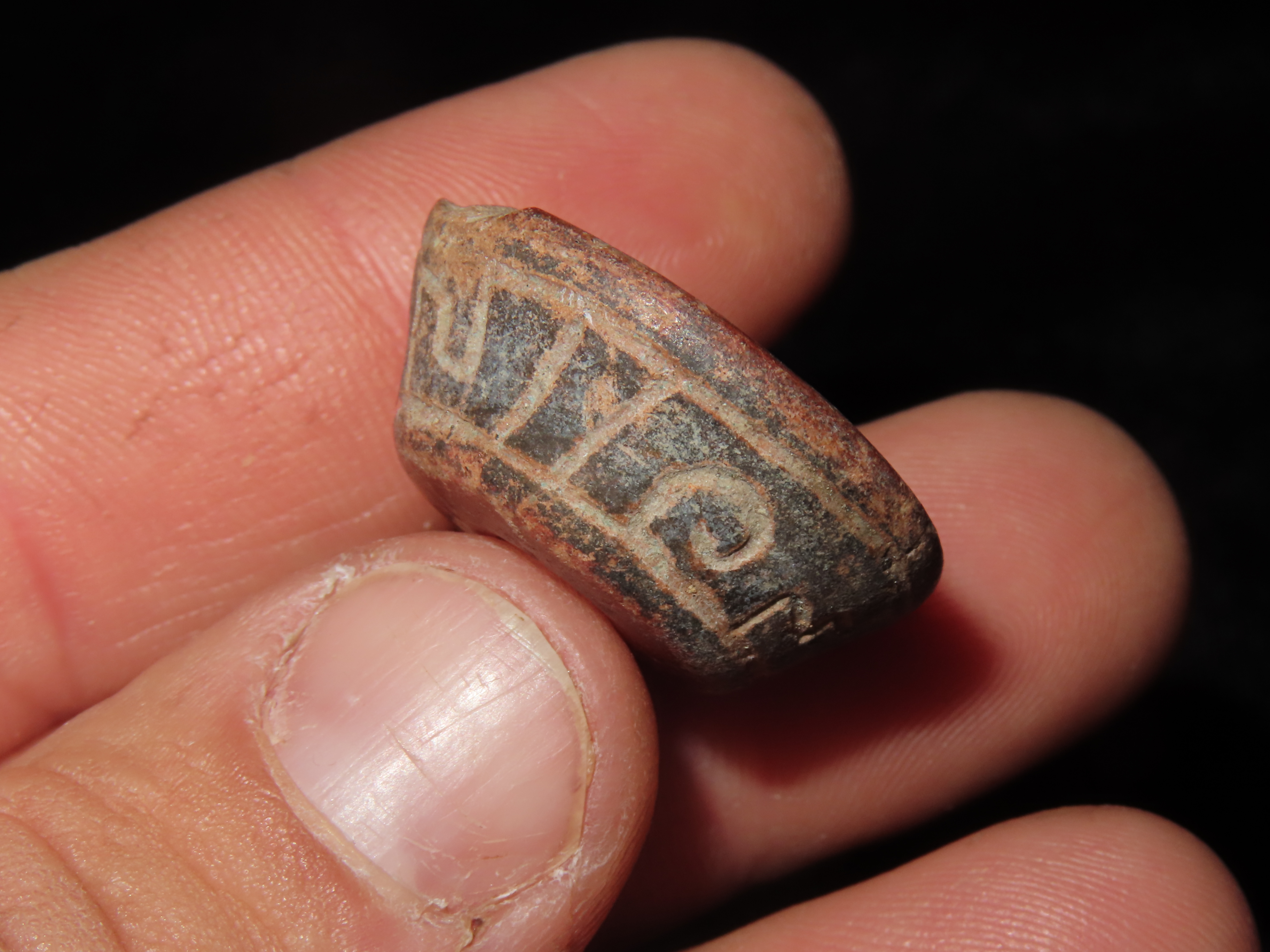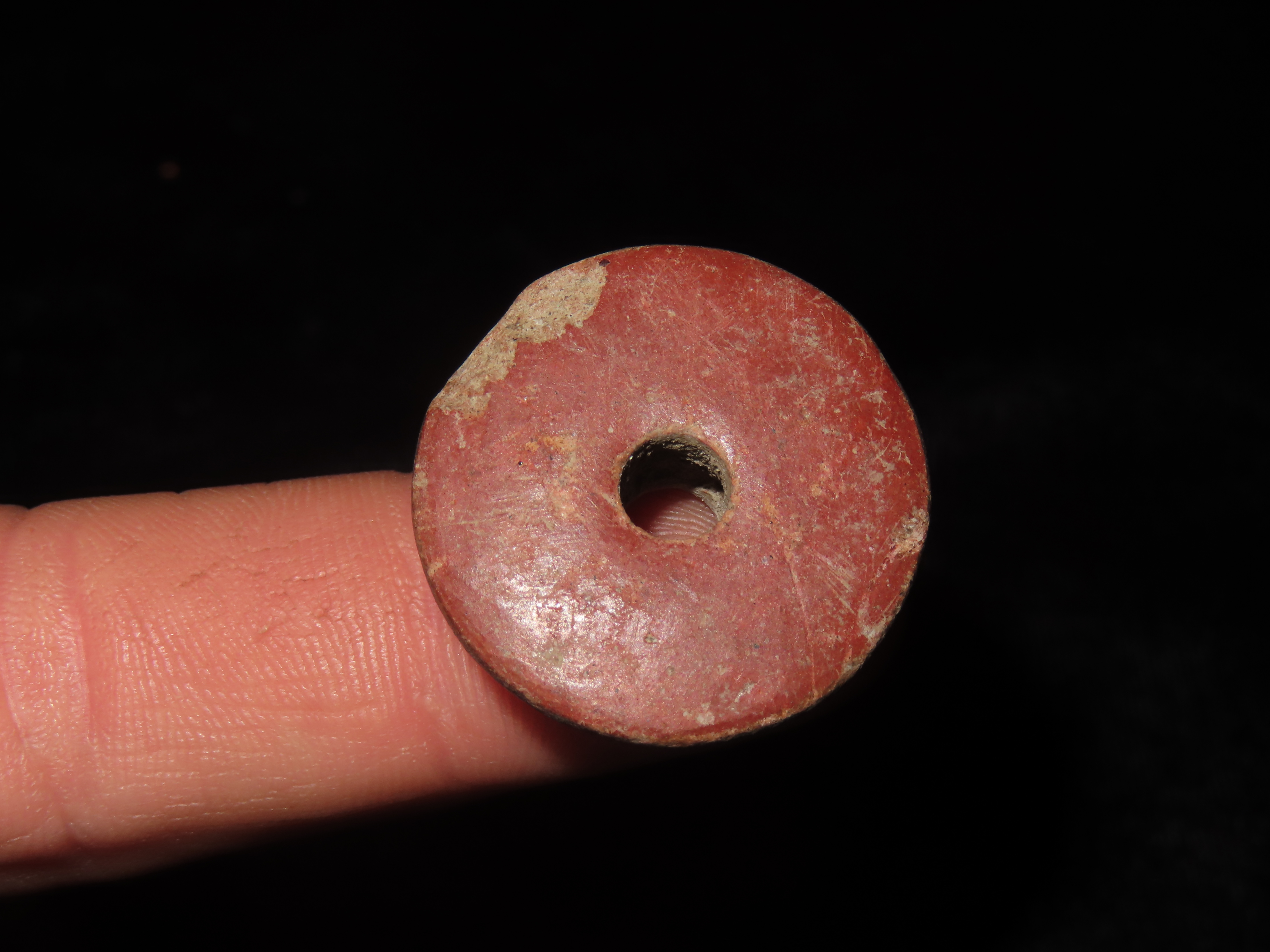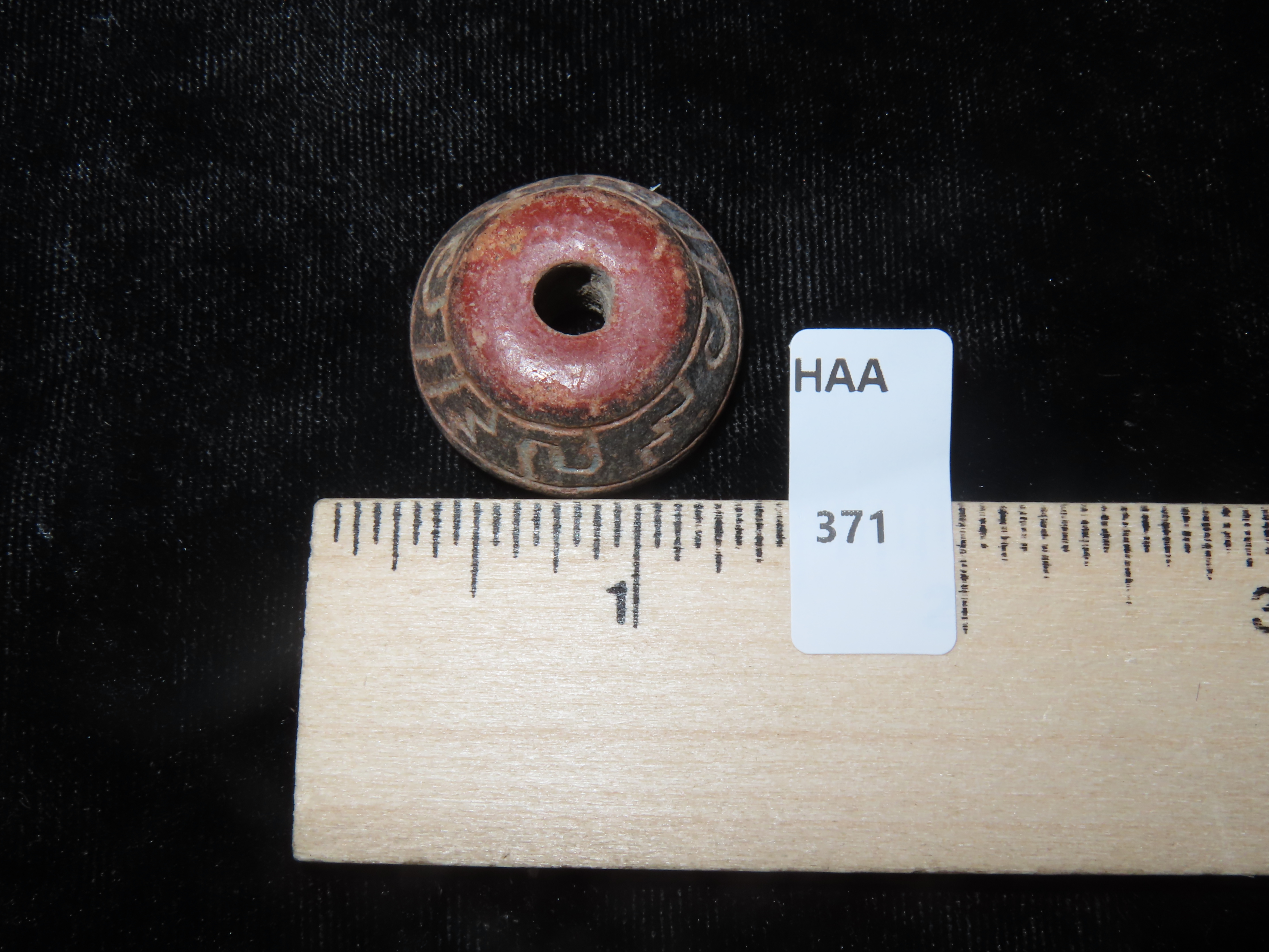 NICE ENGRAVED & PAINTED SPINDLE WHORL POTTERY BEAD FROM MEXICO, NICE GEOMETRIC ENCISED DESIGN, TOP & BOTTOM ARE PAINTED RED, ALL ANCIENT & ORIGINAL