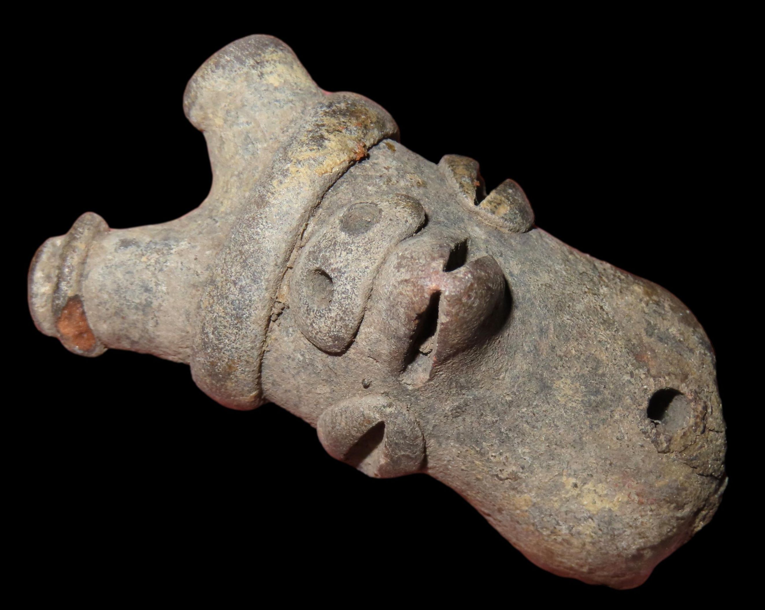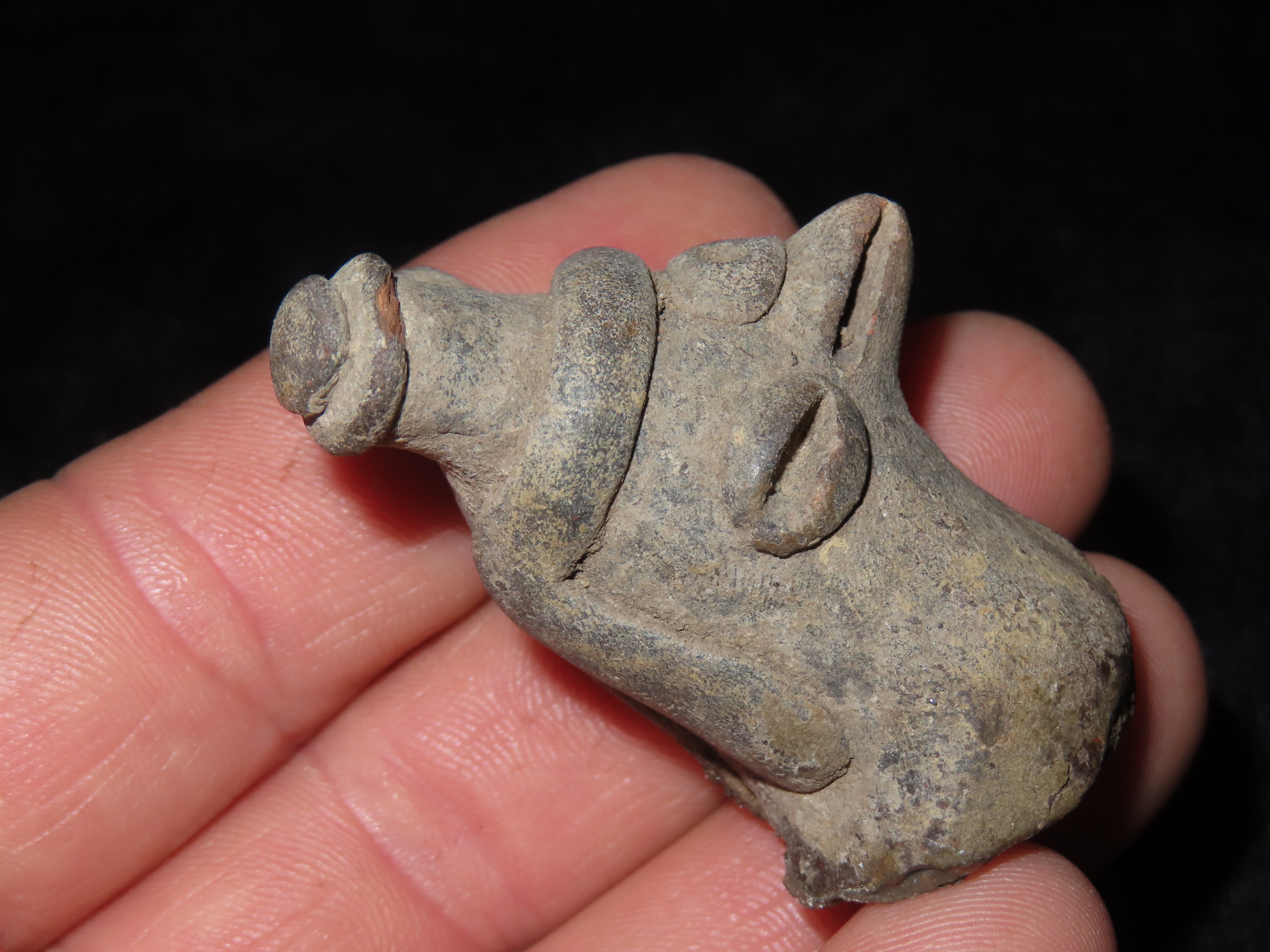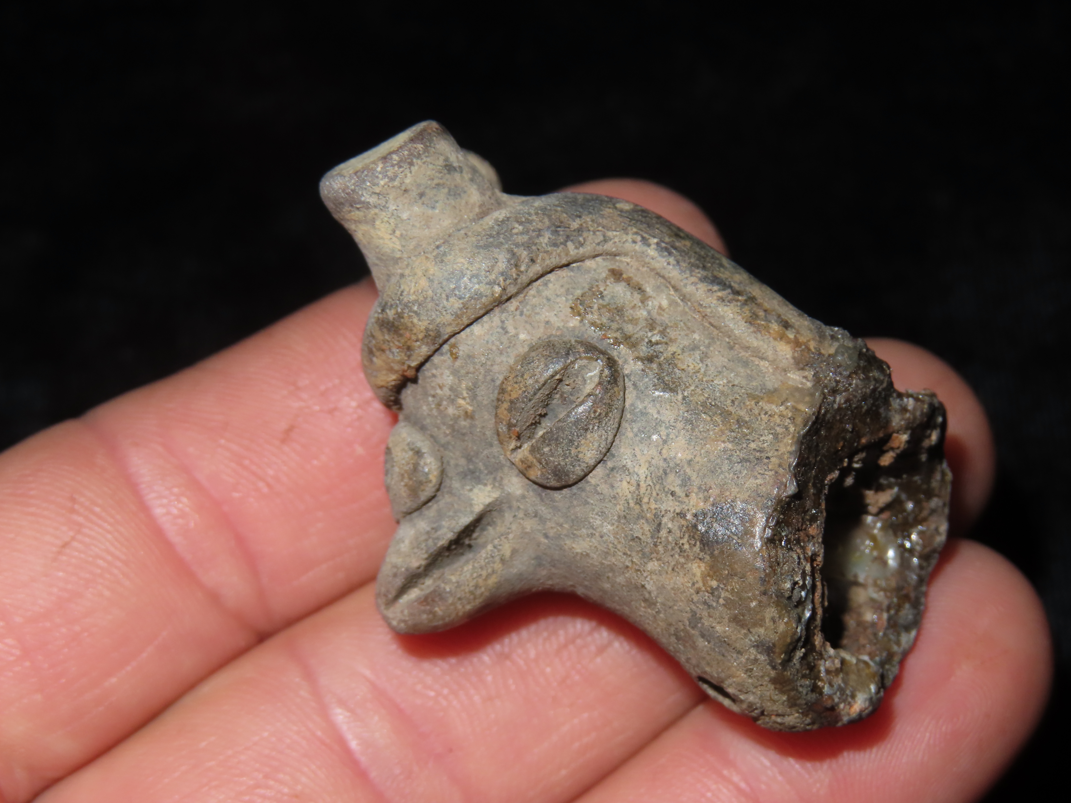INTERESTING ANIMAL / BIRD EFFIGY POTTERY HEAD OFF A LARGER FIGURE, HAS A VERY ELABORATE HEADDRESS ON, WOULD HAVE LIKED TO HAVE SEEN THE REST OF THIS ONE!