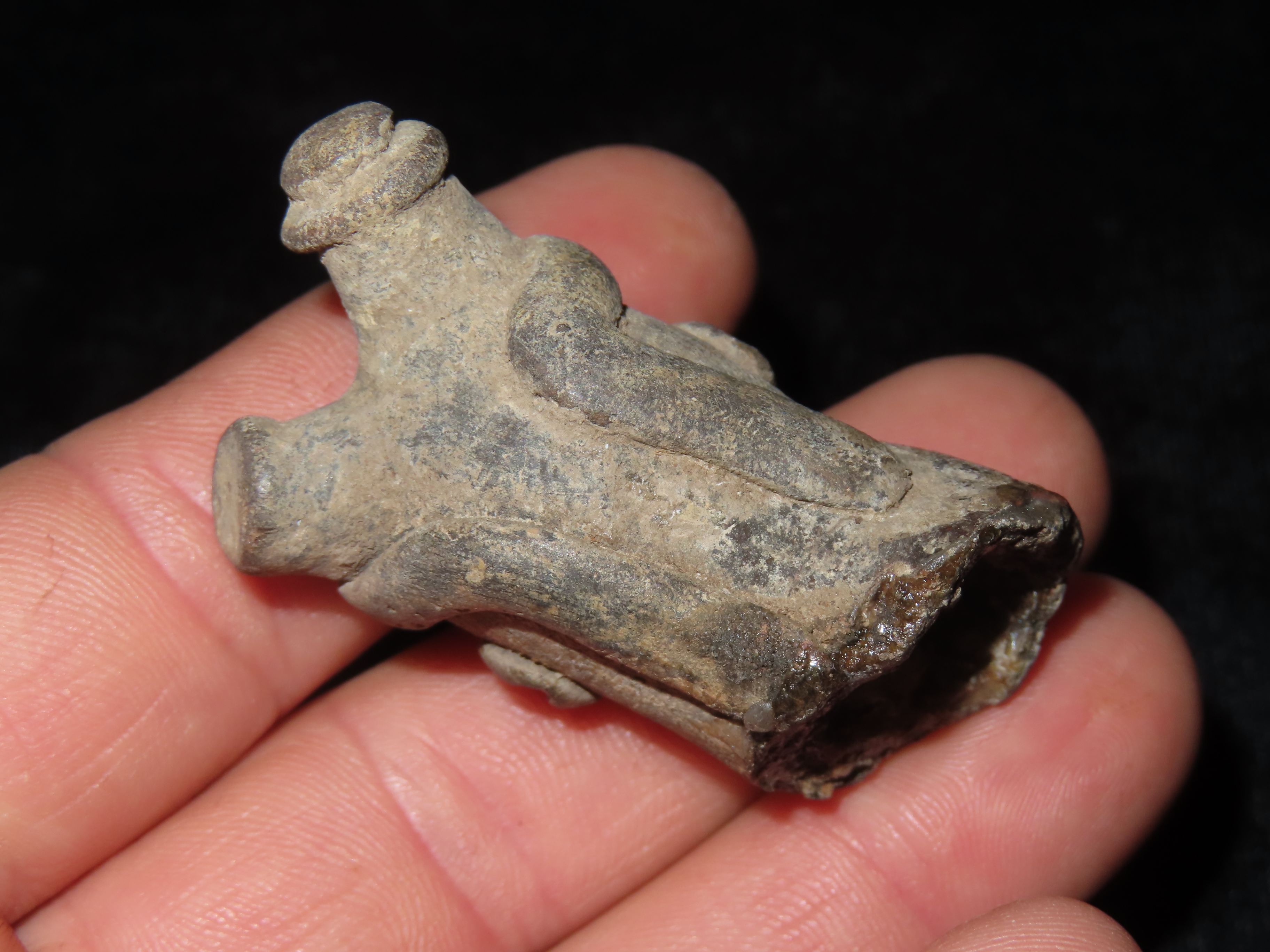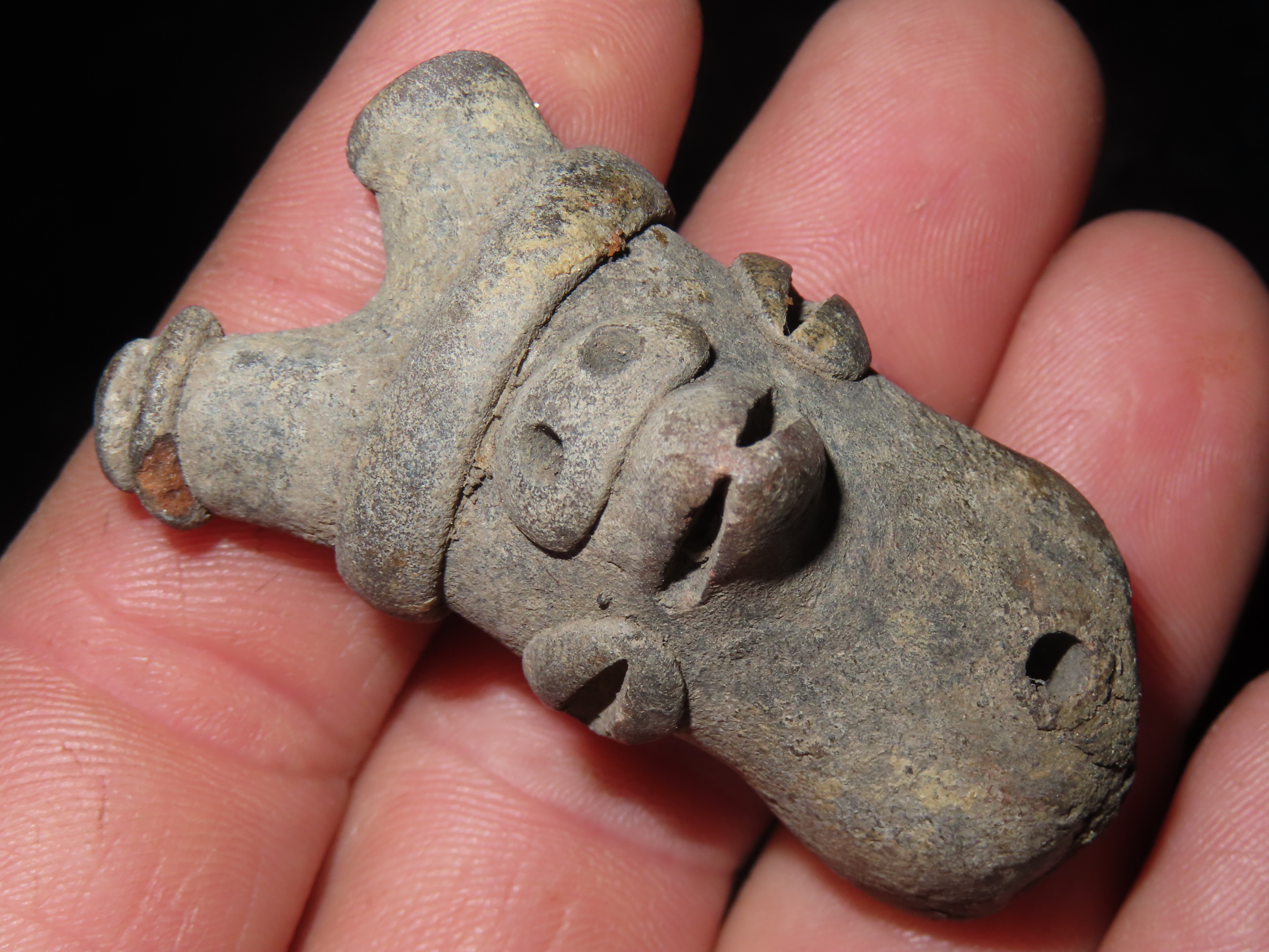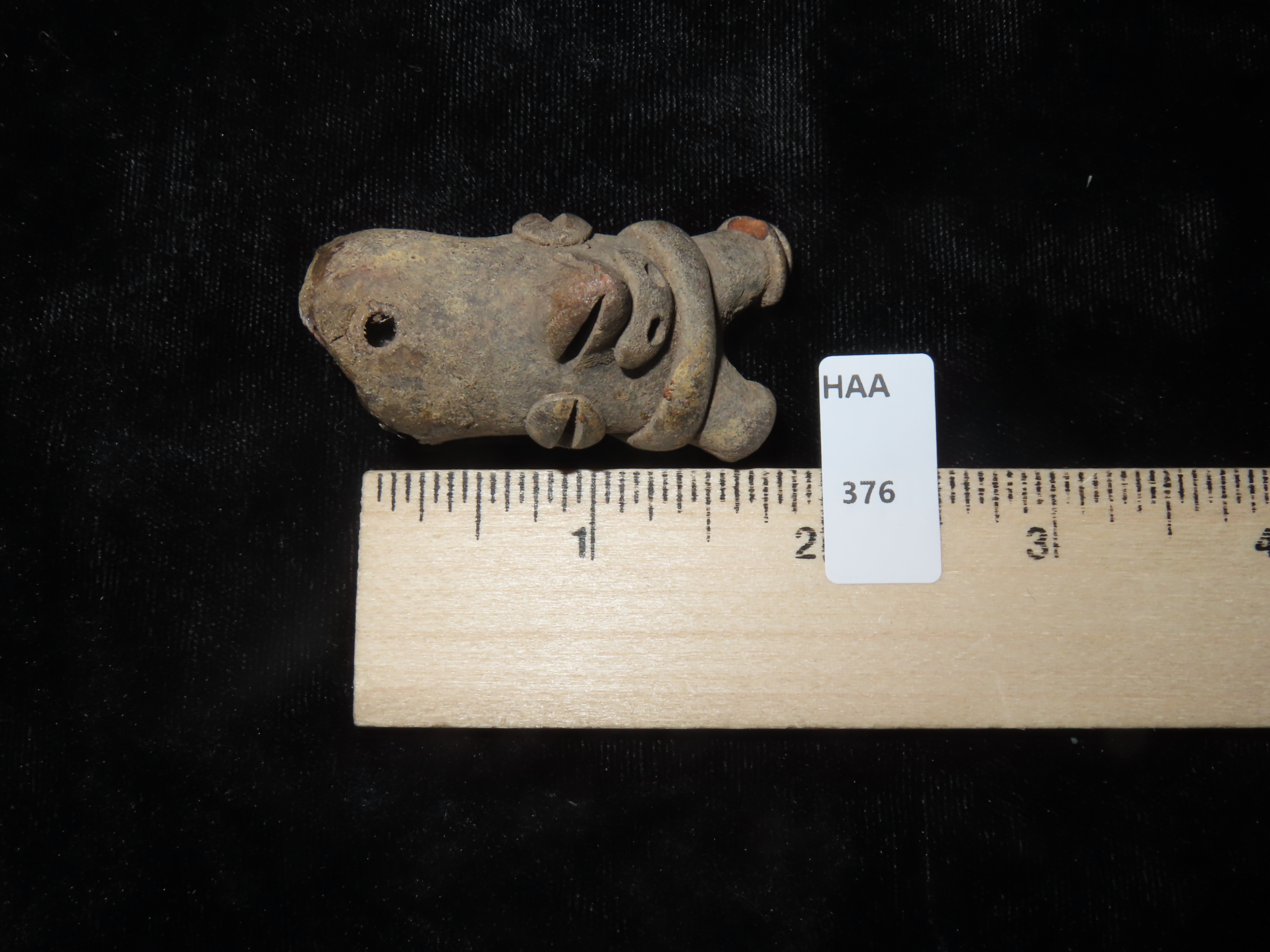 INTERESTING ANIMAL / BIRD EFFIGY POTTERY HEAD OFF A LARGER FIGURE, HAS A VERY ELABORATE HEADDRESS ON, WOULD HAVE LIKED TO HAVE SEEN THE REST OF THIS ONE!