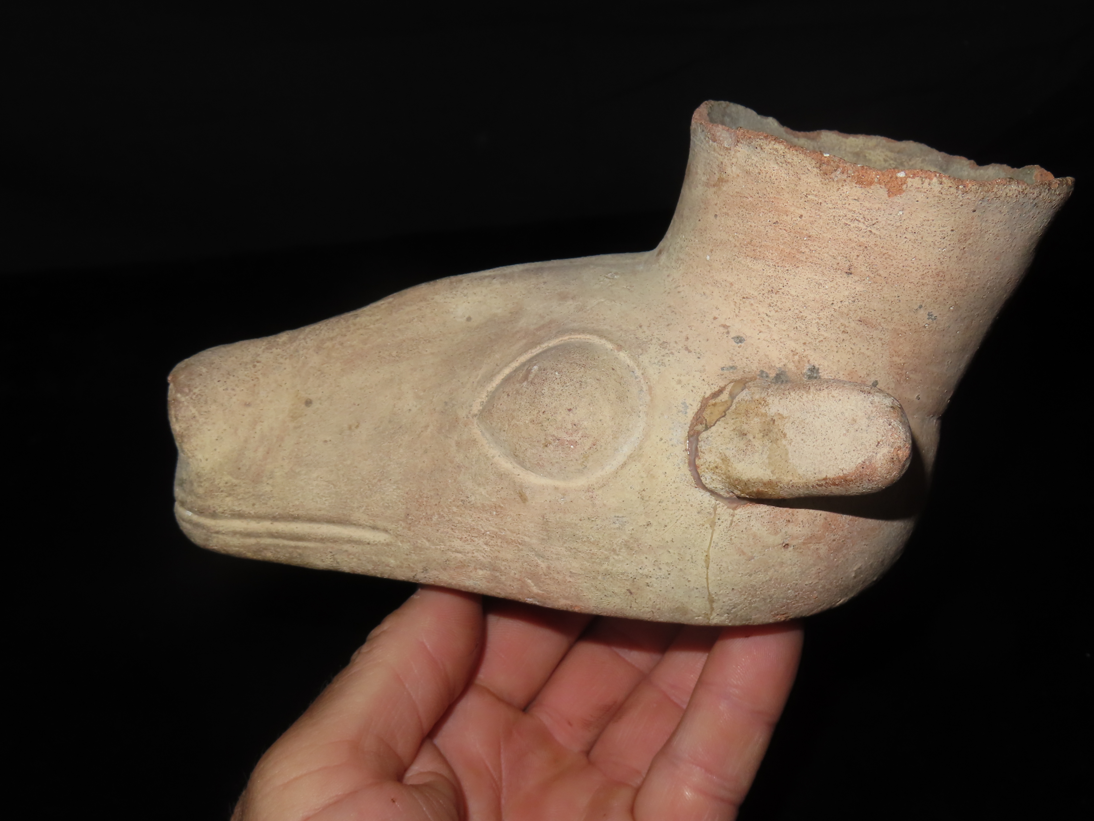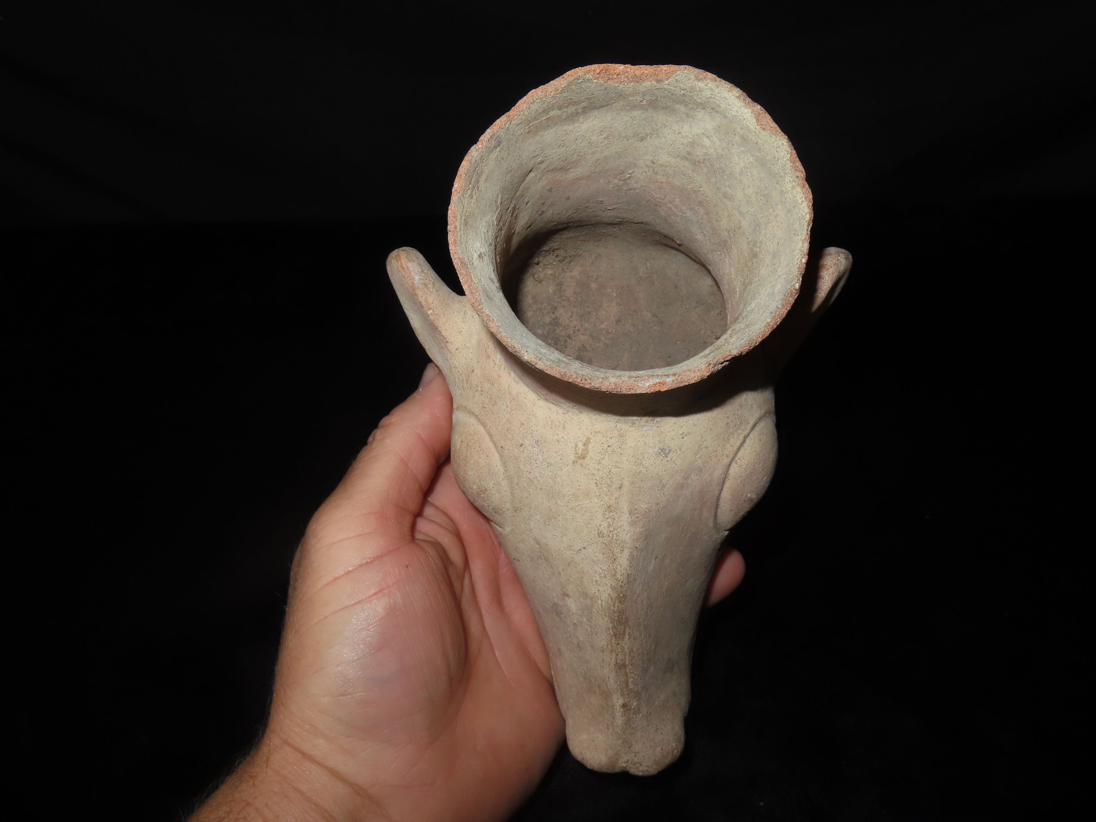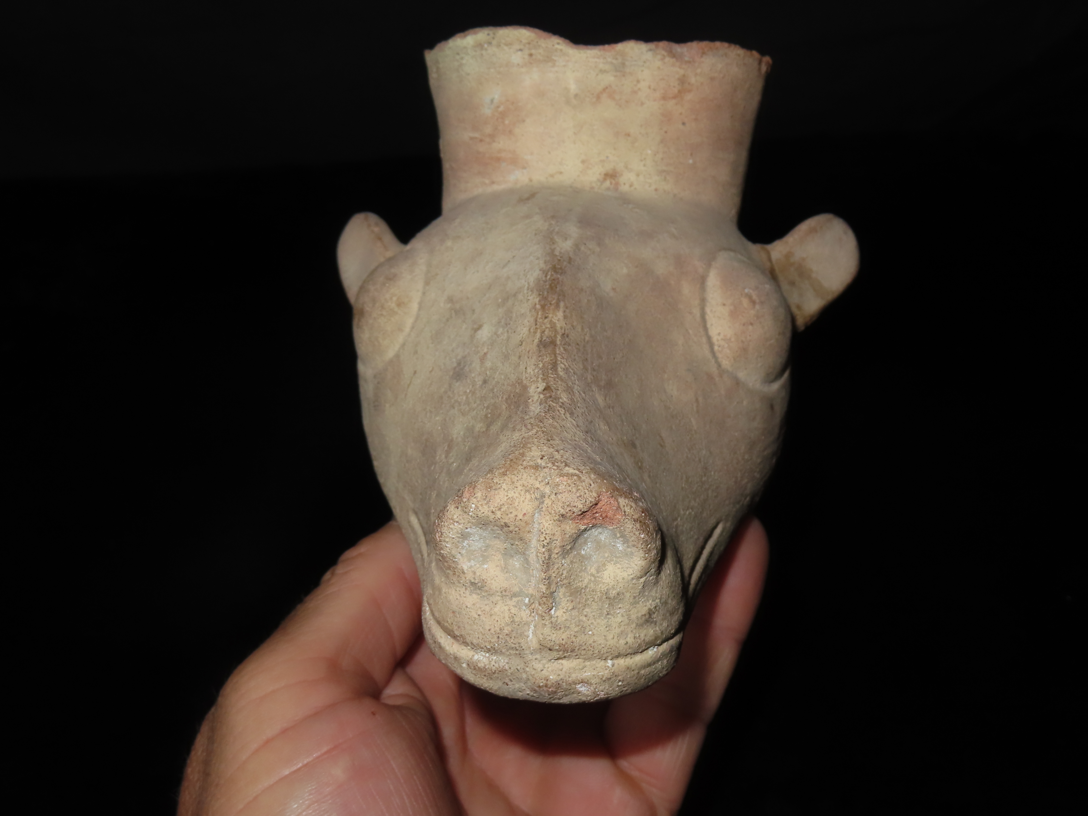 INCREDIBLE 7 1/2″ LLAMA / DEER EFFIGY POT FROM PERU, VERY DETAILED EXAMPLE, PRE-COLUMBIAN POTTERY BOWL, JAR, VESSEL, ONE EAR IS GLUED BACK ON