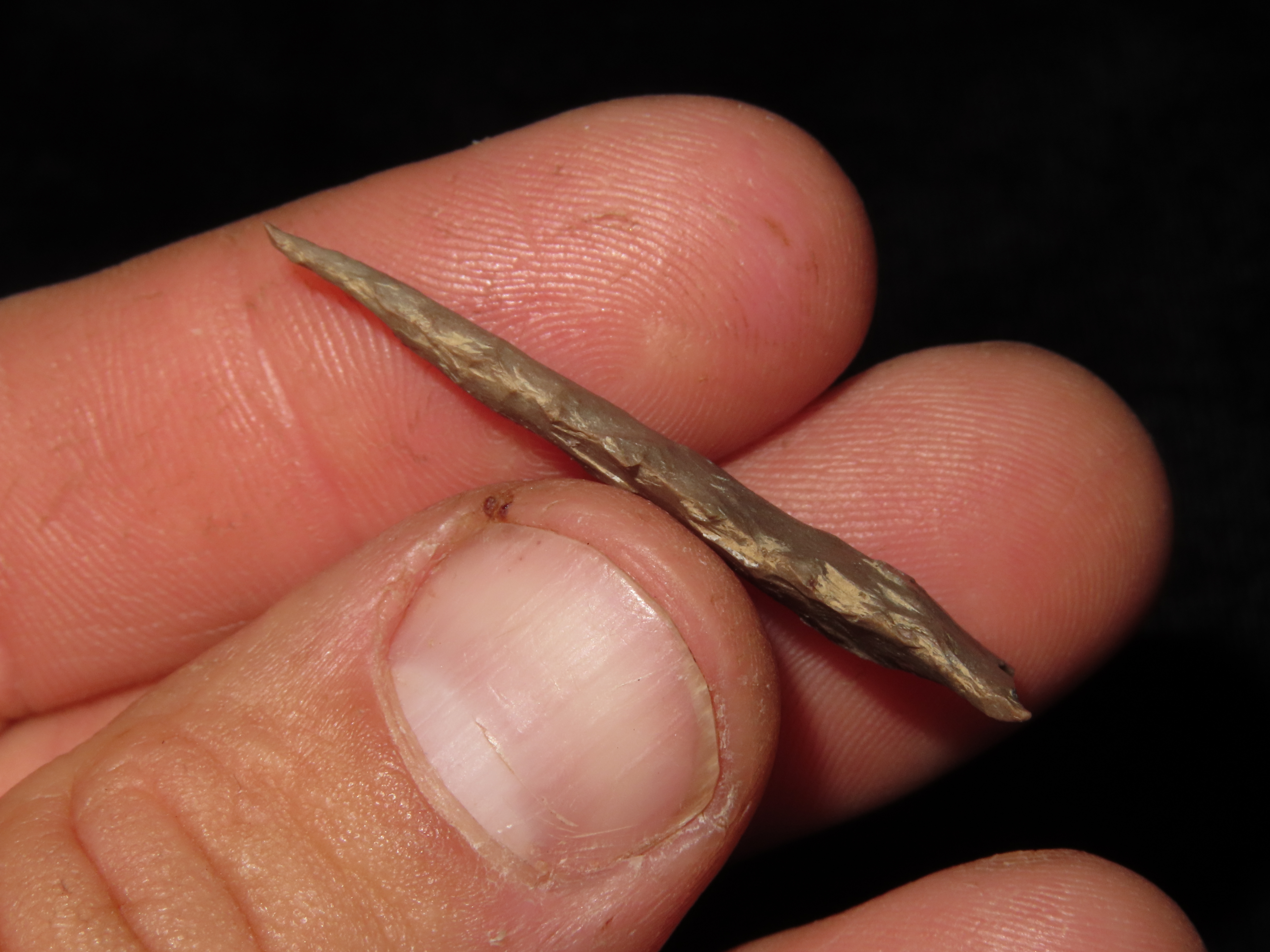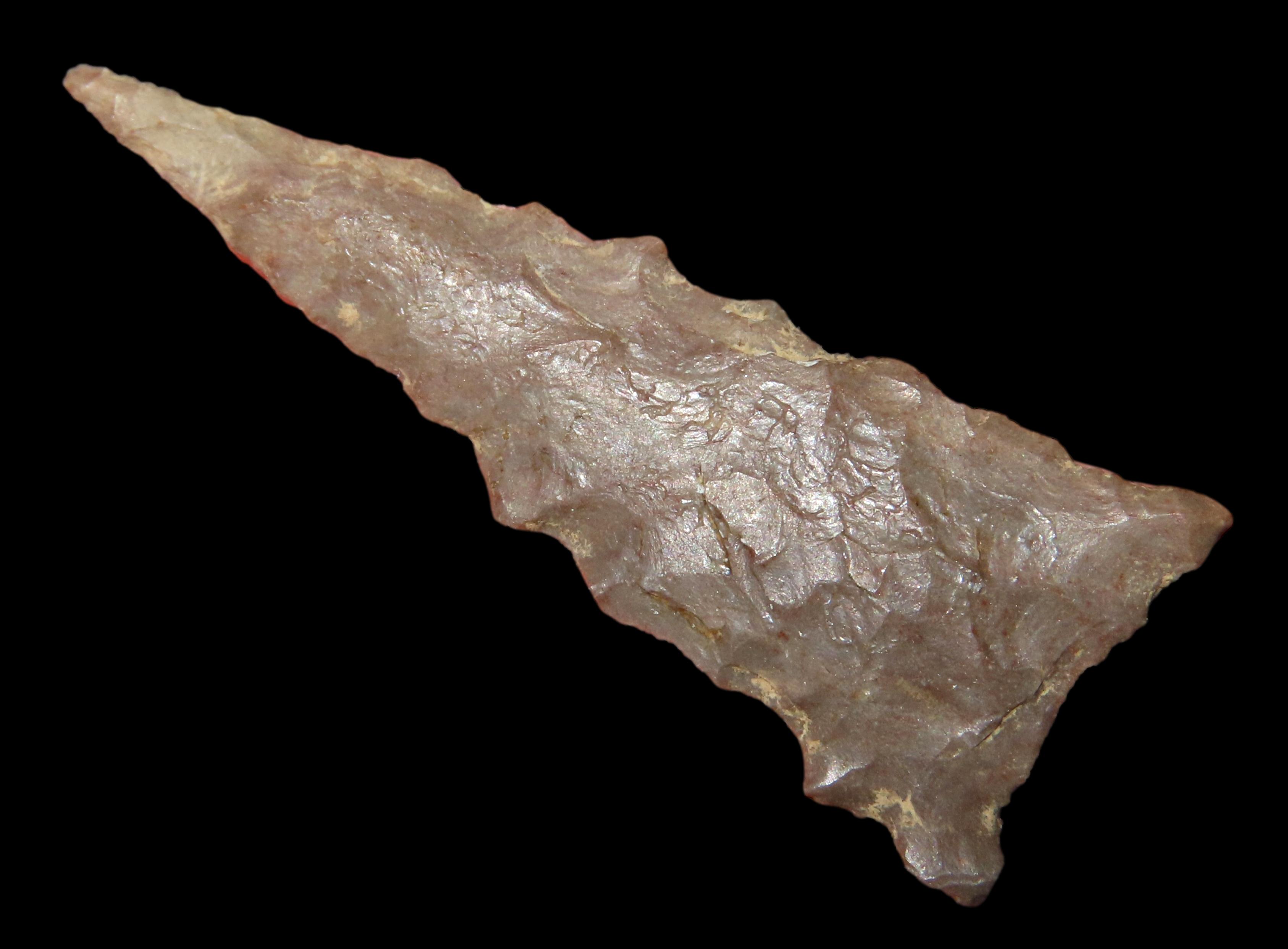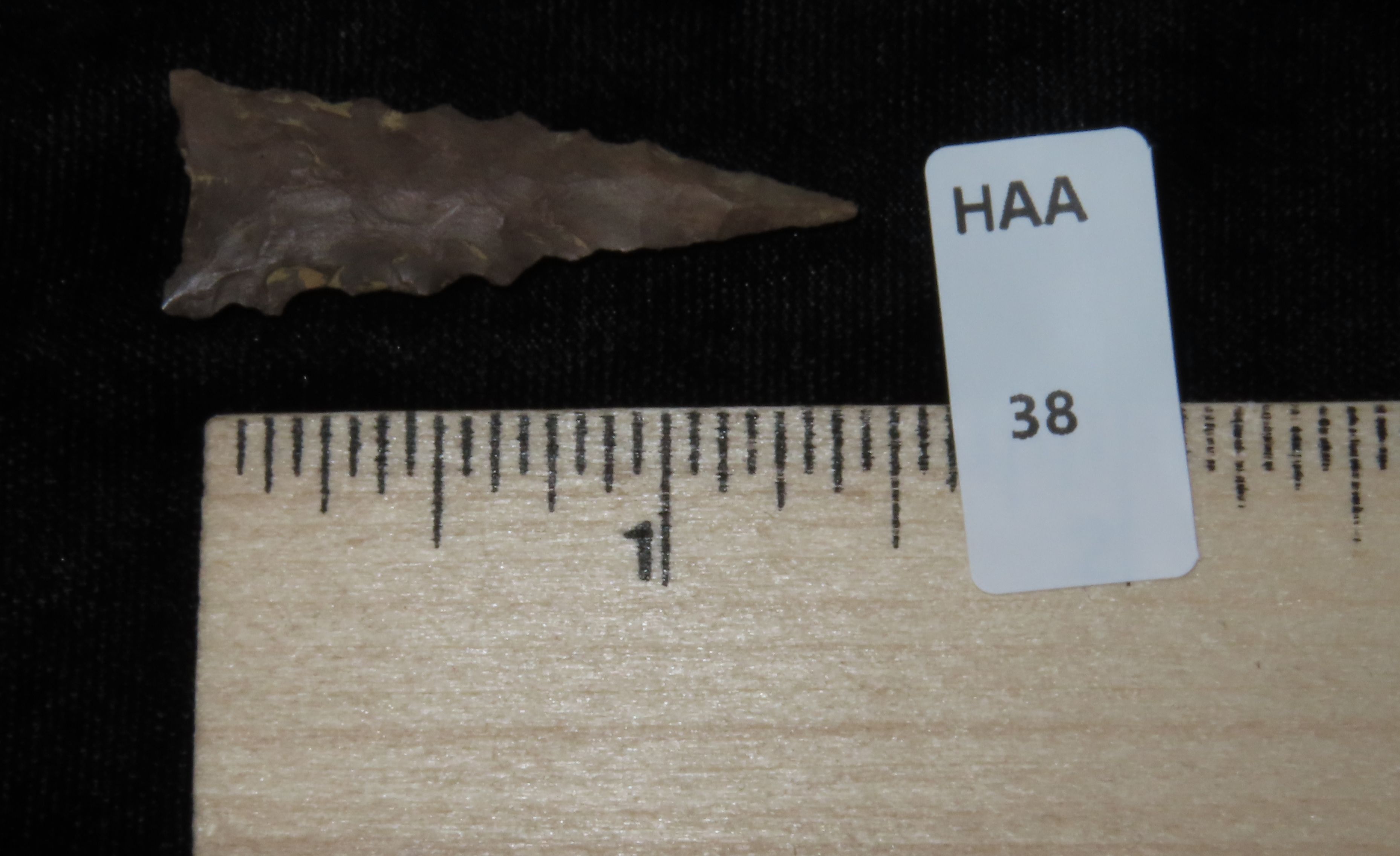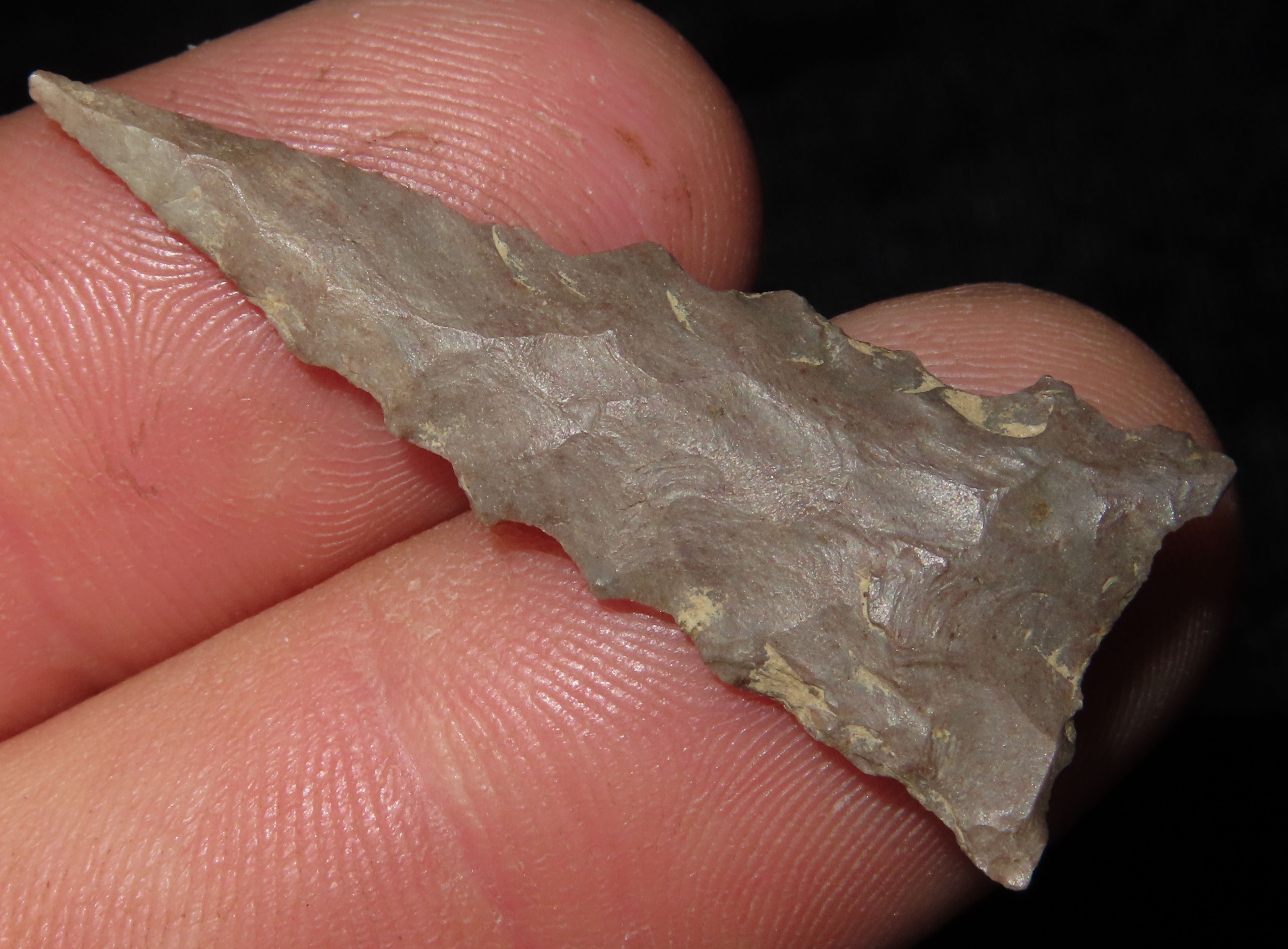 1 5/8″ SERRATED FORT ANCIENT TRIANGLE FOUND IN LEWIS COUNTY KENTUCKY, LONG NEEDLE TIP, VERY THIN & WELL FLAKED EXAMPLE, INDIAN ARROWHEAD