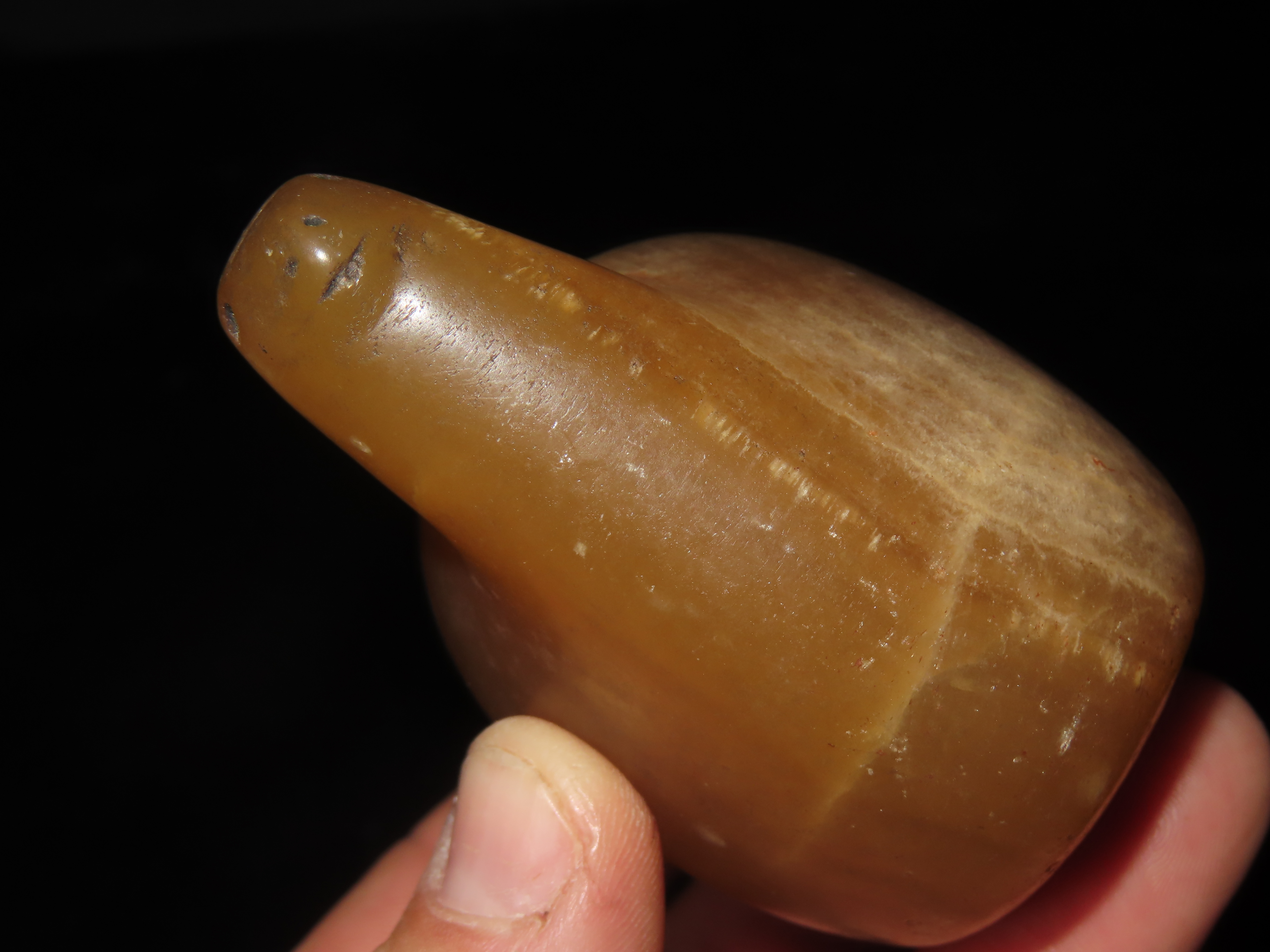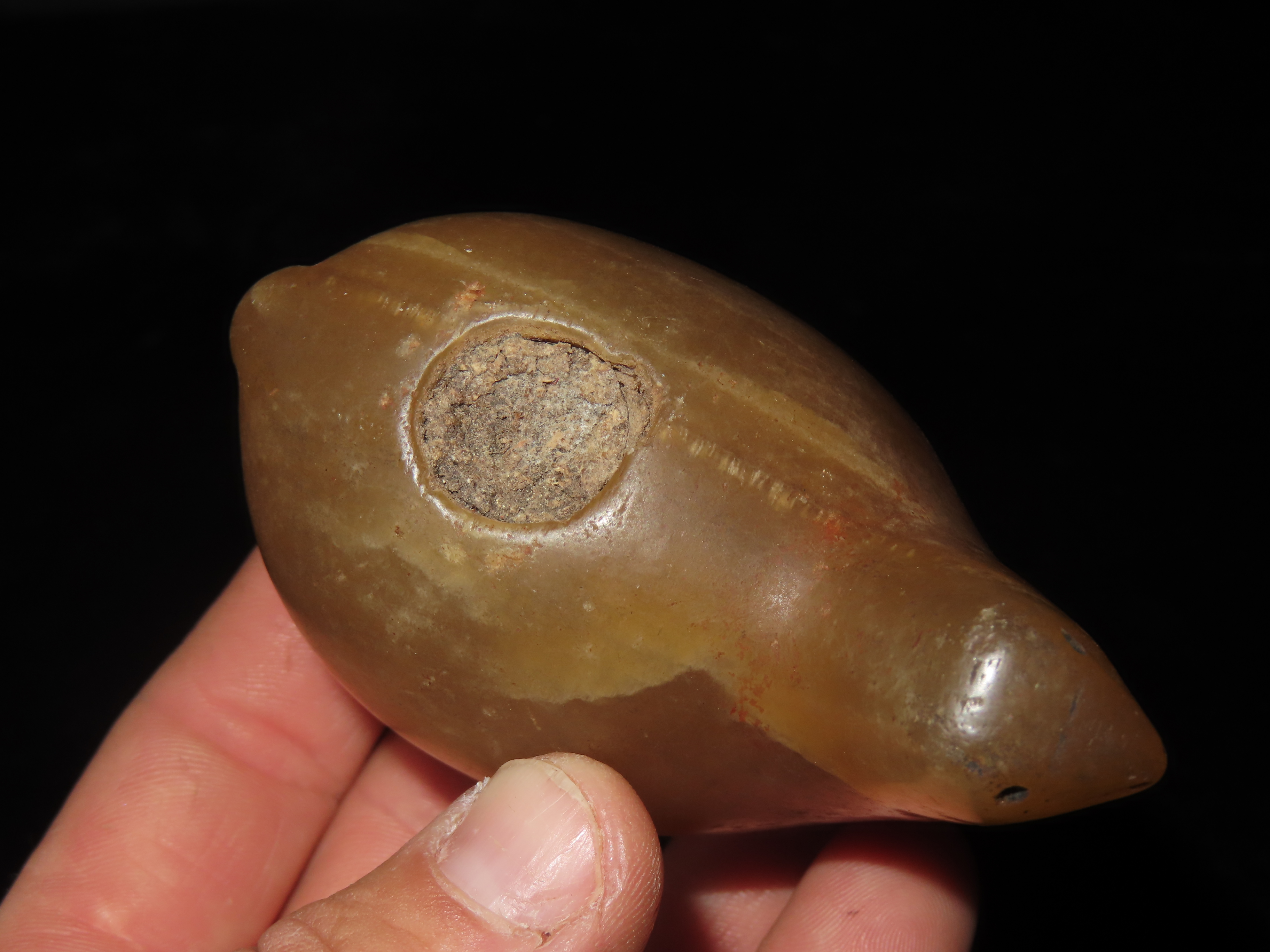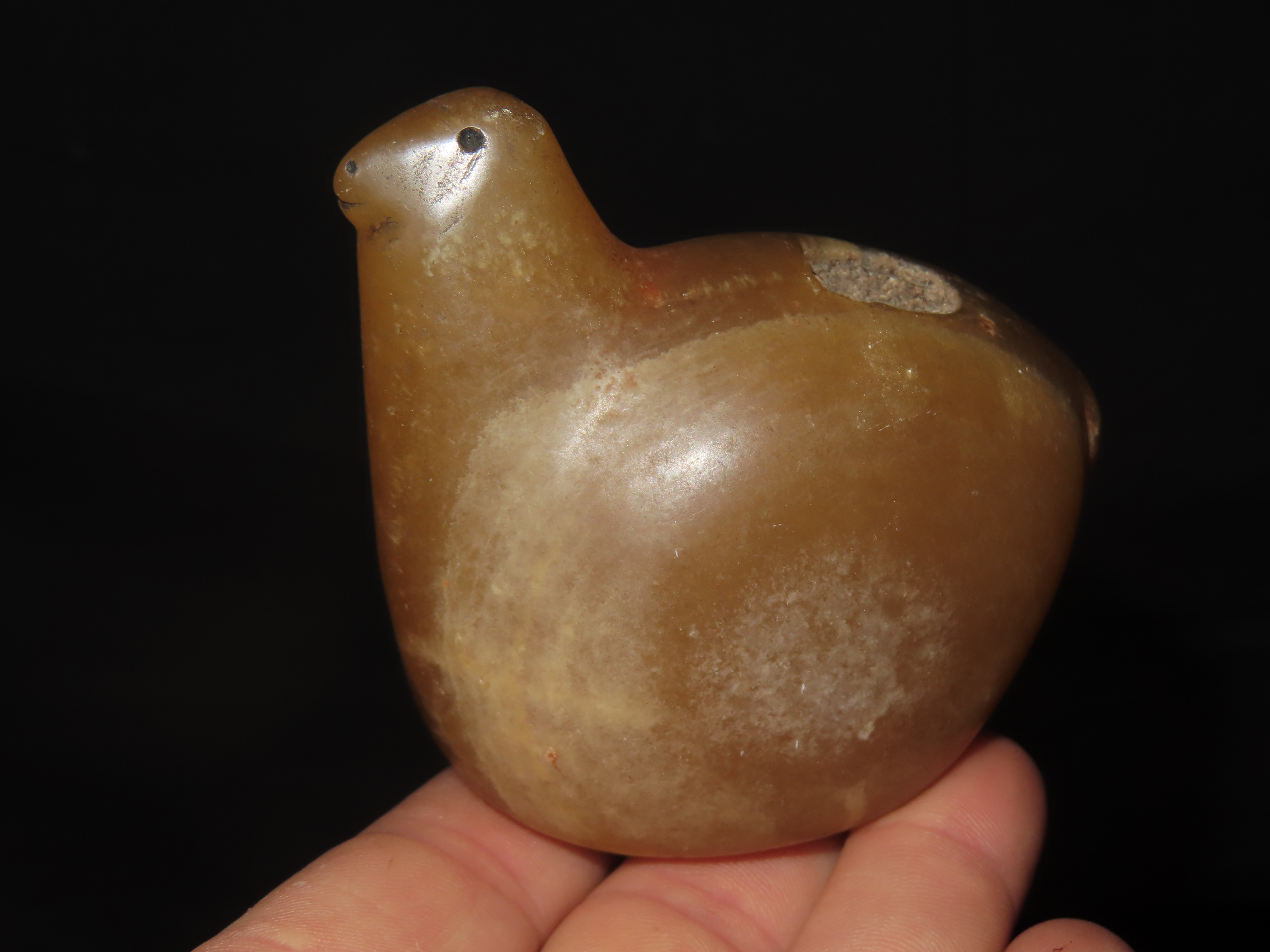 TRANSLUCENT QUARTZ OE ONYX CANOPA, HIGHLY POLISHED EXAMPLE, NO BRAINER AGE & PATINA, FOUND IN PERU, LLAMA VOTIVE CONTAINER