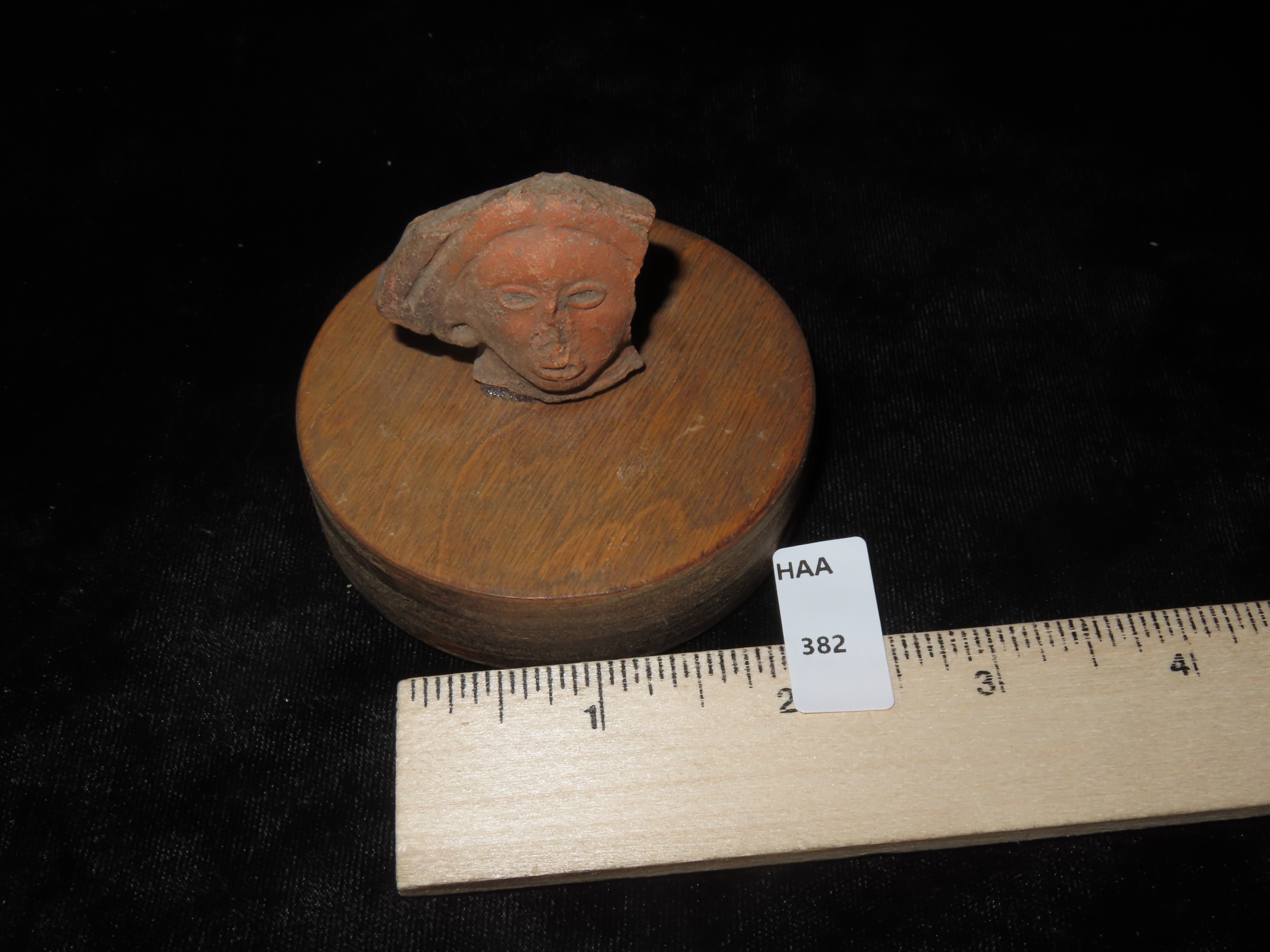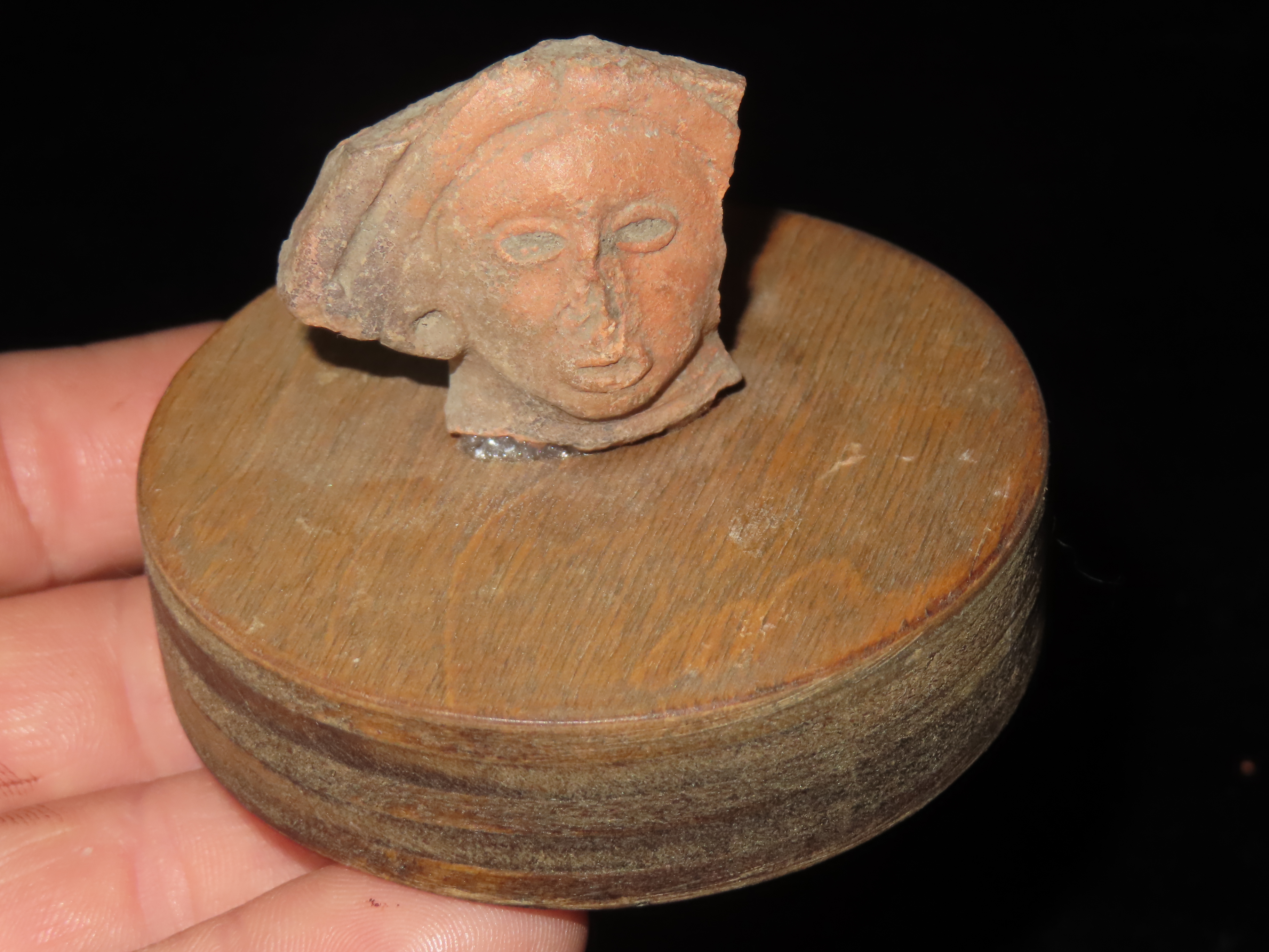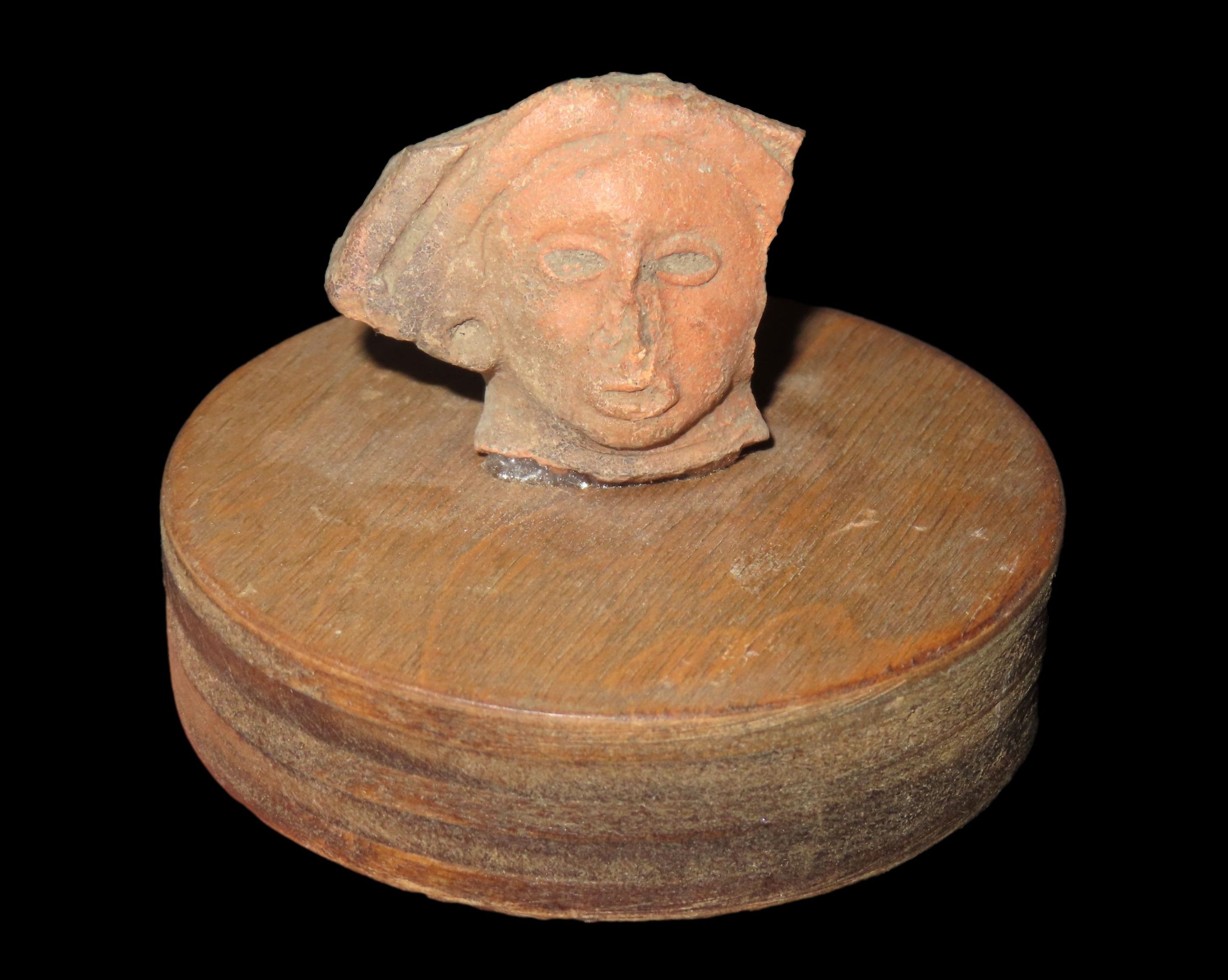 NICELY DETAILED HUMAN FACE OFF A LARGER FIGURE, GLUED TO A WOODEN STAND, VERY NICE DESIGN, GIVES A GLIMPSE INTO WHAT THEY LOOKED LIKE BACK THEN