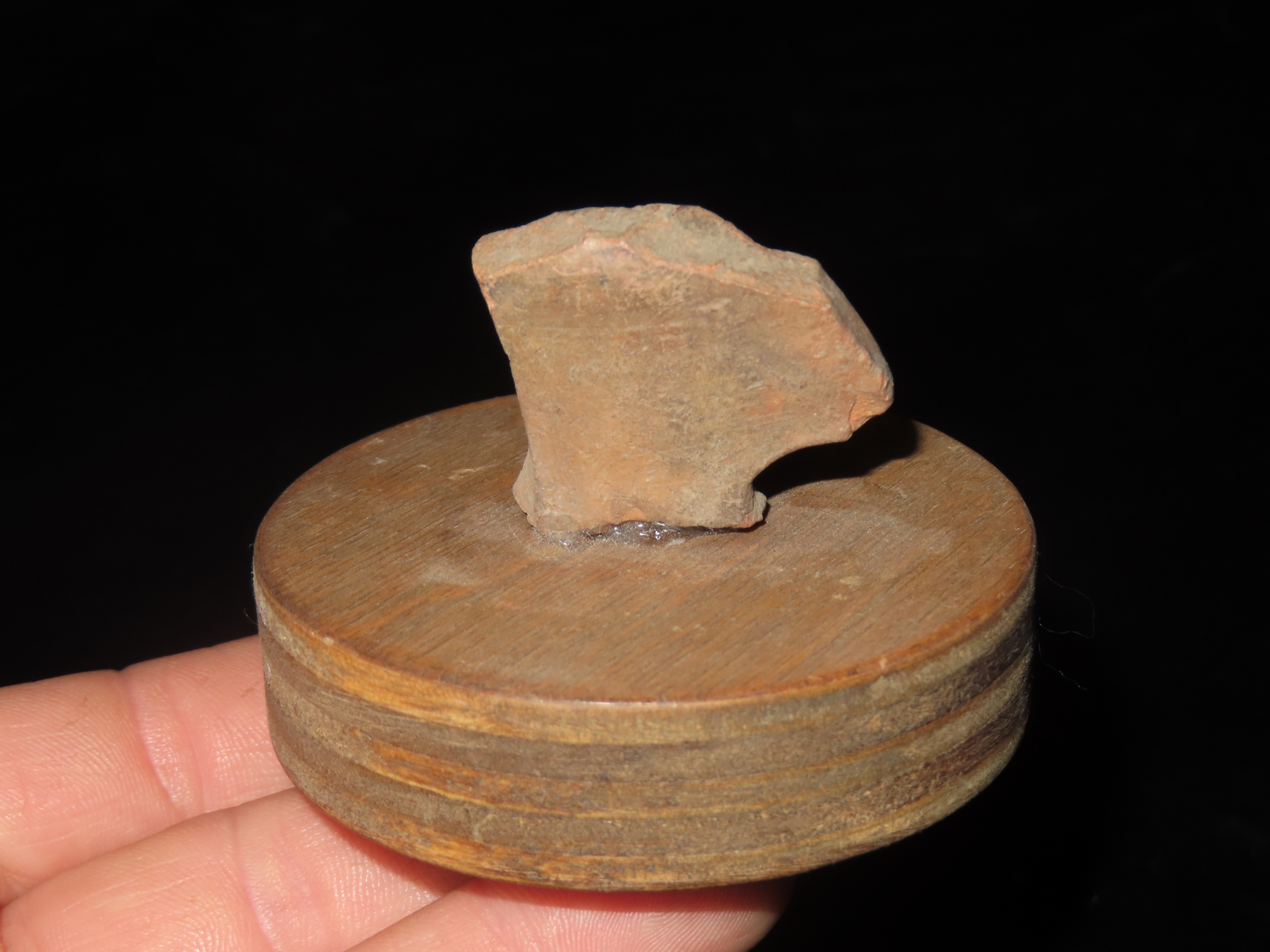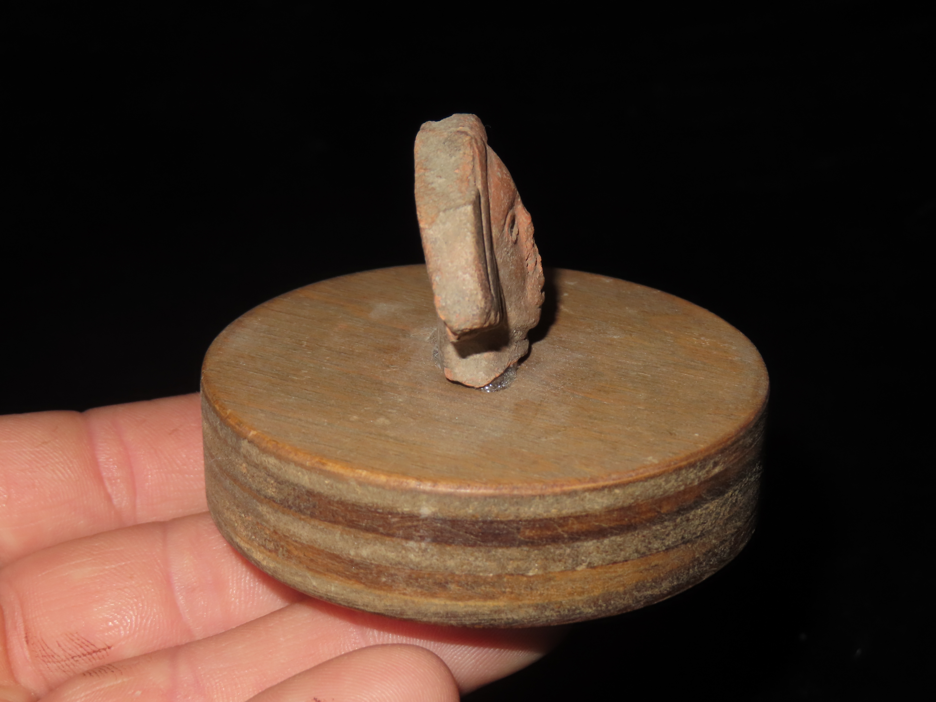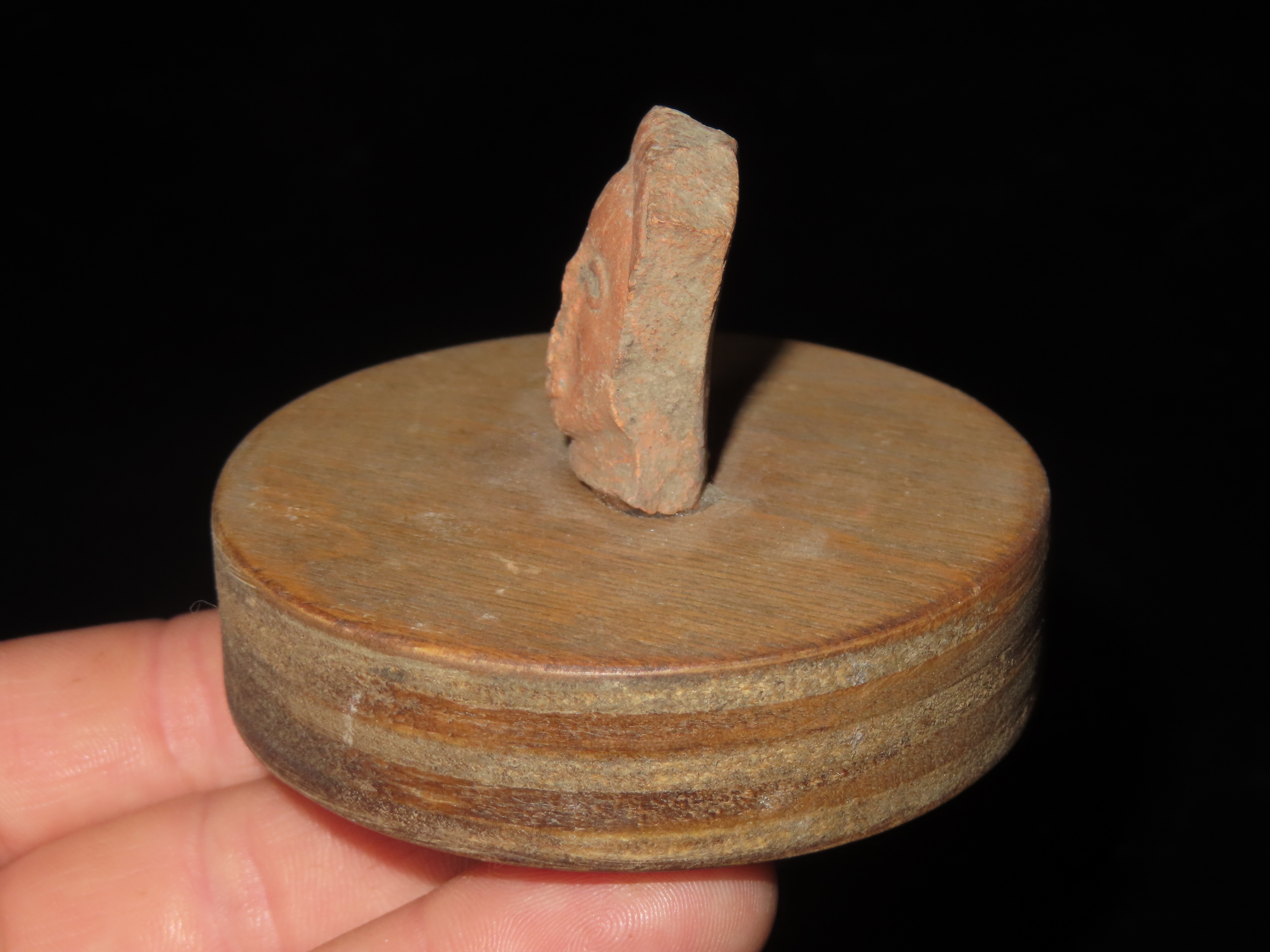 NICELY DETAILED HUMAN FACE OFF A LARGER FIGURE, GLUED TO A WOODEN STAND, VERY NICE DESIGN, GIVES A GLIMPSE INTO WHAT THEY LOOKED LIKE BACK THEN