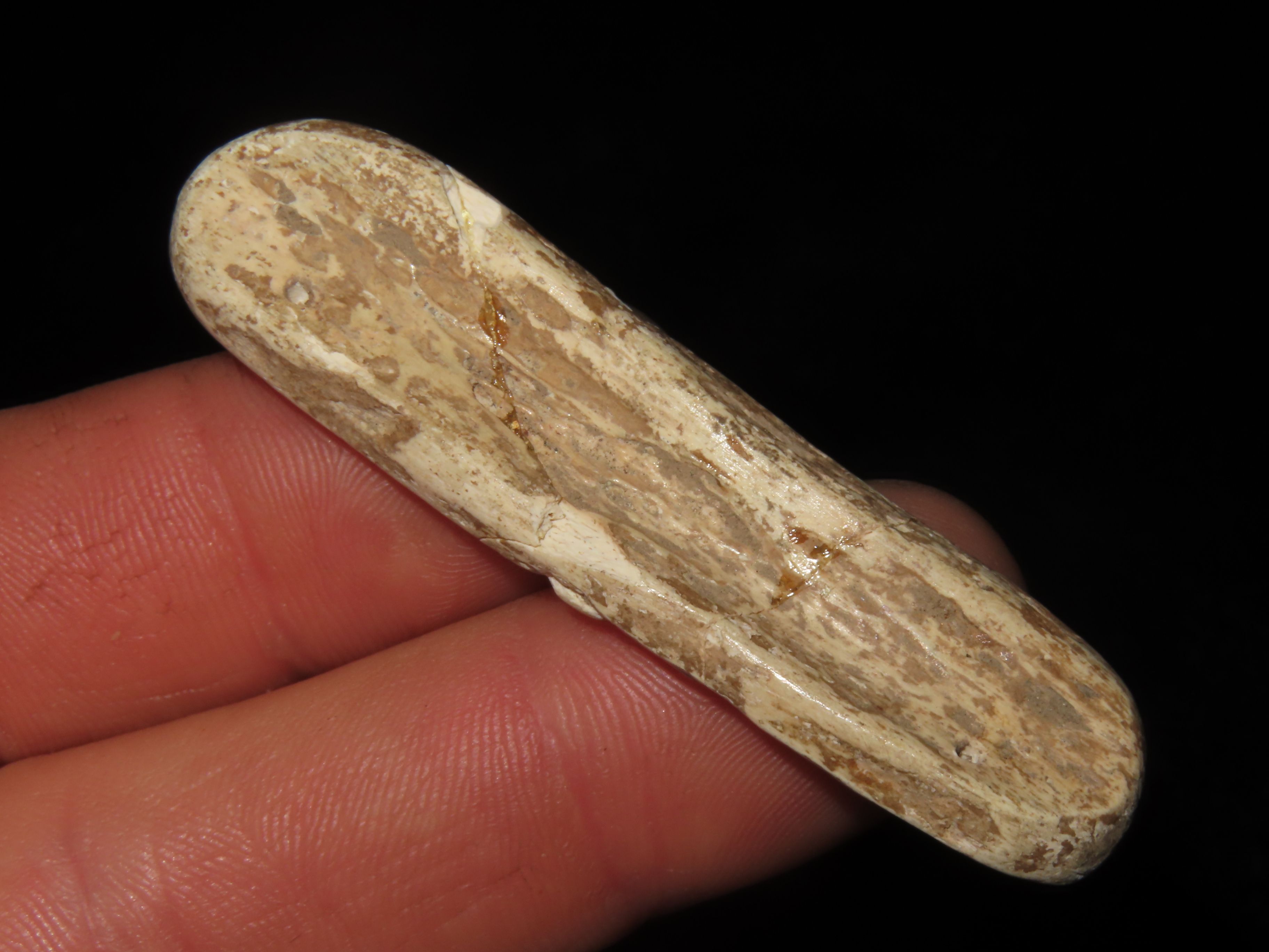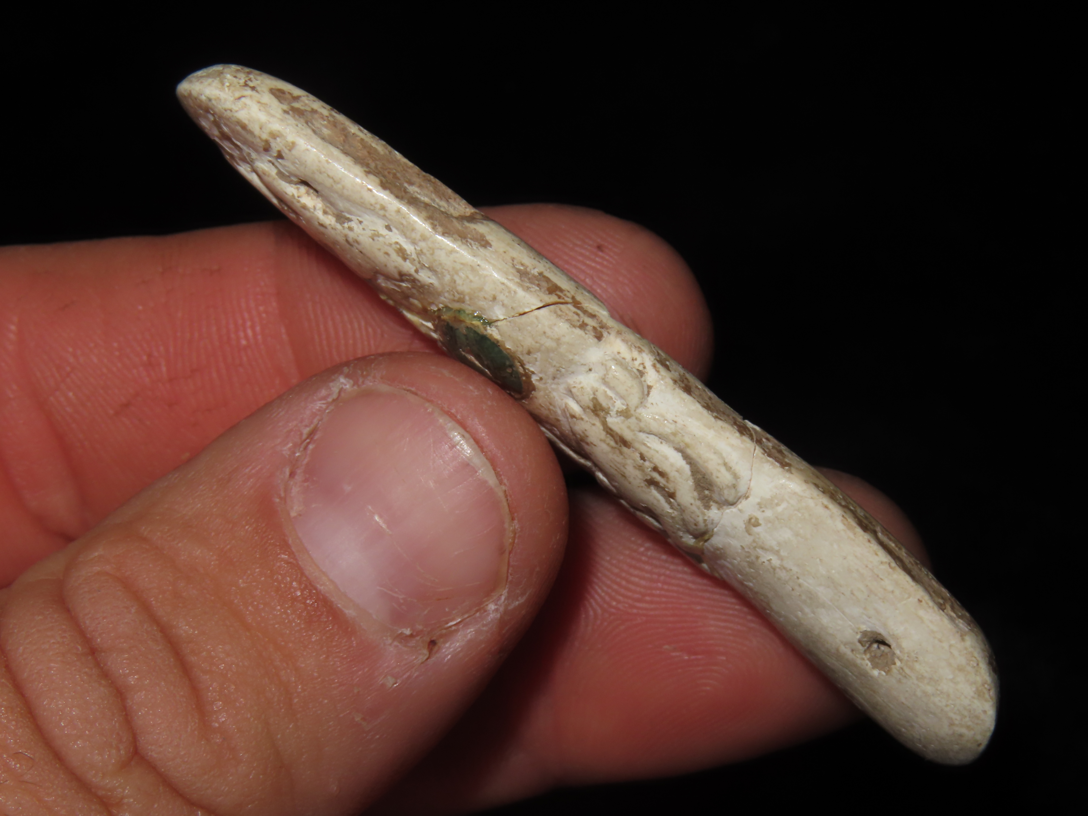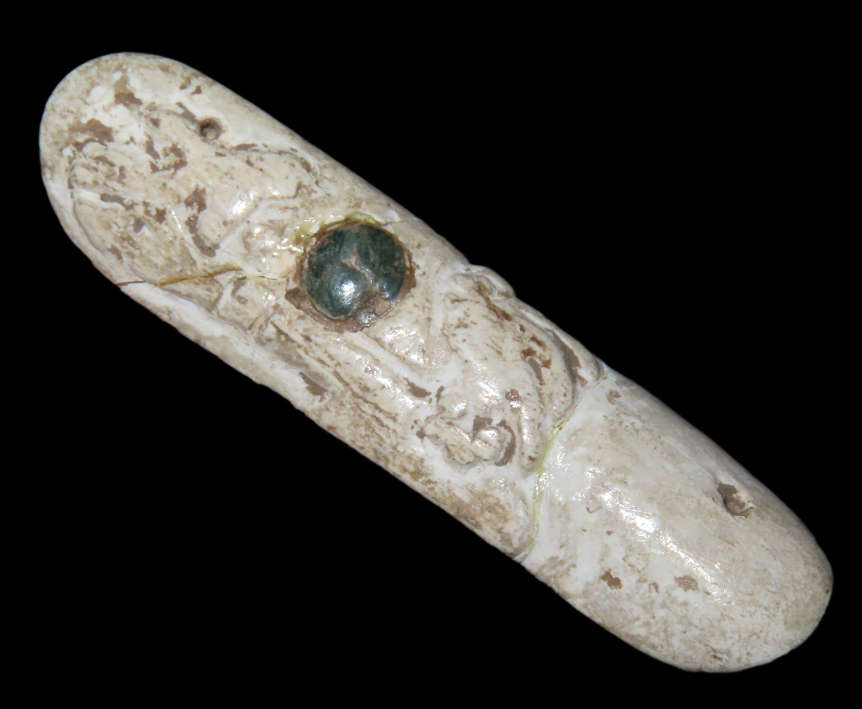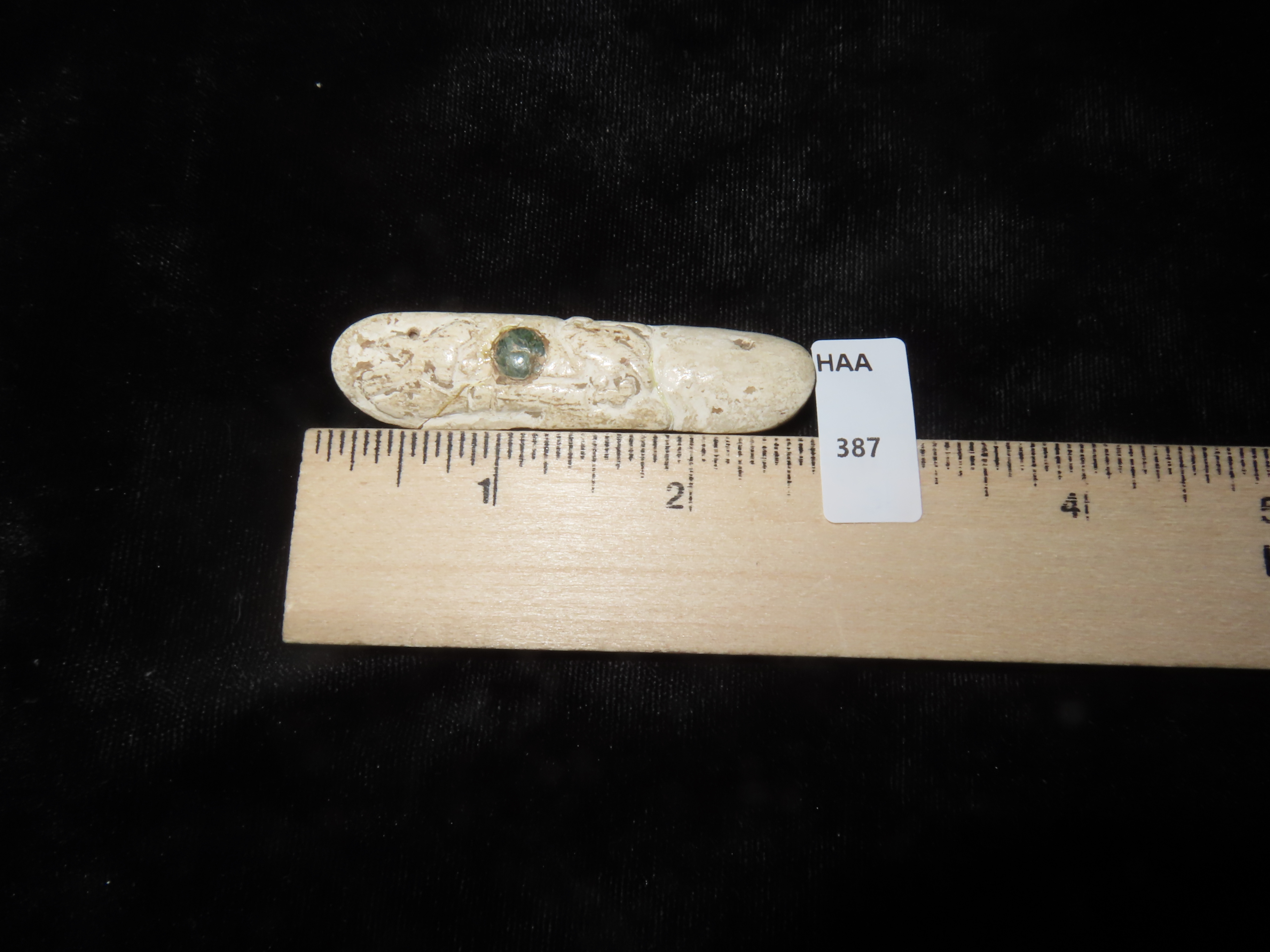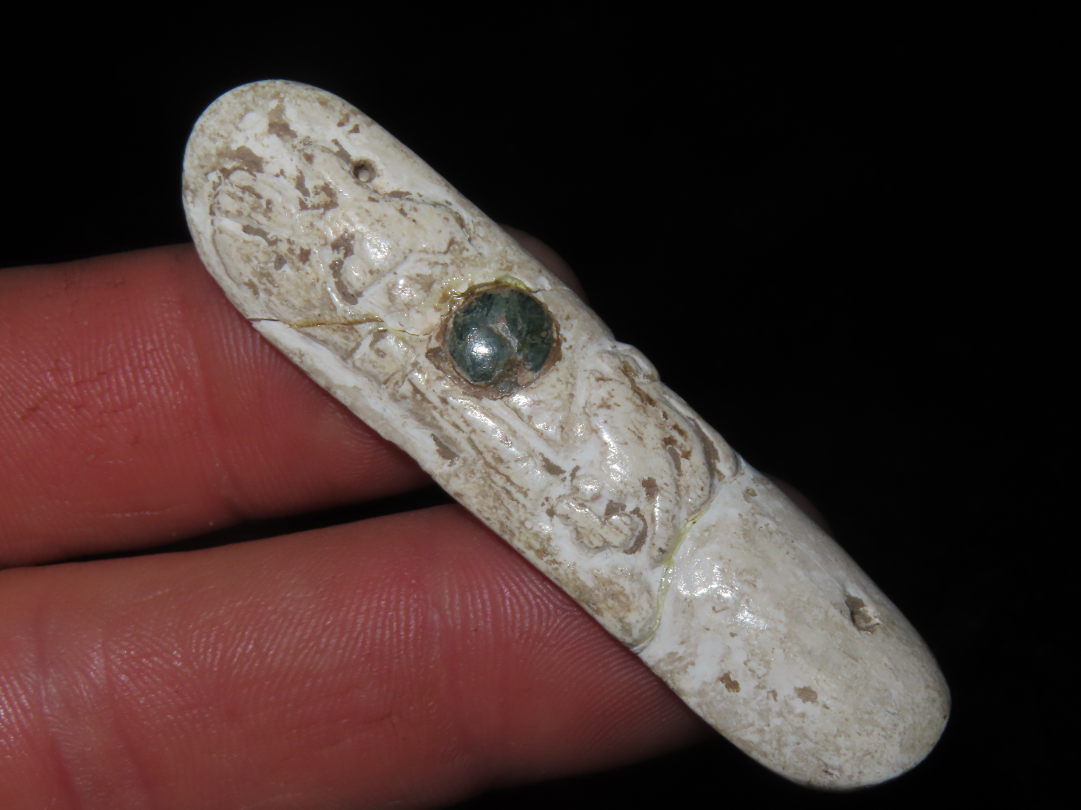 2 1/2″ MAYAN HUMAN EFFIGY COCA SPOON WITH INLAID JADE DISC, INTRICATELY ENGRAVED WITH LOTS OF GOOD USE WEAR AND POLISH