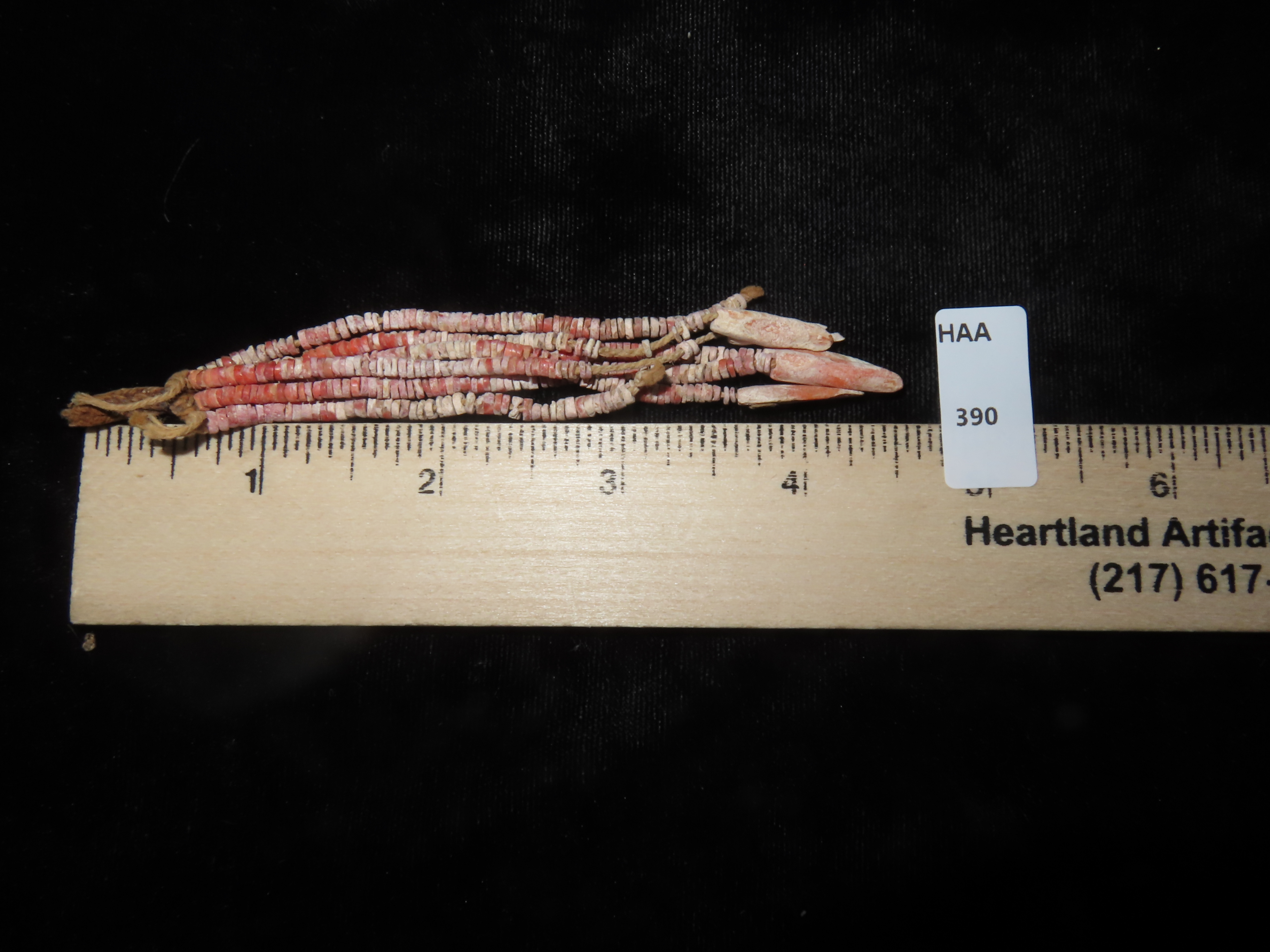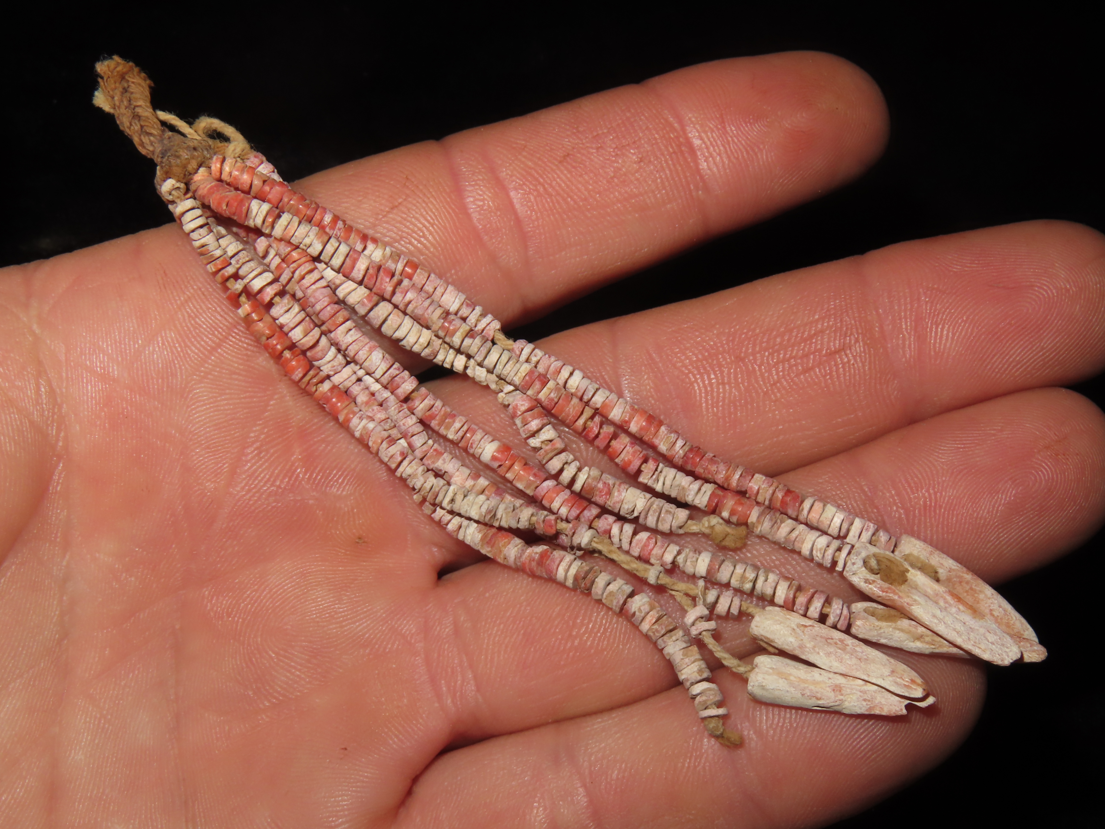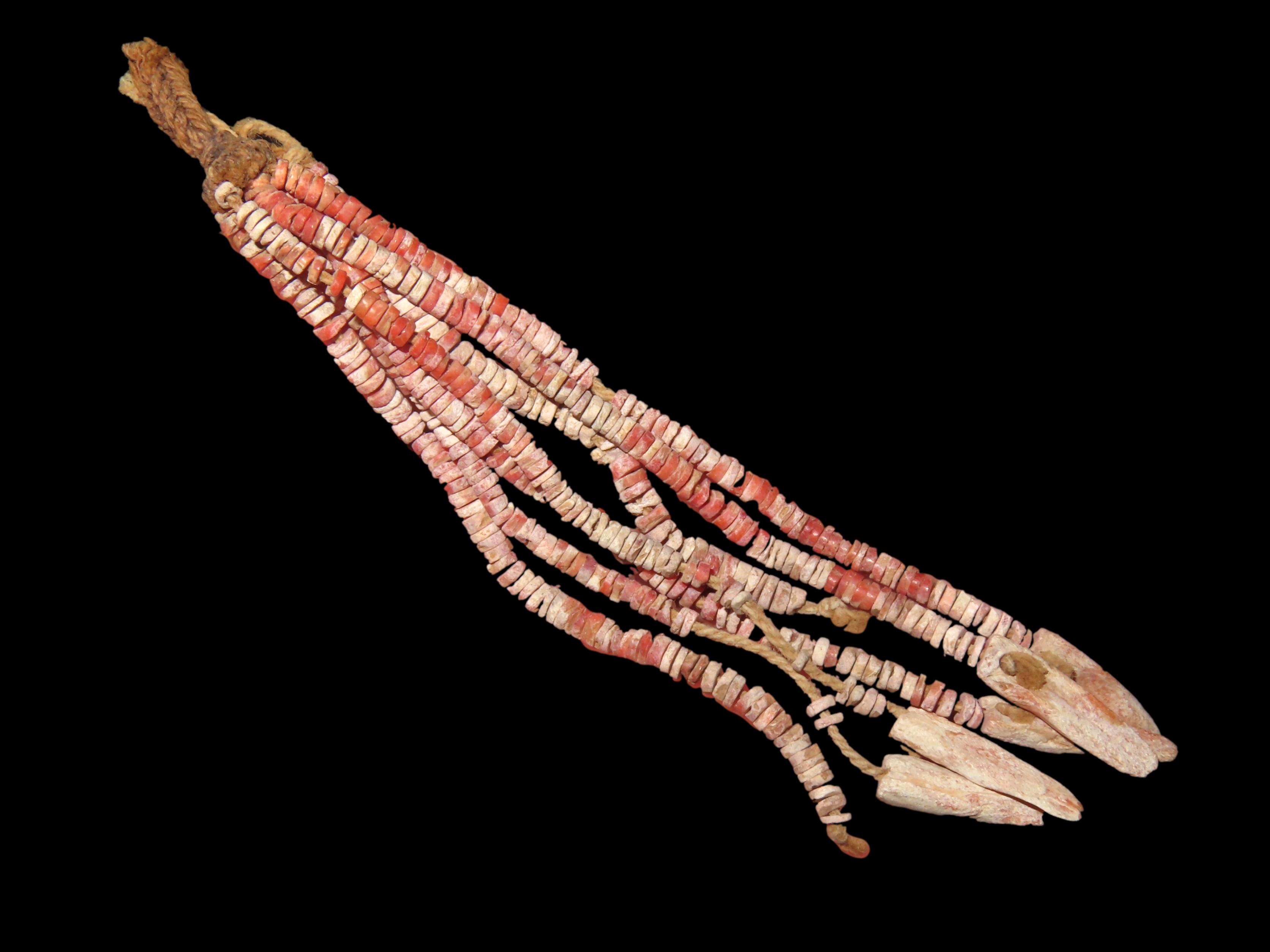COLORFUL SPONDYLUS SHELL BEAD DECORATION, MULTIPLE STRANDS WITH 100’S OF BEADS & LONG POINTED PENDANTS DANGLING FROM EACH DROP