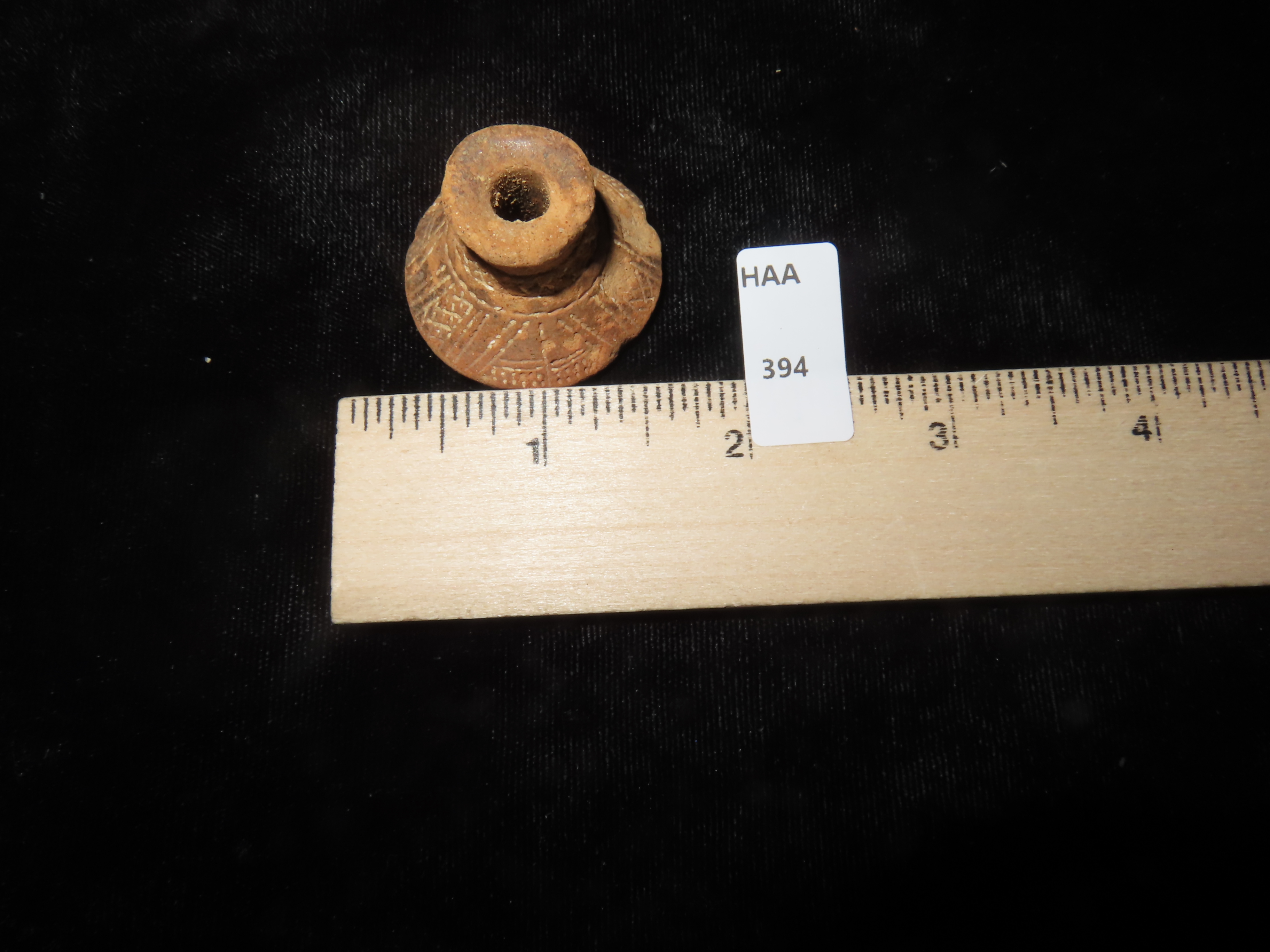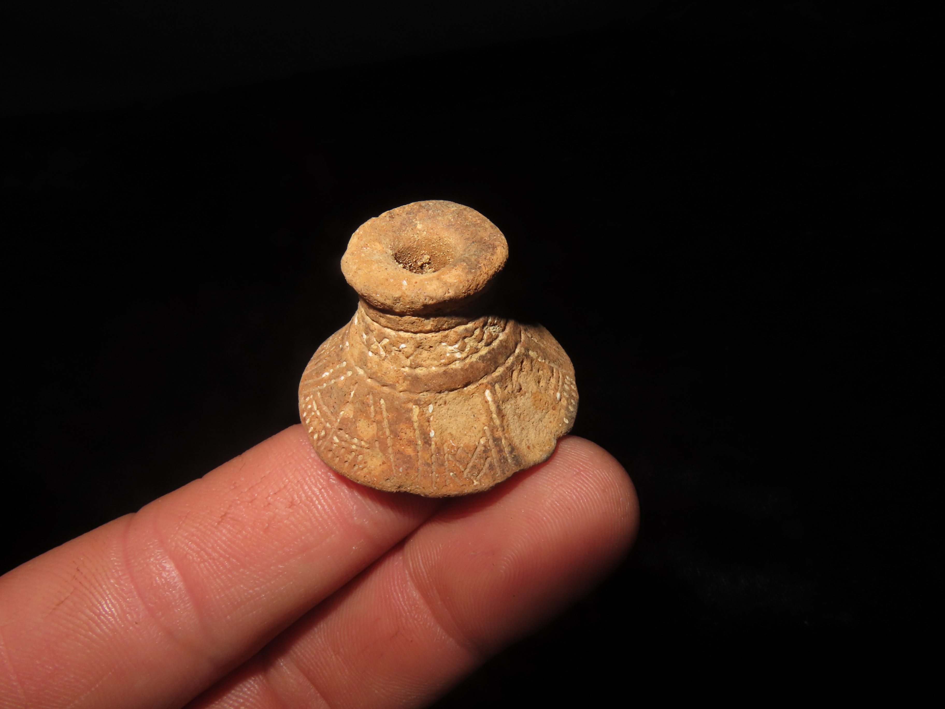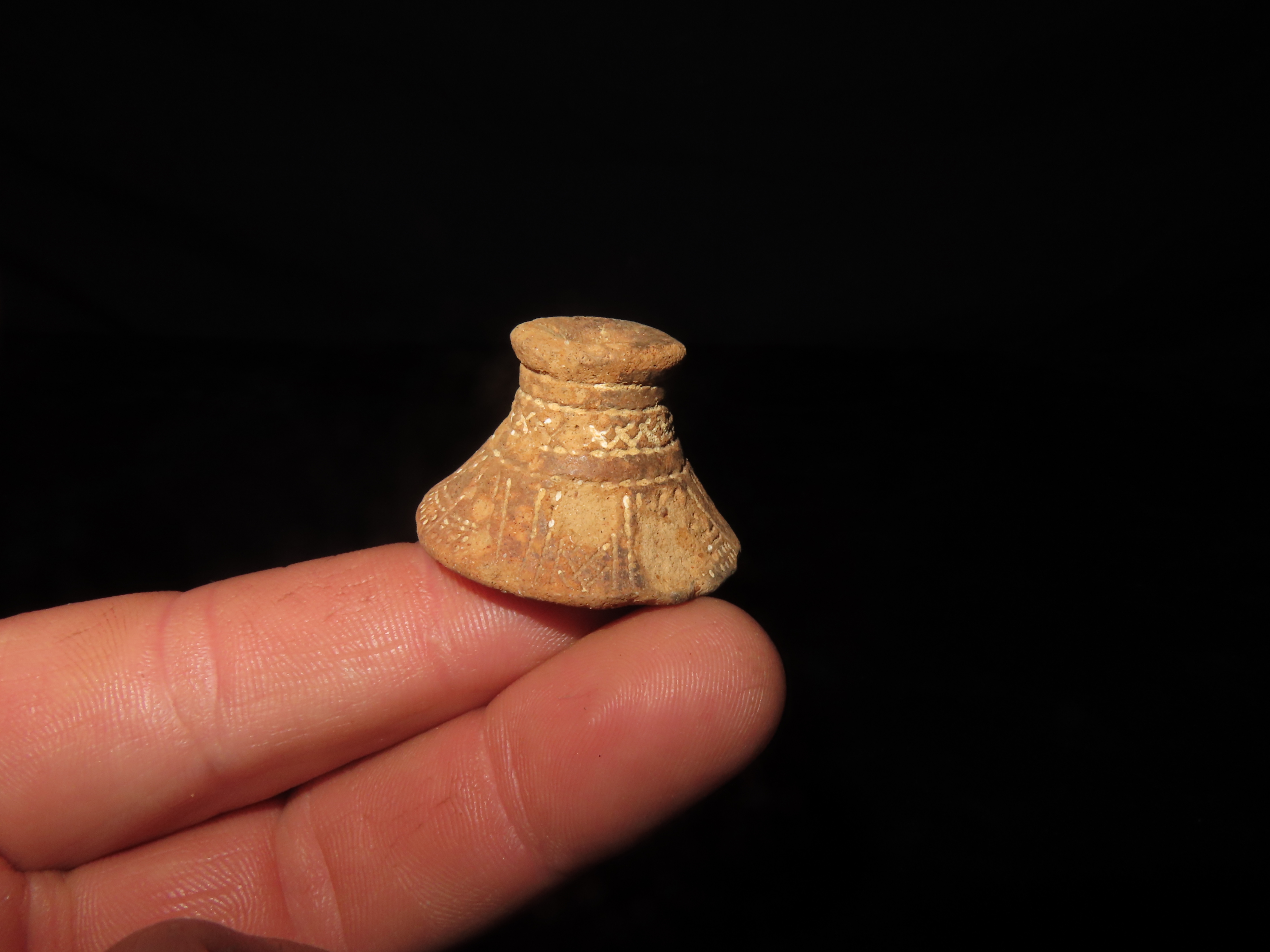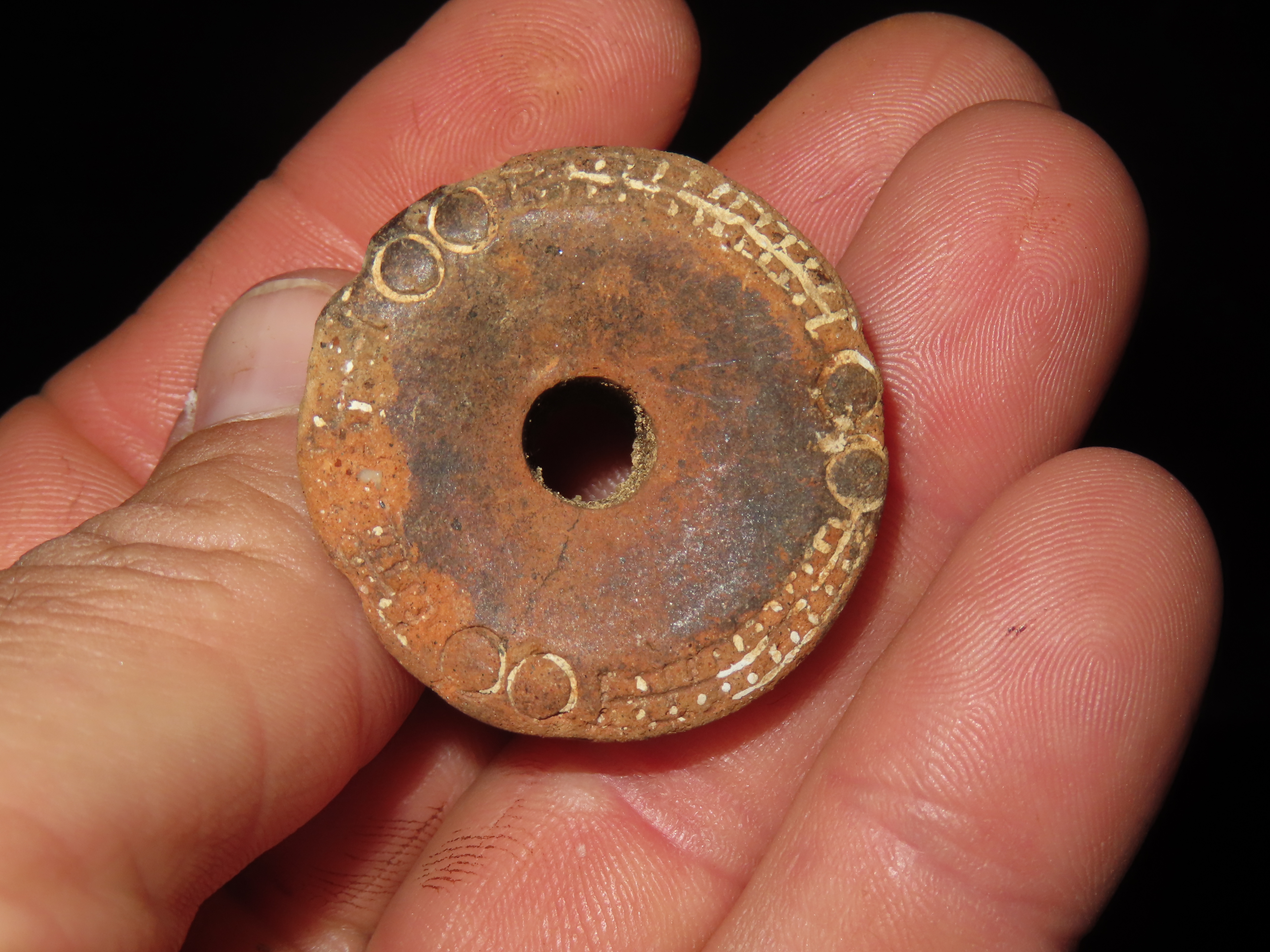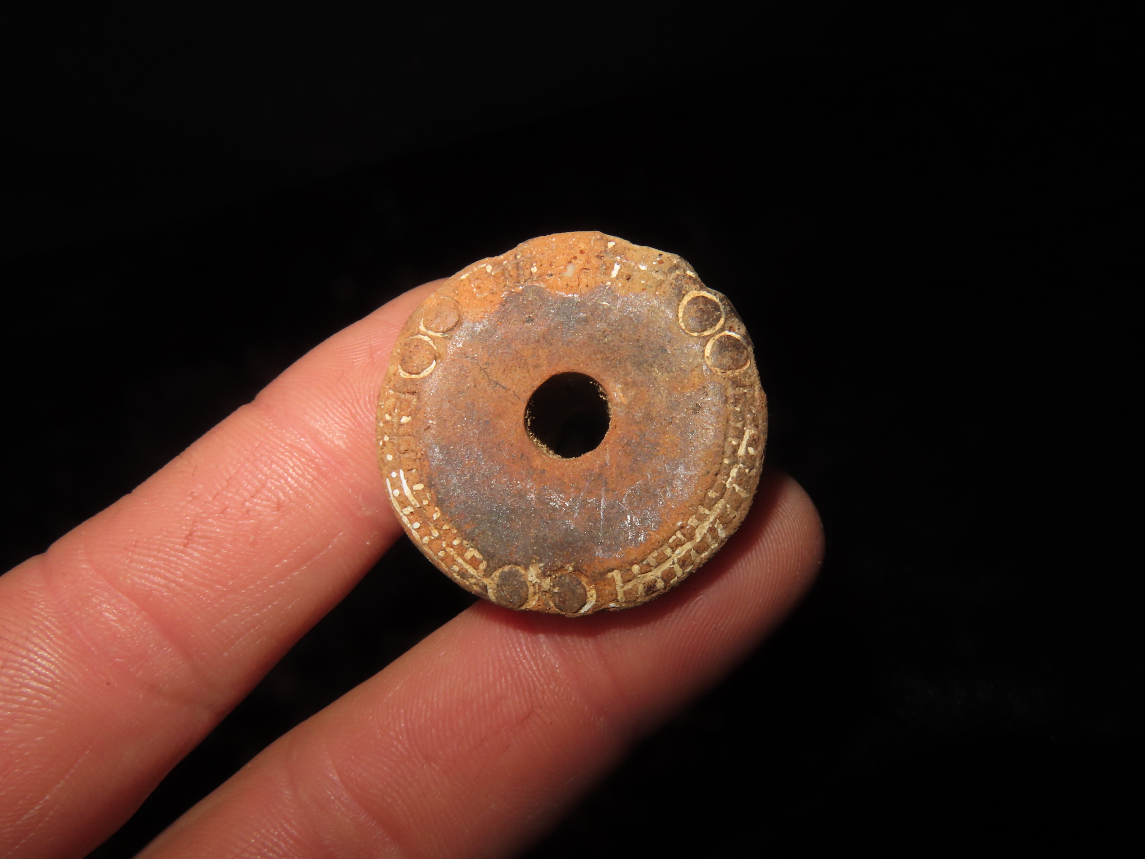 LARGE HEAVILY ENGRAVED SPINDLE WHORL BEAD, PRECOLUMBIAN POTTERY/CLAY FROM SOUTH AMERICA, CIRCA 800-1200 AD