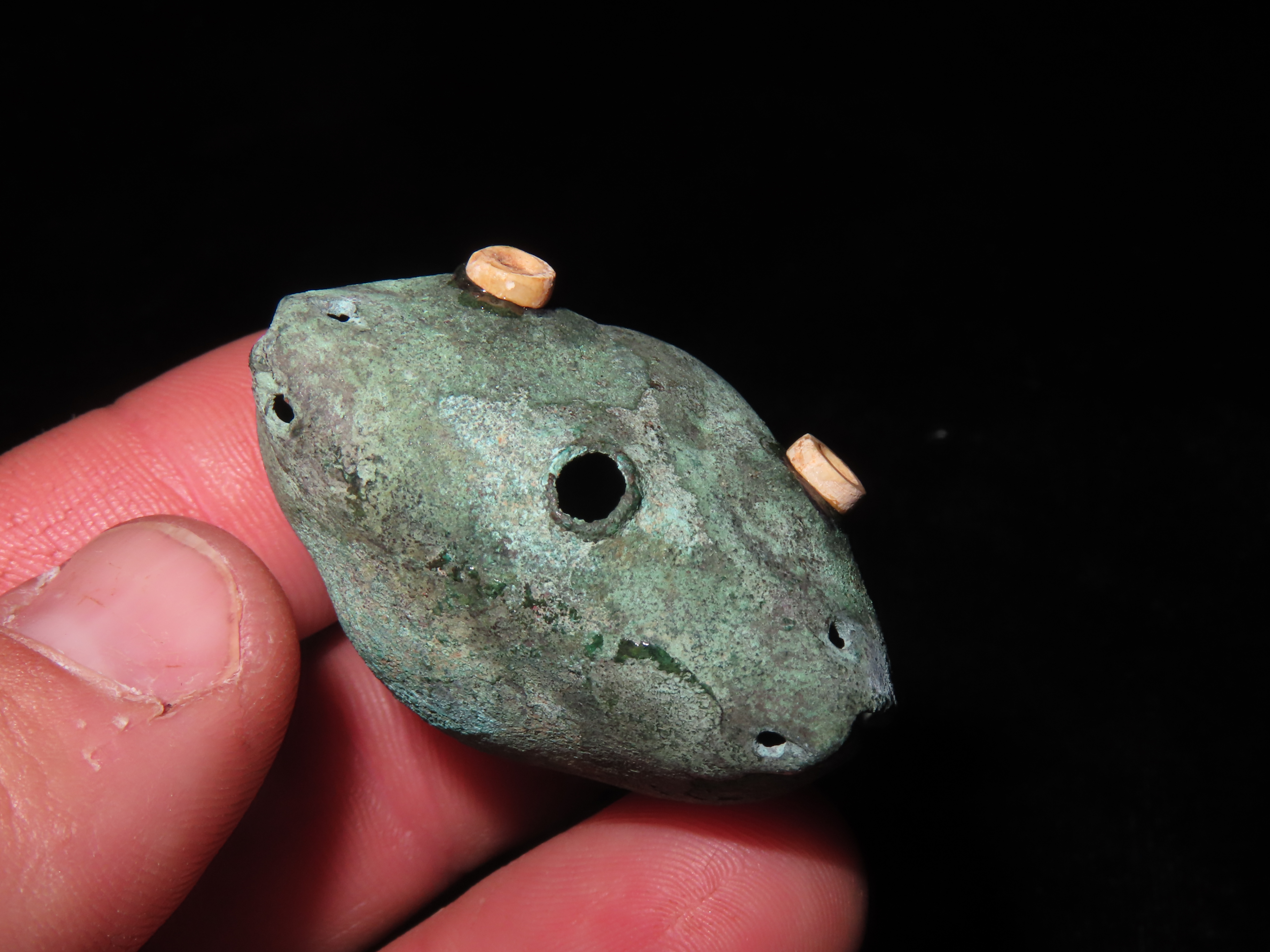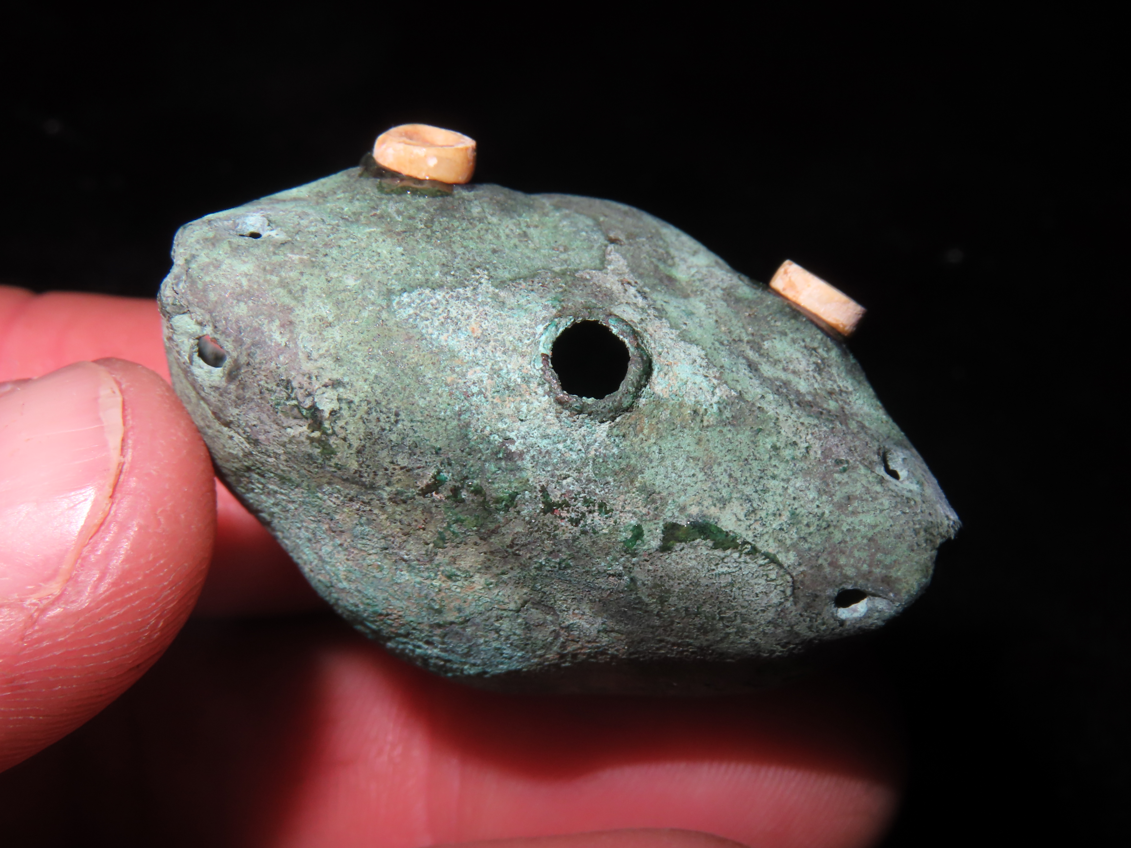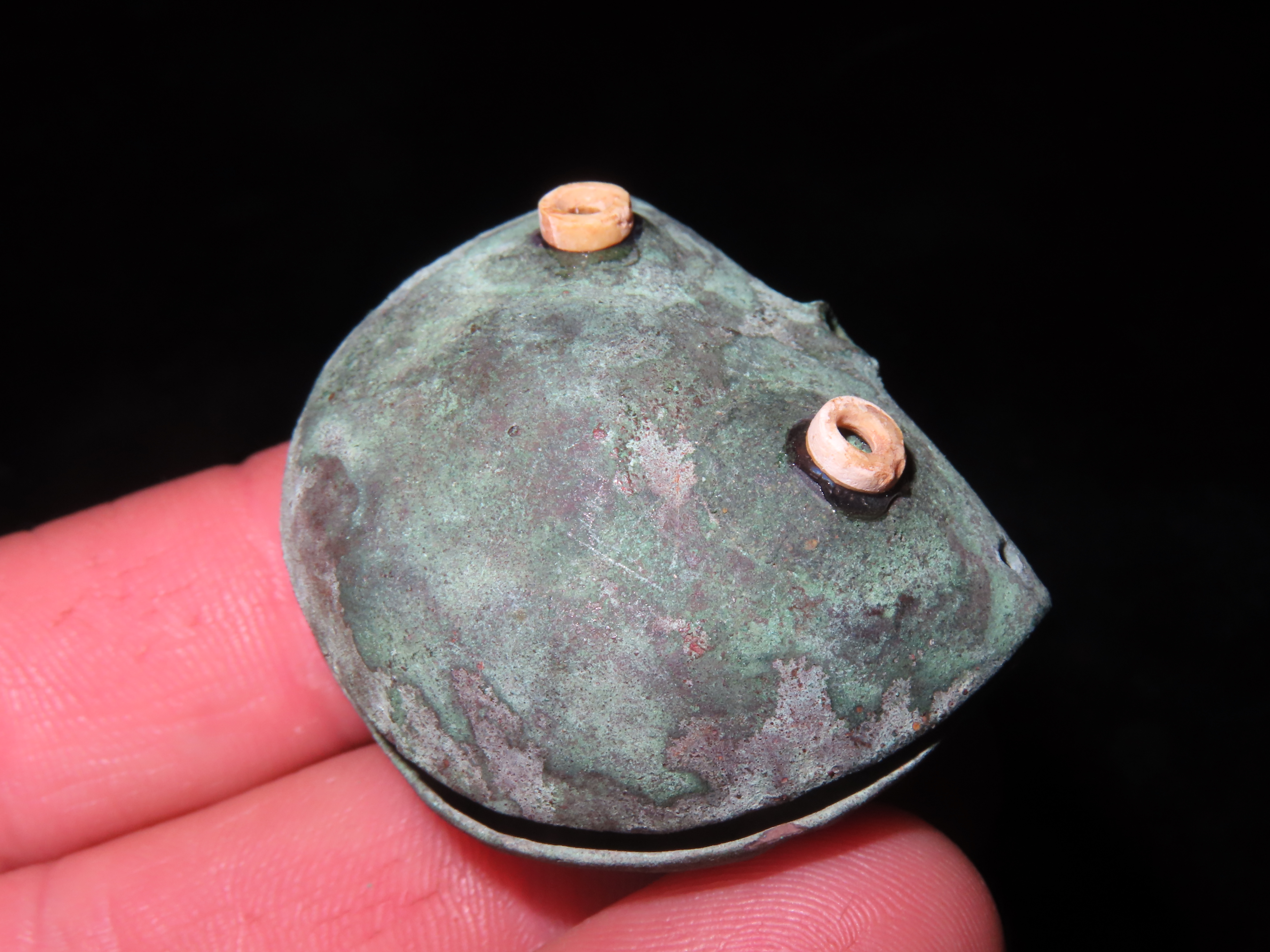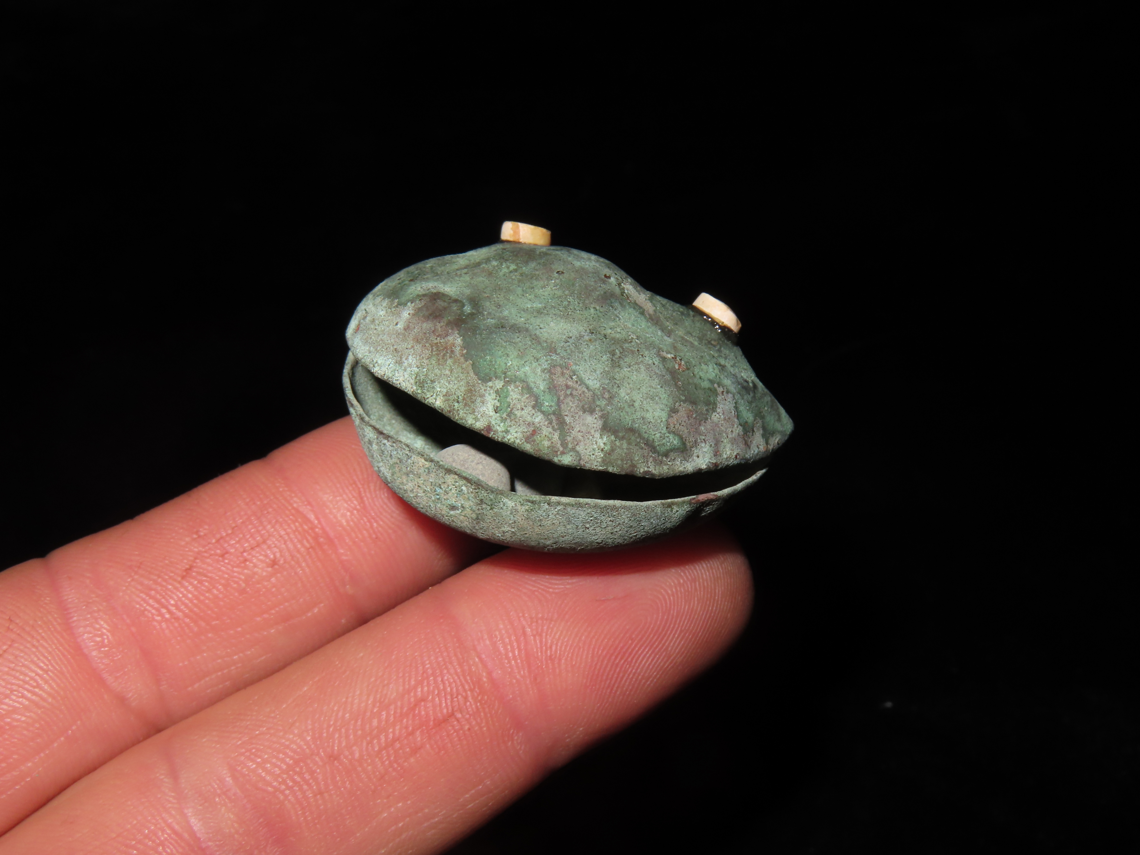 RARE MOCHE COPPER OWL EFFIGY PENDANT / BELL, WITH ORIGINAL RATTLE, HAS RAISED NOSE & RAISED NODES AND SHELL FOR THE EYES