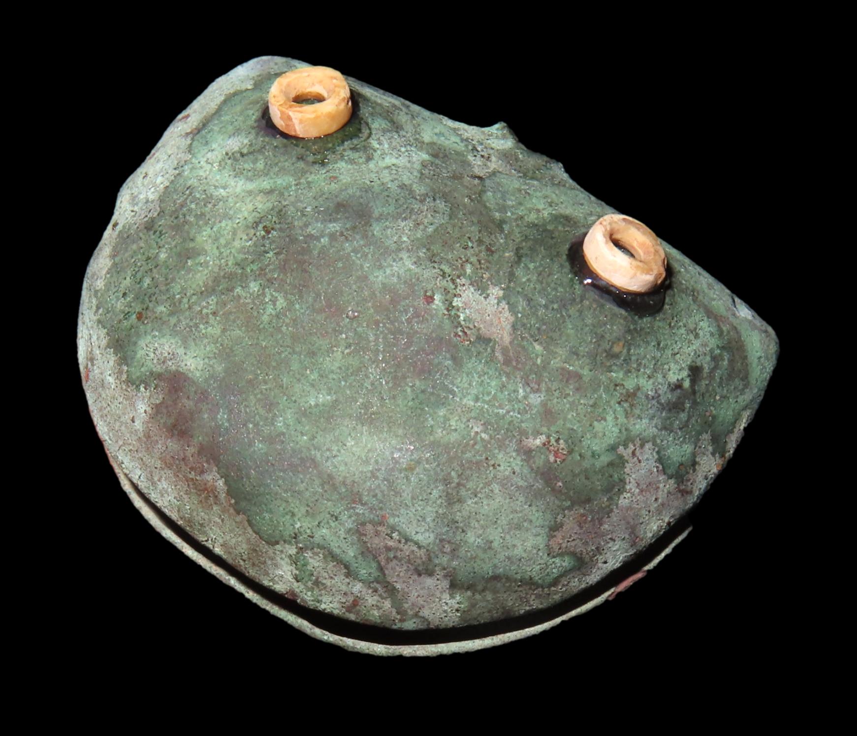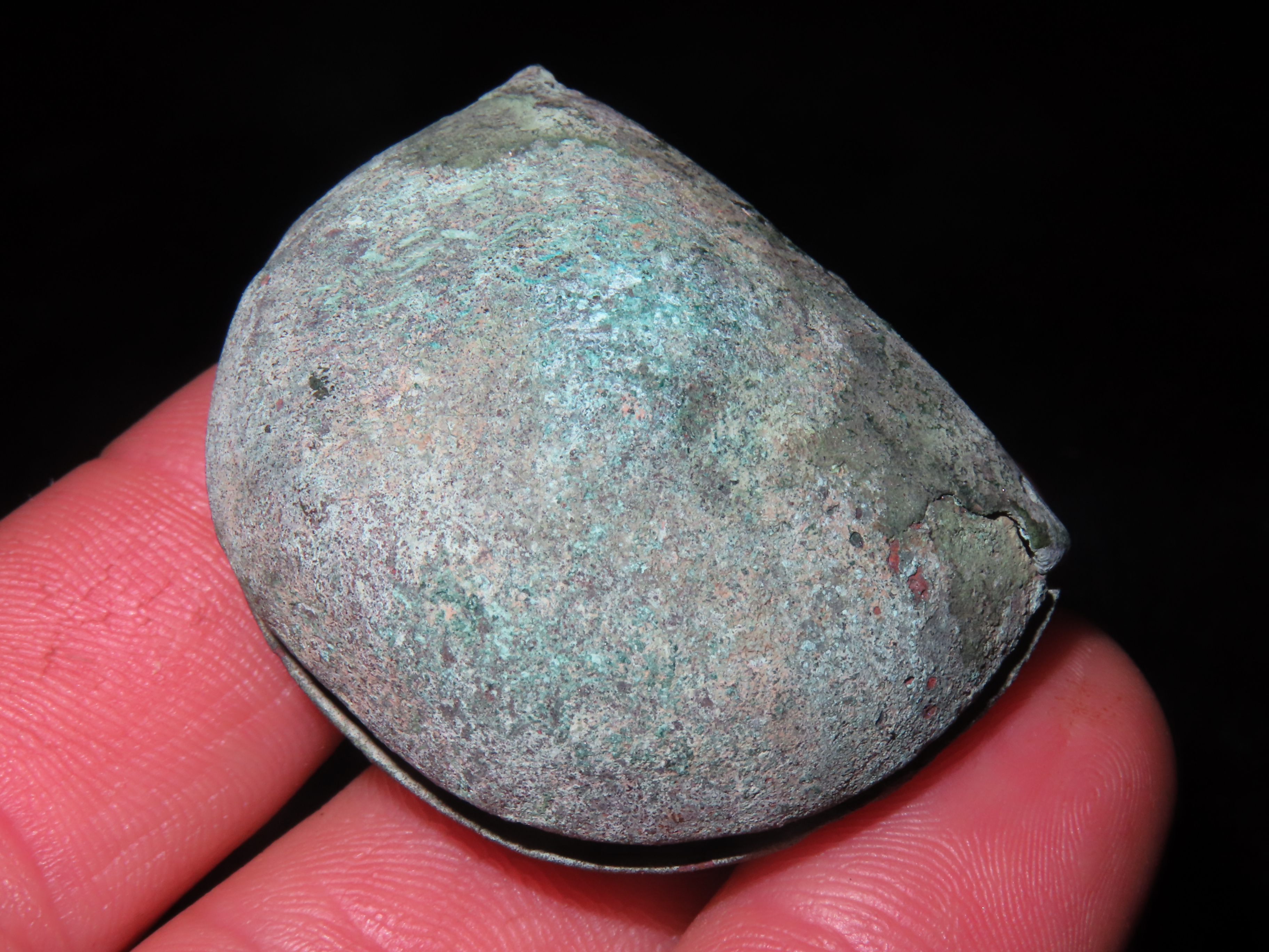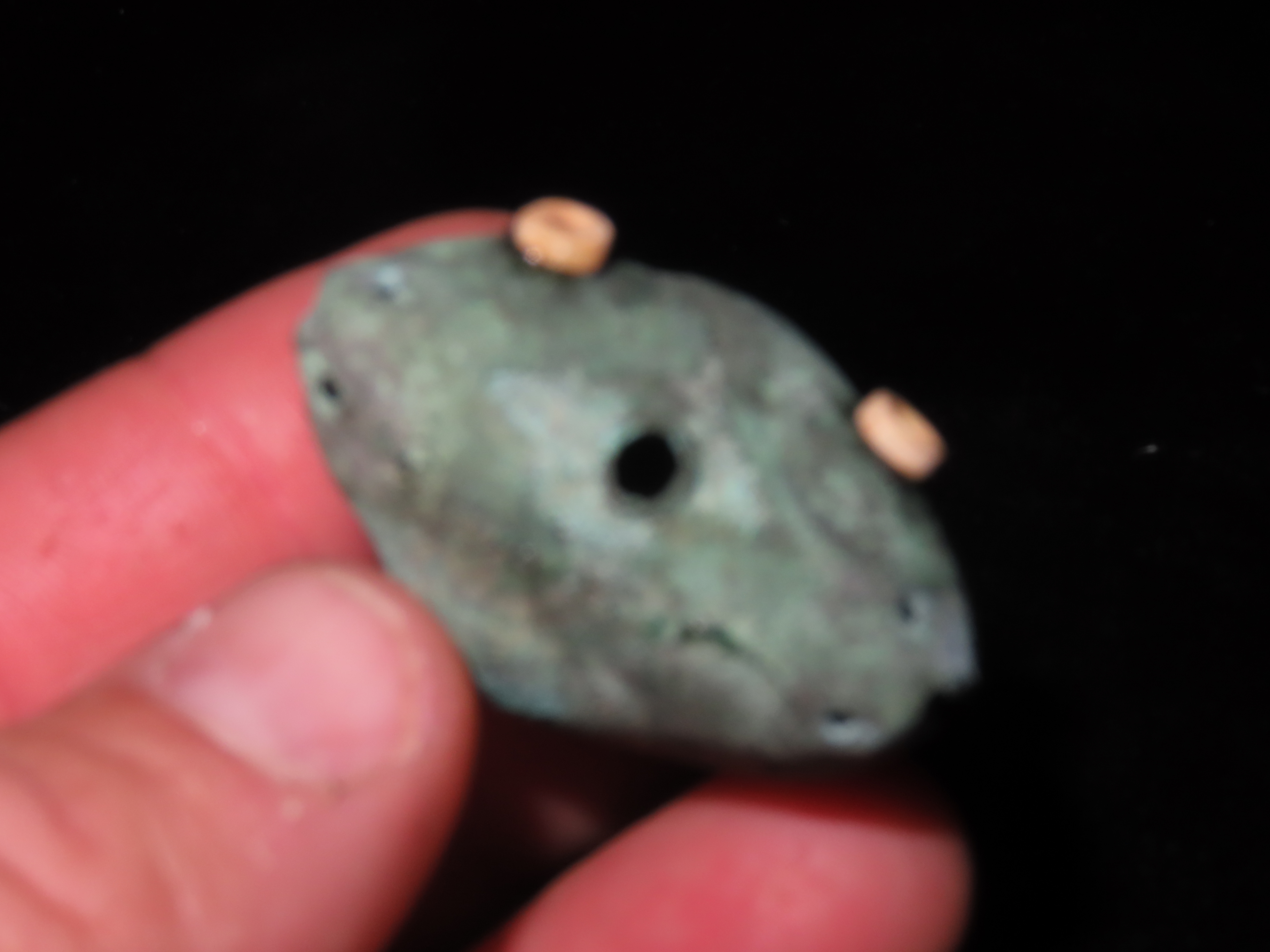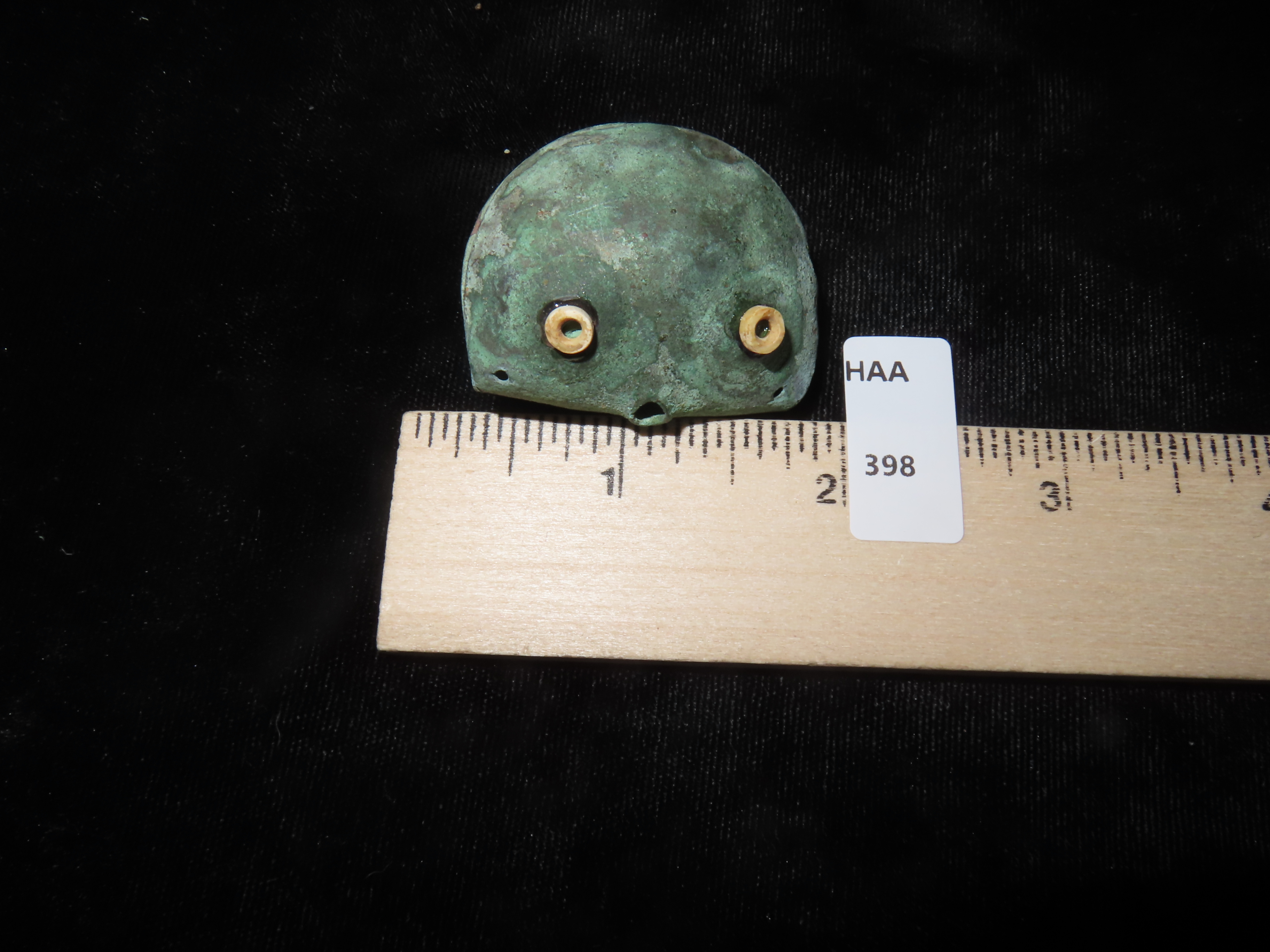 RARE MOCHE COPPER OWL EFFIGY PENDANT / BELL, WITH ORIGINAL RATTLE, HAS RAISED NOSE & RAISED NODES AND SHELL FOR THE EYES