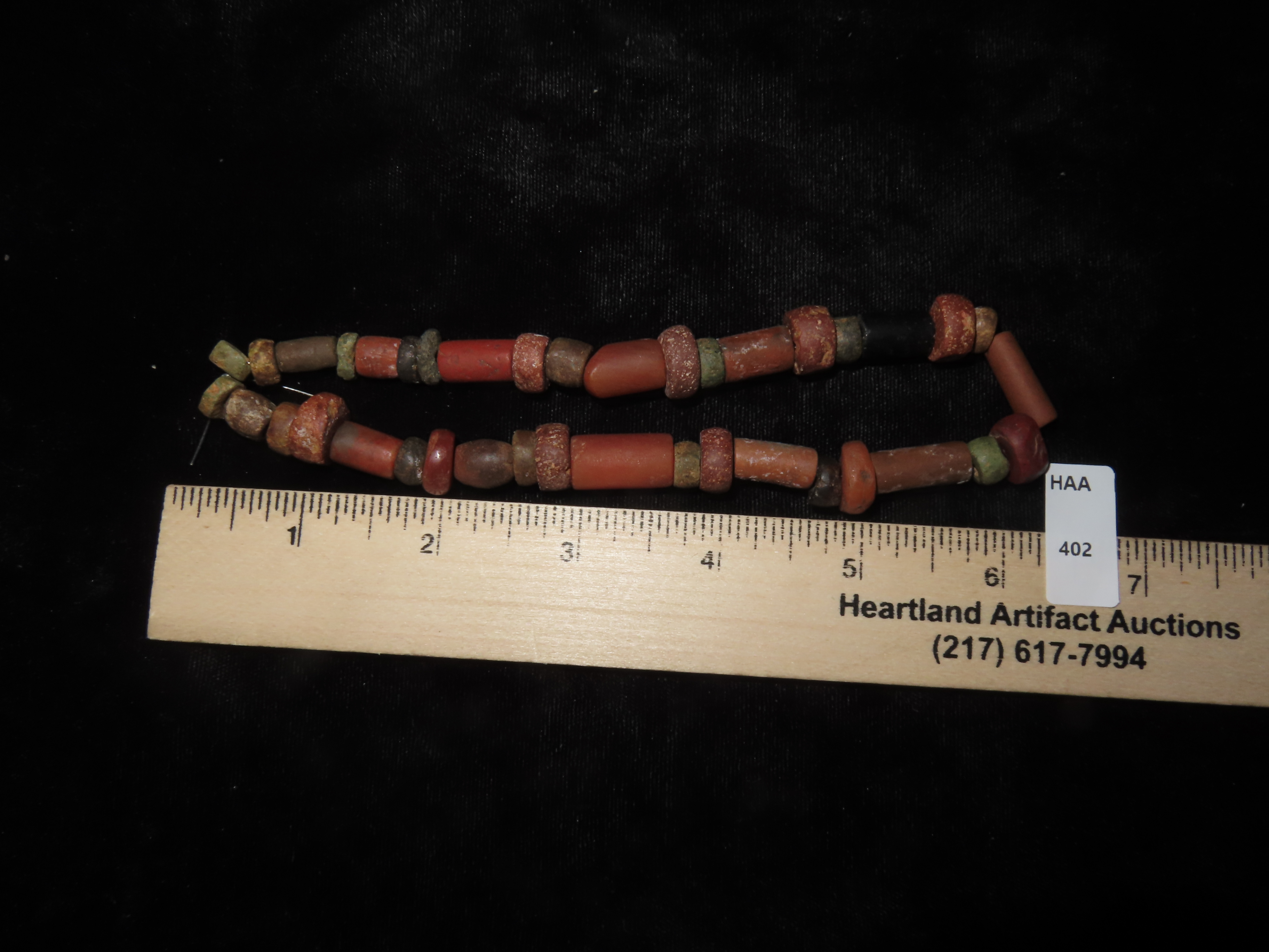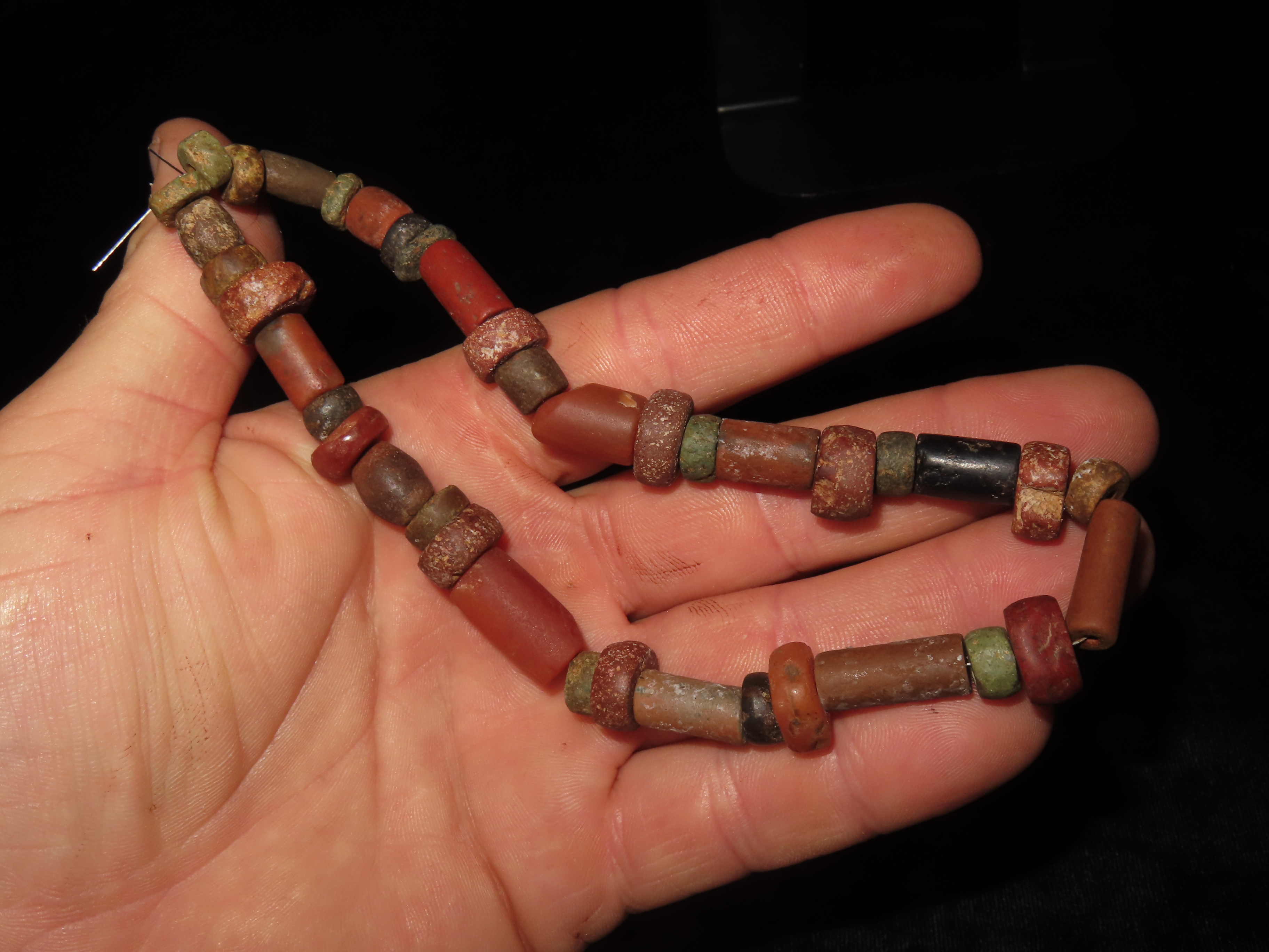 BEAUTIFUL STRAND OF TAIRONA QUARTZ, STONE, & JASPER DRILLED BEADS, GREAT COLORFUL EXAMPLES, WELL POLISHED, PRE-COLUMBIAN FROM MEXICO