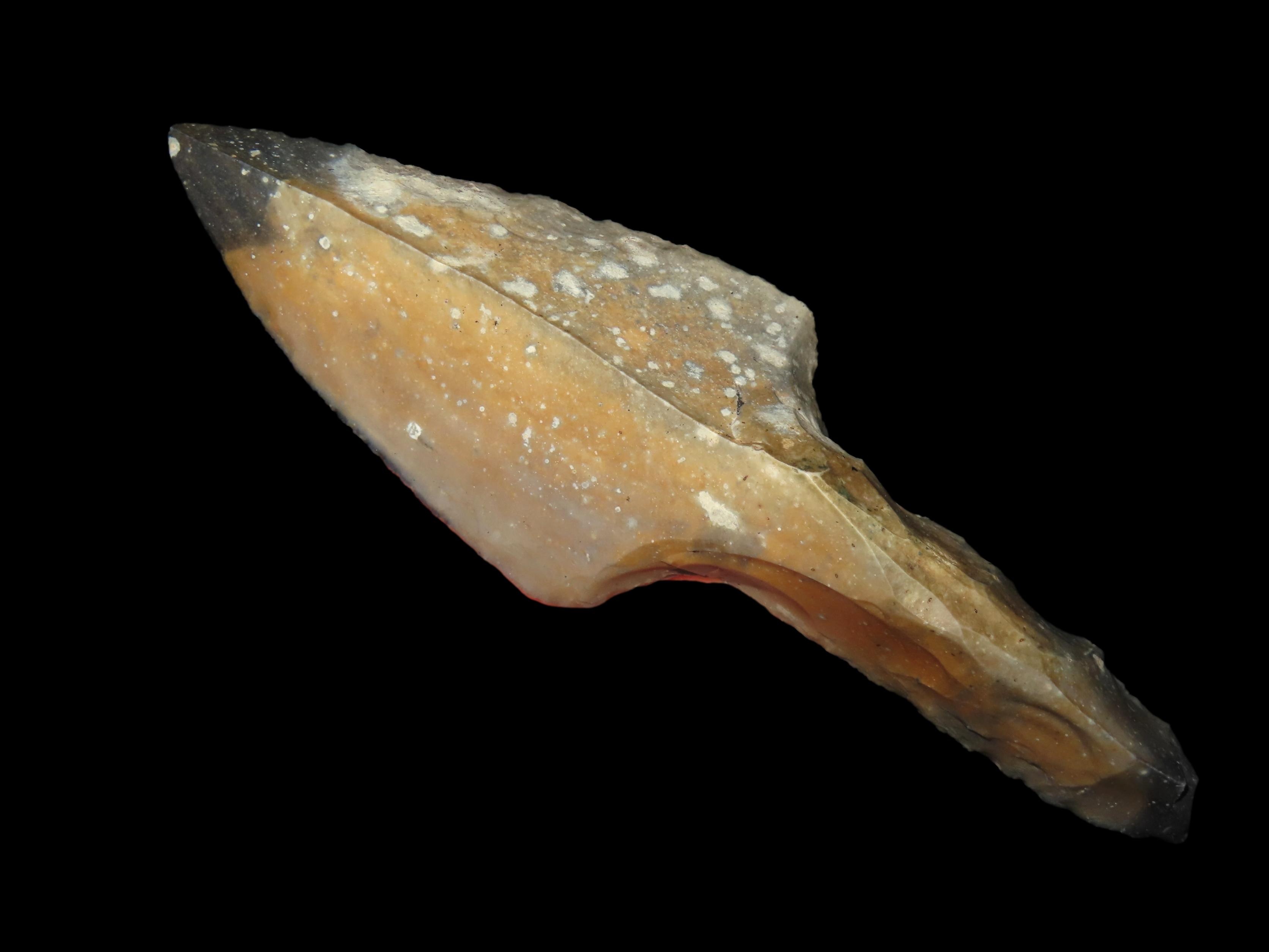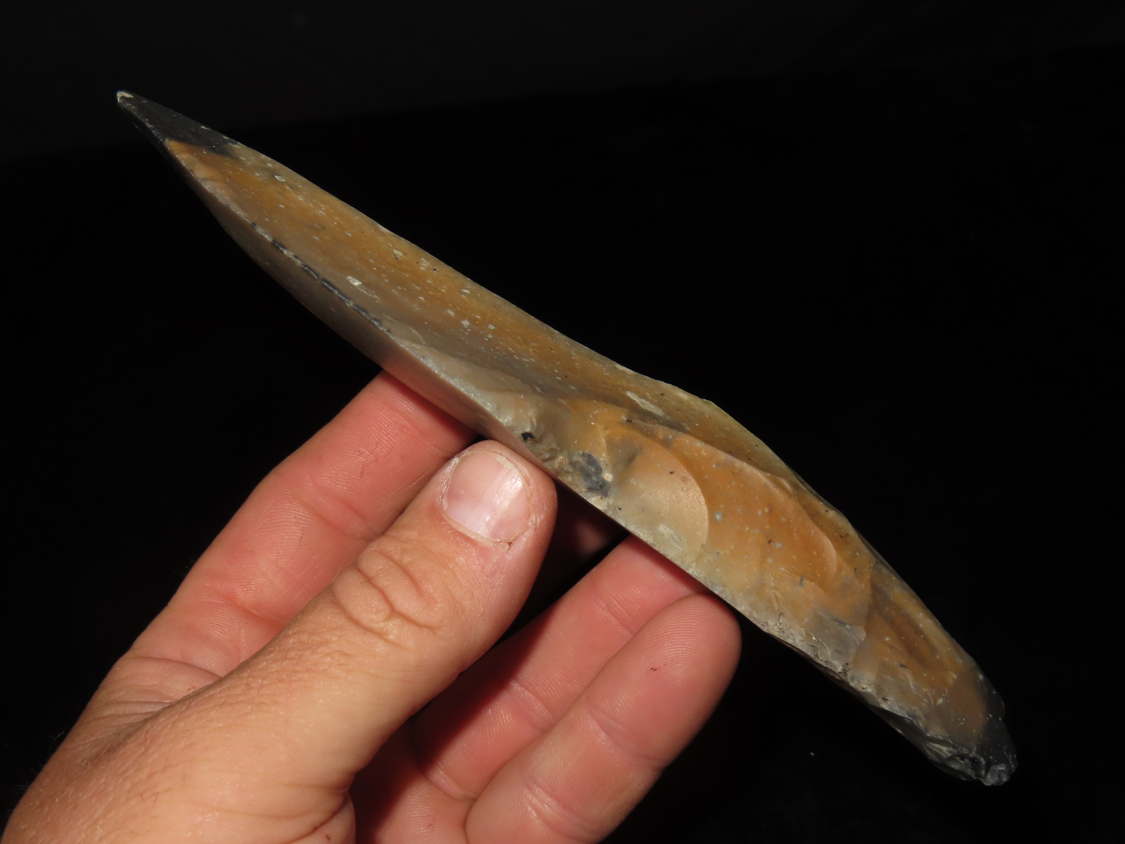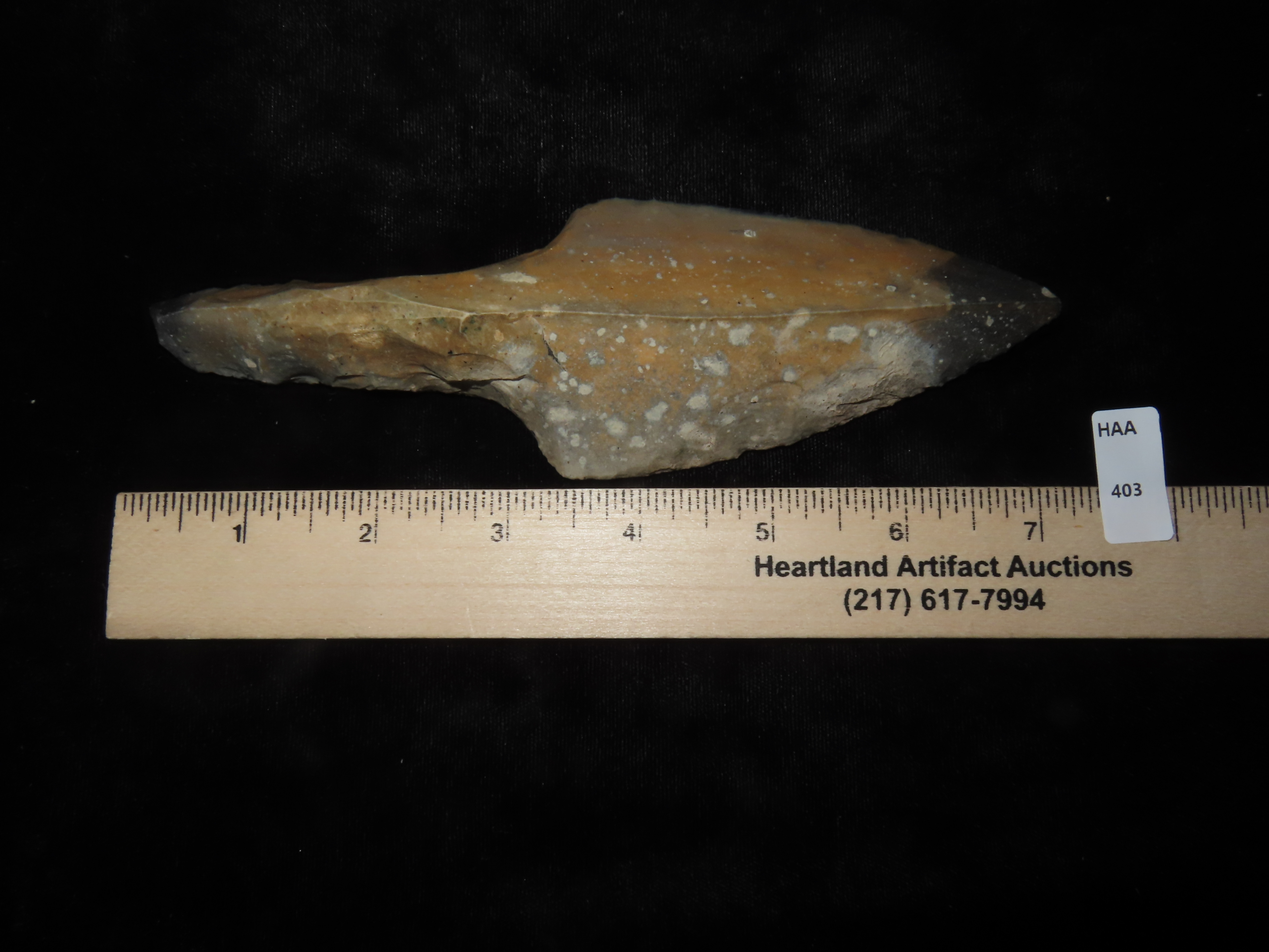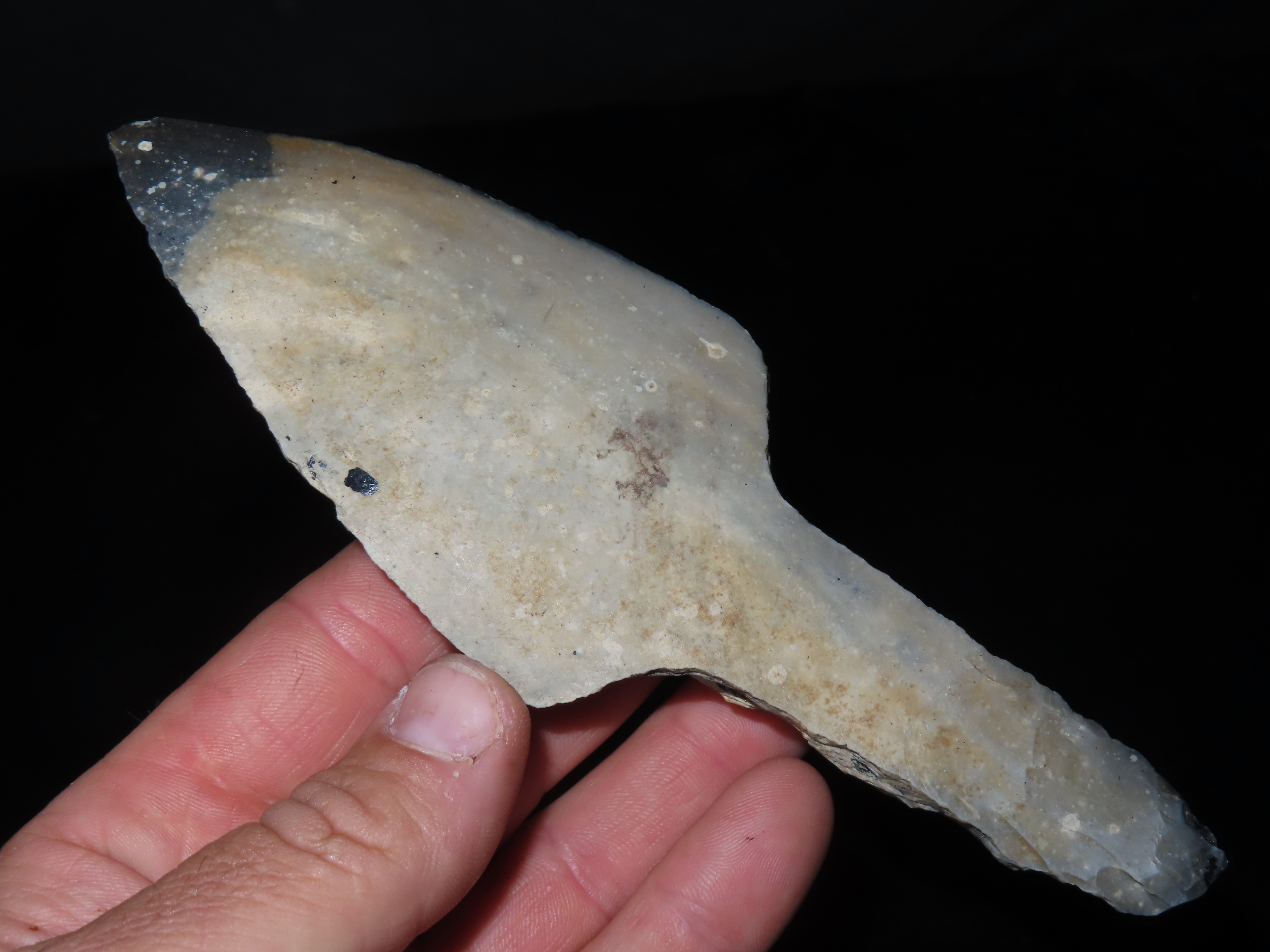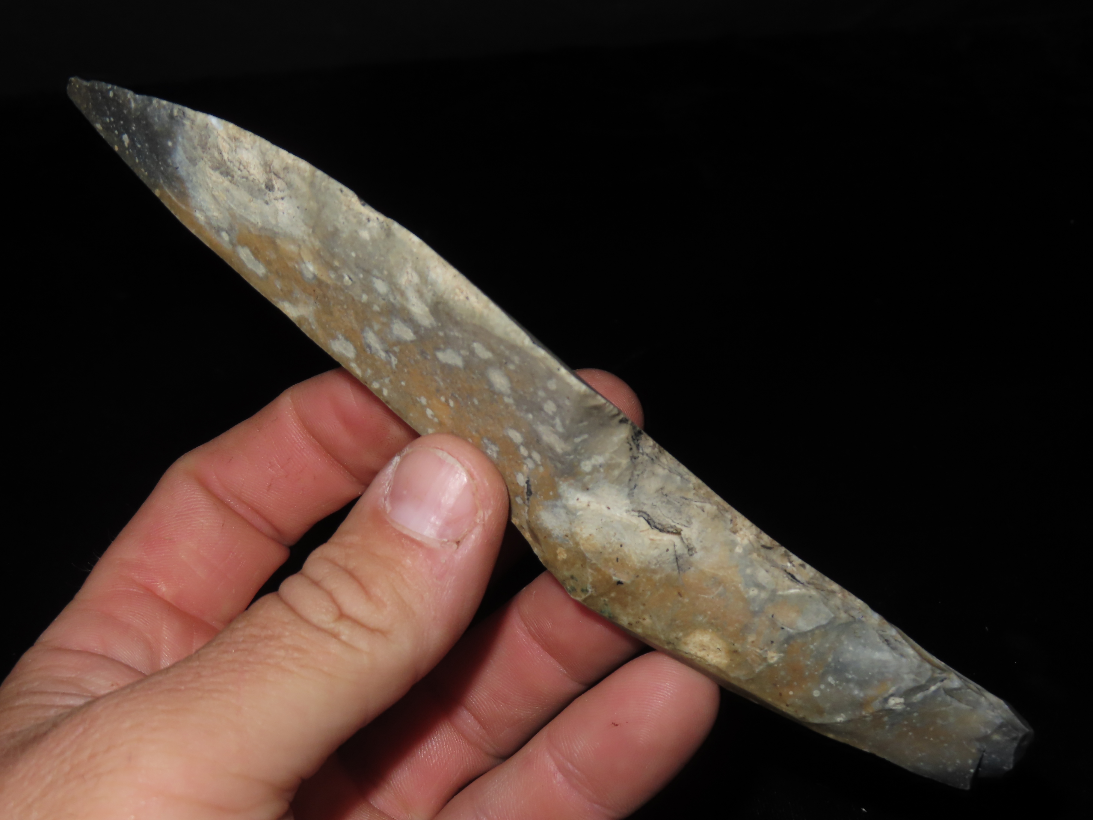 7″ LONG MAYAN FLINT DAGGER, MOTLEY COA, PRE-COLUMBIAN, BELIEZE, MADE FROM BEAUTIFUL BANDED COLHA CHERT, WELL MADE EXAMPLE