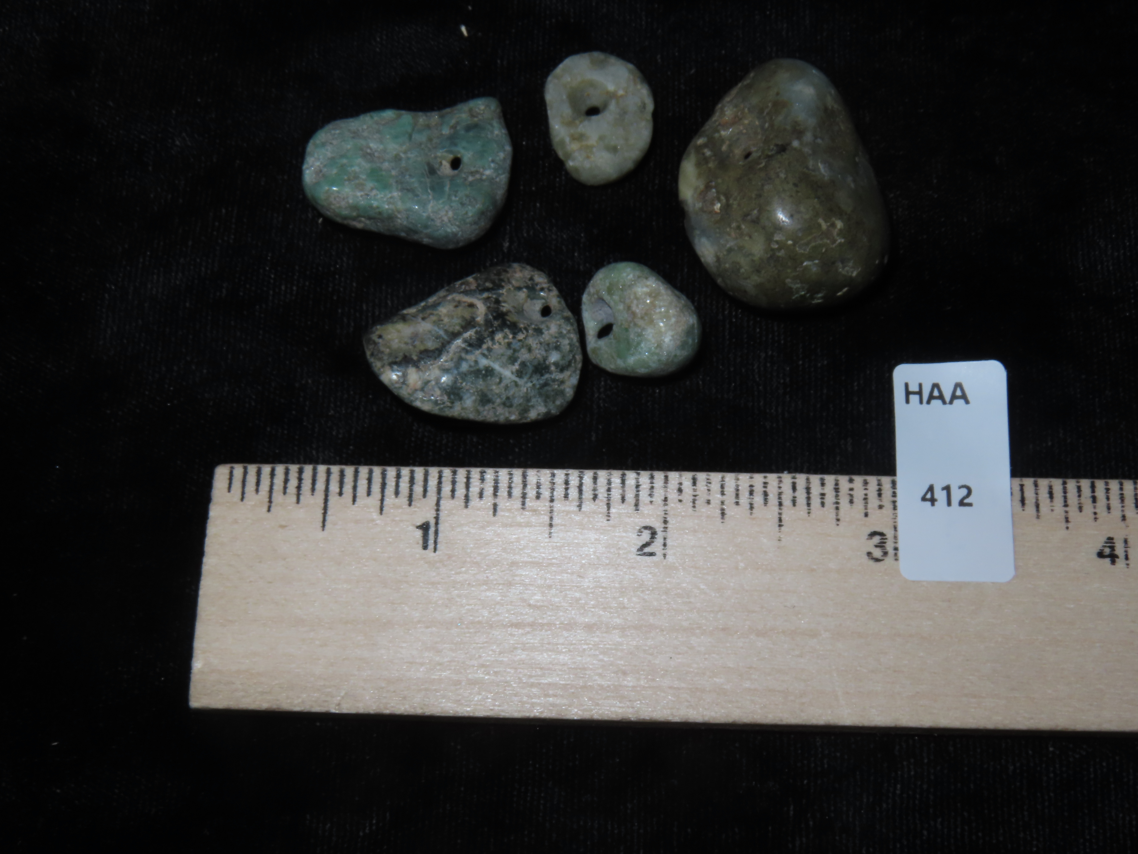 LOT OF 5 MEZCALA JADEITE BEADS FROM MEXICO, PRE-COLUMBIAN DRILLED STONE PENDANT, EX DR HARNER COLLECTION