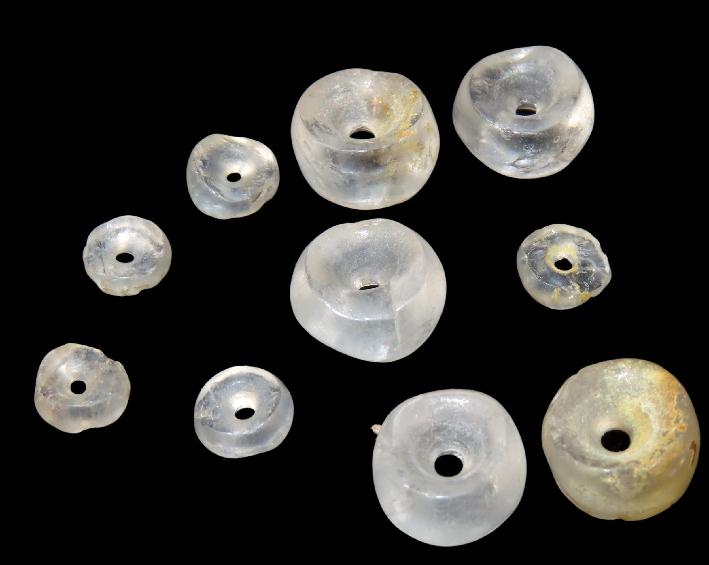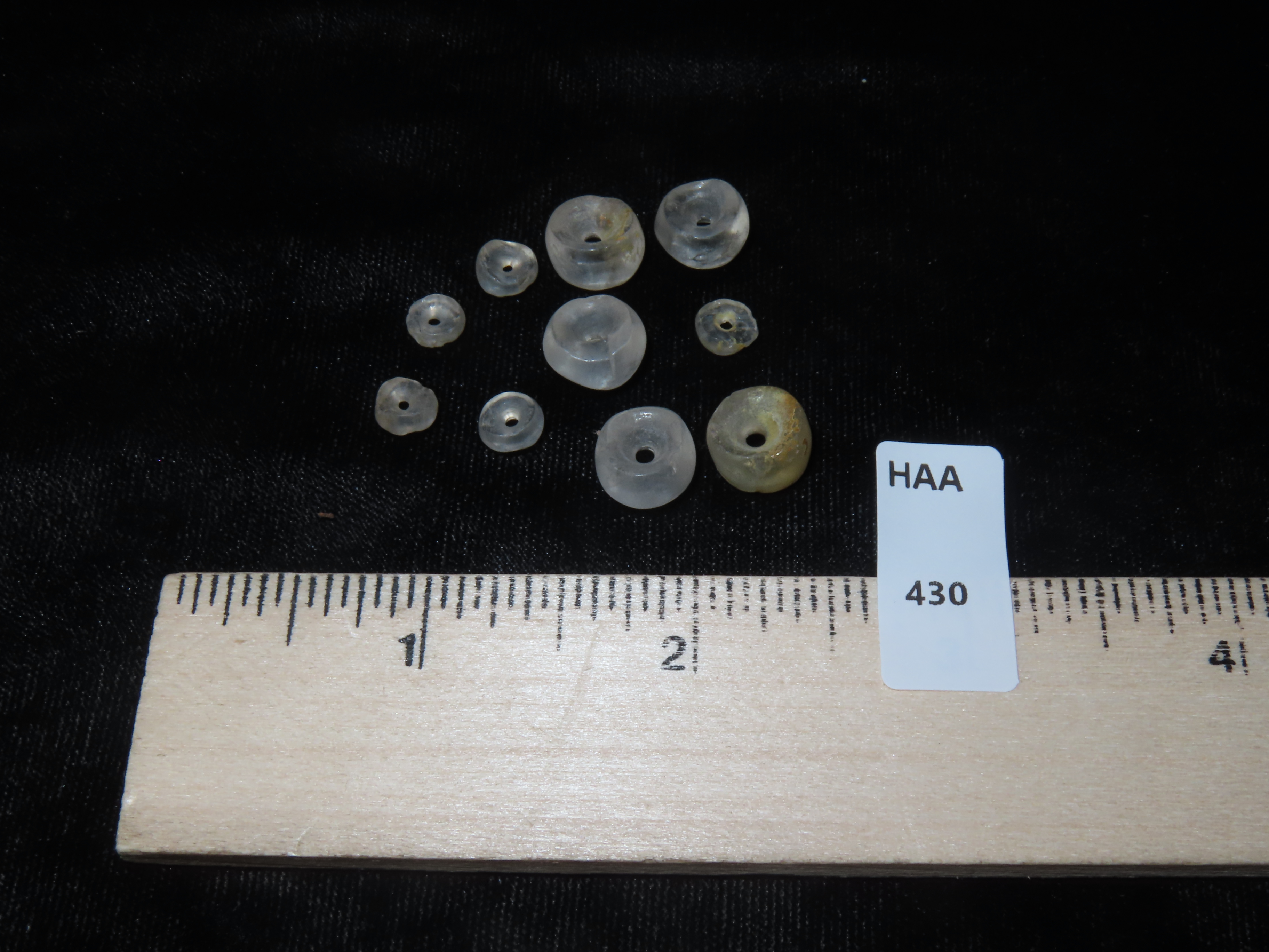 LOT OF 10 CLEAR CRYSTAL QUARTZ DRILLED BEADS FROM MEXIXO, IMAGINE THE TIME & PATIENCE TO MAKE THESE IN PRIMITIVE TIMES, EACH BEAD TOOK HOURS
