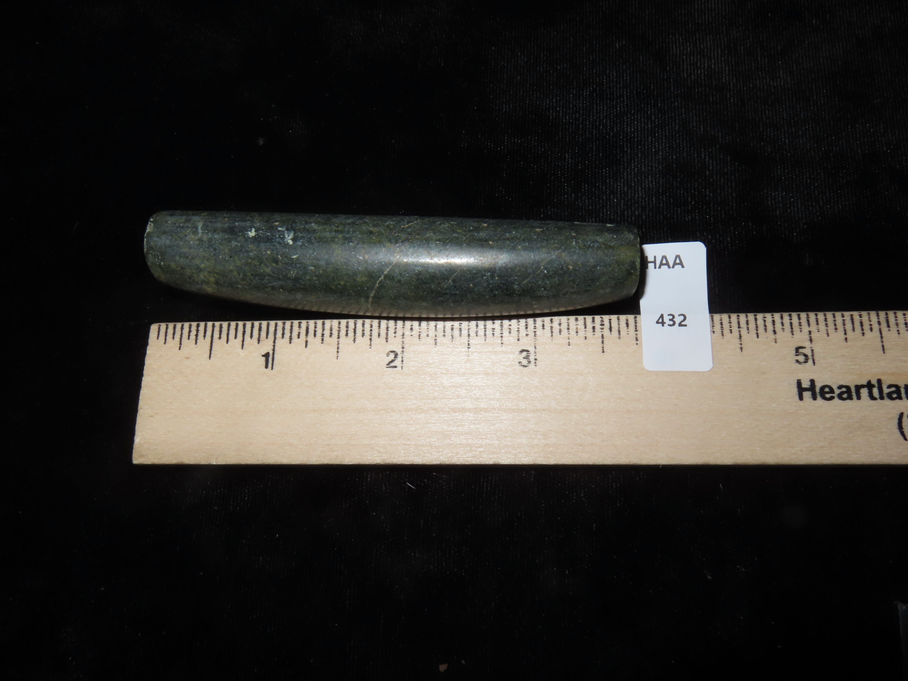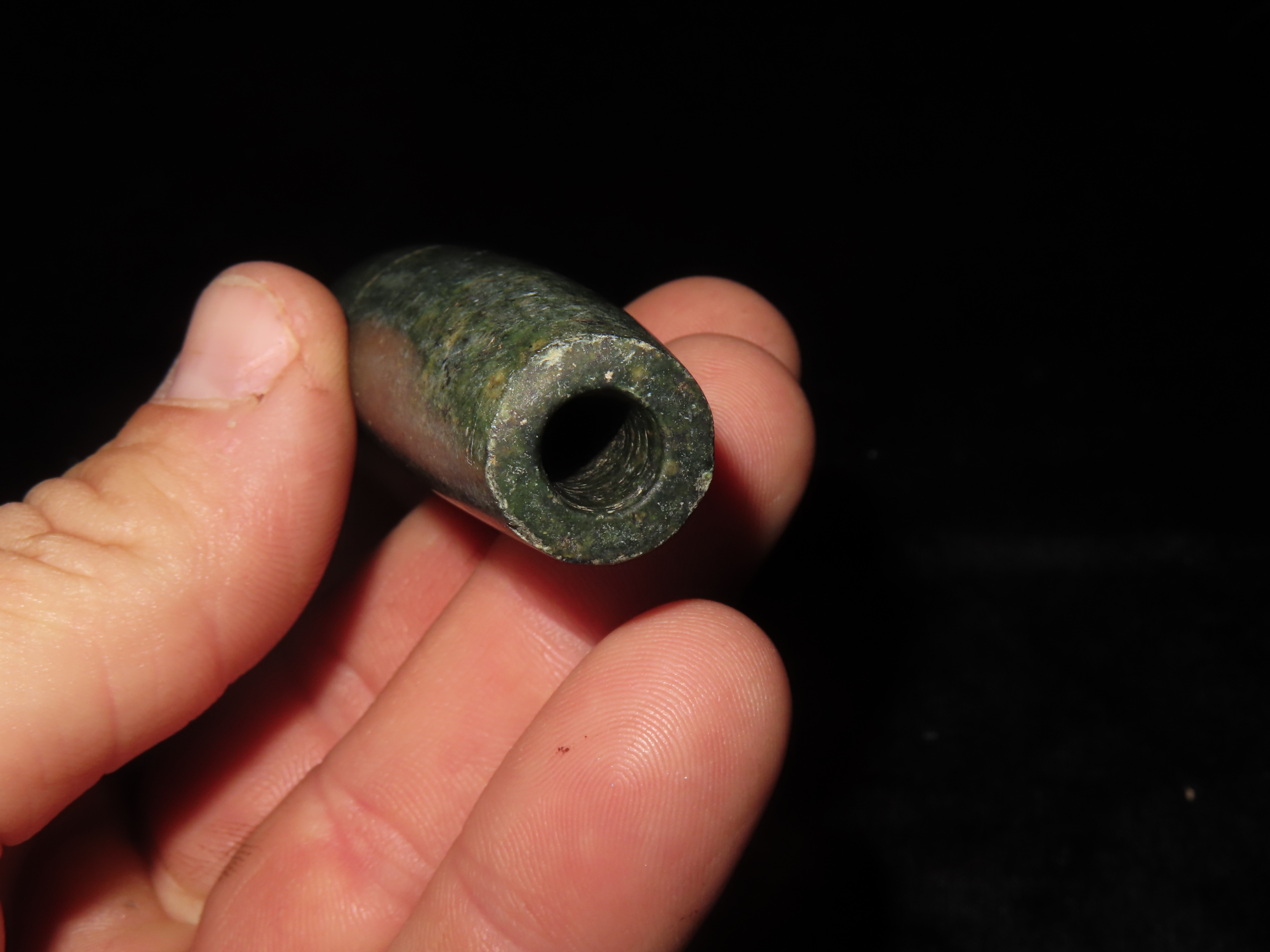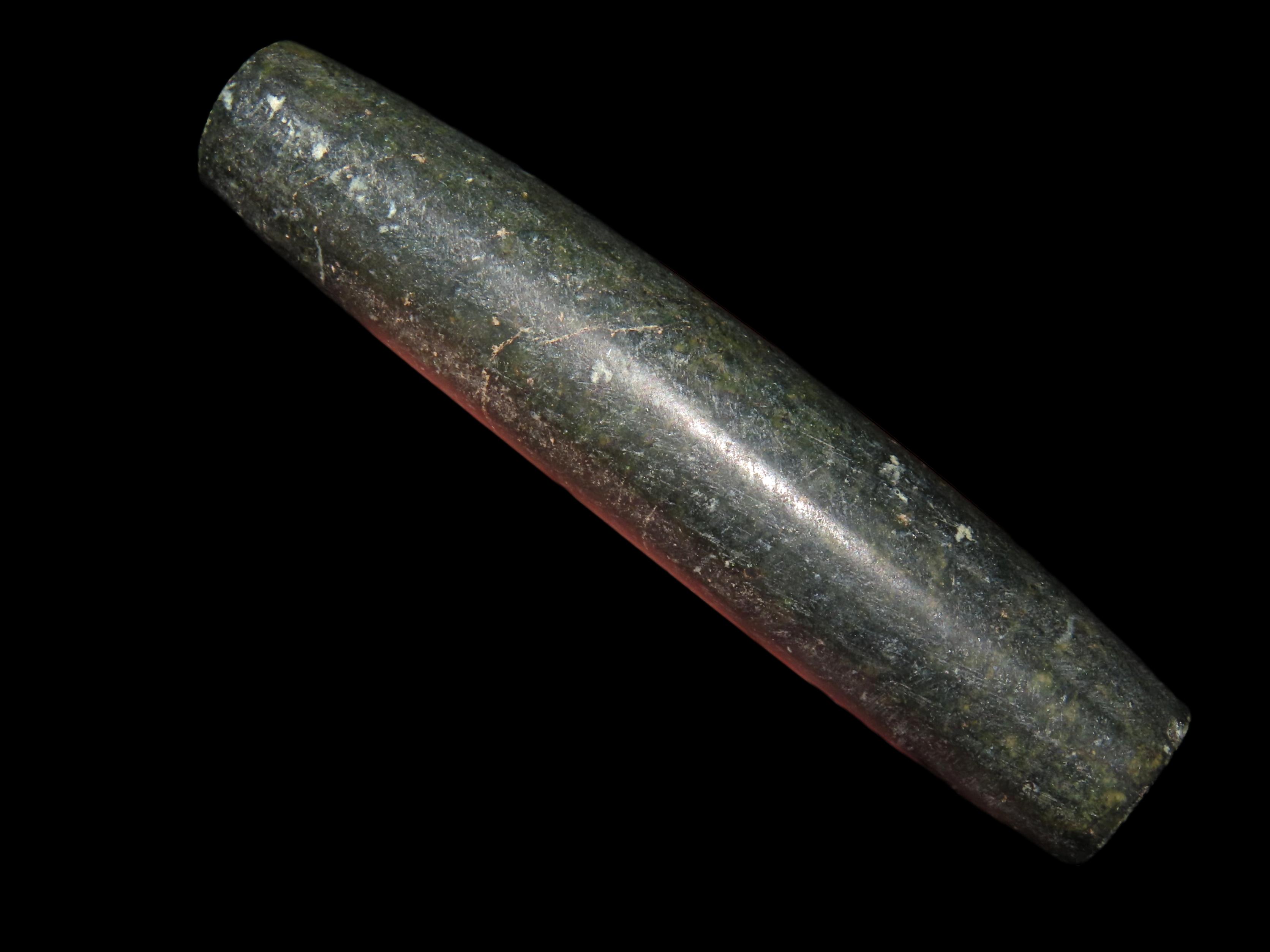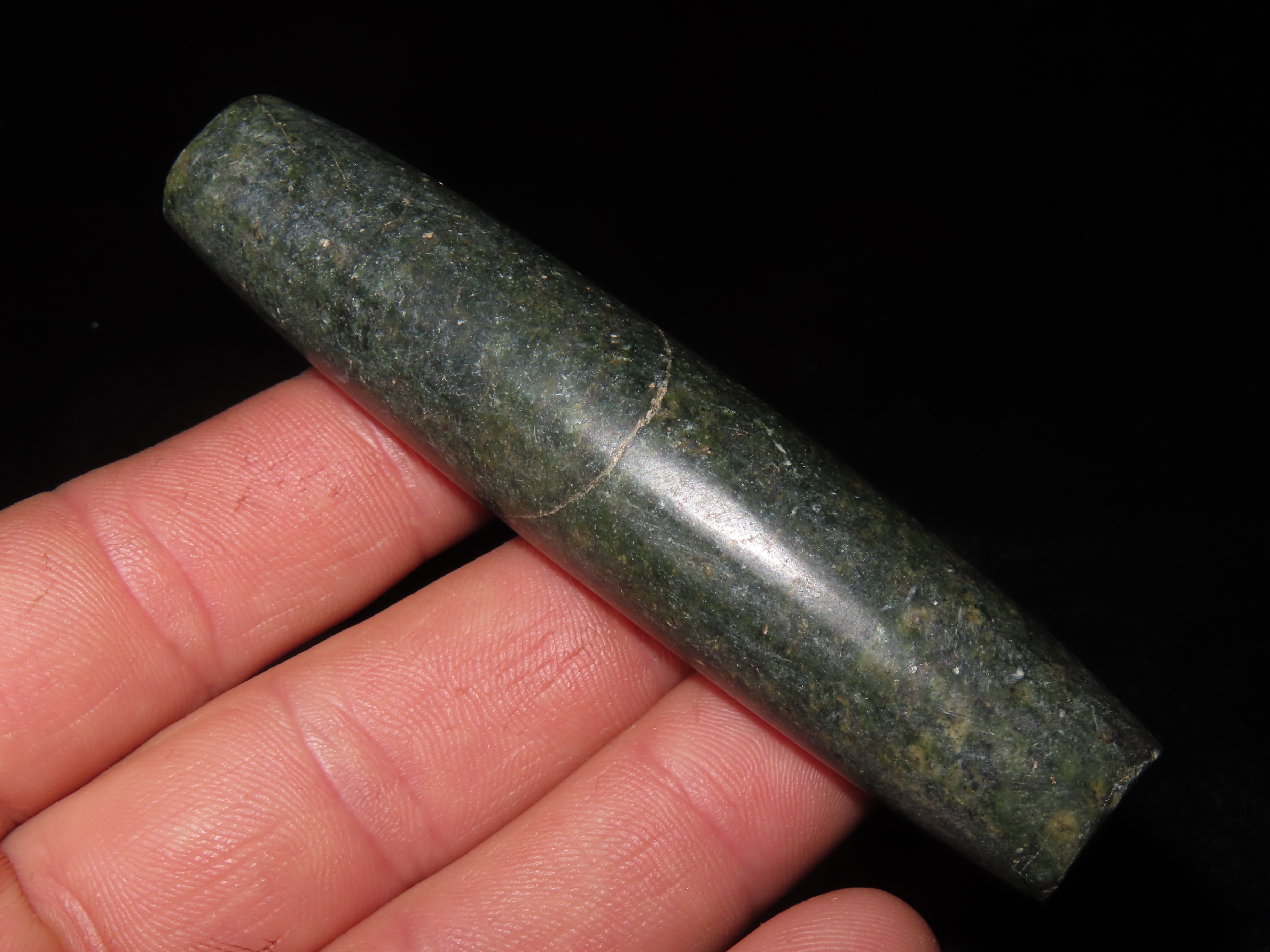 HUGE 3 5/8″ MAYAN JADEITE TUBE BEAD, GUTEMALA, INCREDIBLE POLISH, NICE LARGE PRE-COLUMBIAN DRILLED STONE PENDANT