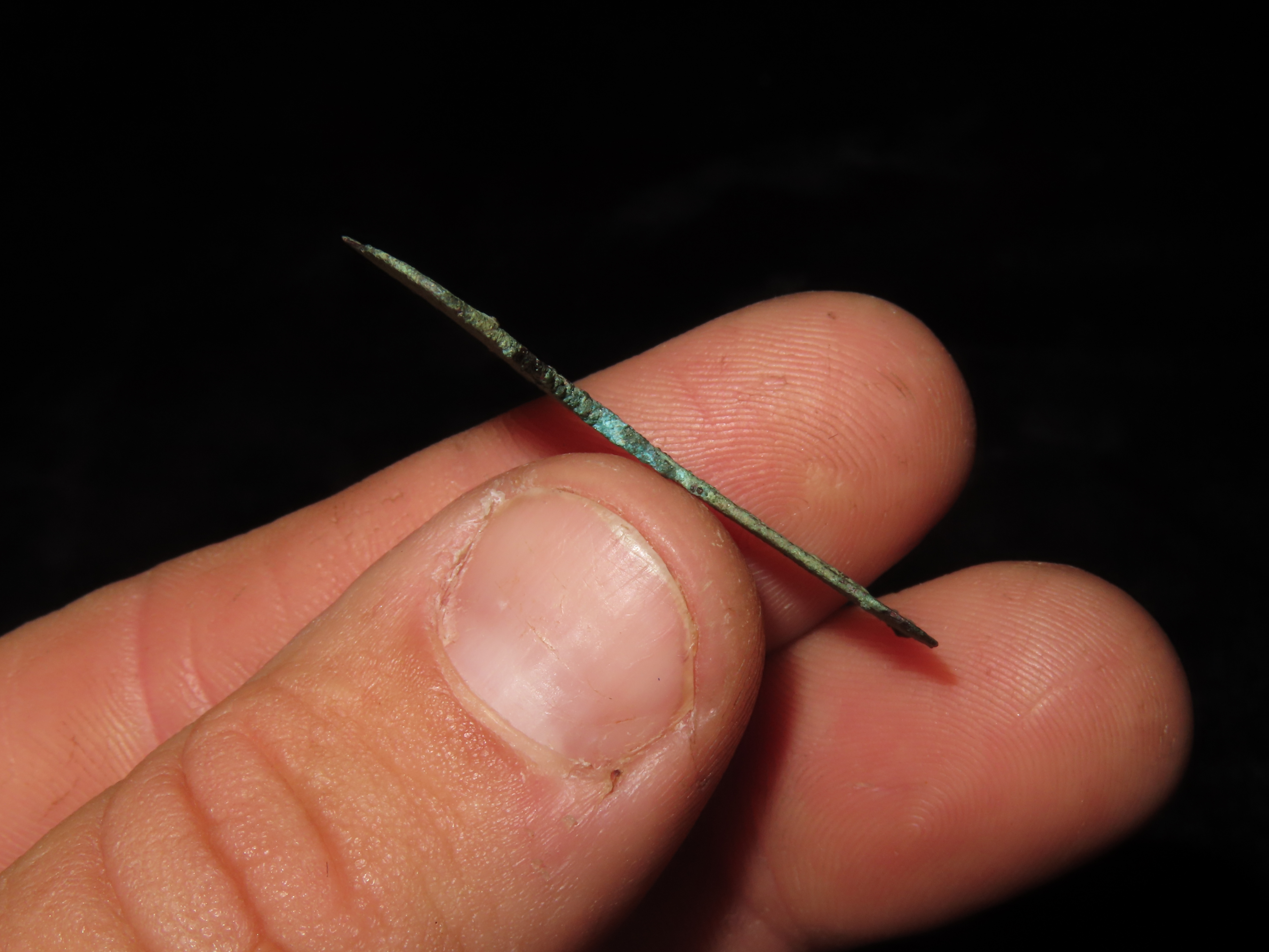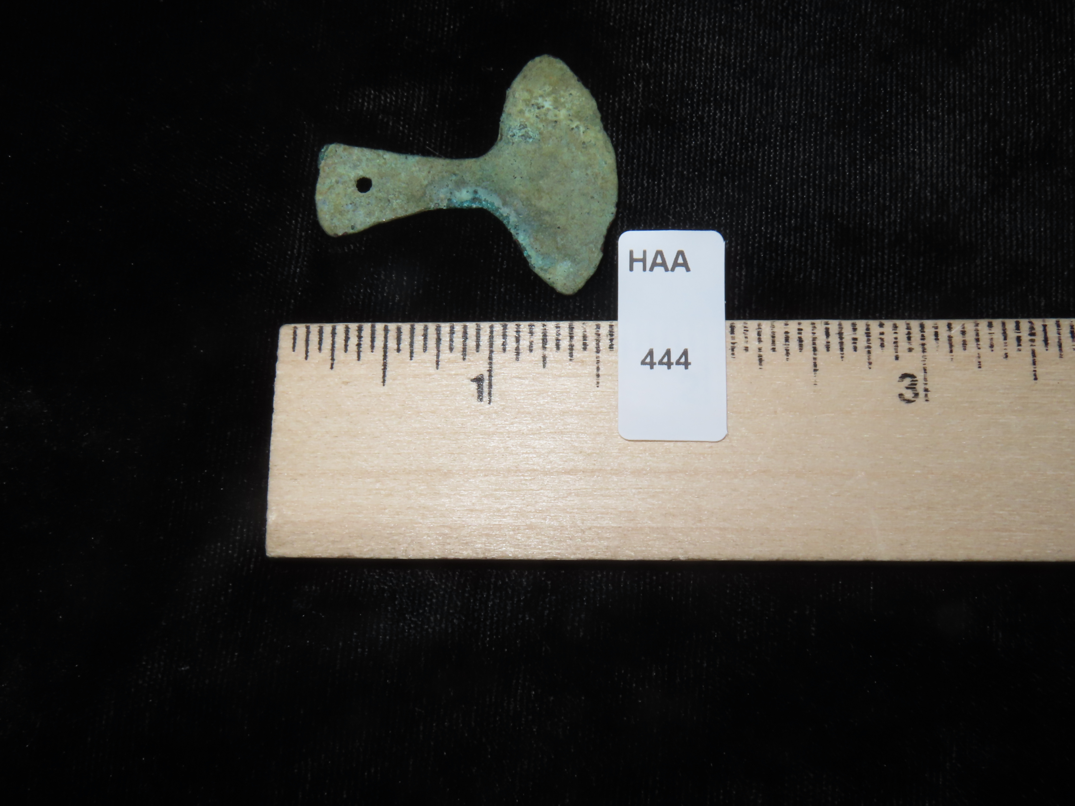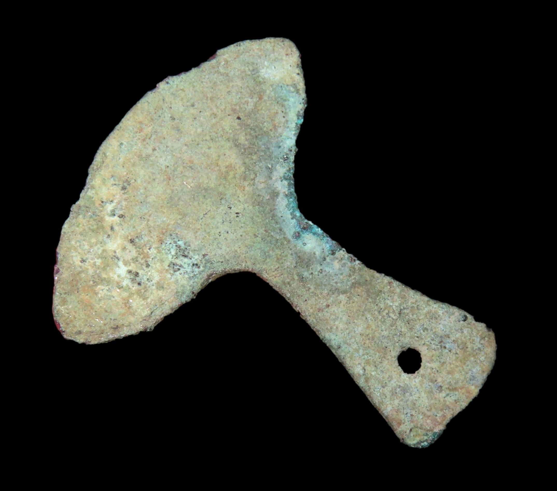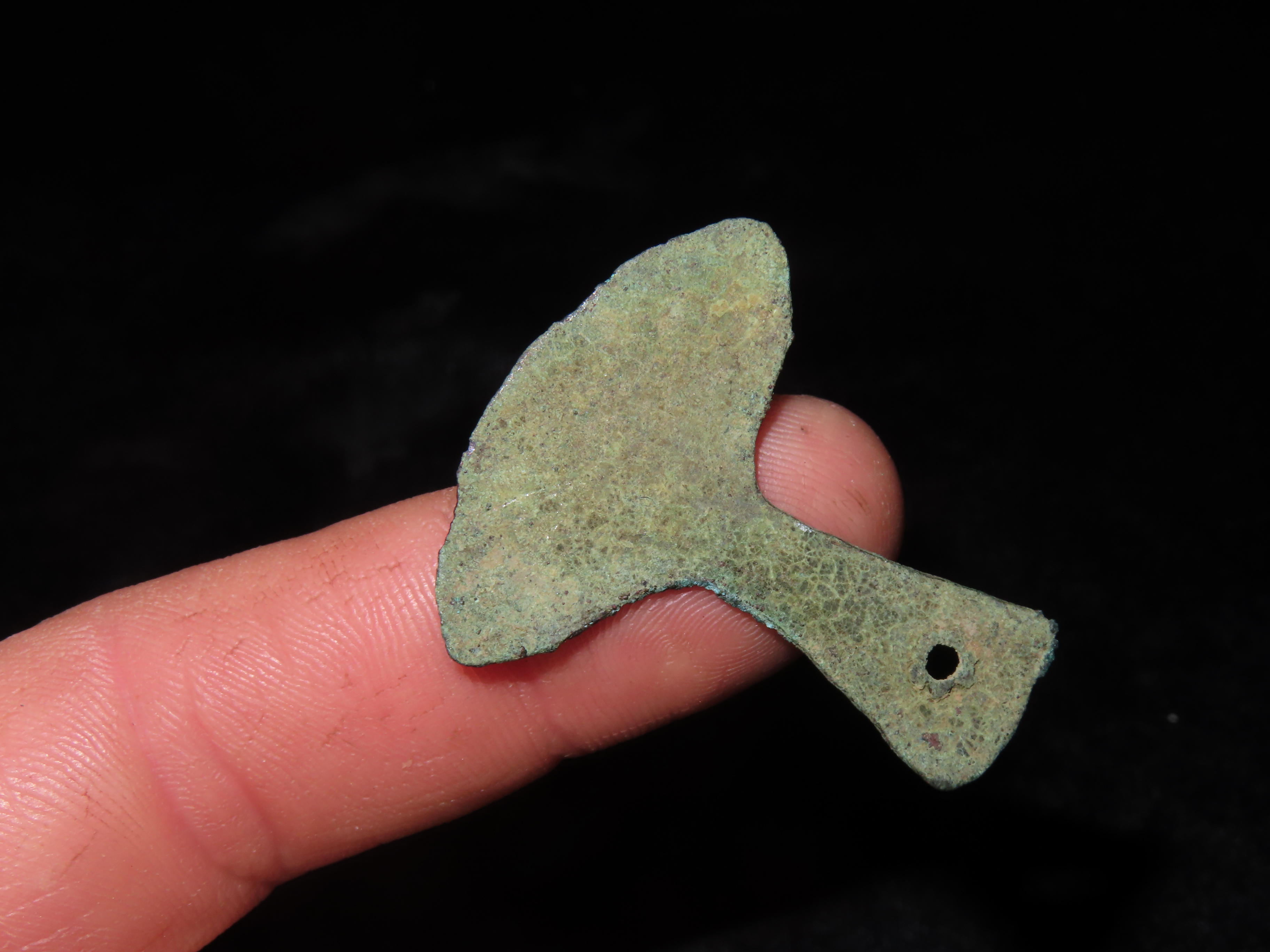 NICE PRECOLUMBIAN COPPER MACE EFFIGY PENDANT, MONOLITHIC AXE, SPUD, SPATULATE, FOUND IN MEXICO, WELL SHAPED AND NICELY PATINATED