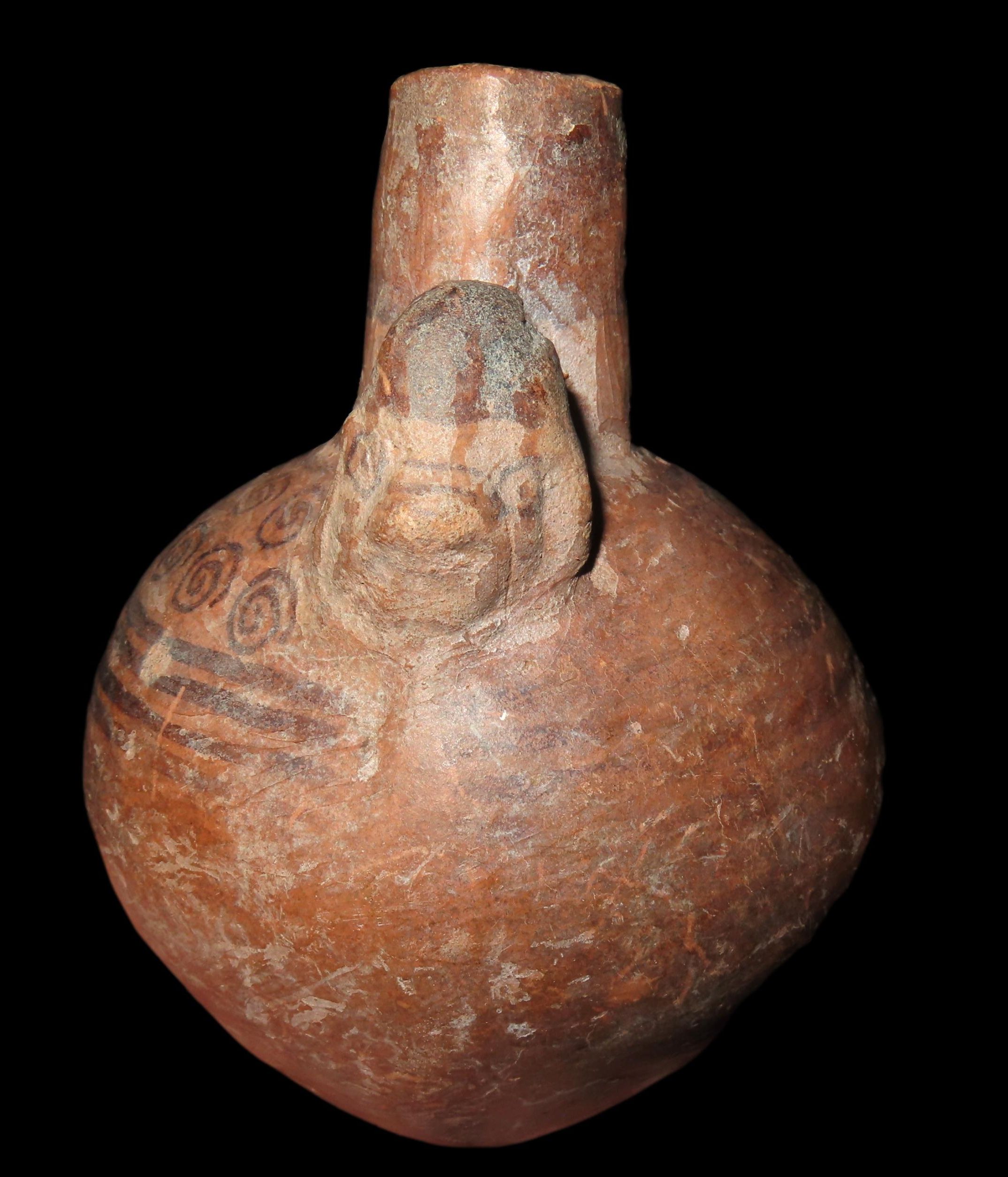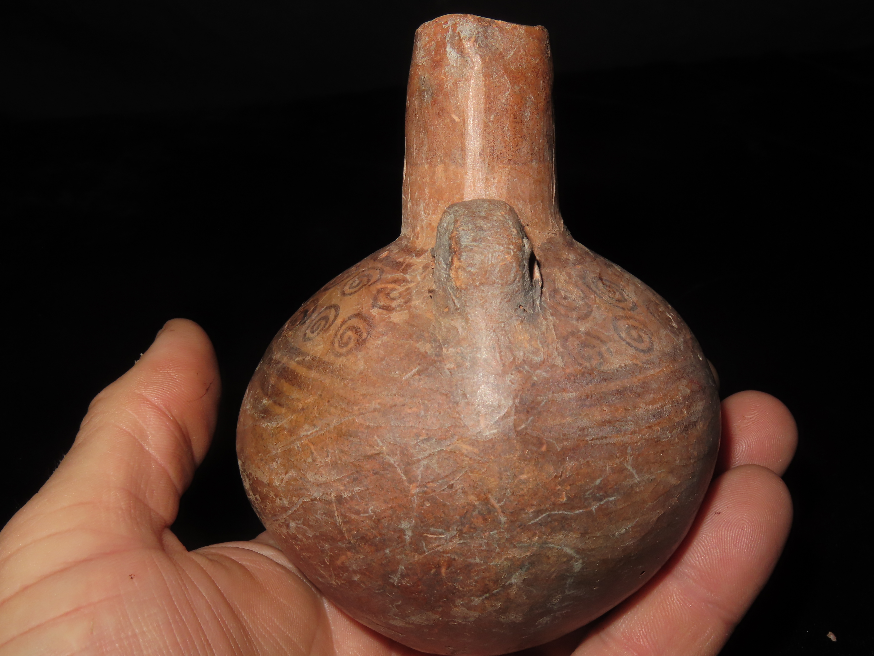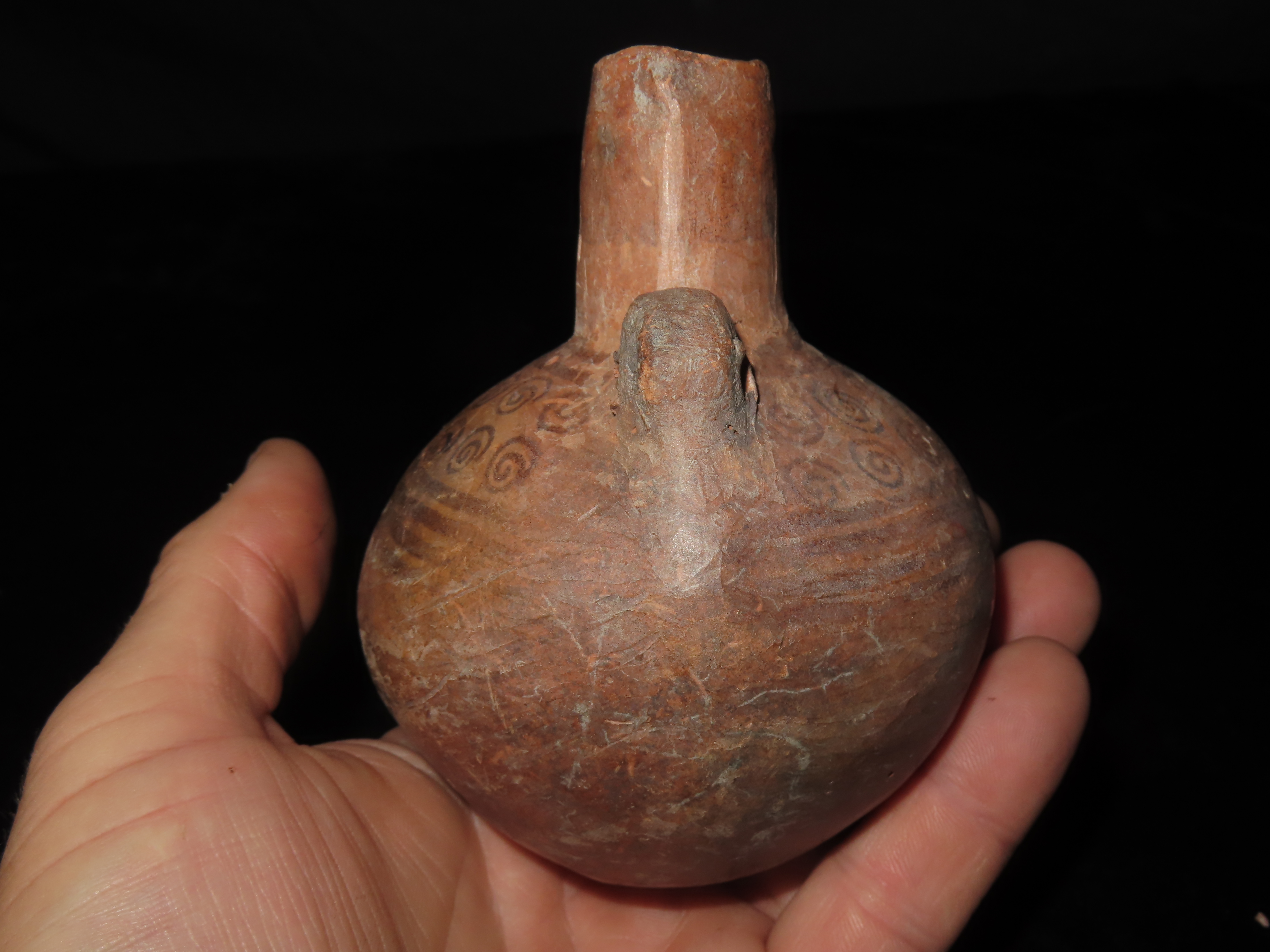 NEGATIVE PAINTED HUMAN EFFIGY WATER BOTTLE FROM MEXICO, GREAT PRE-COLUMBIAN ARTIFACT, ALL ORIGINAL, NO DAMAGE OR REPAIR, 4 1/4″ TALL