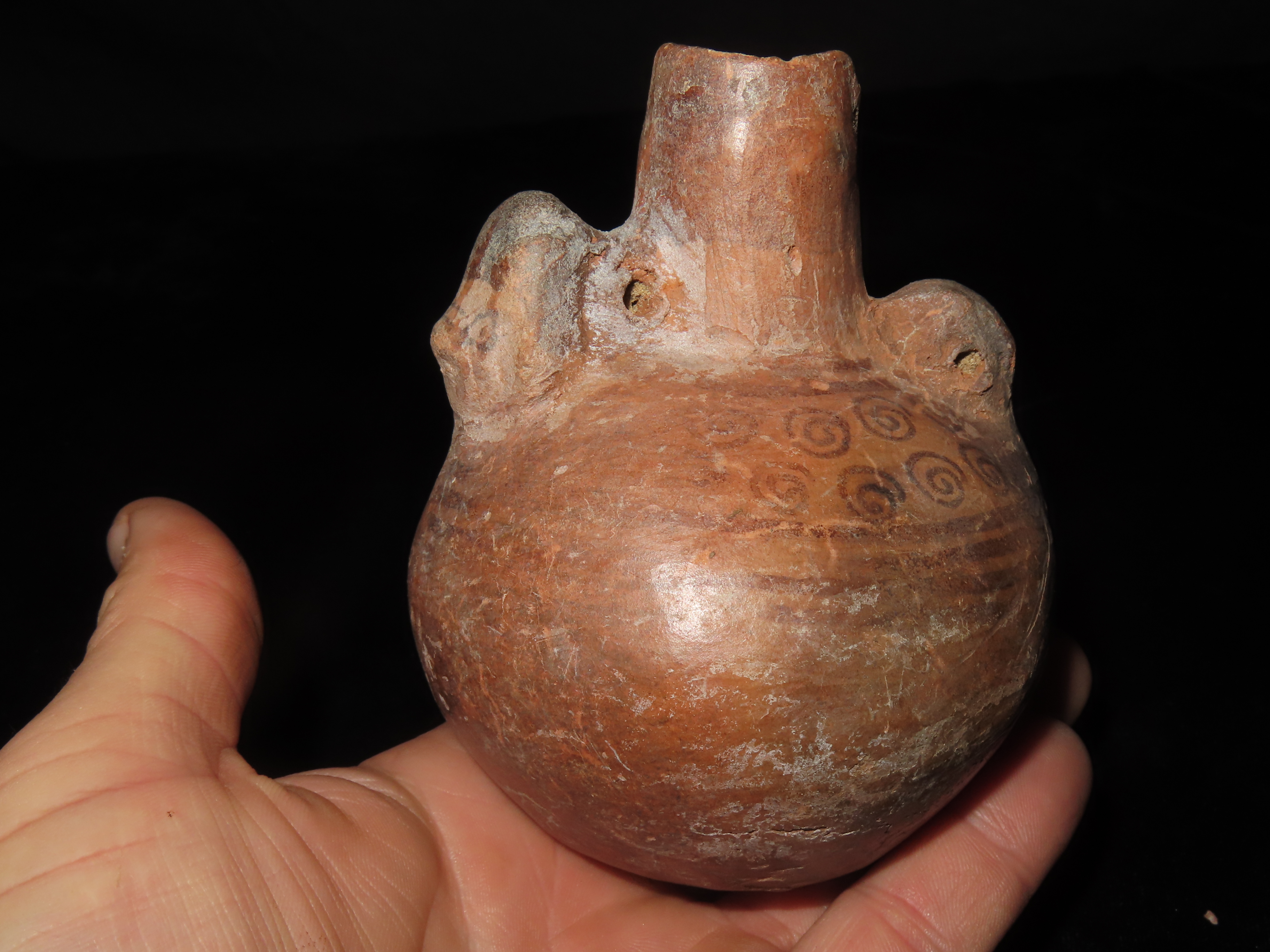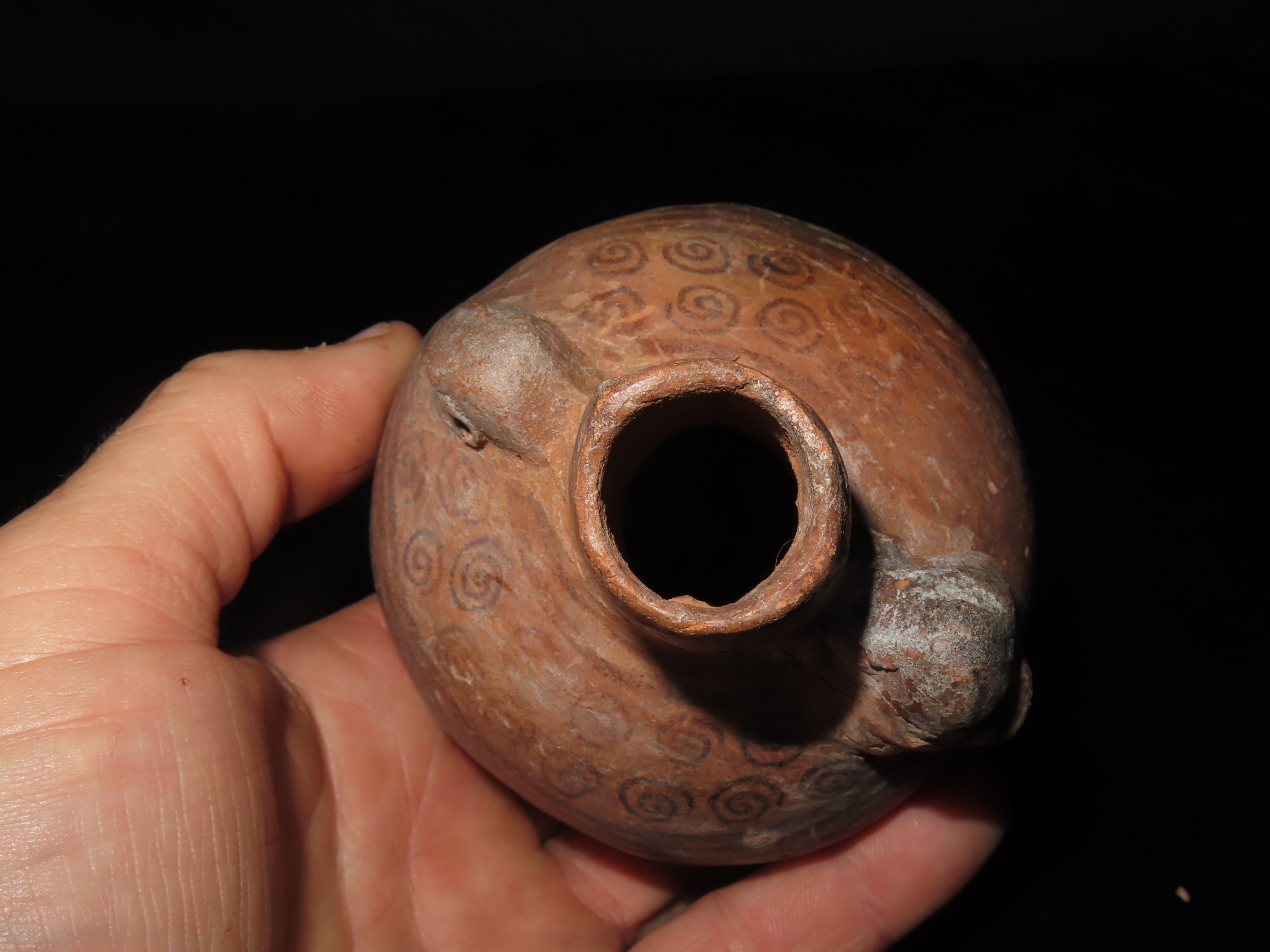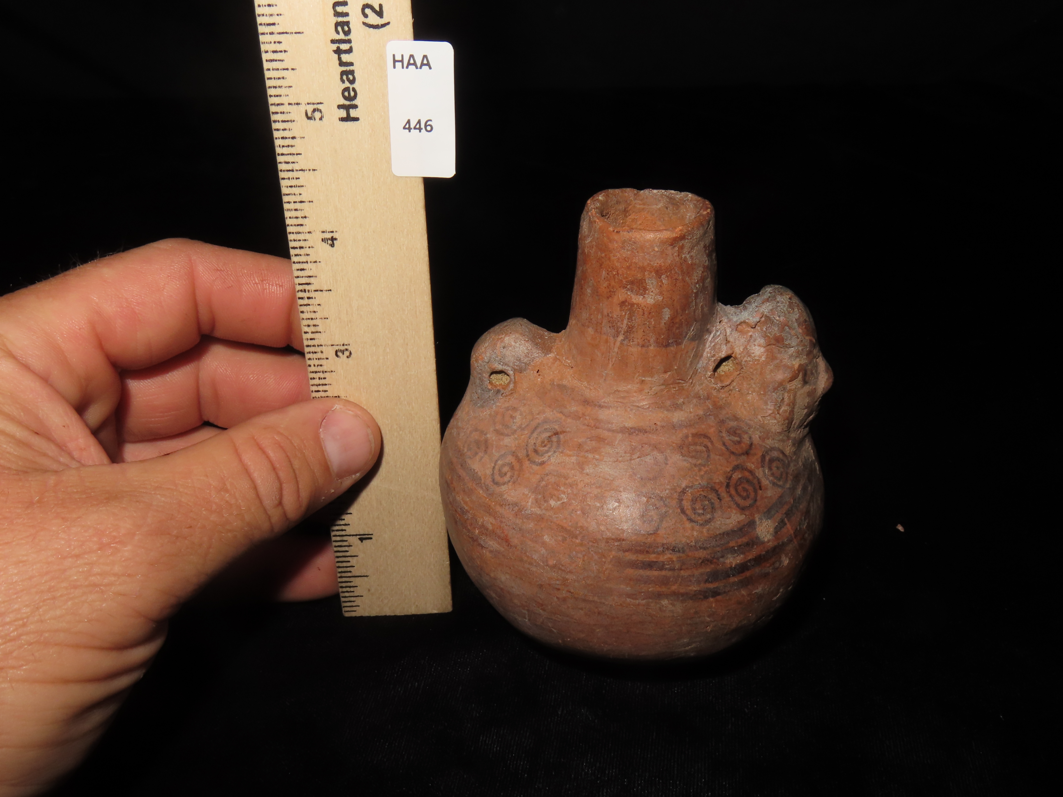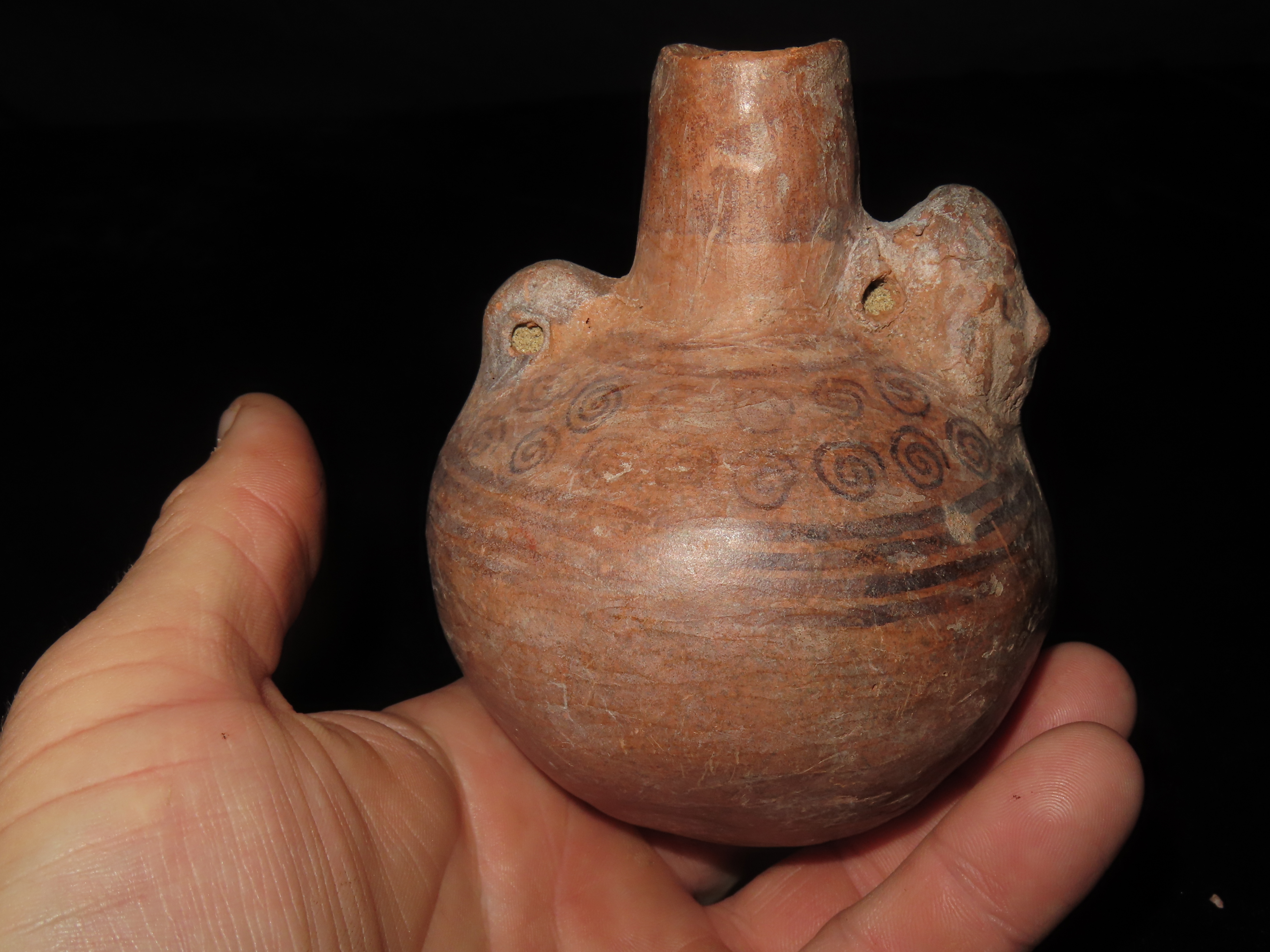 NEGATIVE PAINTED HUMAN EFFIGY WATER BOTTLE FROM MEXICO, GREAT PRE-COLUMBIAN ARTIFACT, ALL ORIGINAL, NO DAMAGE OR REPAIR, 4 1/4″ TALL