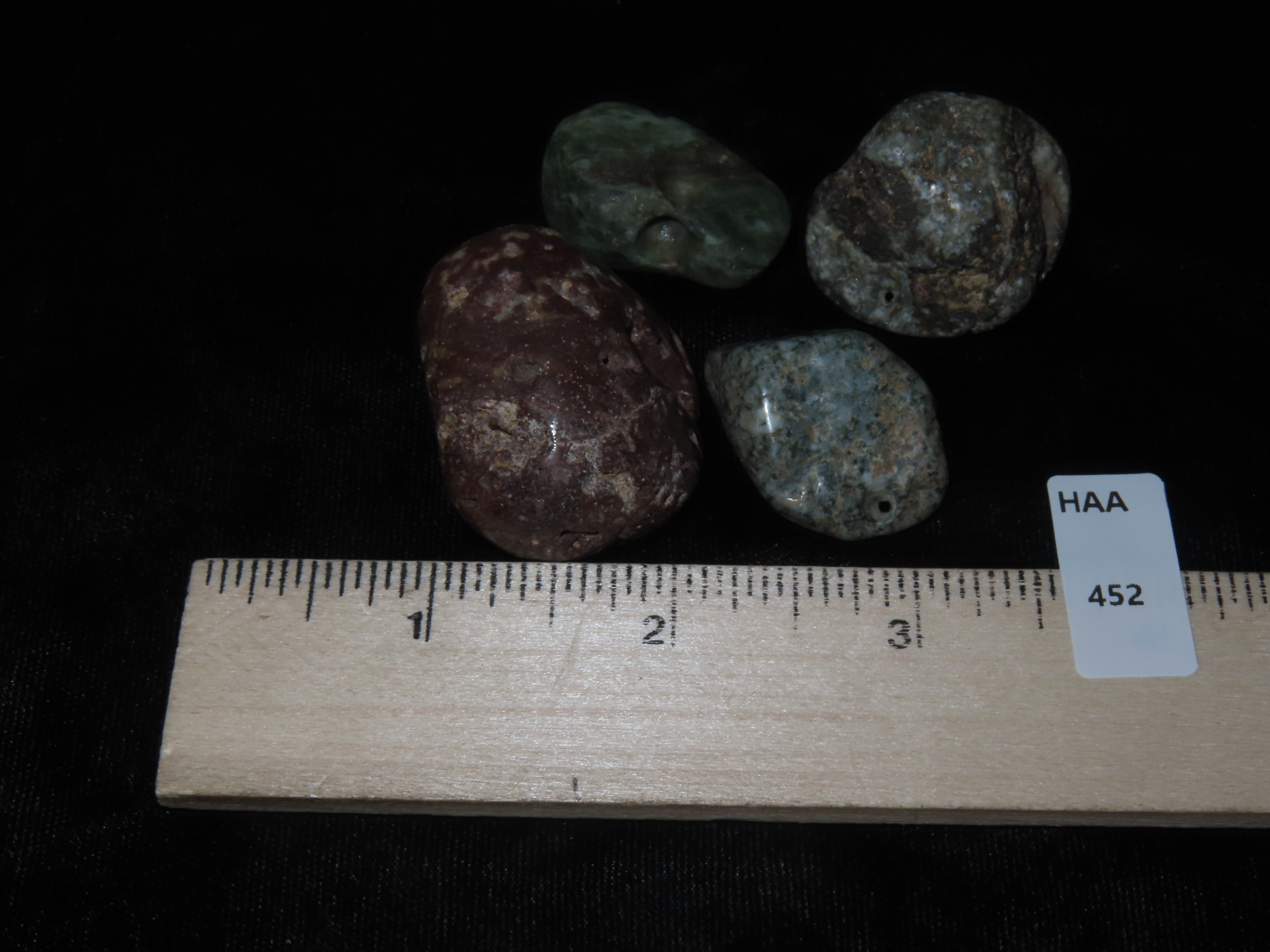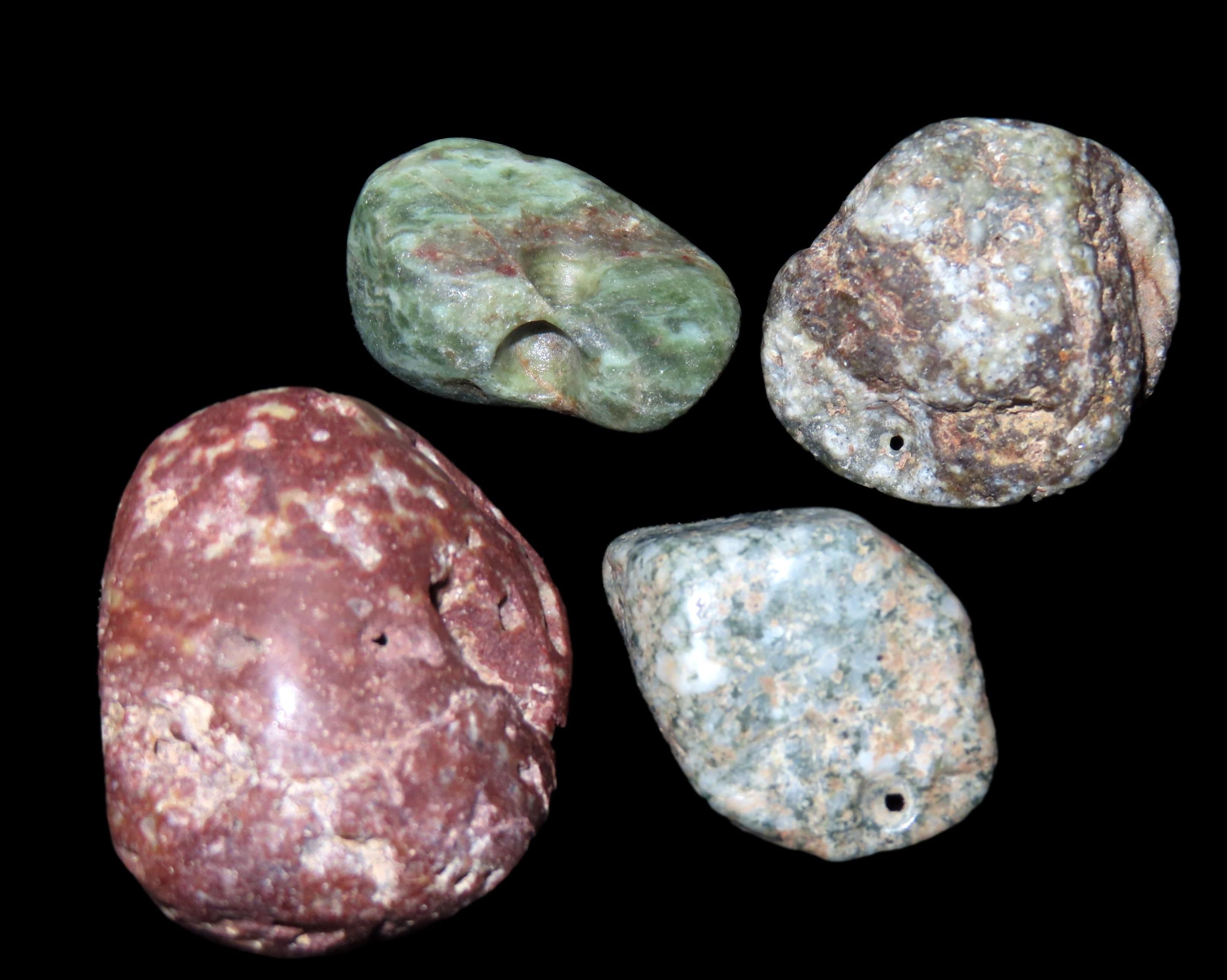 LOT OF 4 LARGE DRILLED STONE JADEITE & STONE BEADS, HIGHLY POLISHED AND VERY COLORFUL EXAMPLES, PRECOLUMBIAN, FROM MEXICO