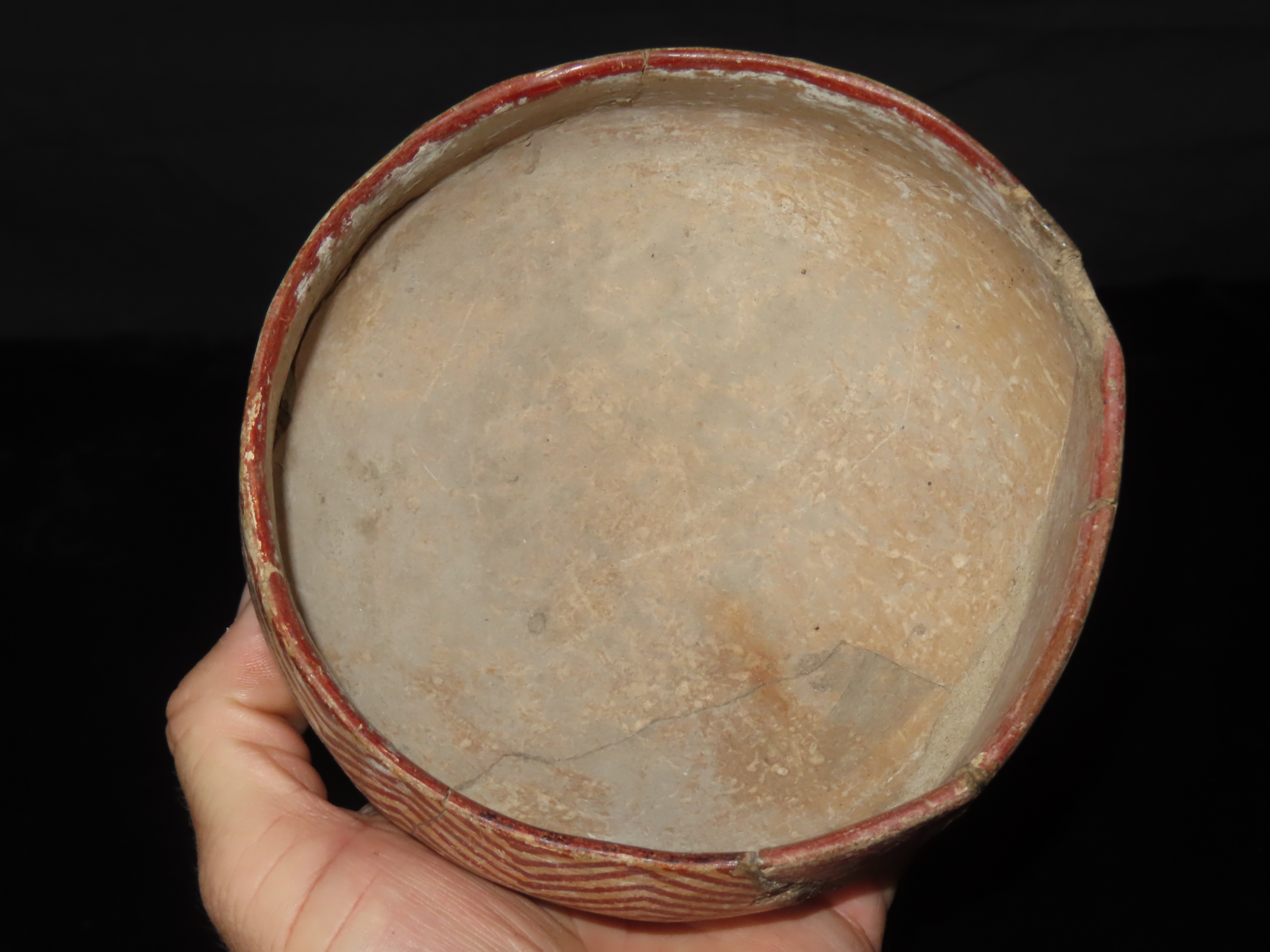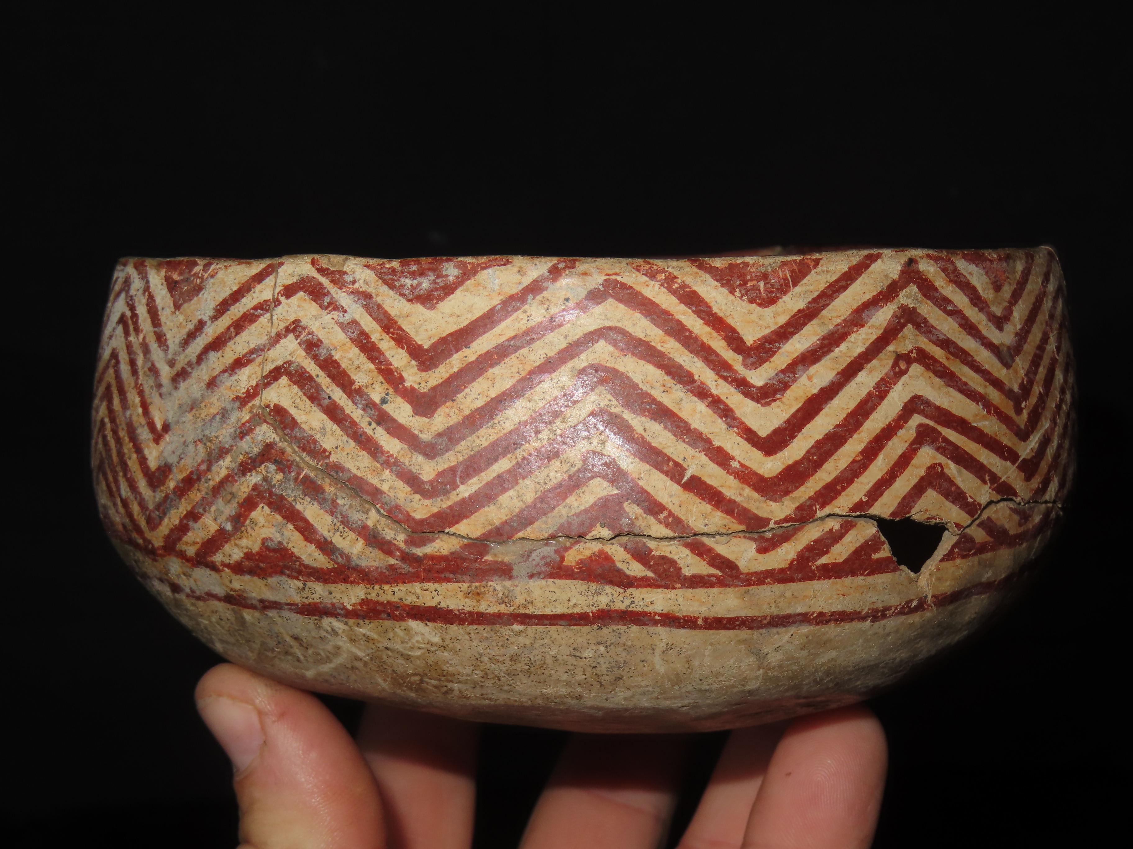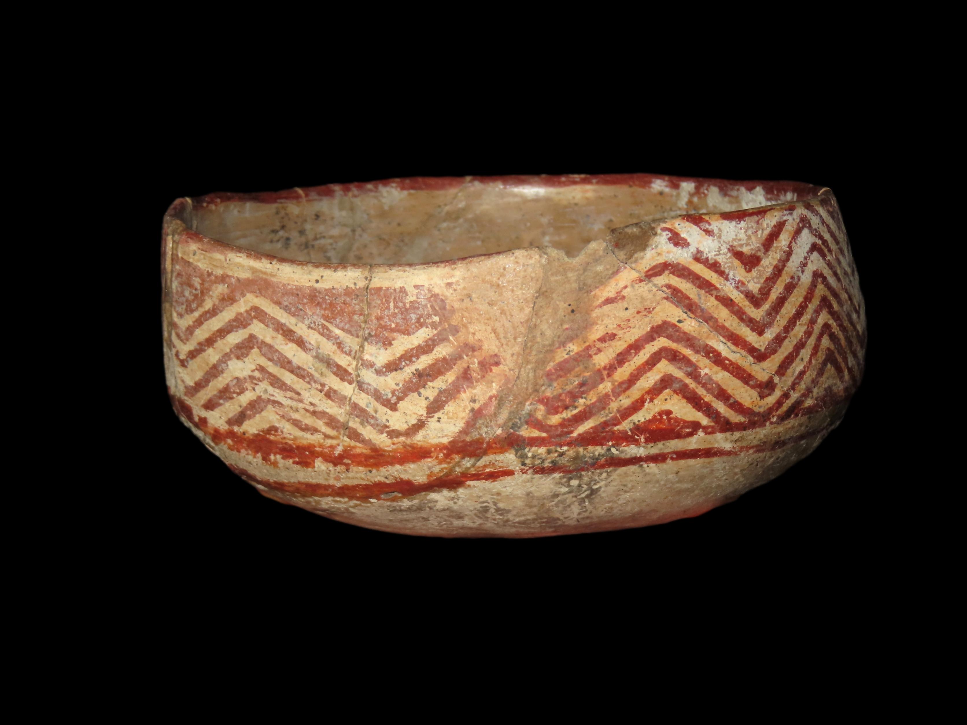 6″ WIDE NICELY PAINTED PRE-COLUMBIAN POTTERY BOWL, MEXICO, SOME DAMAGE & REPAIR AS SHOWN, BUT A GREAT OLD BOWL