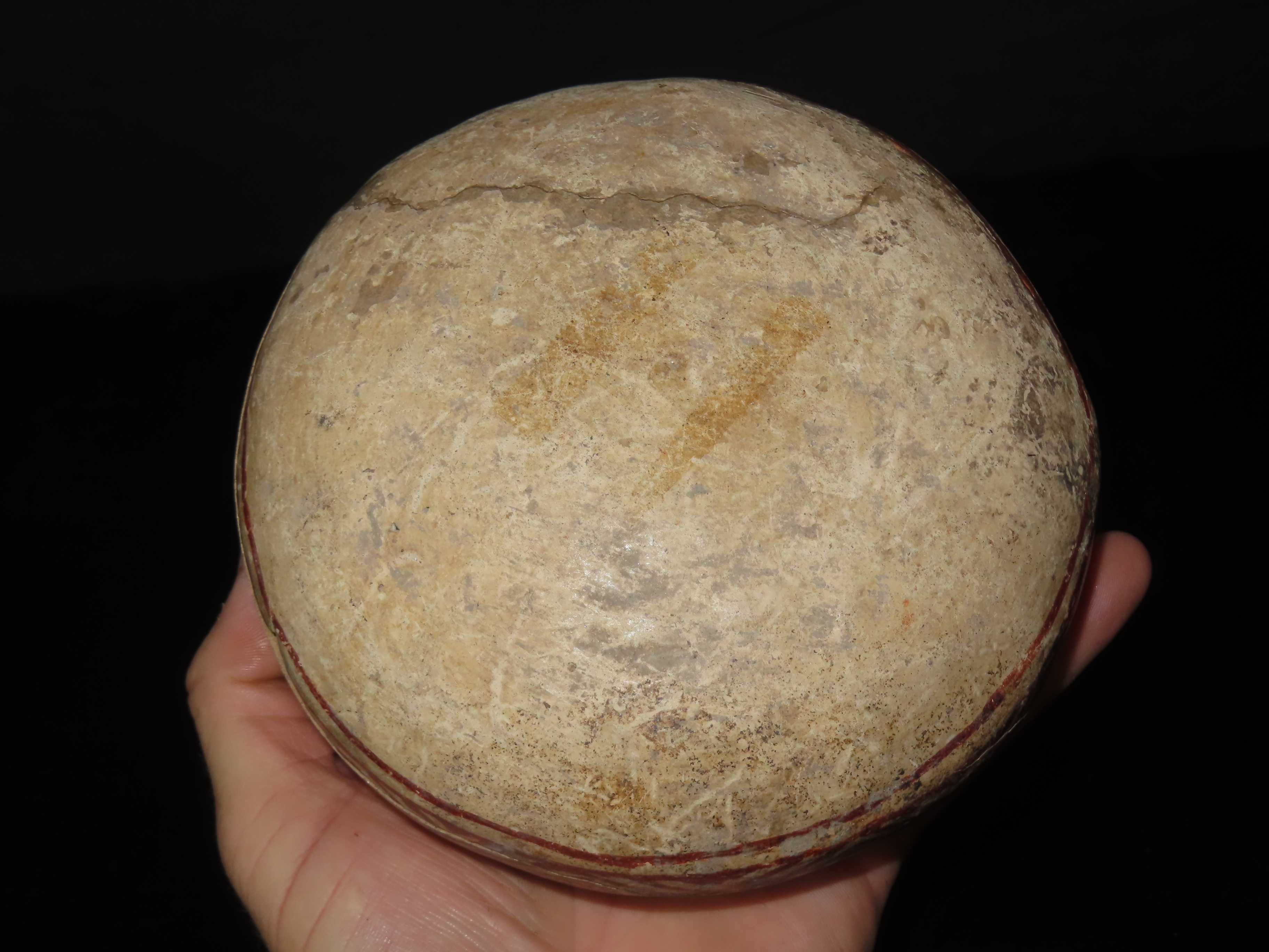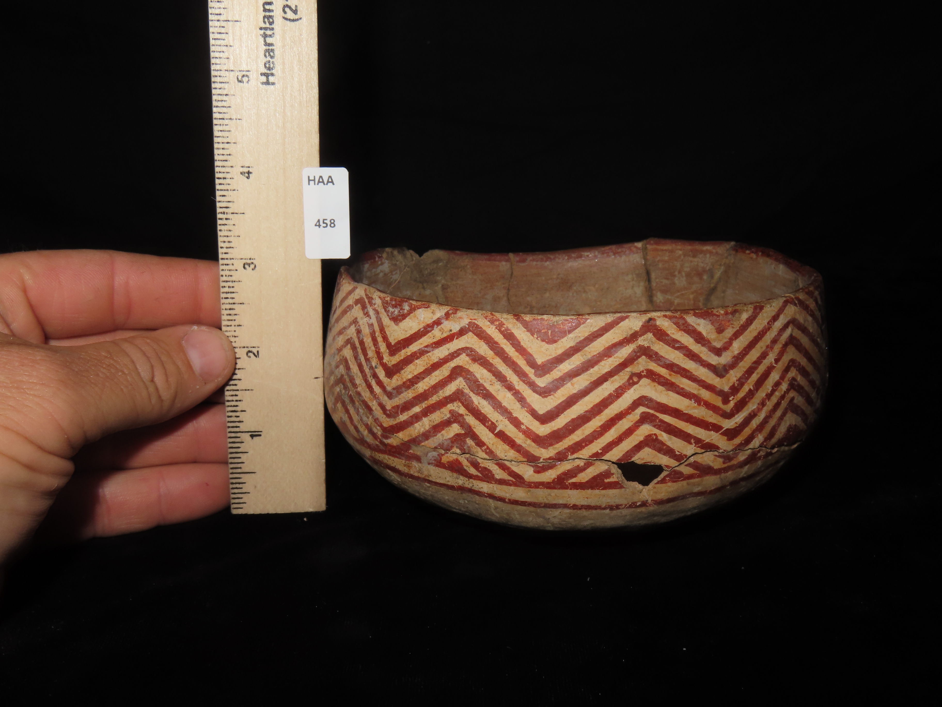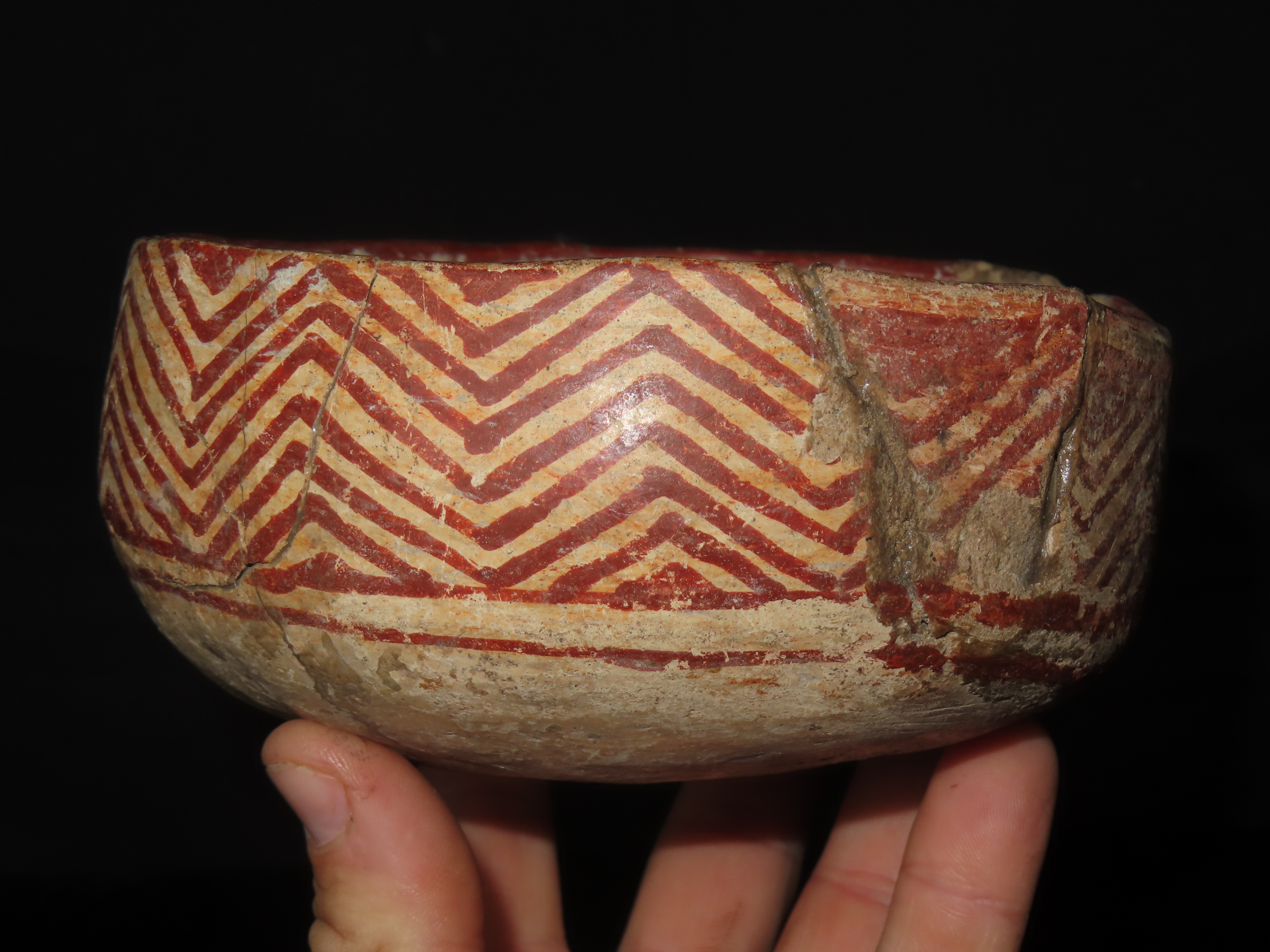 6″ WIDE NICELY PAINTED PRE-COLUMBIAN POTTERY BOWL, MEXICO, SOME DAMAGE & REPAIR AS SHOWN, BUT A GREAT OLD BOWL