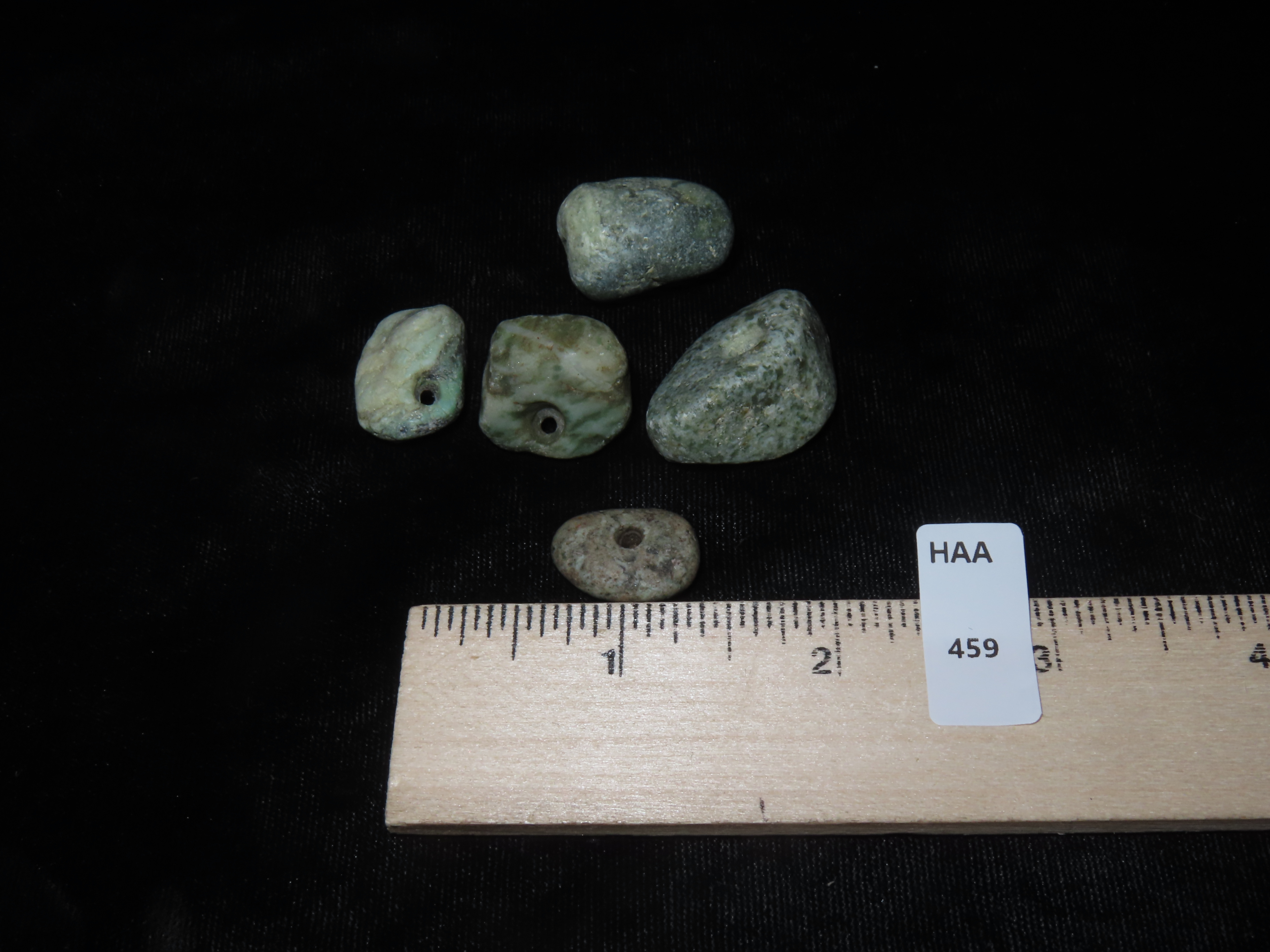 LOT OF 5 MEZCALA JADEITE DRILLED STONE BEADS, MEXICO, NICELY POLISHED COLORFUL EXAMPLES