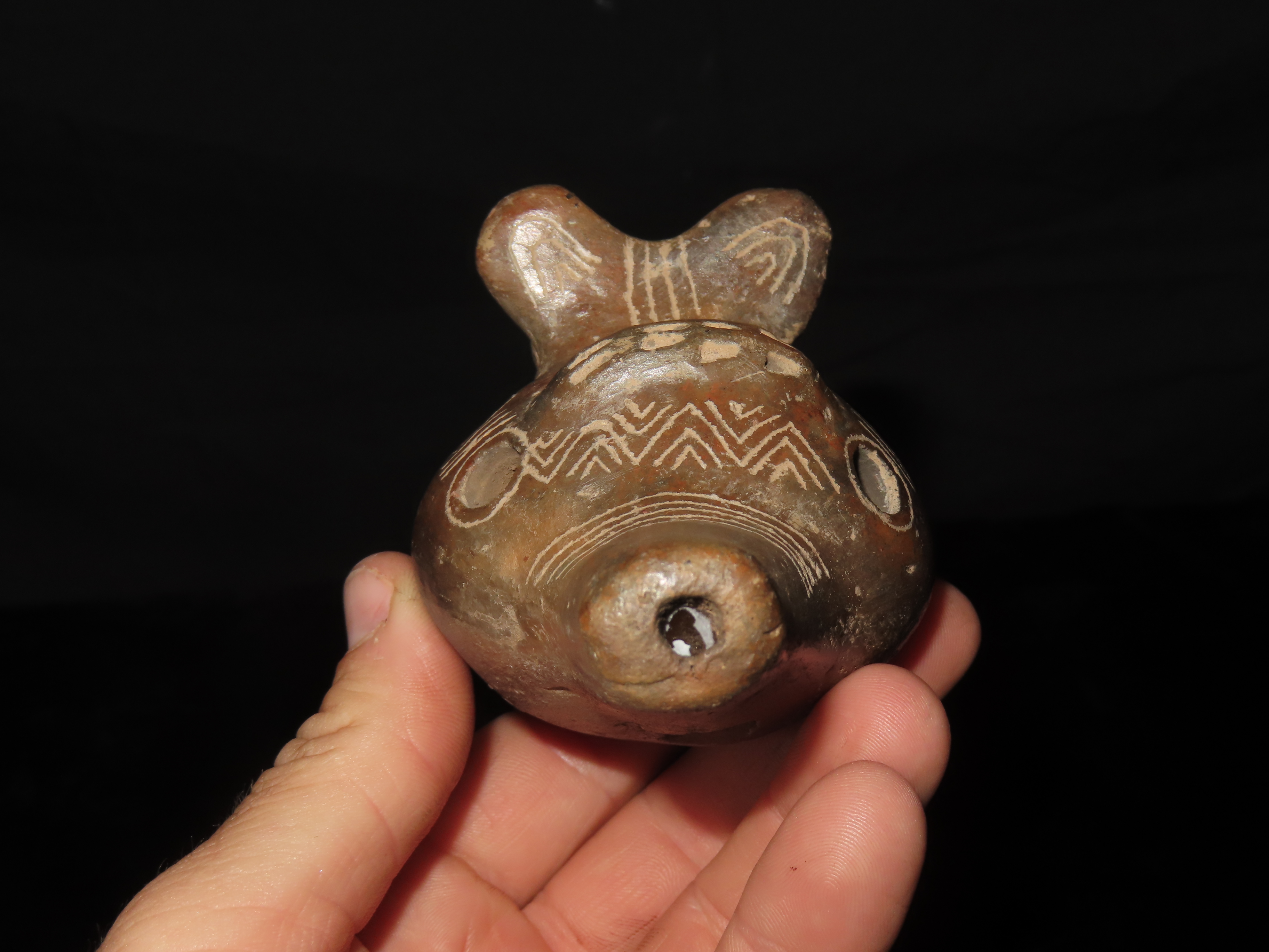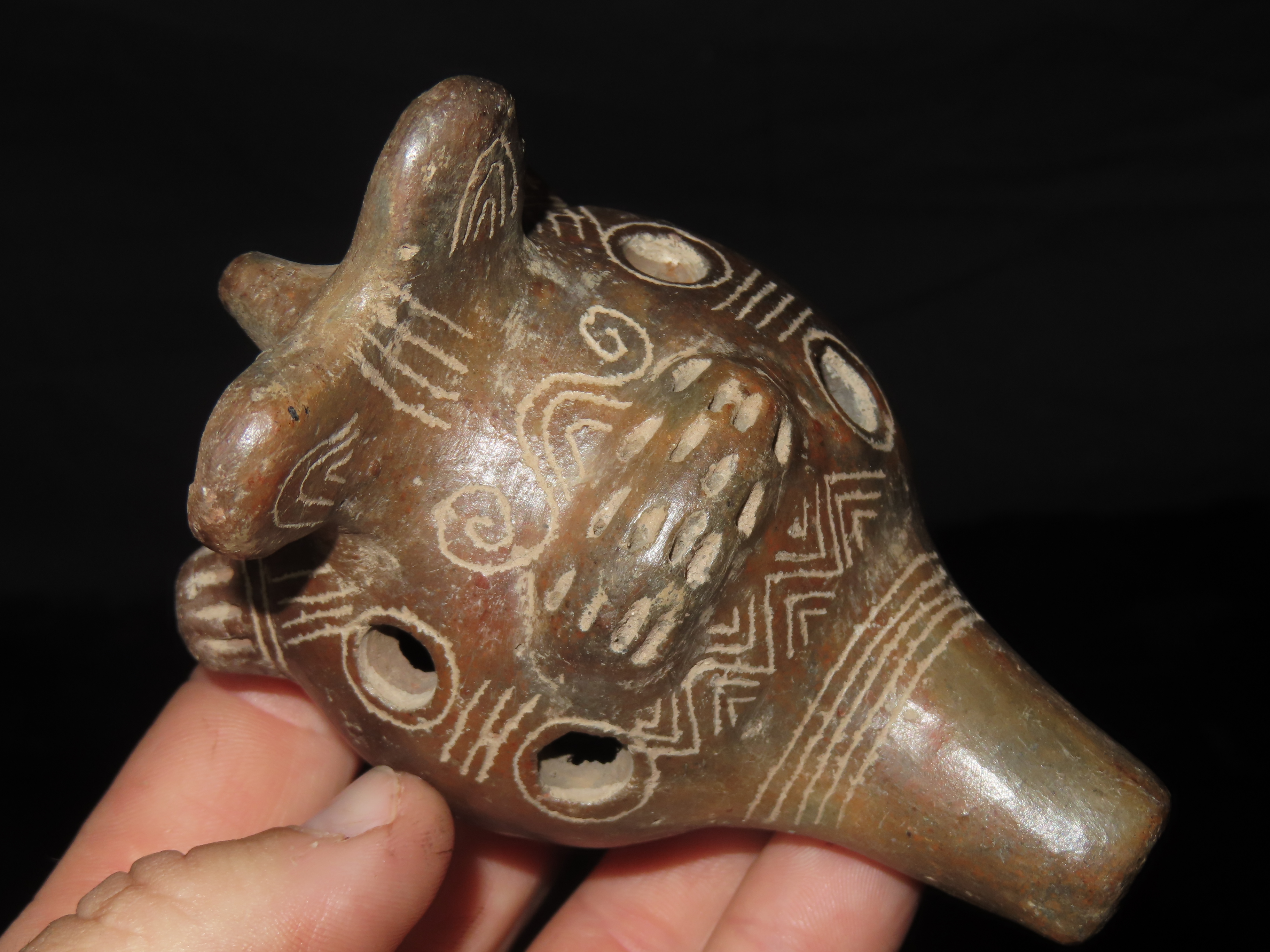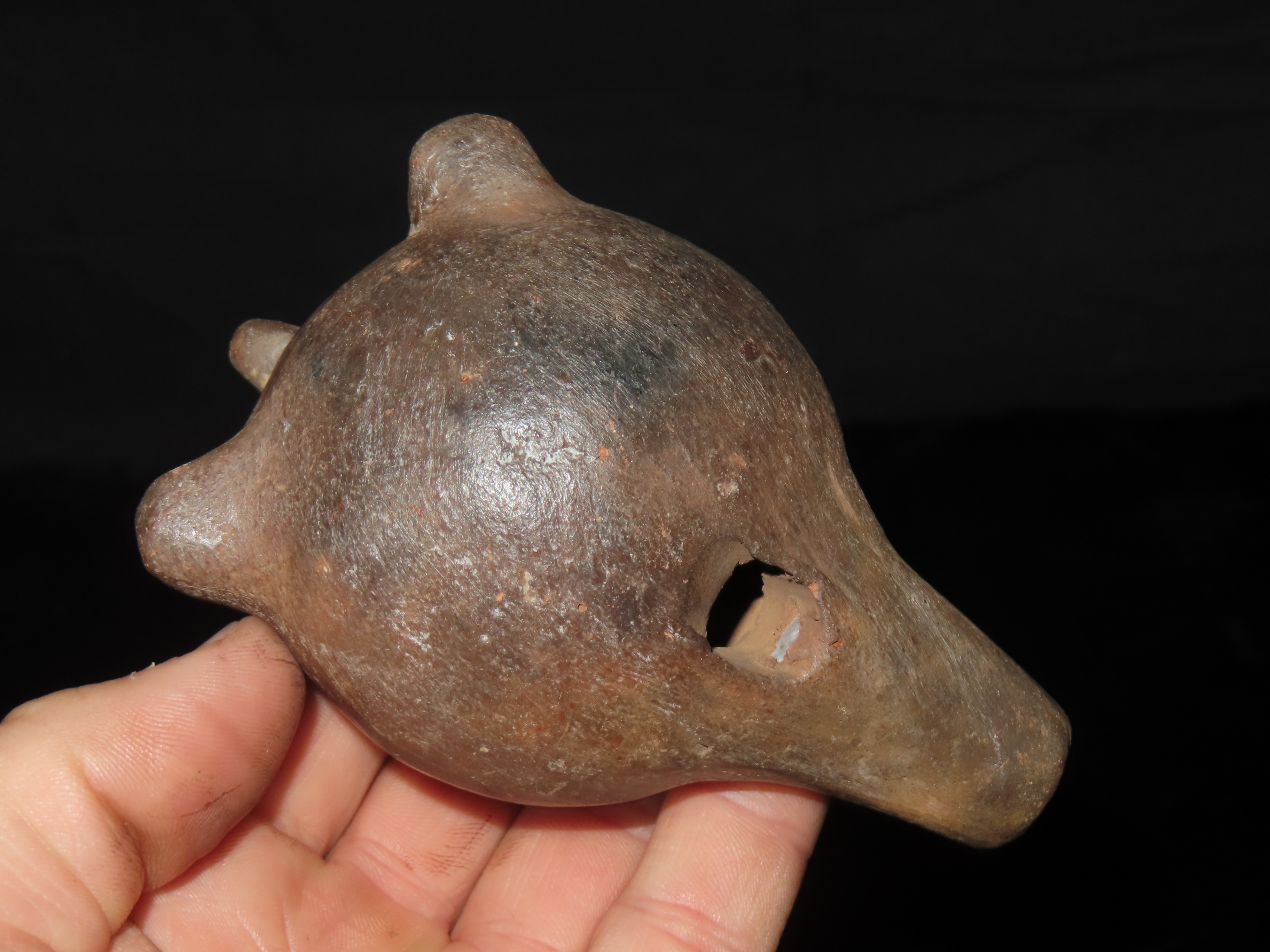 4 3/8″ ENGRAVED BIRD EFFIGY OCARINA / WHISTLE, PRE-COLUMBIAN POTTERY FLUTE, NICE EXAMPLE