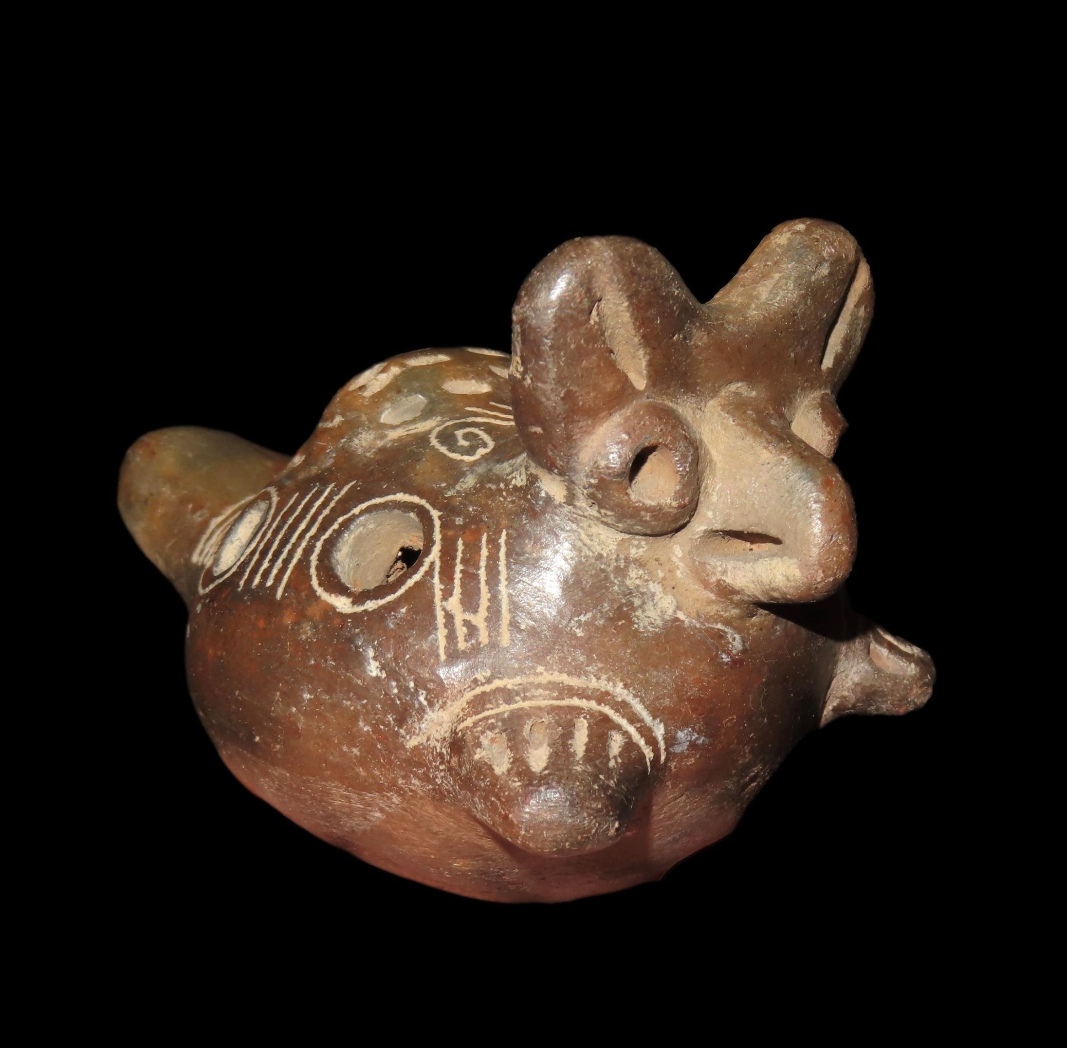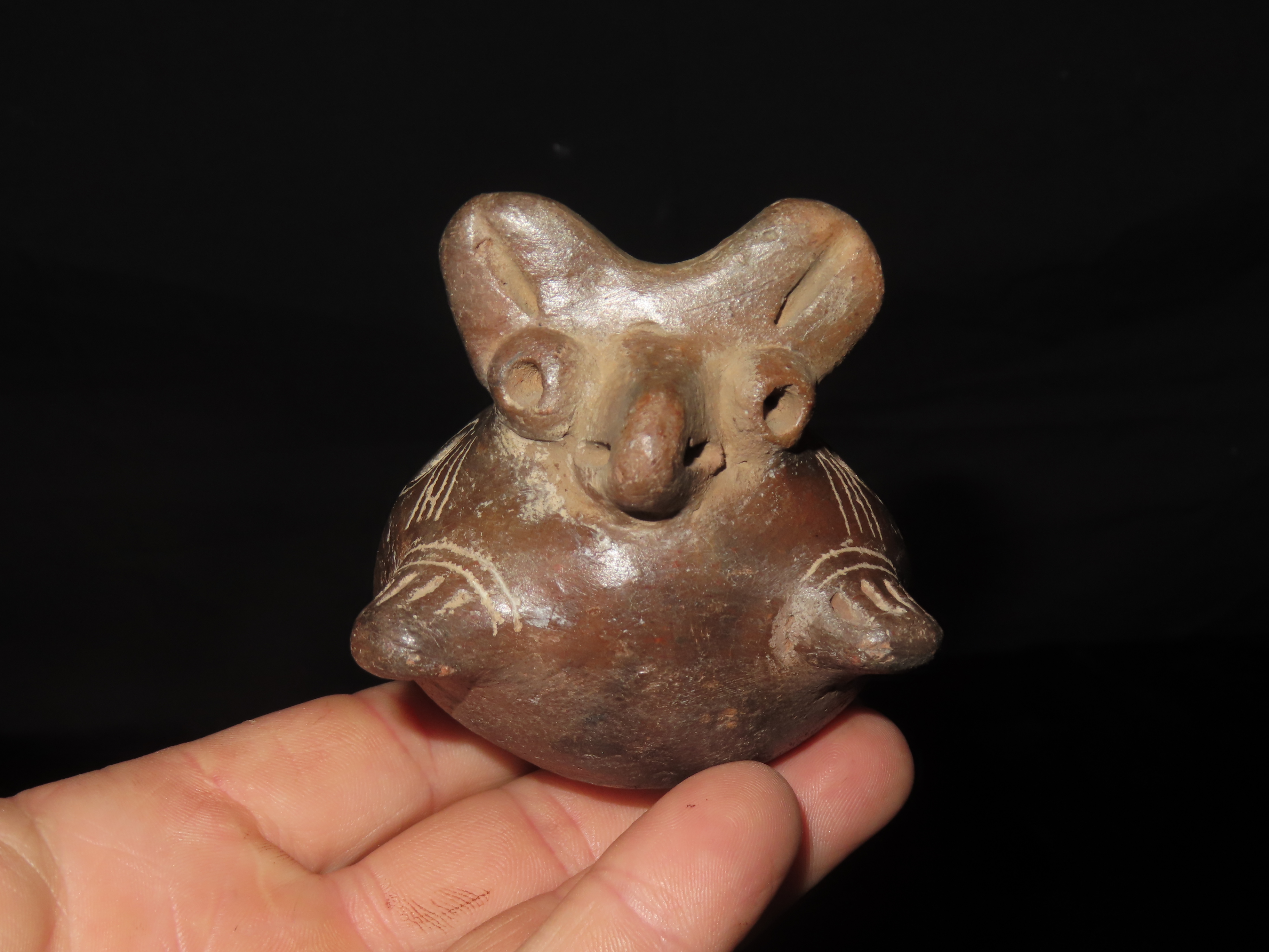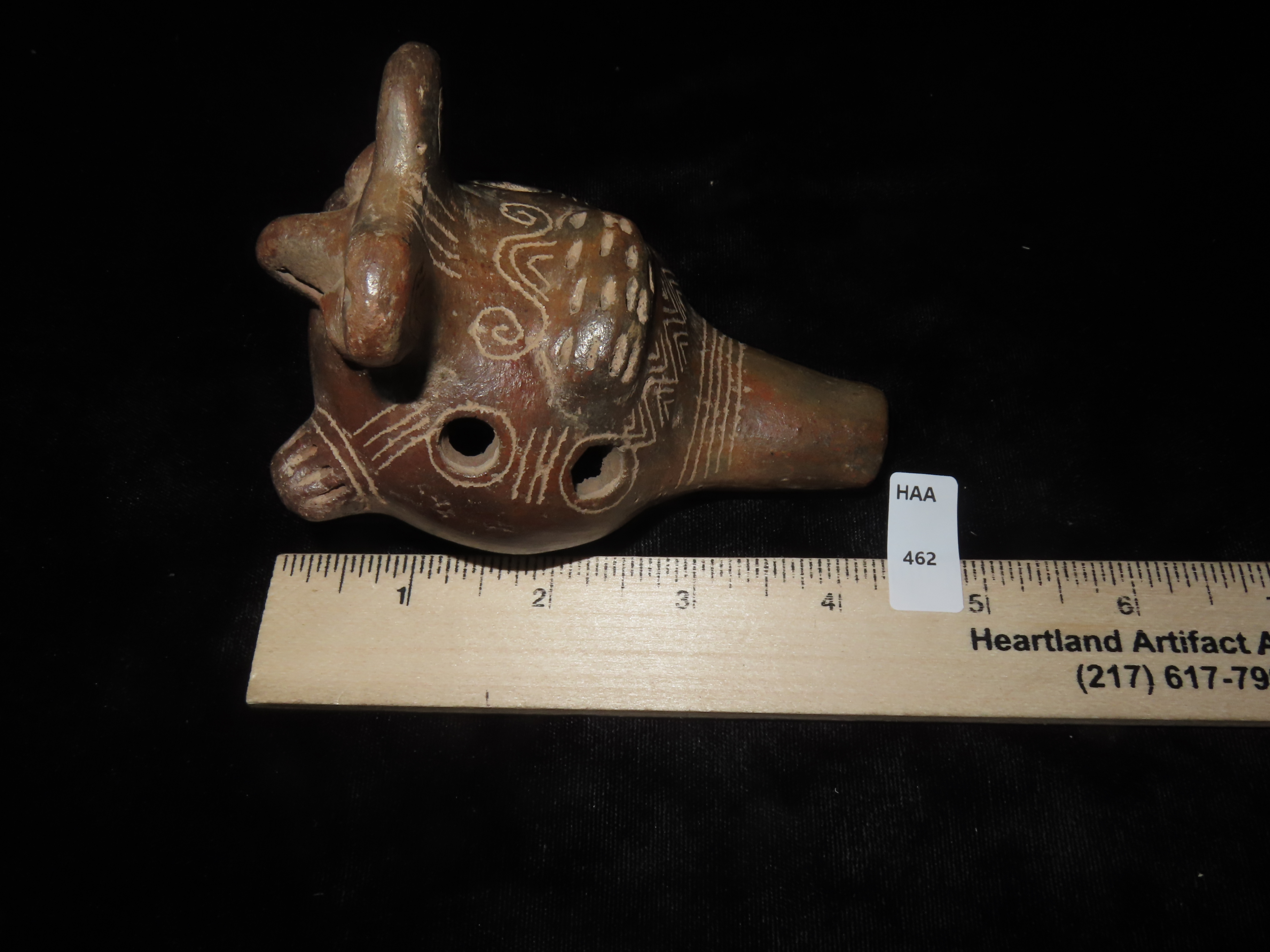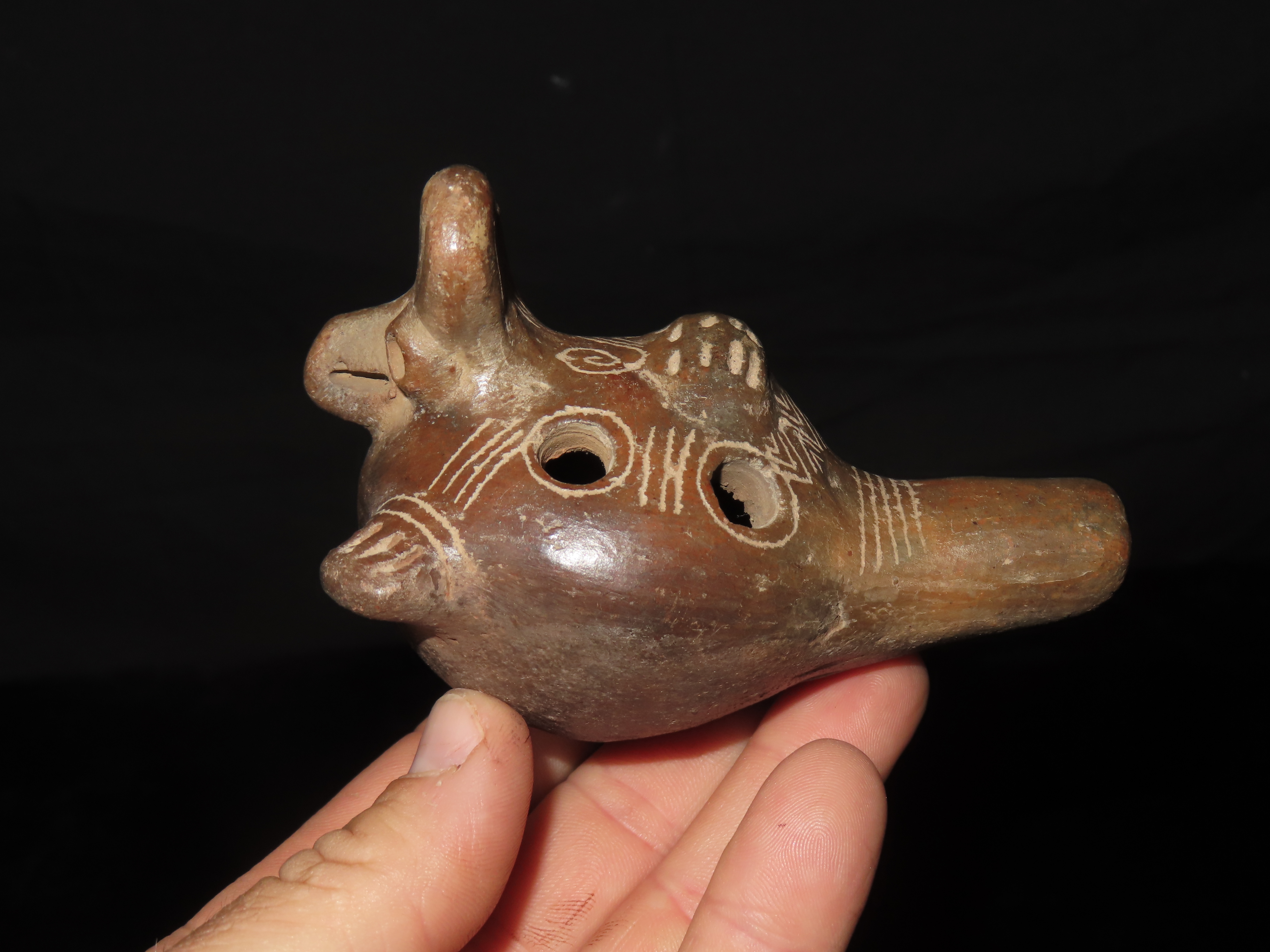 4 3/8″ ENGRAVED BIRD EFFIGY OCARINA / WHISTLE, PRE-COLUMBIAN POTTERY FLUTE, NICE EXAMPLE