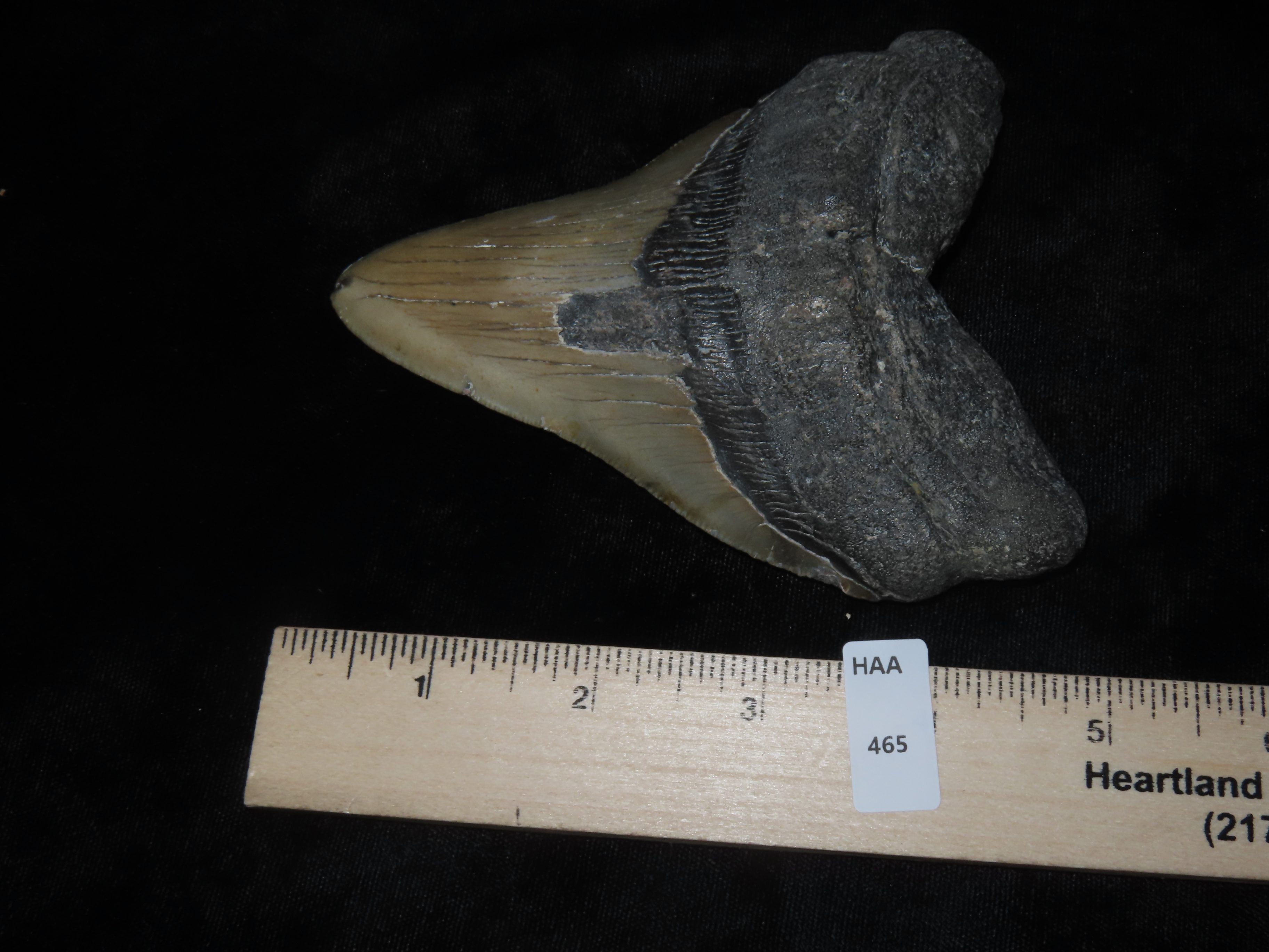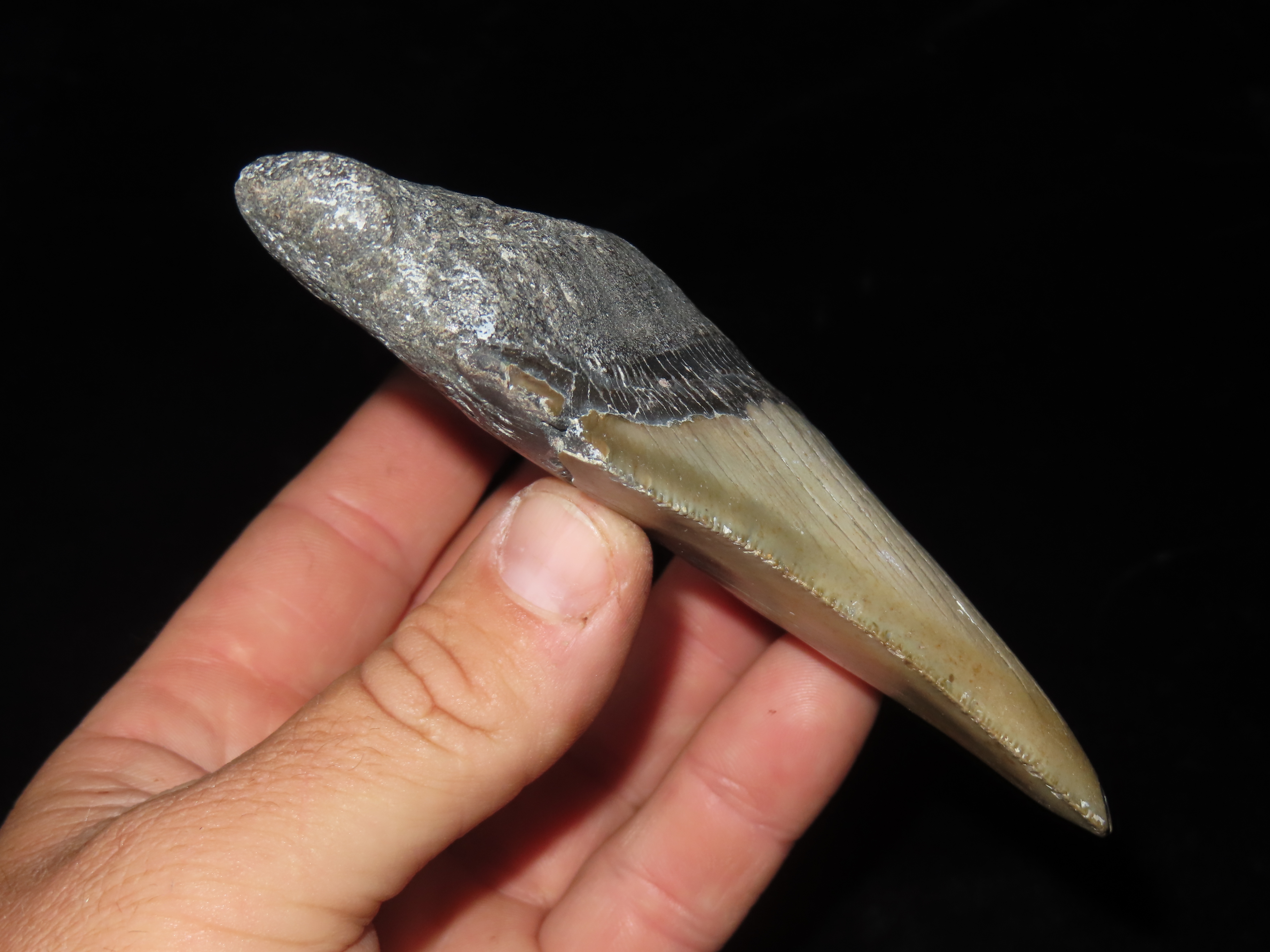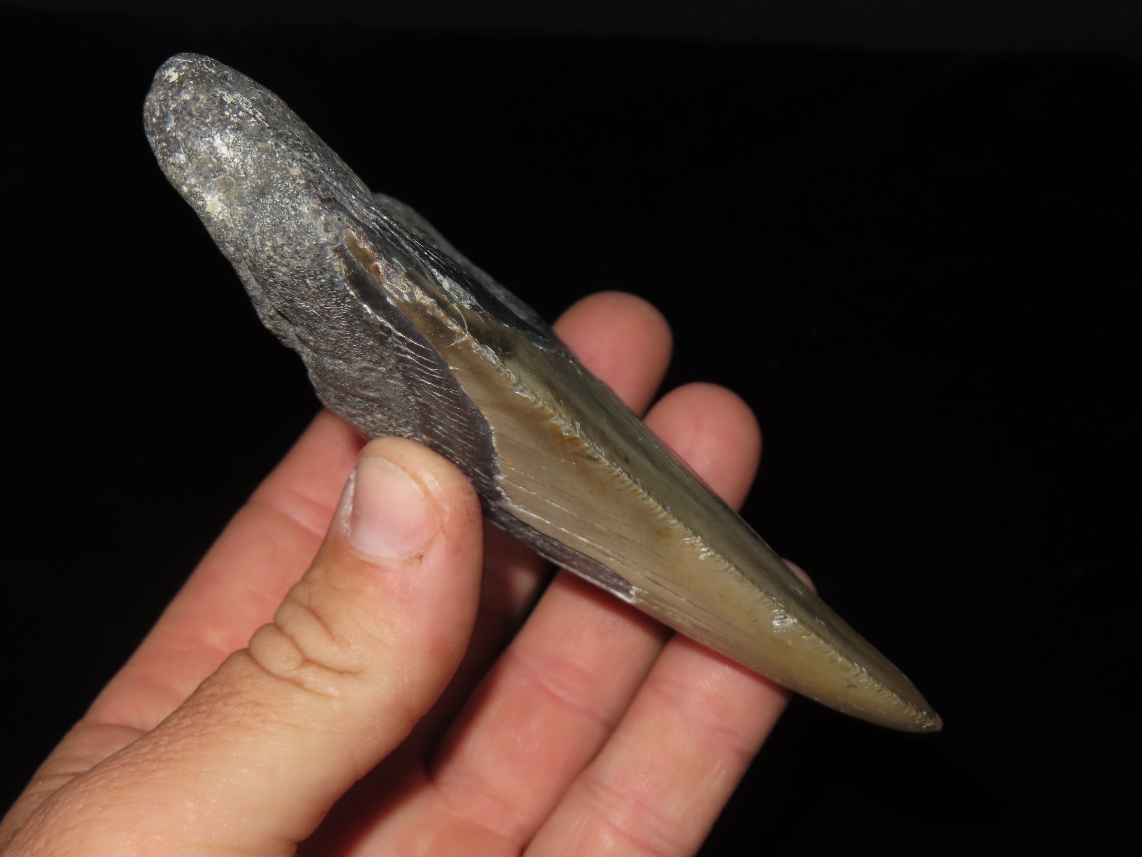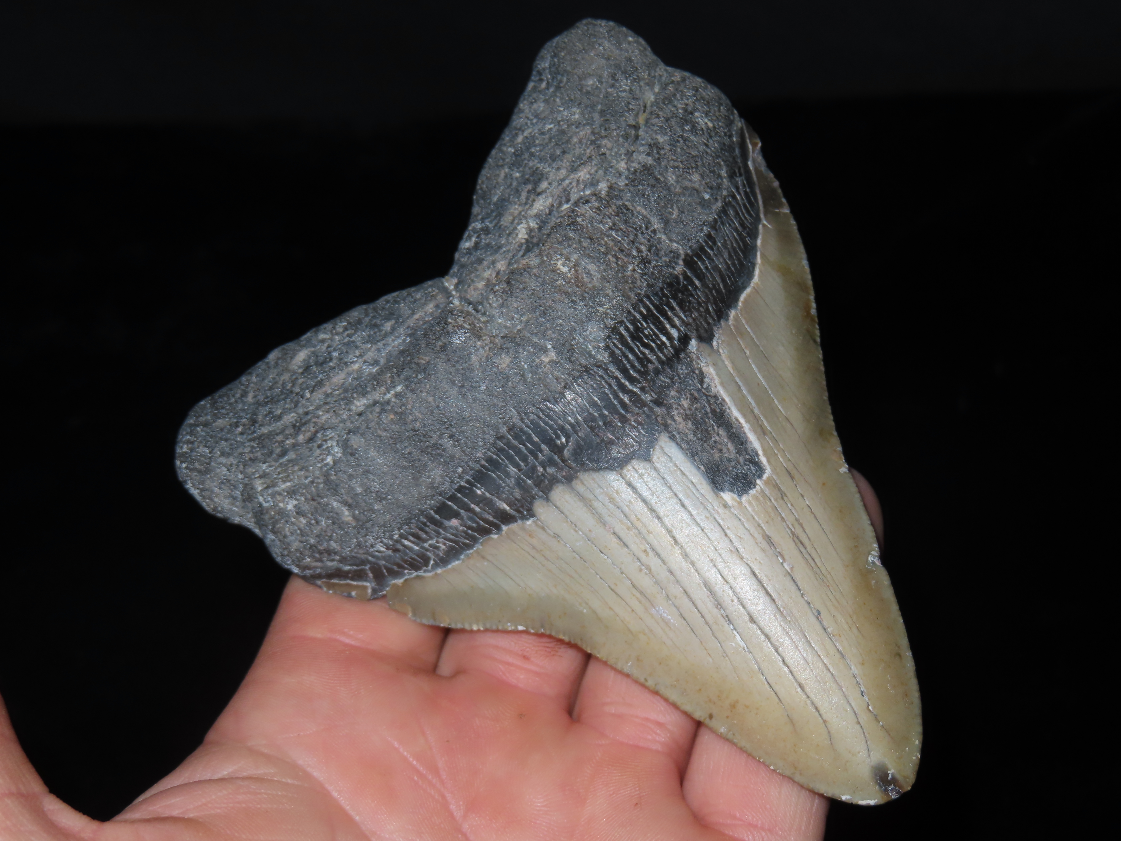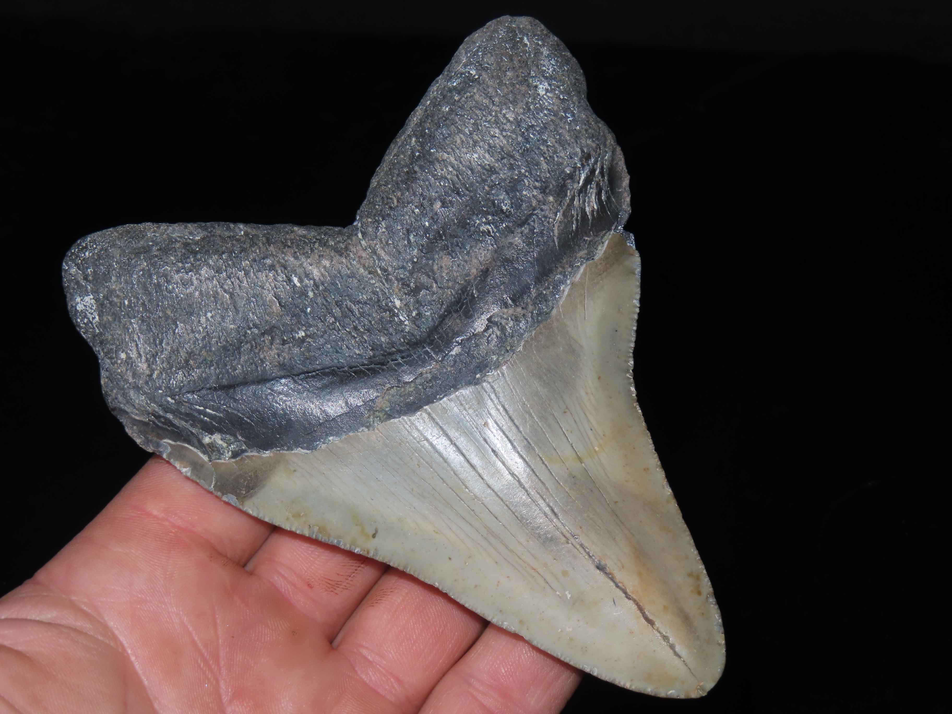 HUGE 5 1/8″ MEGALODON SHARK TOOTH, 23-2.5 MILLION YEAR OLD FOSSIL FOUND OFF THE COAST OF THE CAROLINA’S, NO REPAIR, NO RESTO, NO POLISH